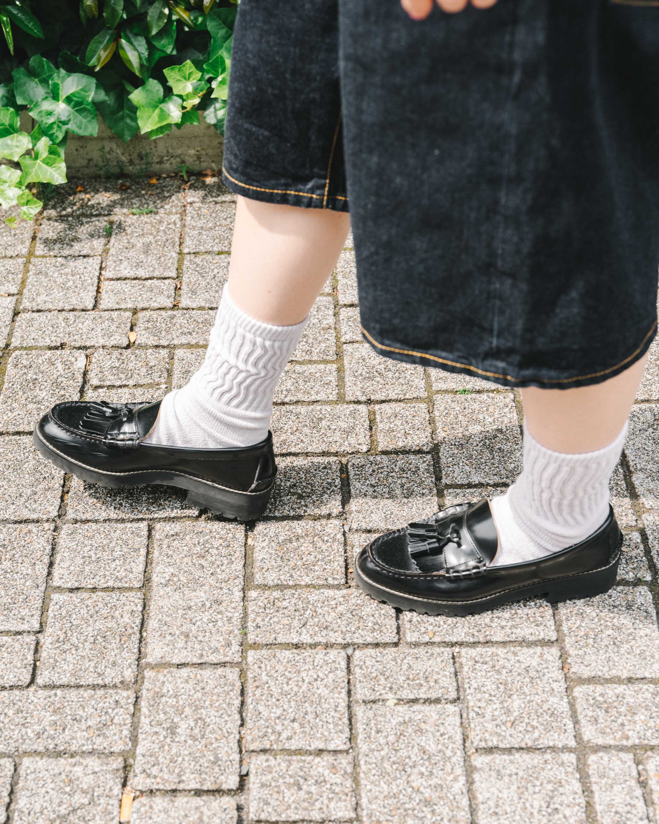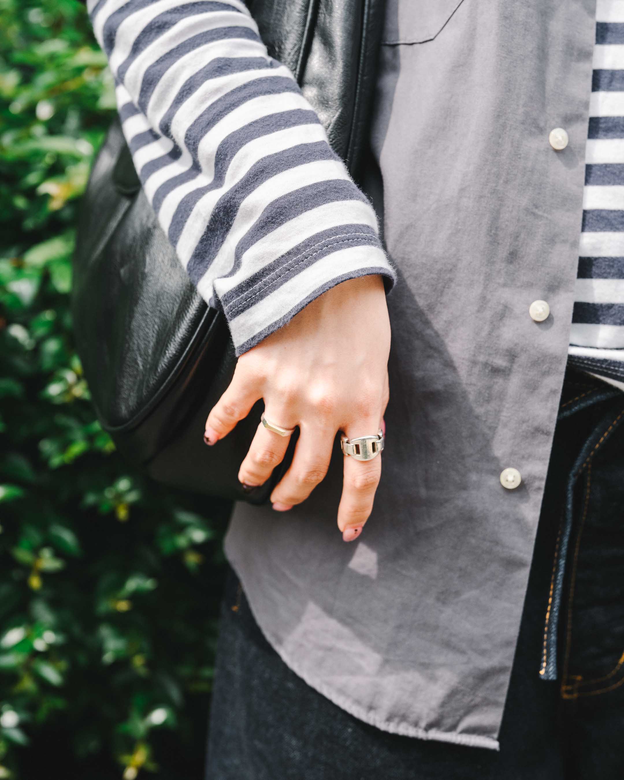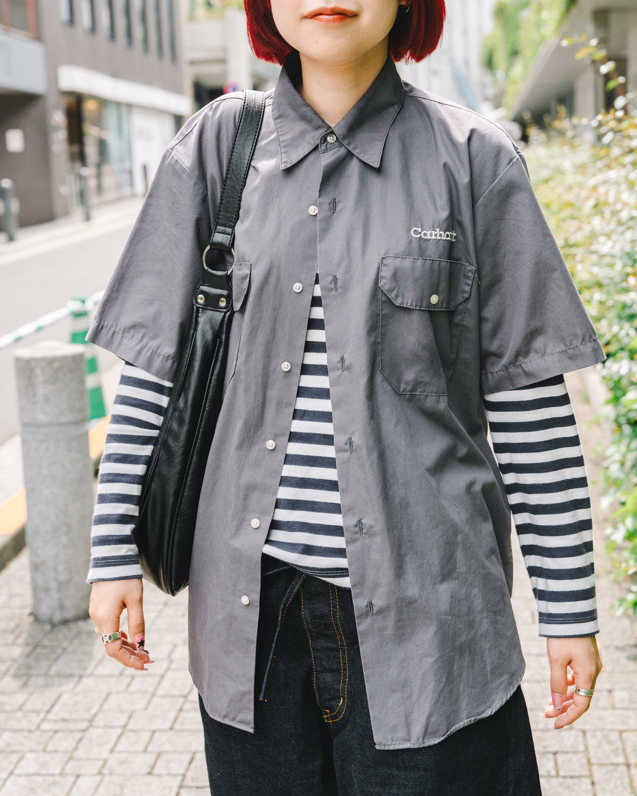 モノトーンコーデはレイヤードで着こなしてワンランク上のコーデに仕上げる。