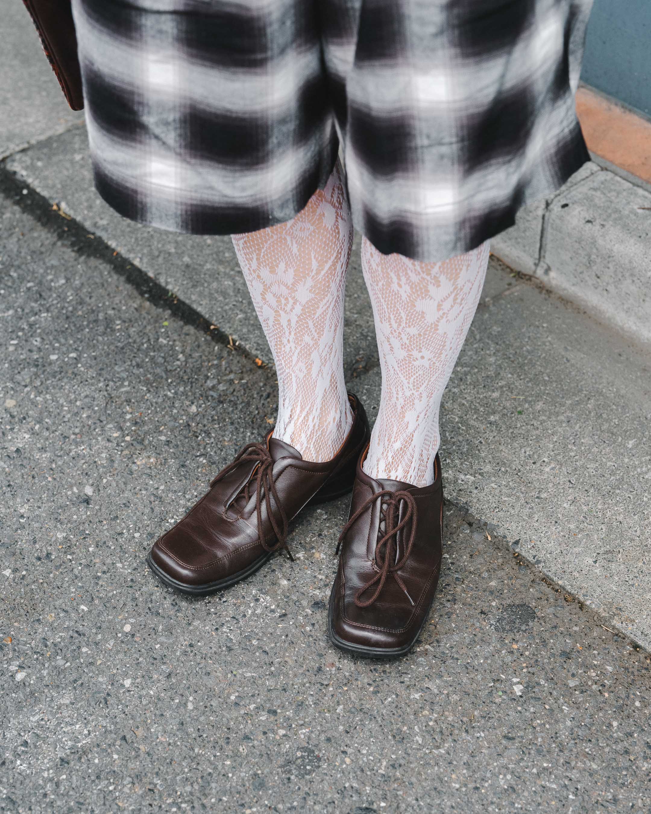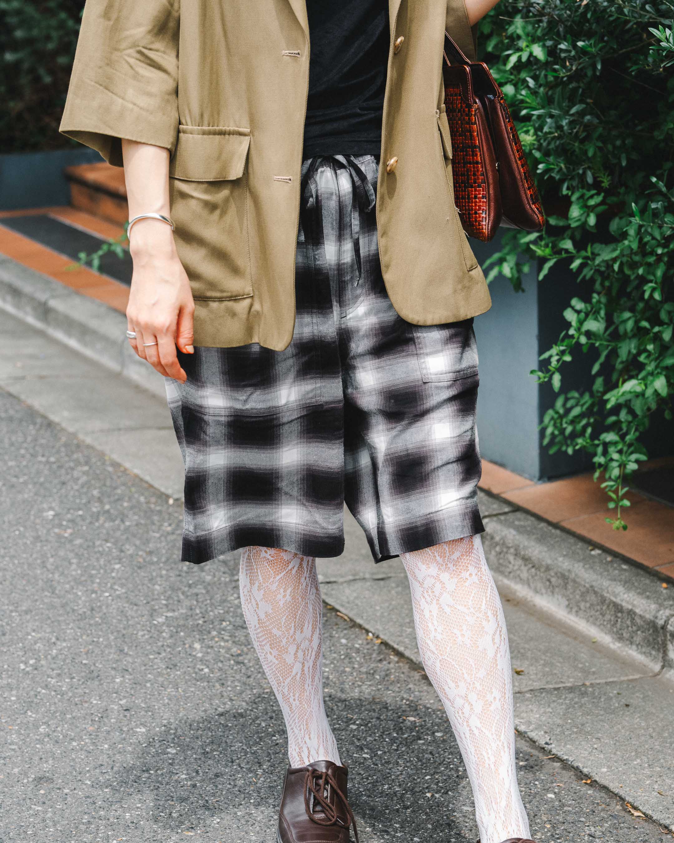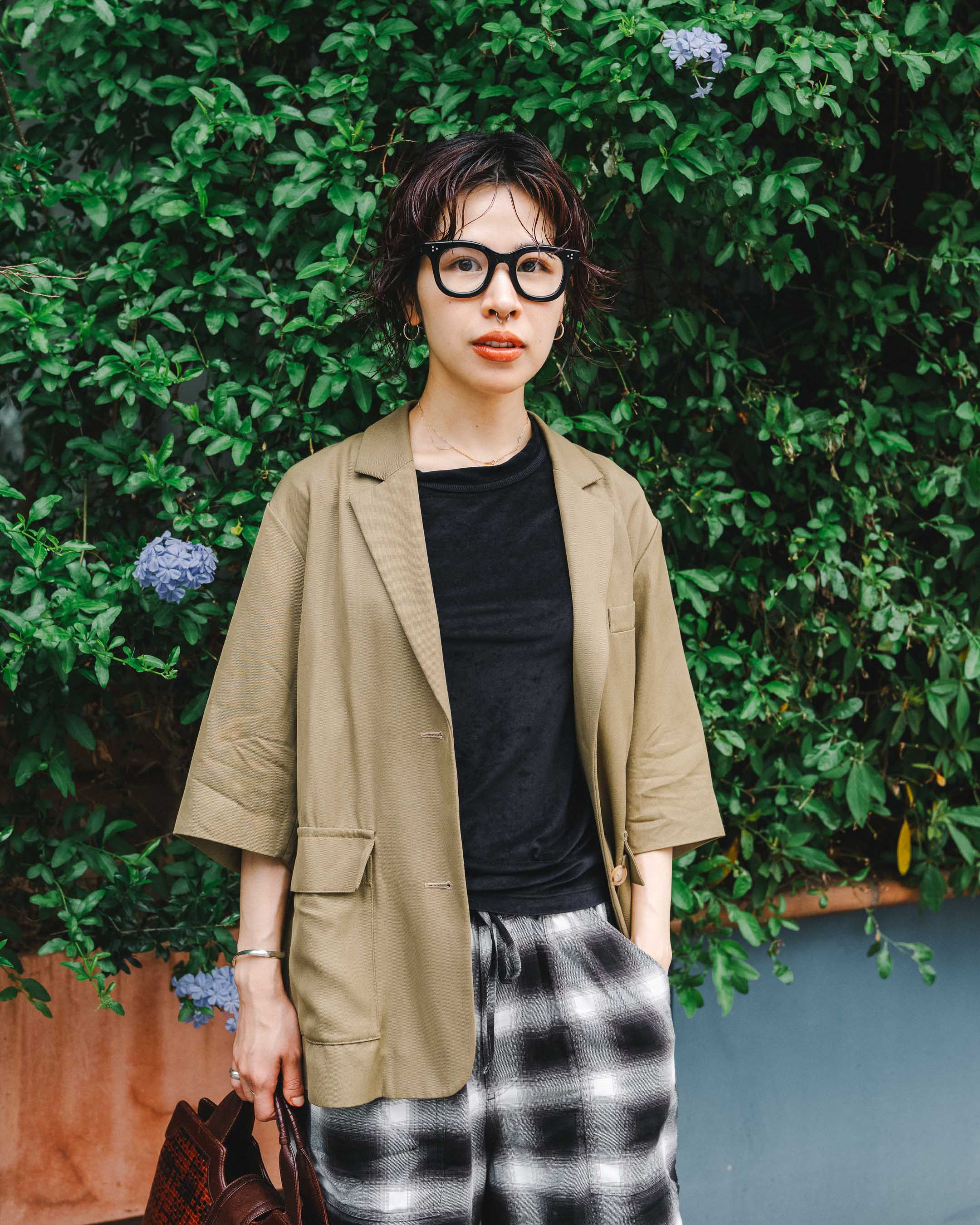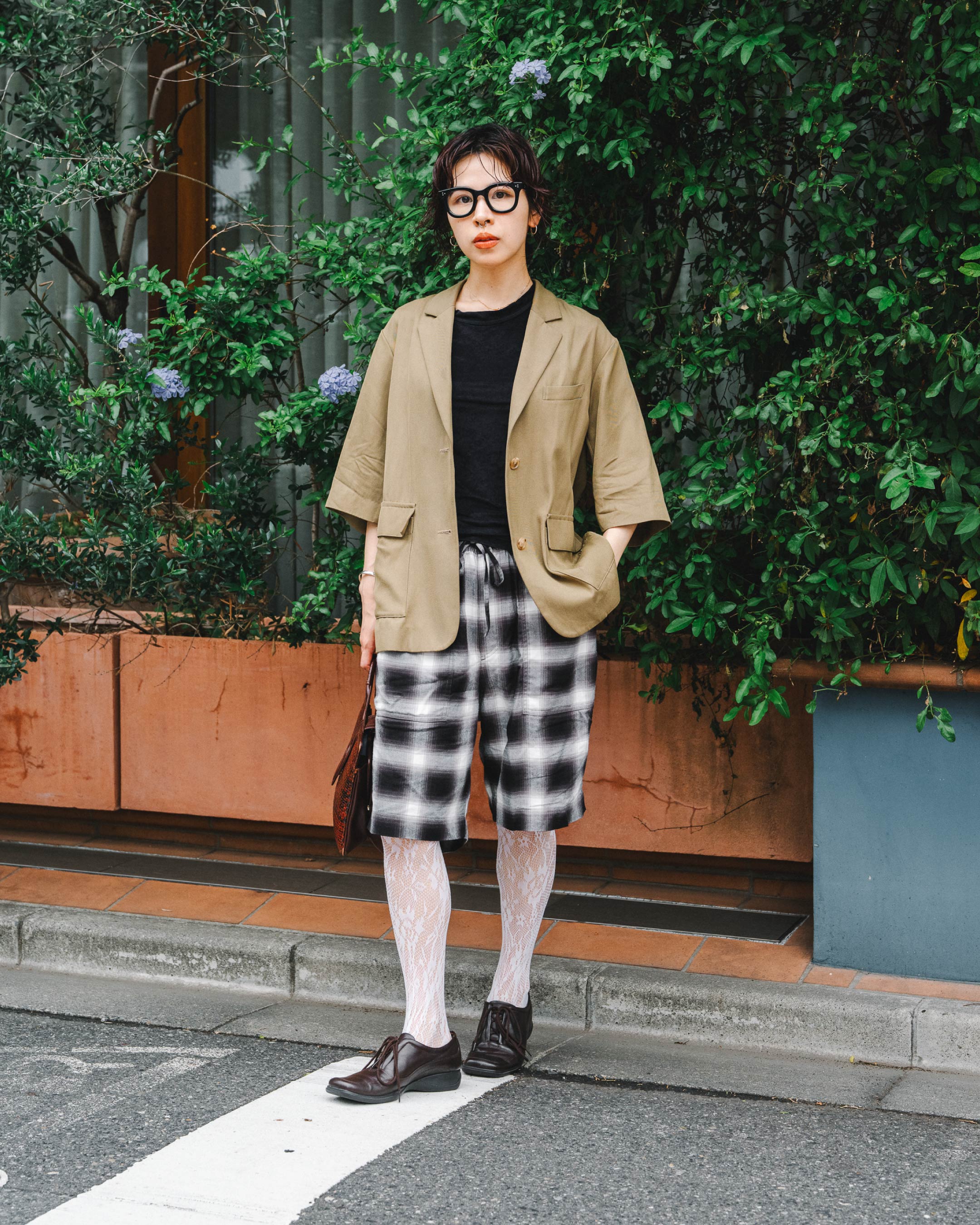 力が抜けたメンズライクコーデににレースで良い違和感を。