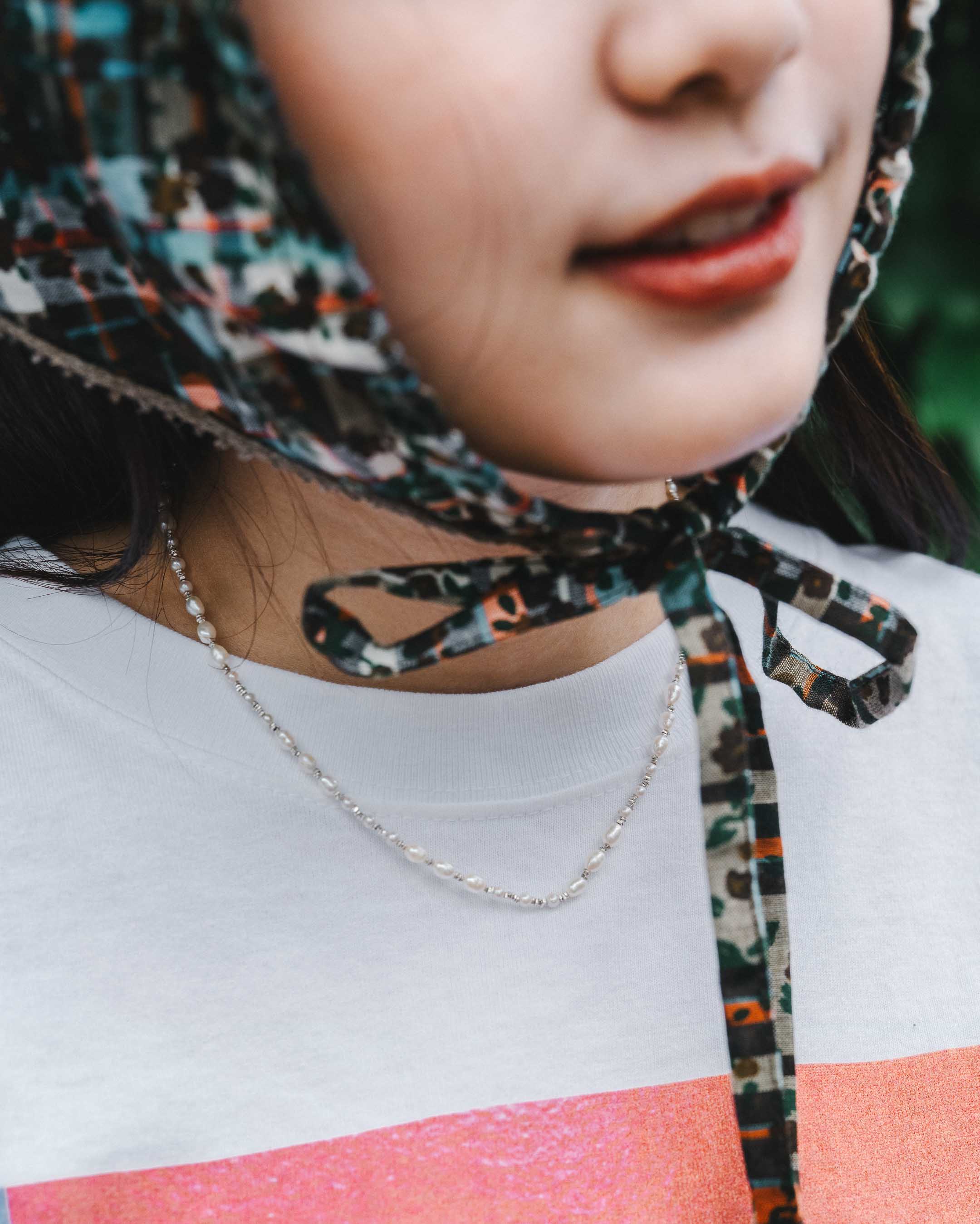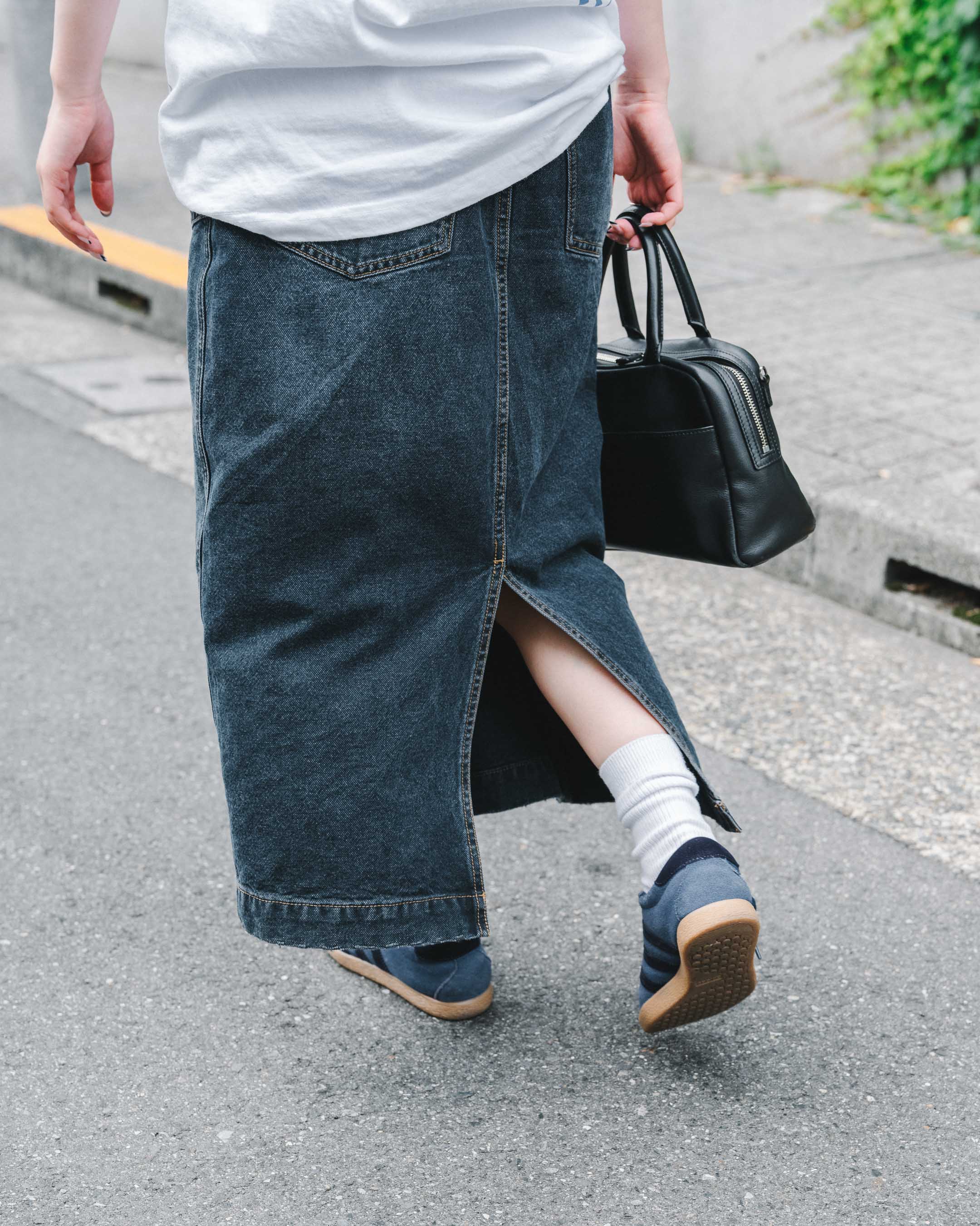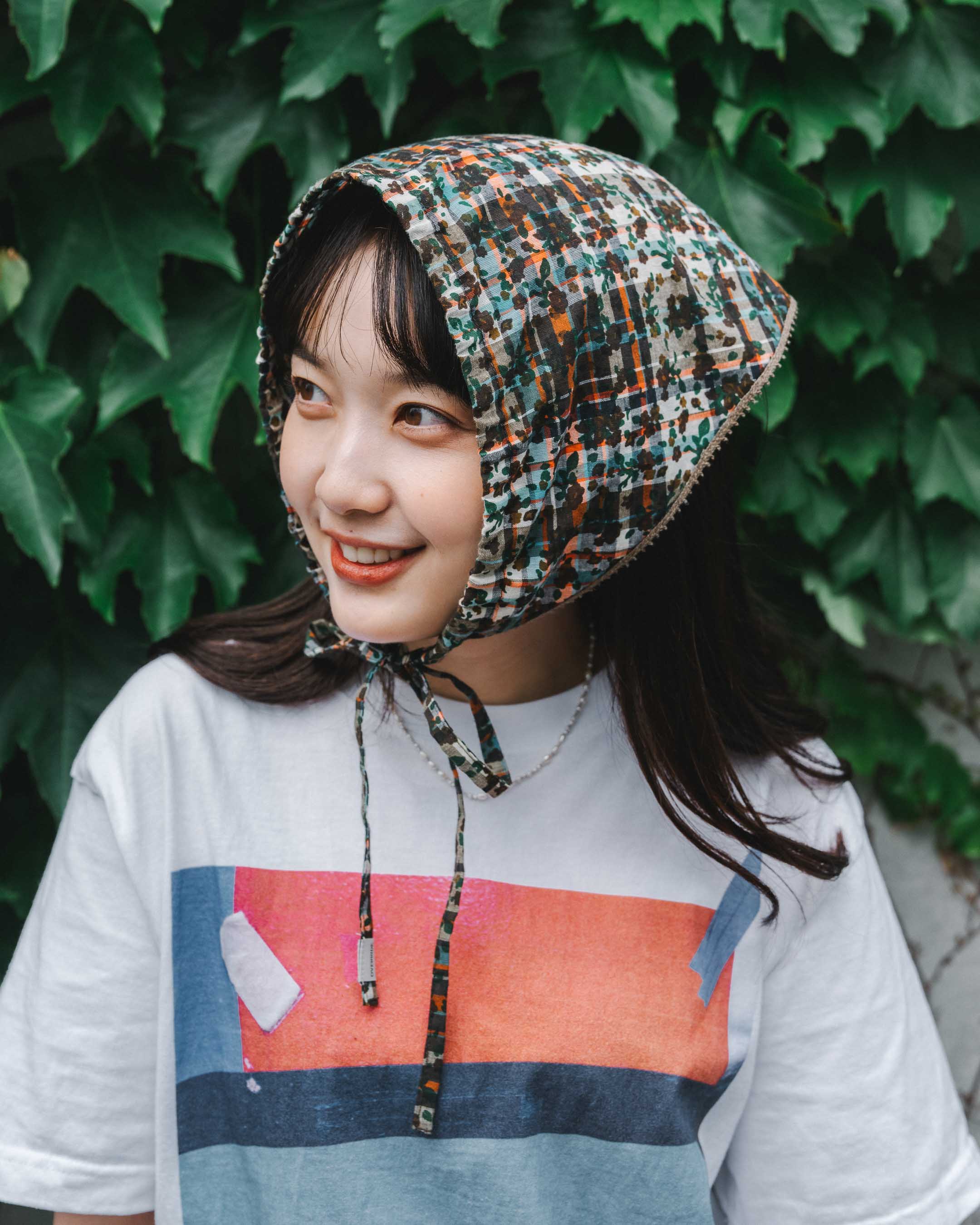 Tシャツ×デニムスカートのシンプルなコーデにバブーシュカをON!遊び心を出して。