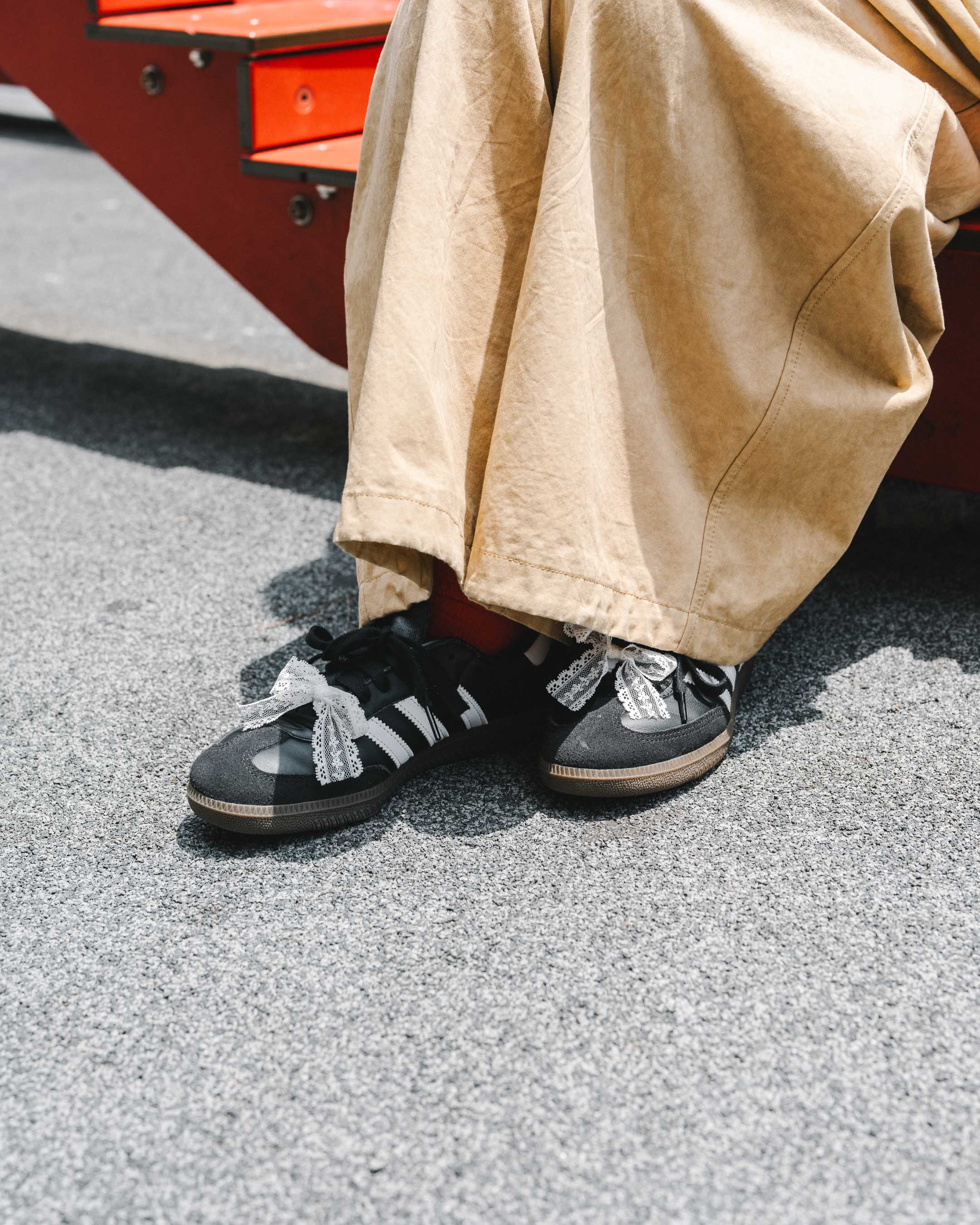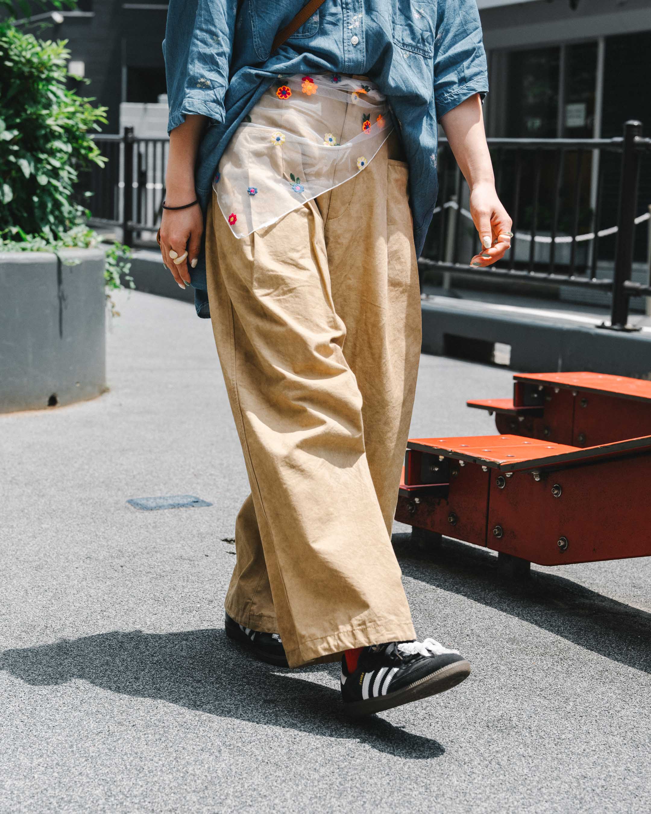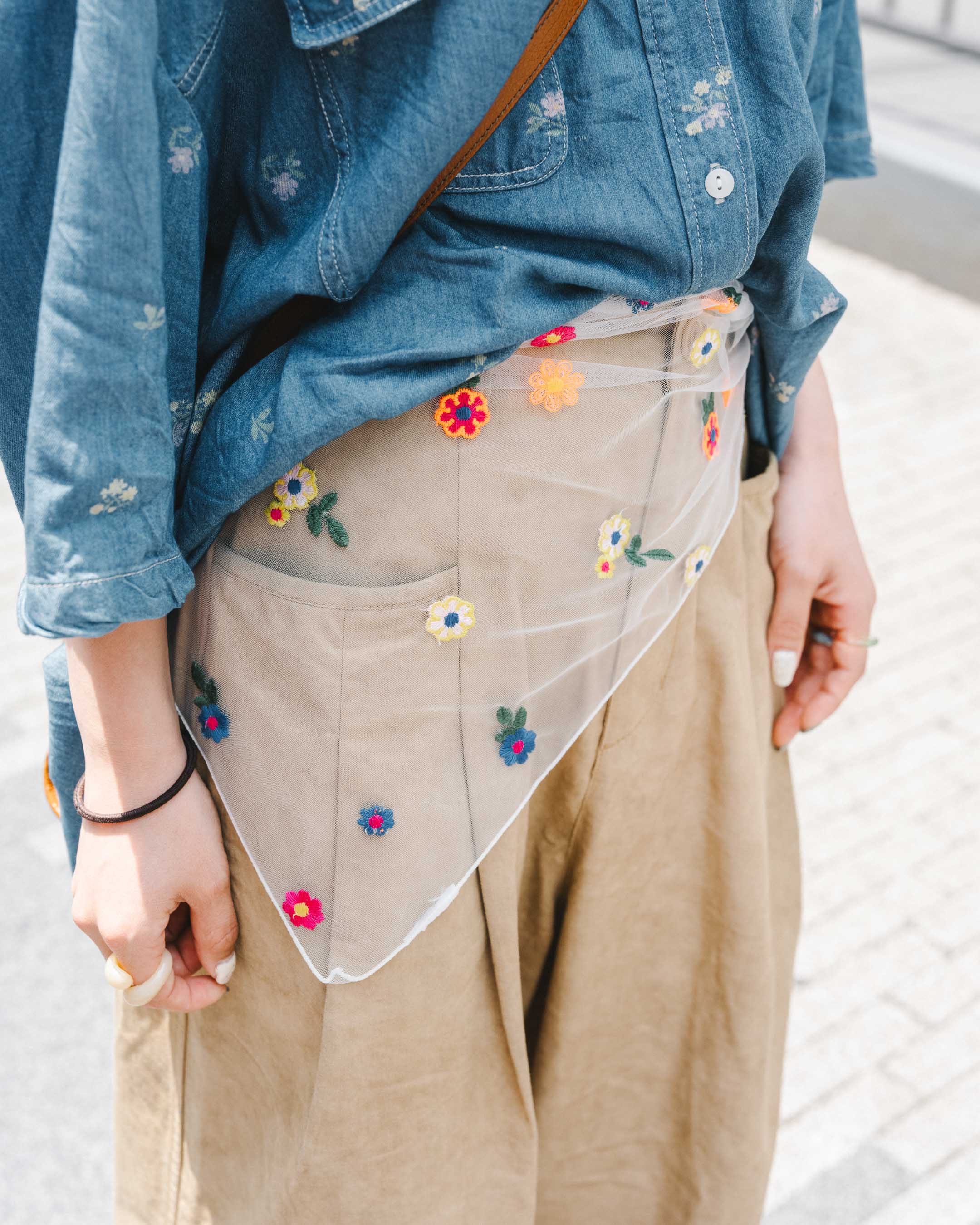 ボーイズライクなコーデは、腰のスカーフやシューズのストラップリボンなどで甘さをプラス!