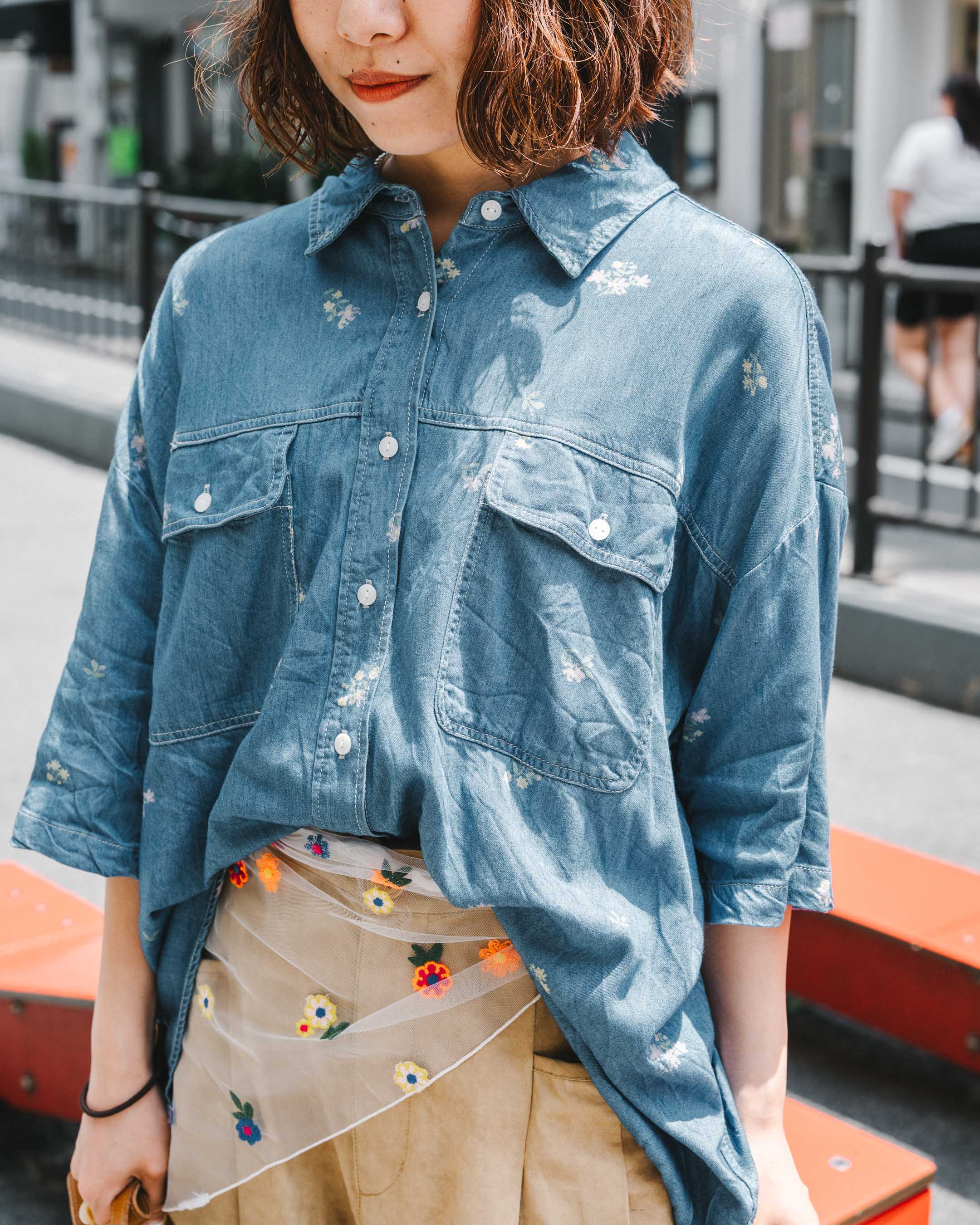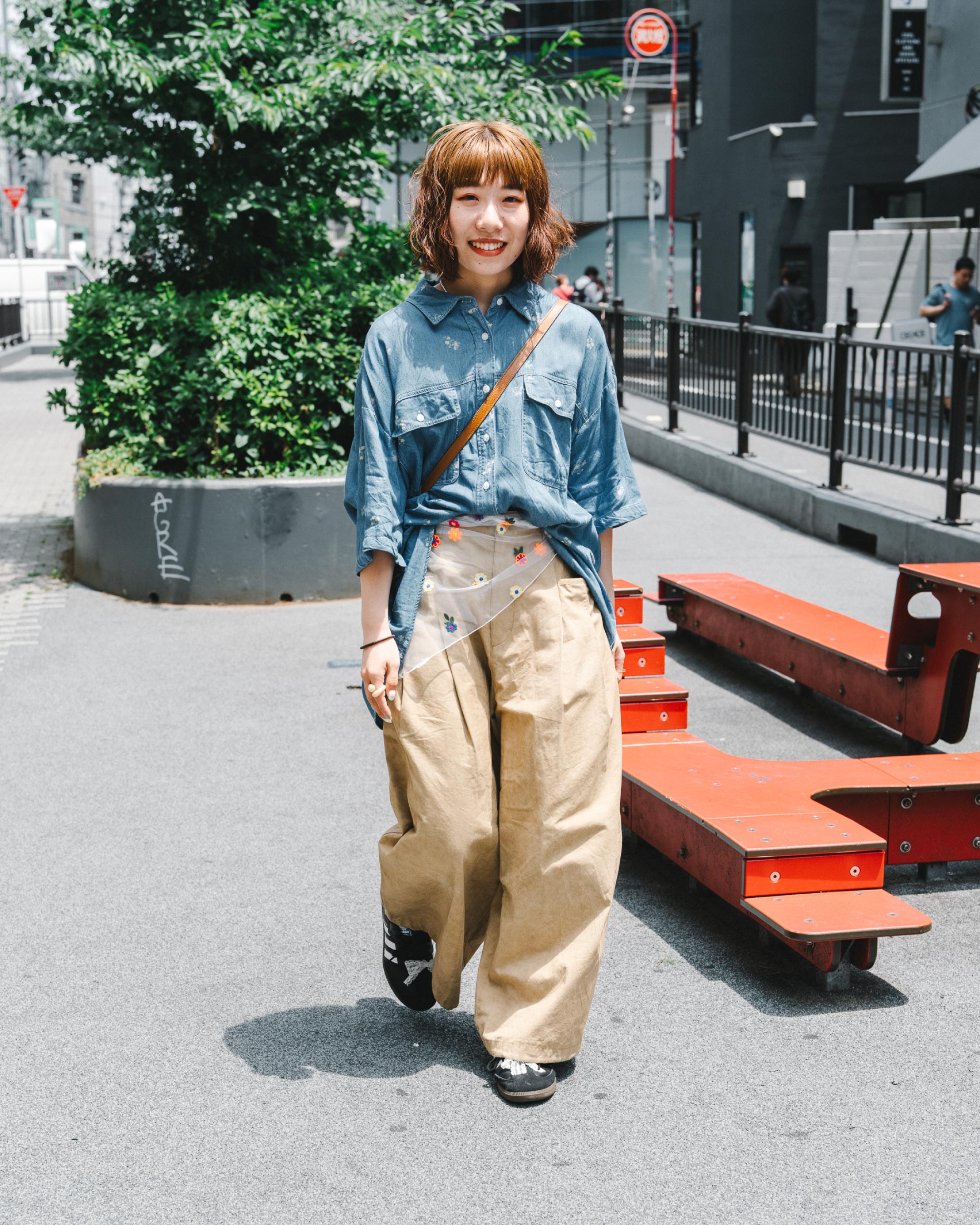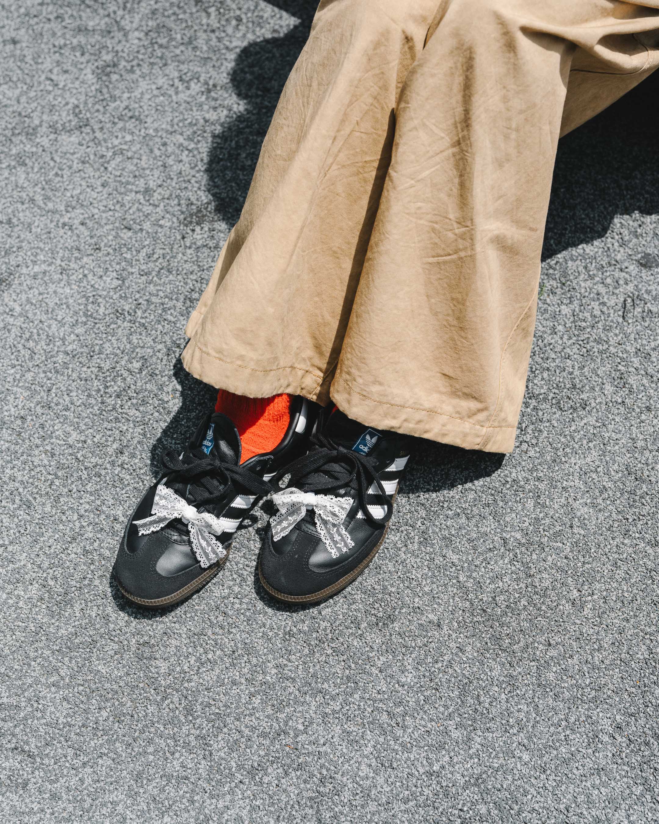 ボーイズライクなコーデは、腰のスカーフやシューズのストラップリボンなどで甘さをプラス!
