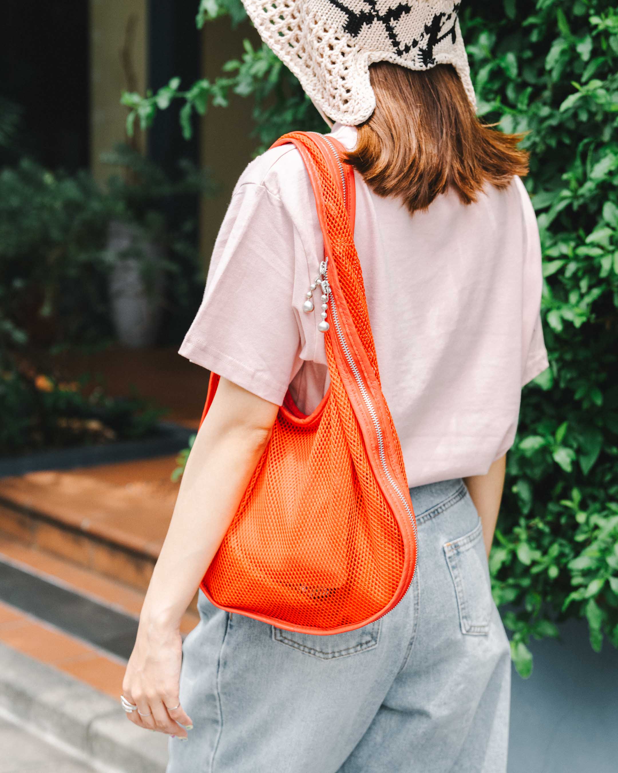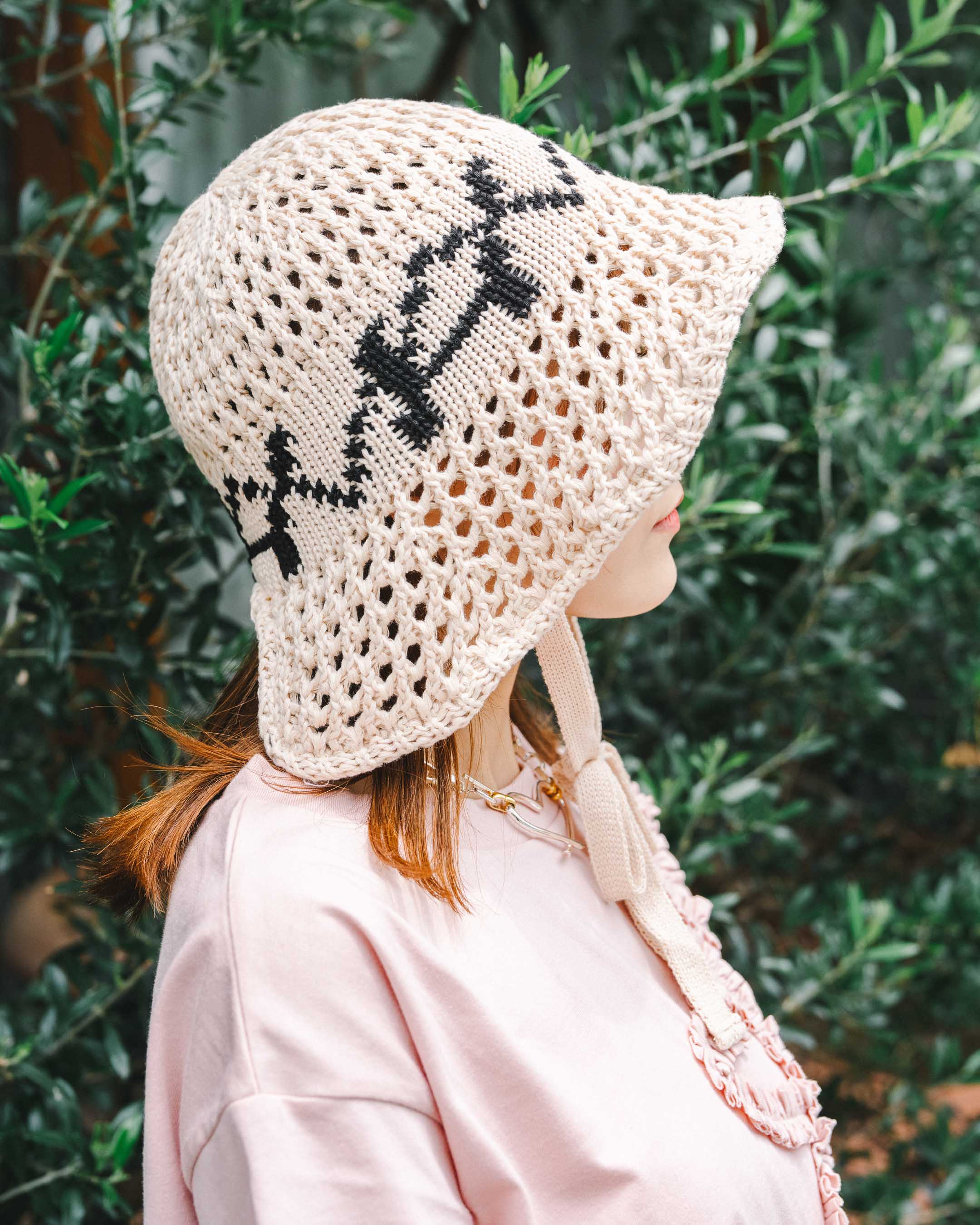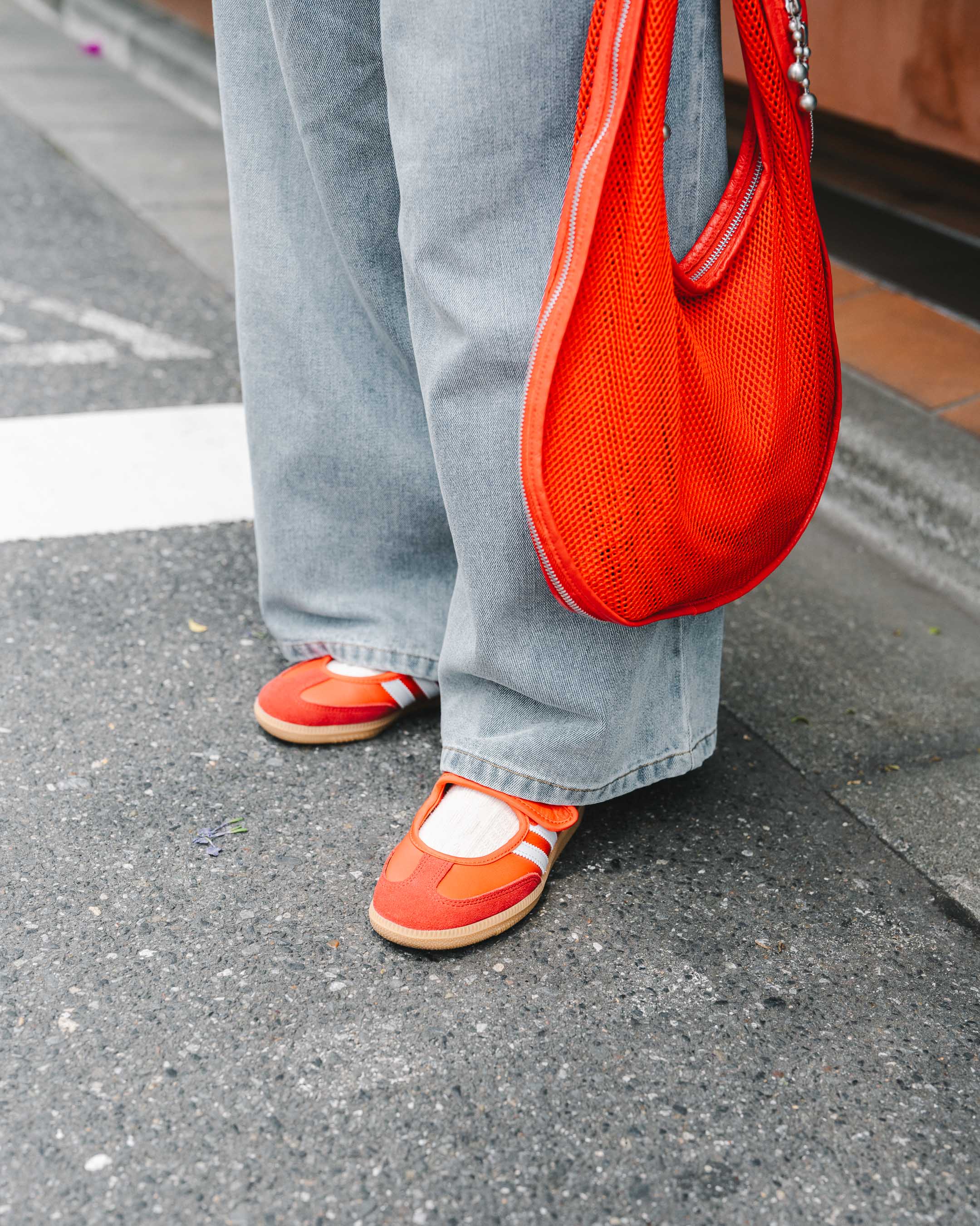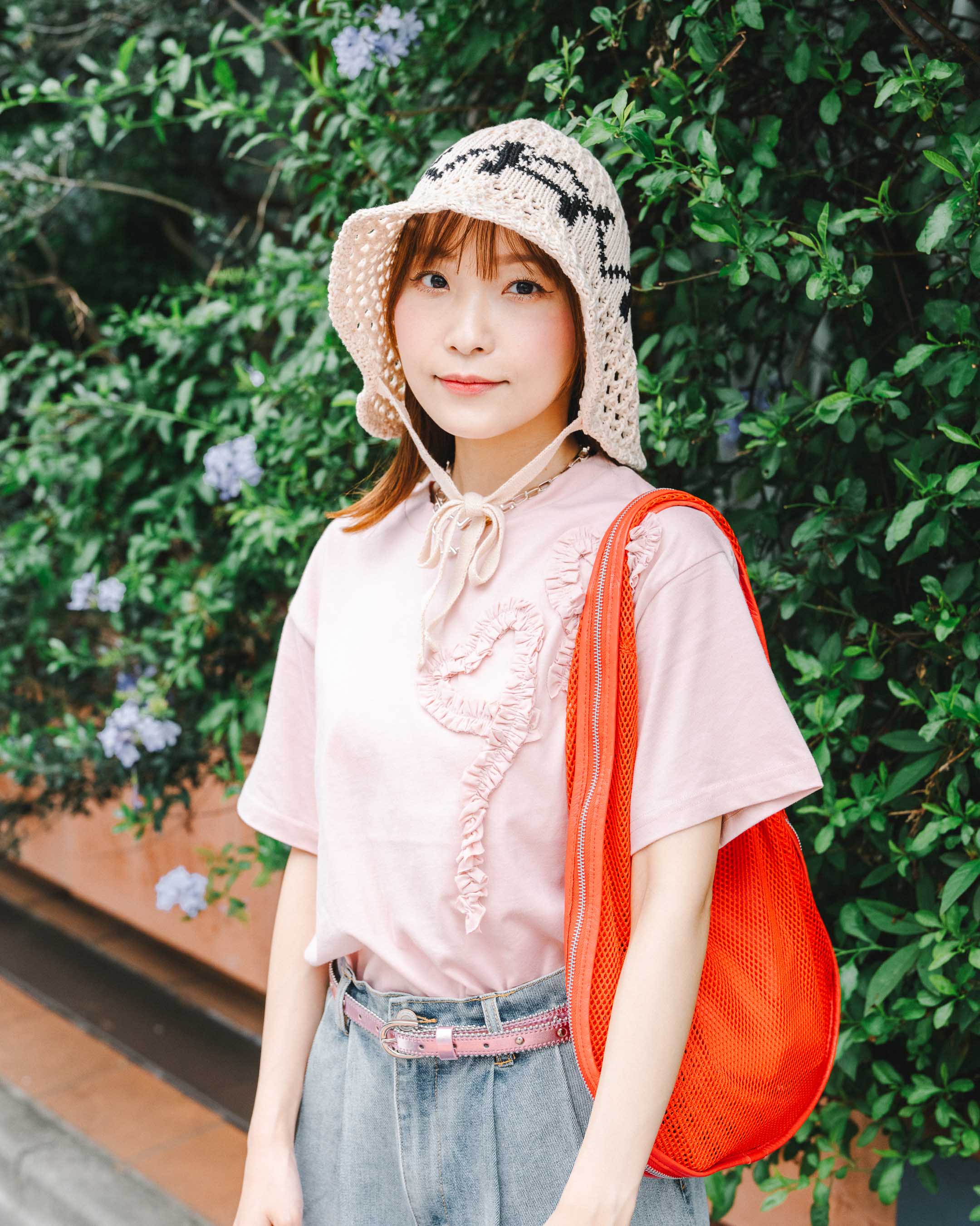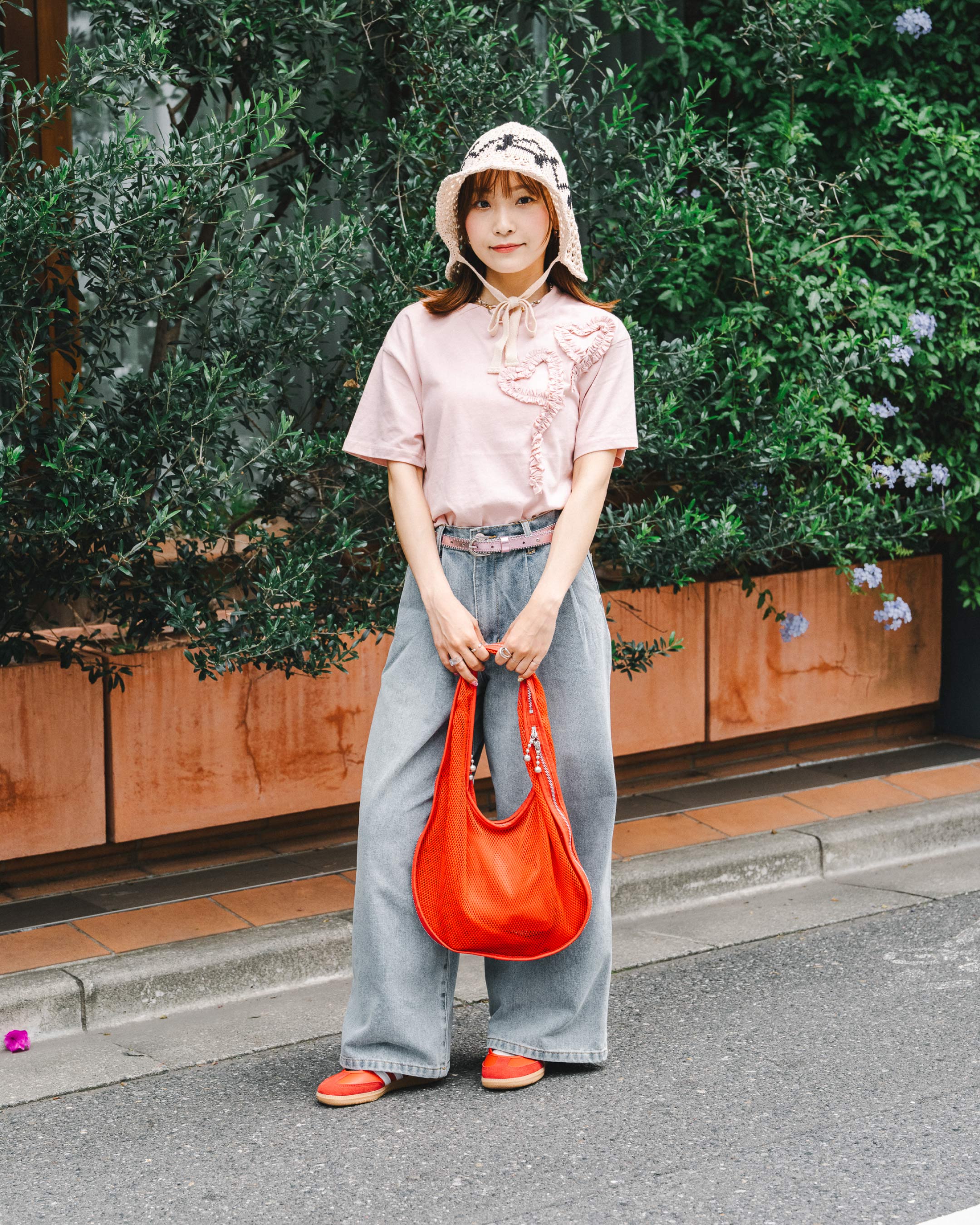レッドをポイントカラーに、メッシュバッグとボンネットハットで抜け感のある夏コーデに。