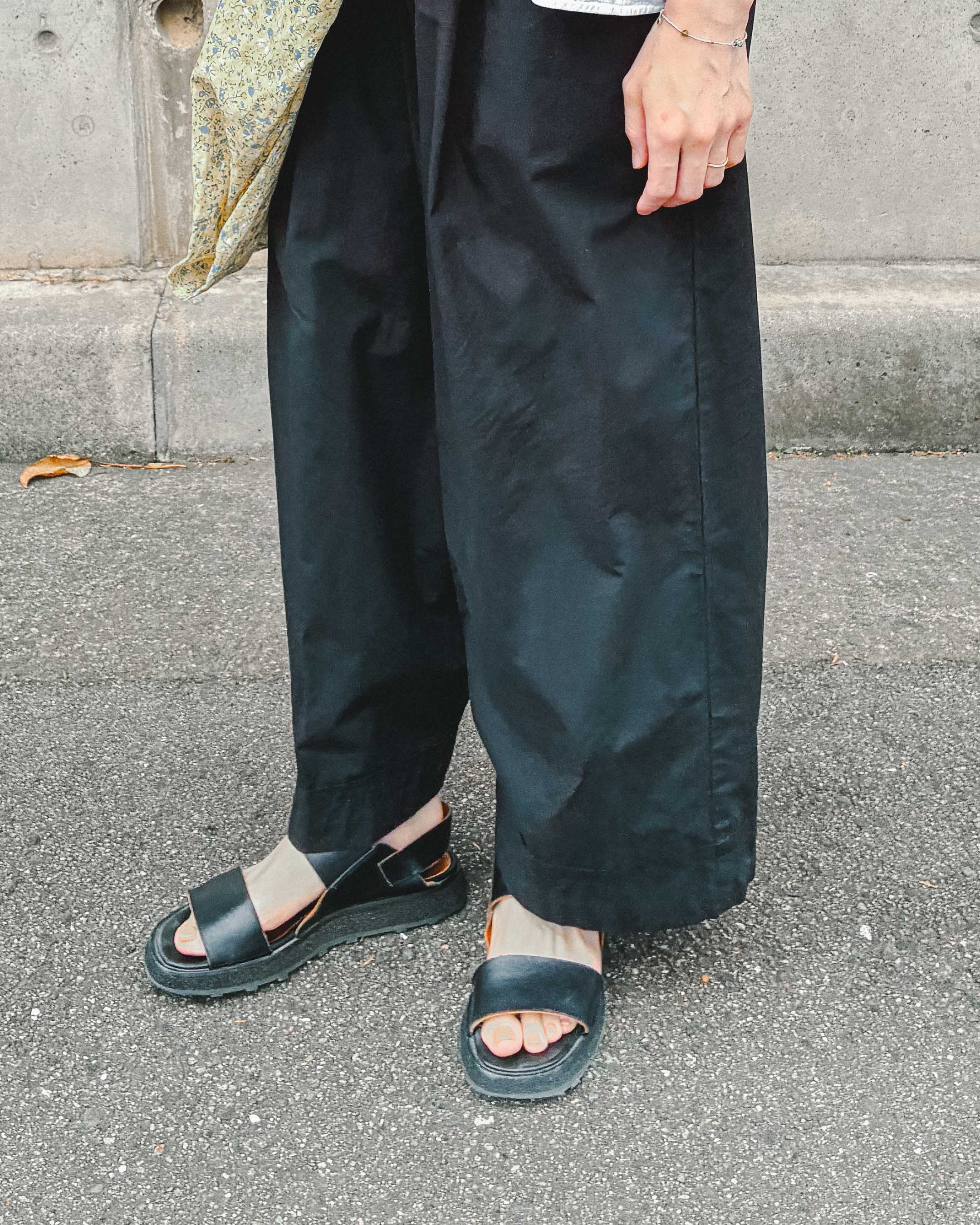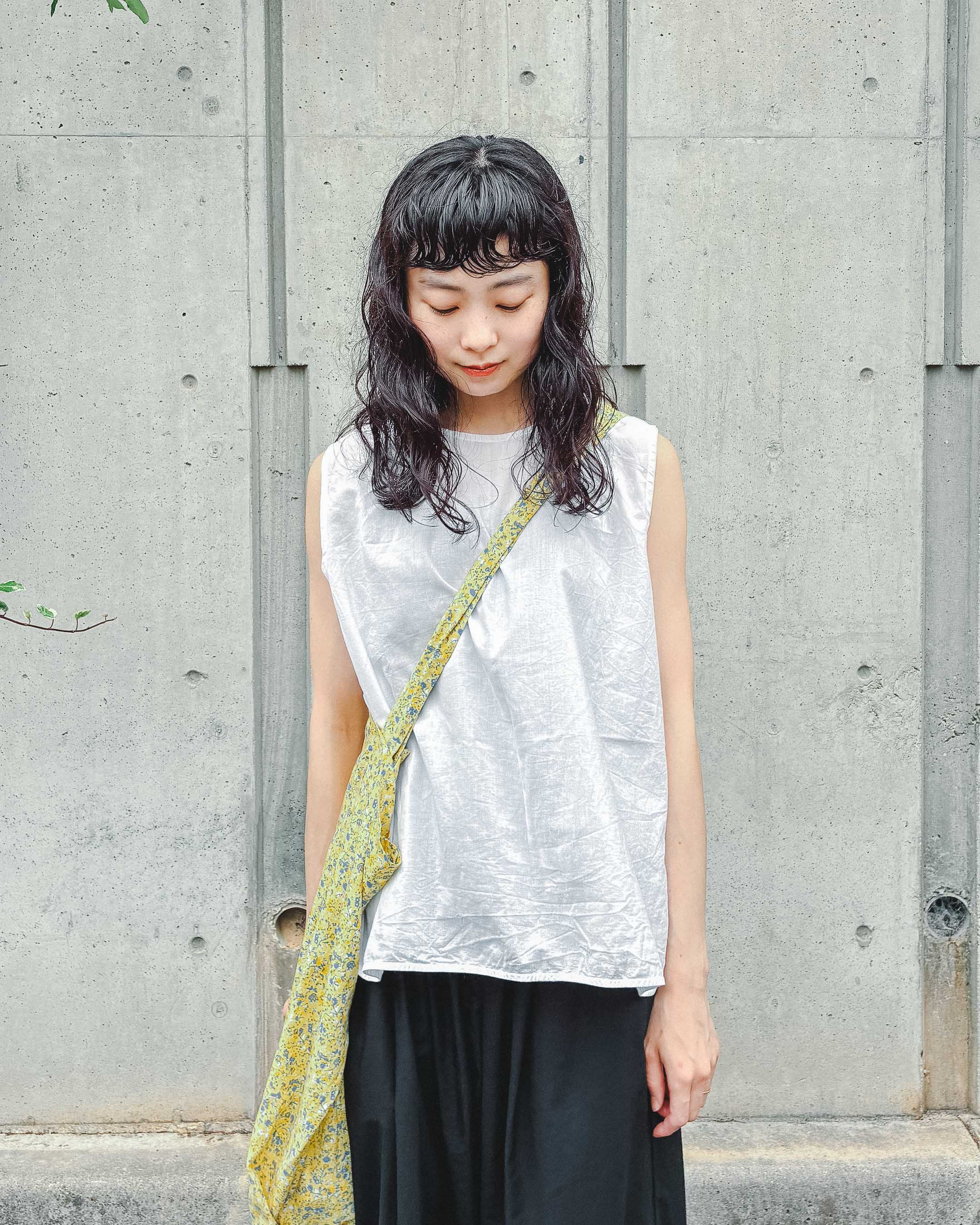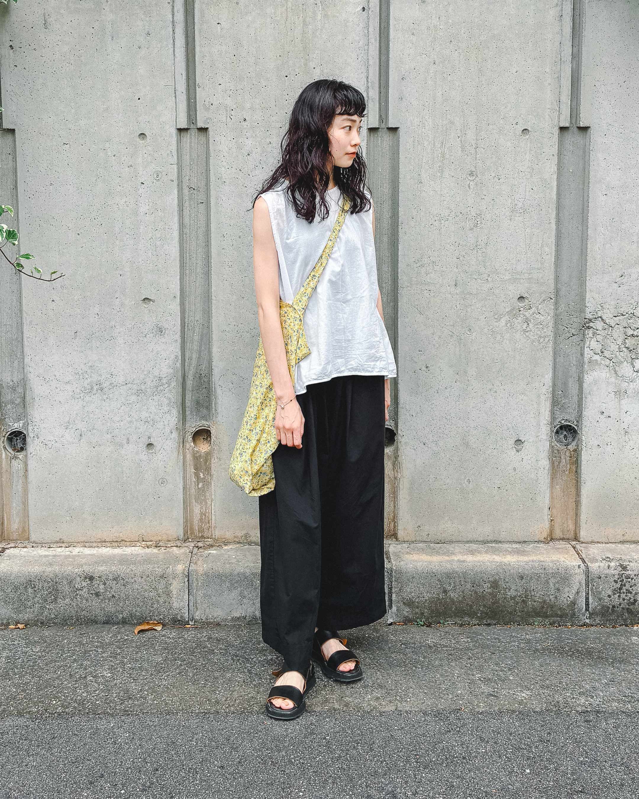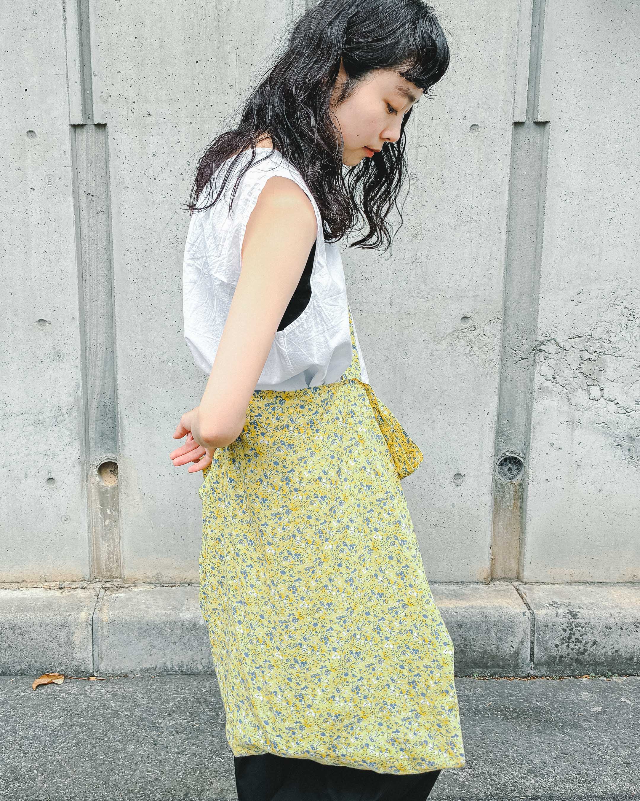 モノトーンのナチュラルコーデにイエローの小花柄バッグが映える!