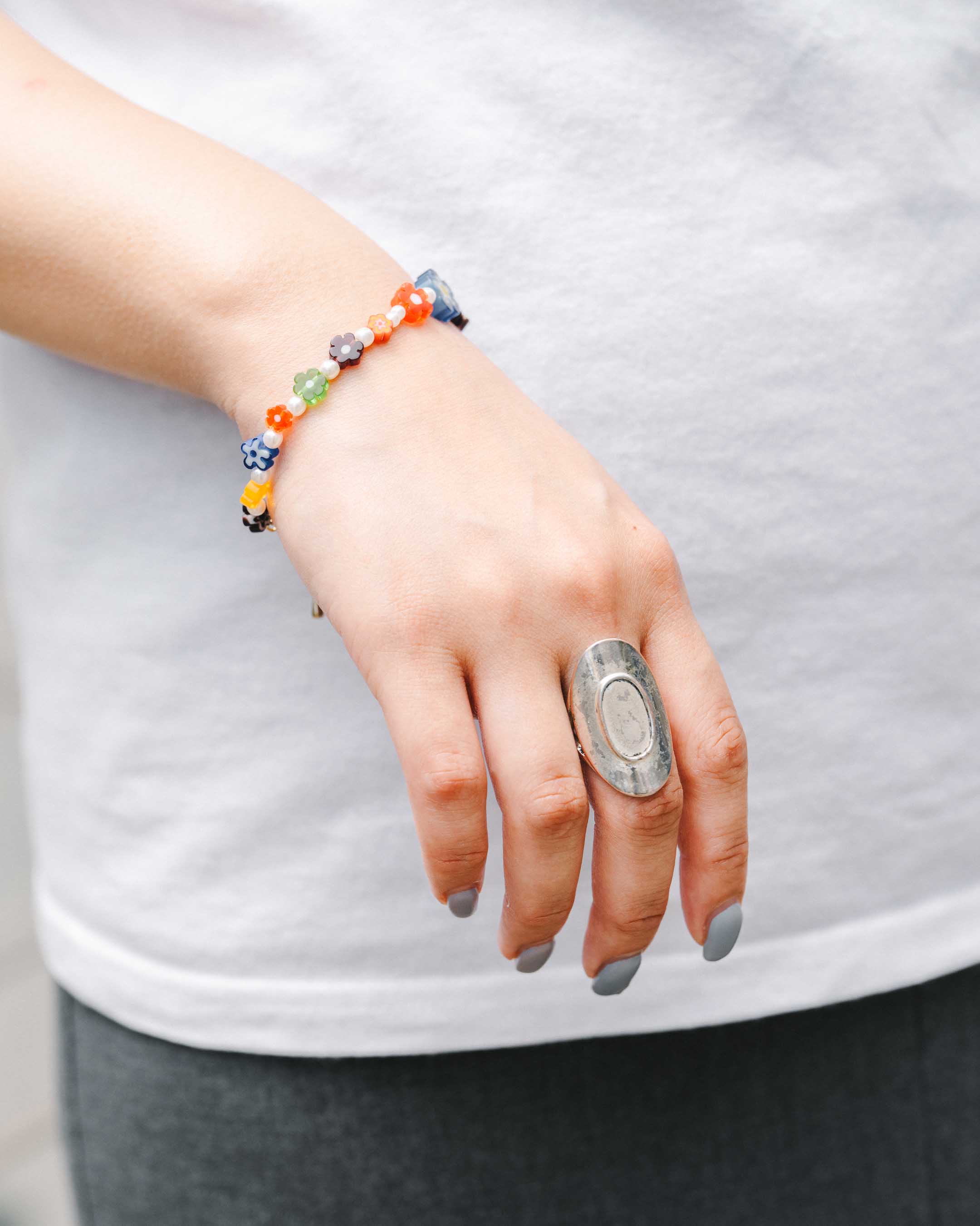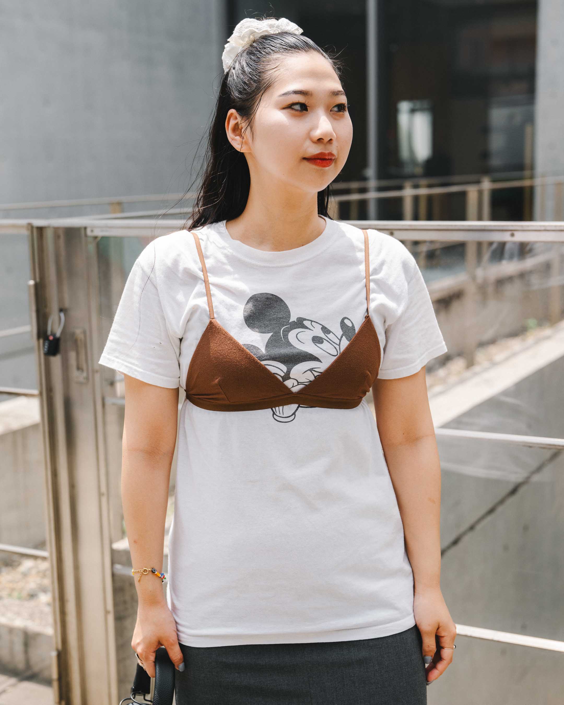 キャラクターTシャツにビスチェで甘さをON!足元の赤シューズが差し色に。