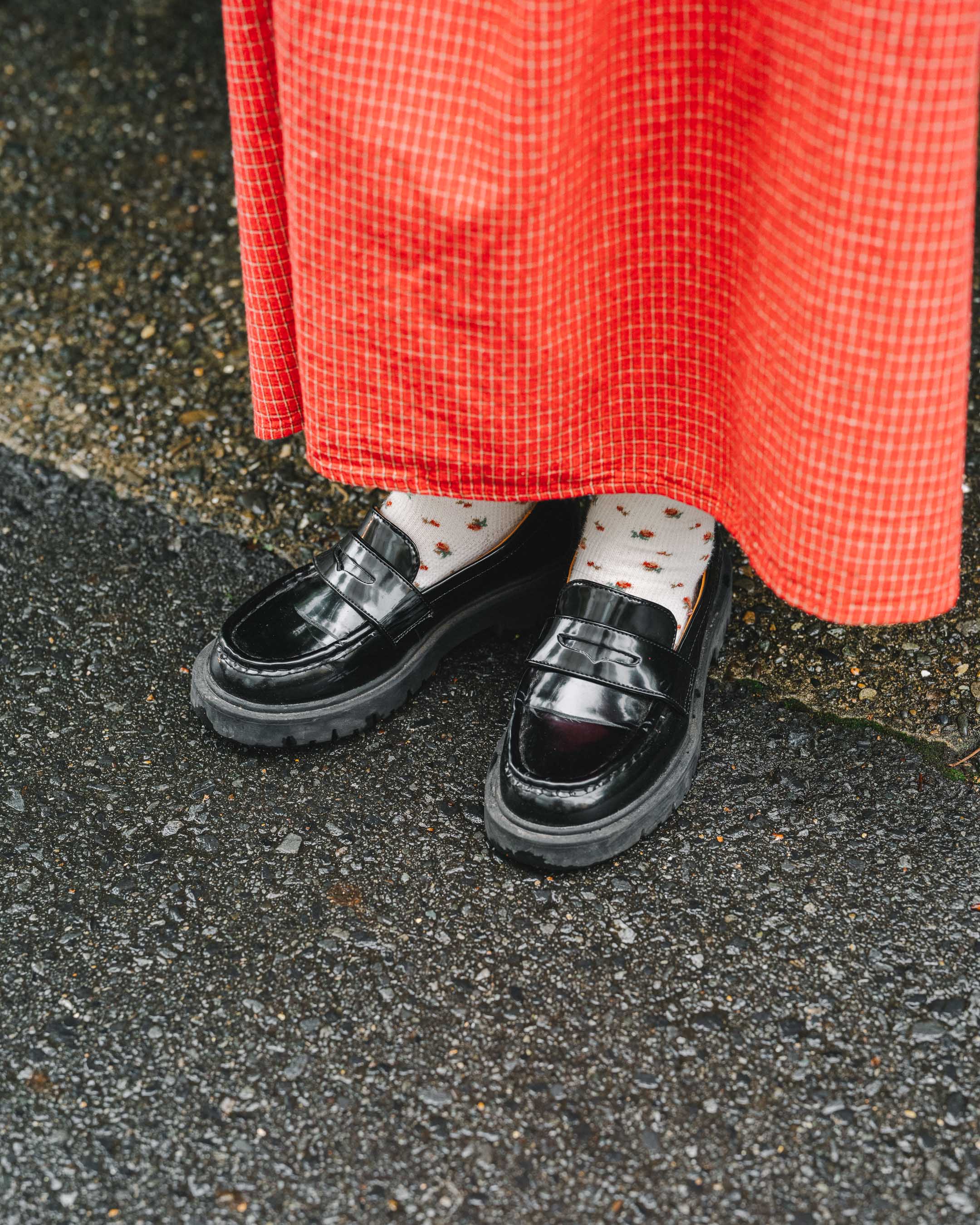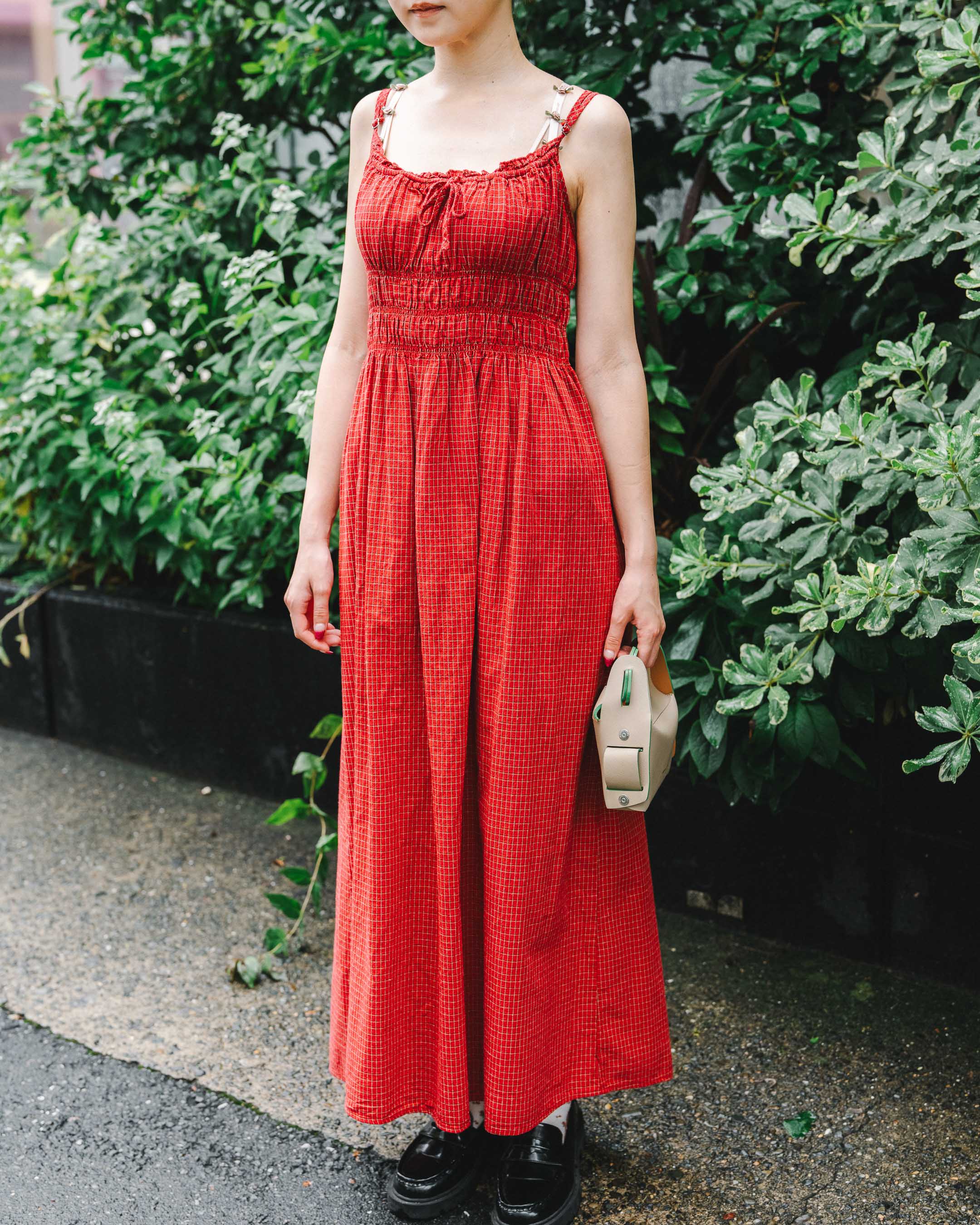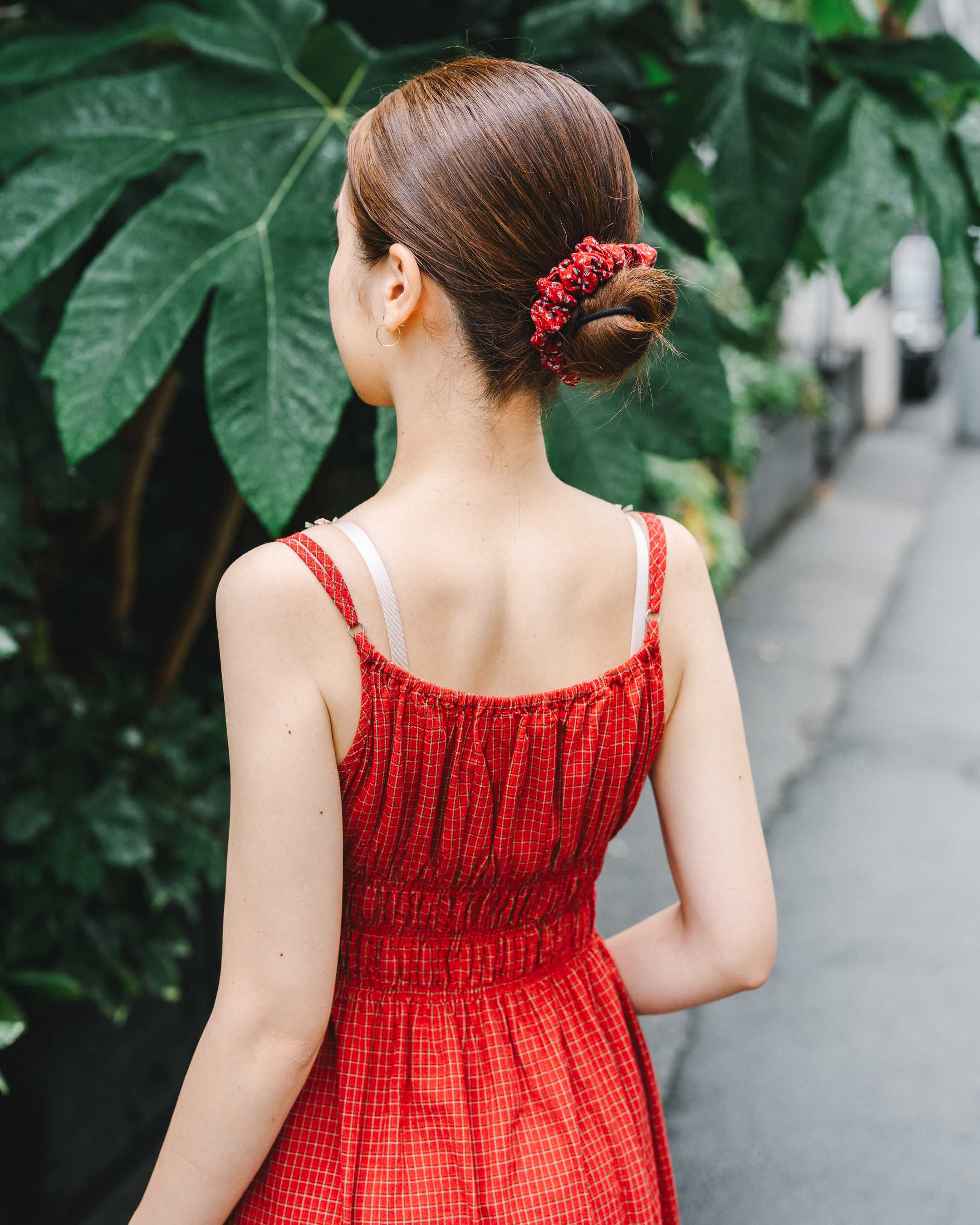 赤色のワンピースとシュシュの色を合わせて、ラフになり過ぎないよう足元はローファーに。