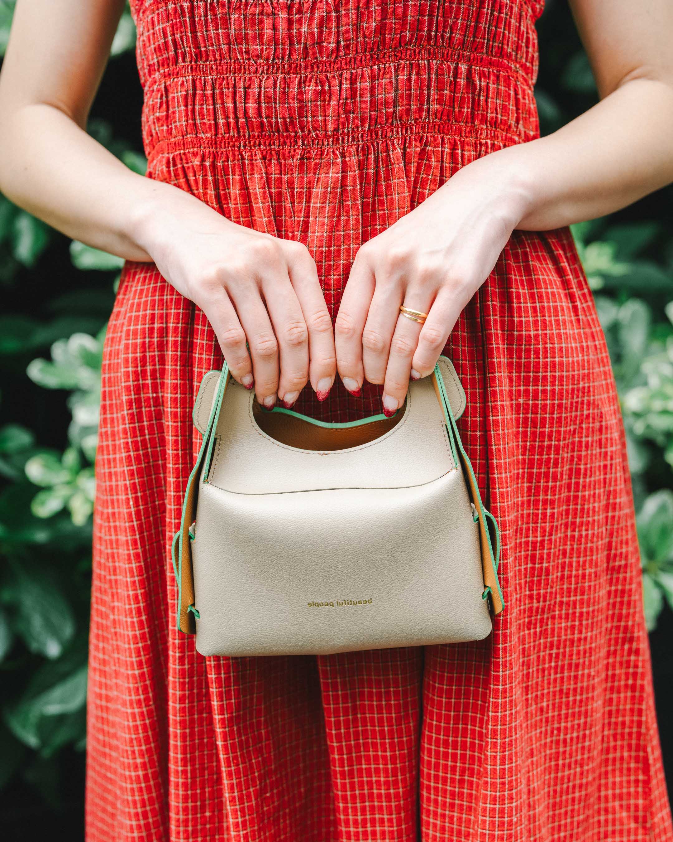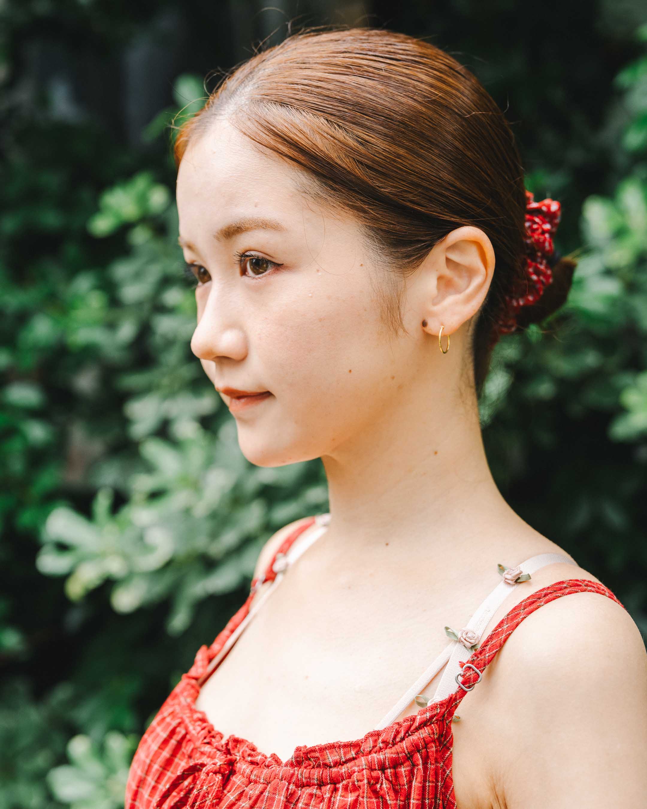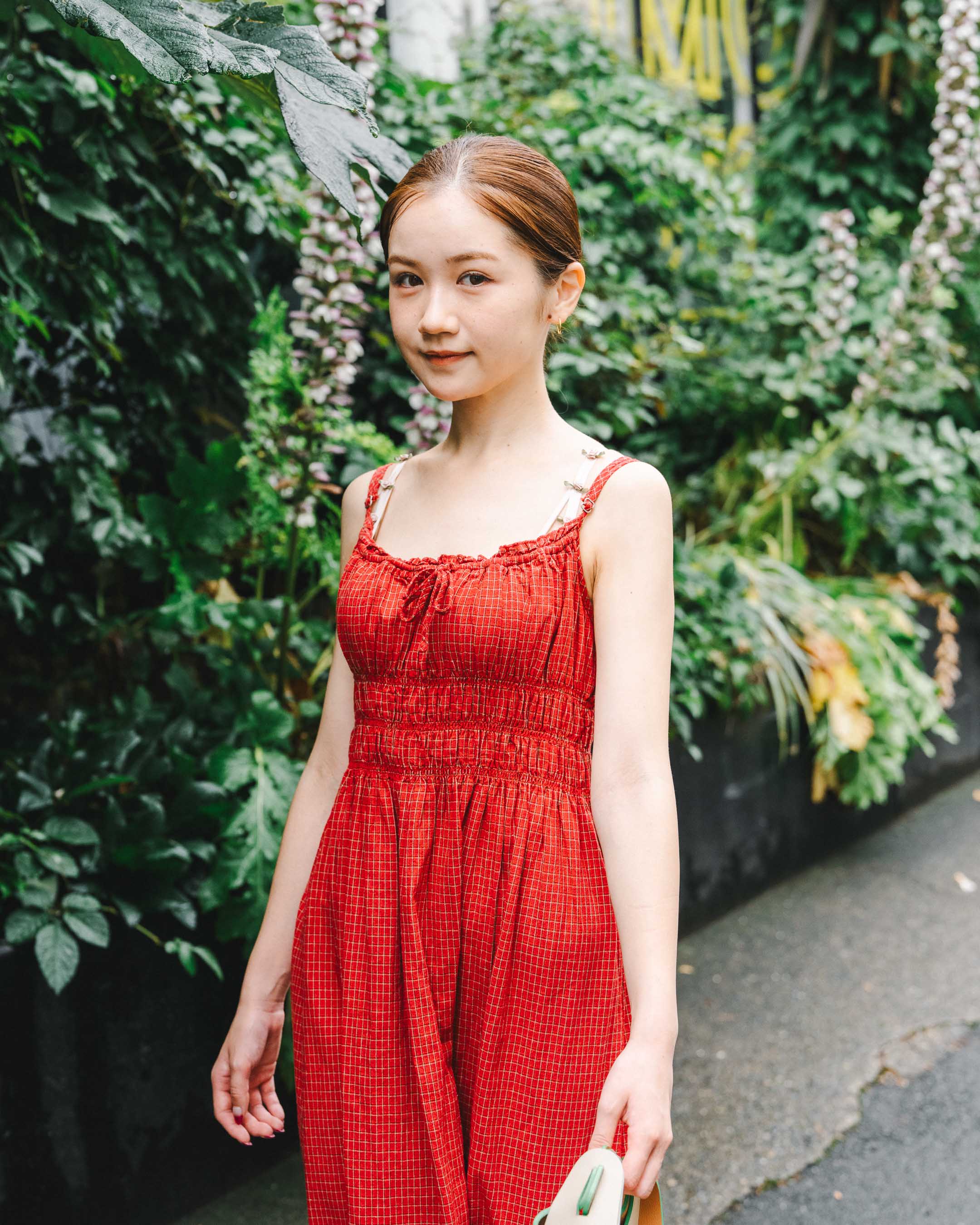 赤色のワンピースとシュシュの色を合わせて、ラフになり過ぎないよう足元はローファーに。