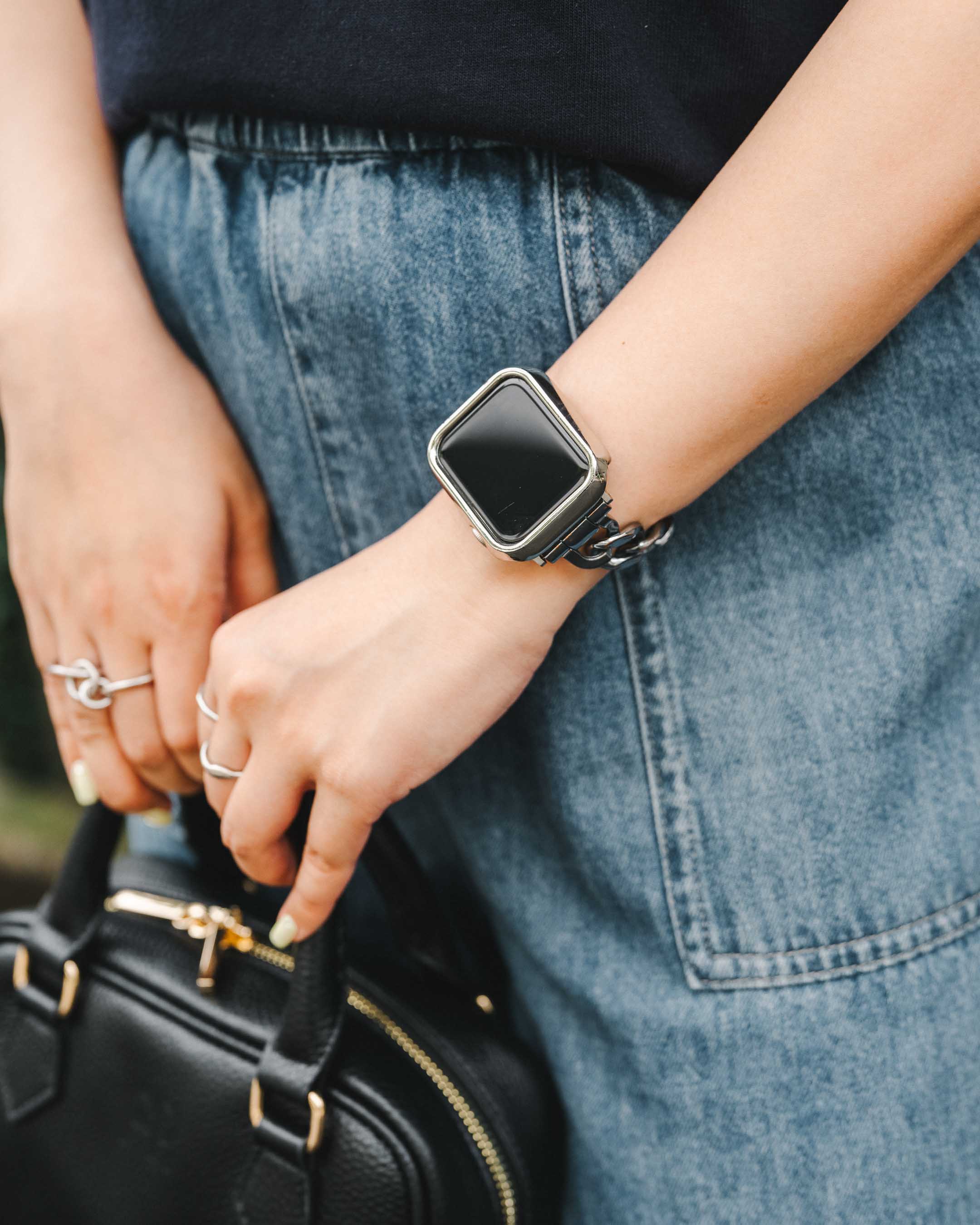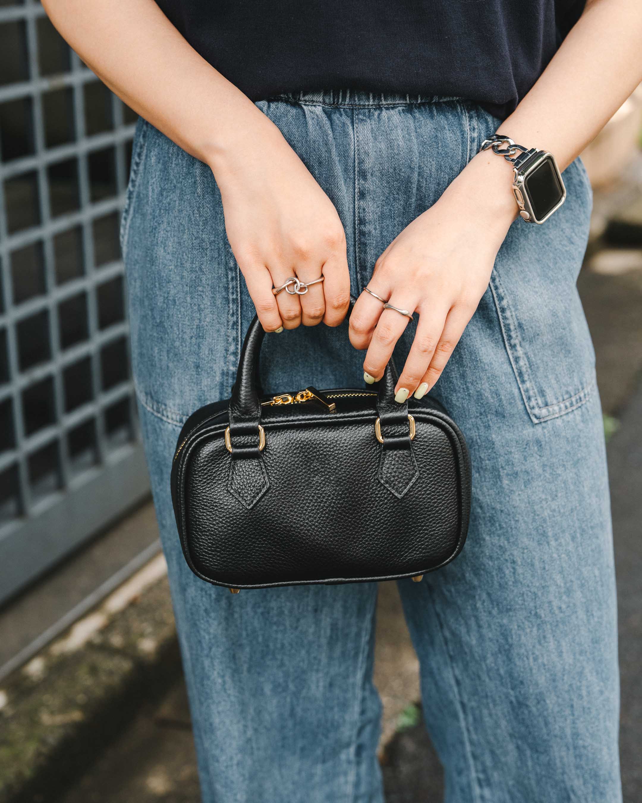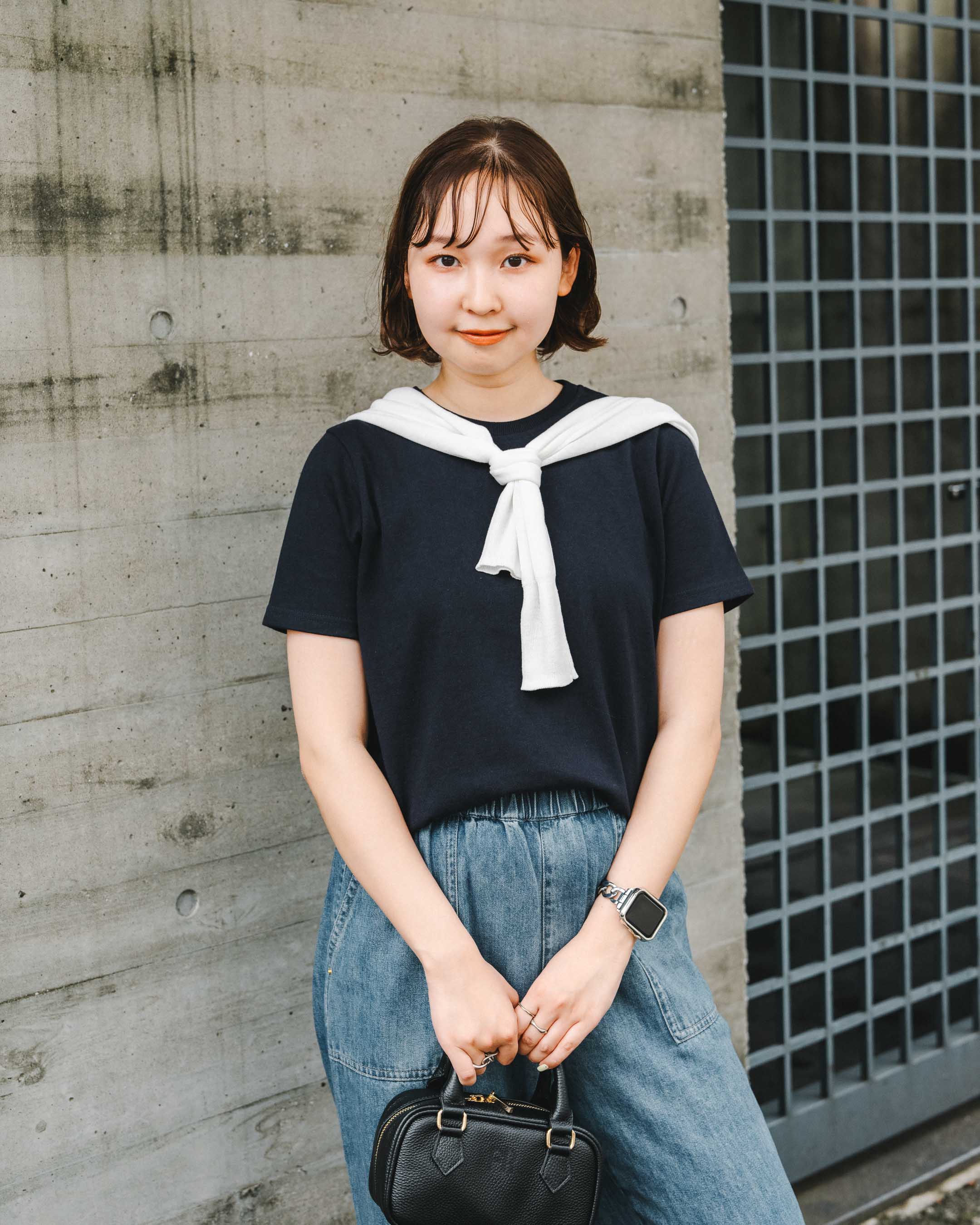 Tシャツとデニムのシンプルコーデに、カーディガンやミニレザーボストンを加えて少しトラッドに。