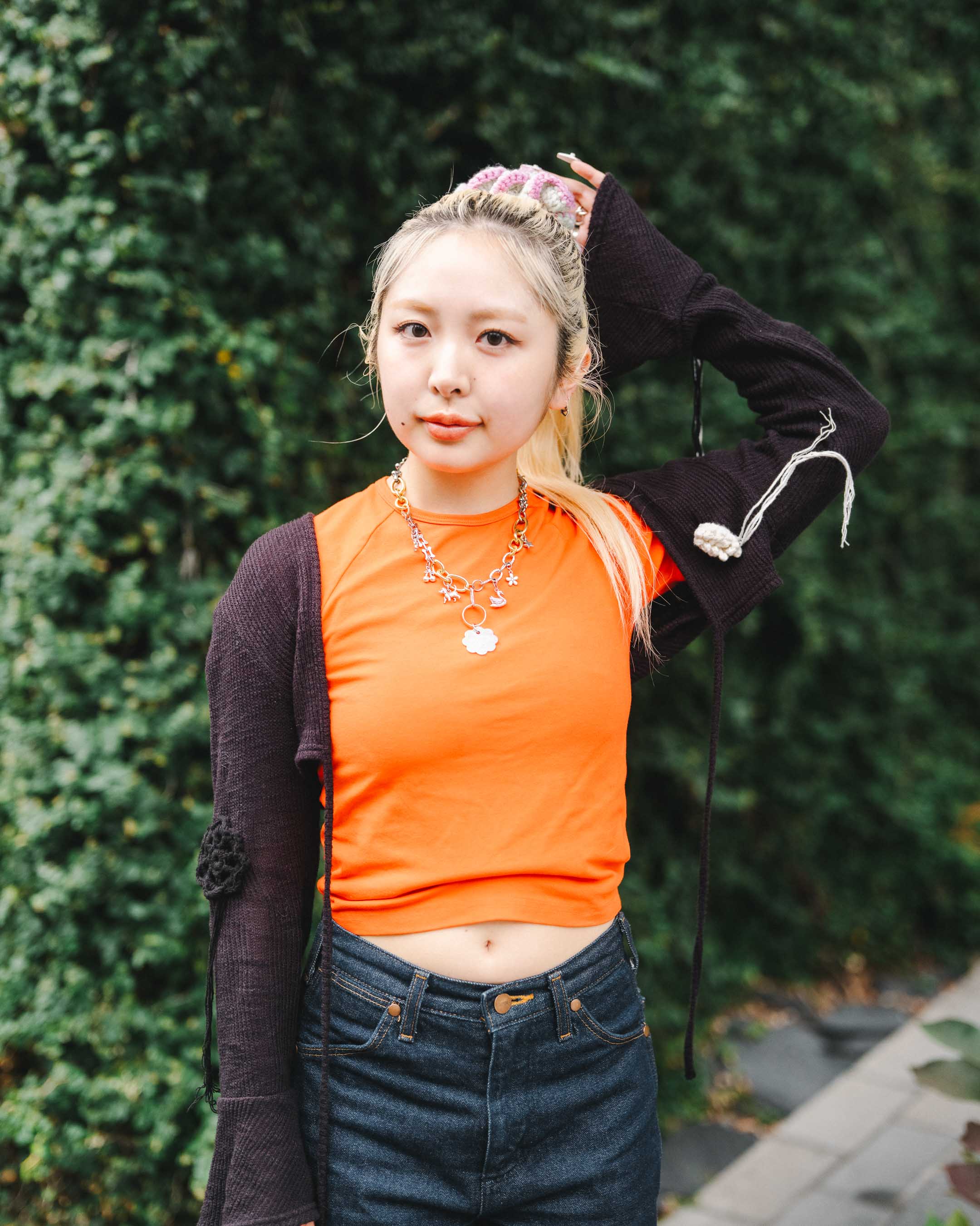 Worker Tokyo @harukawamou 152cm シンプルなデニムのスタイリングに色使いで遊び心プラス♩ Outer:Kijun Tops:Los Angeles Apparel Bottoms:Wrangler Shoes:ALM. Bag:hai Necklace:Foundry Mews Hair accessories:Handmade photographer:asuka (moco&company)