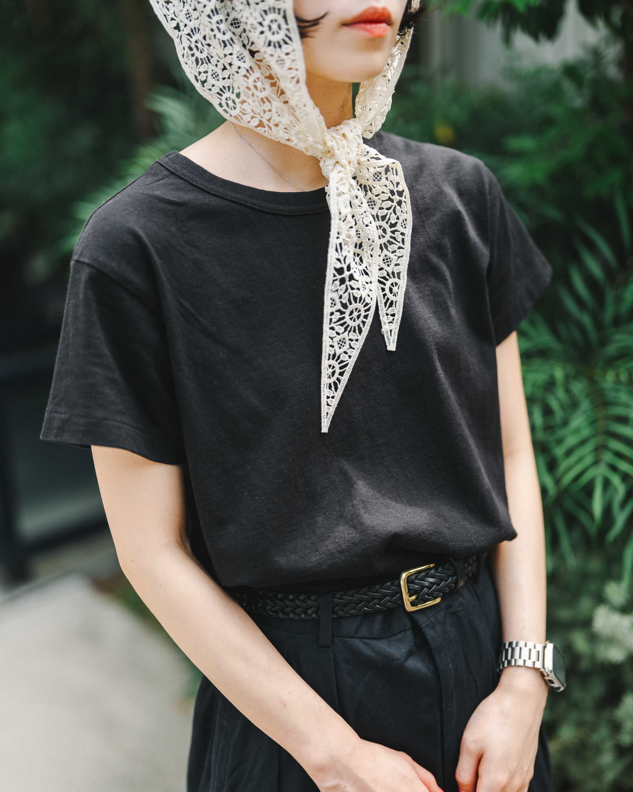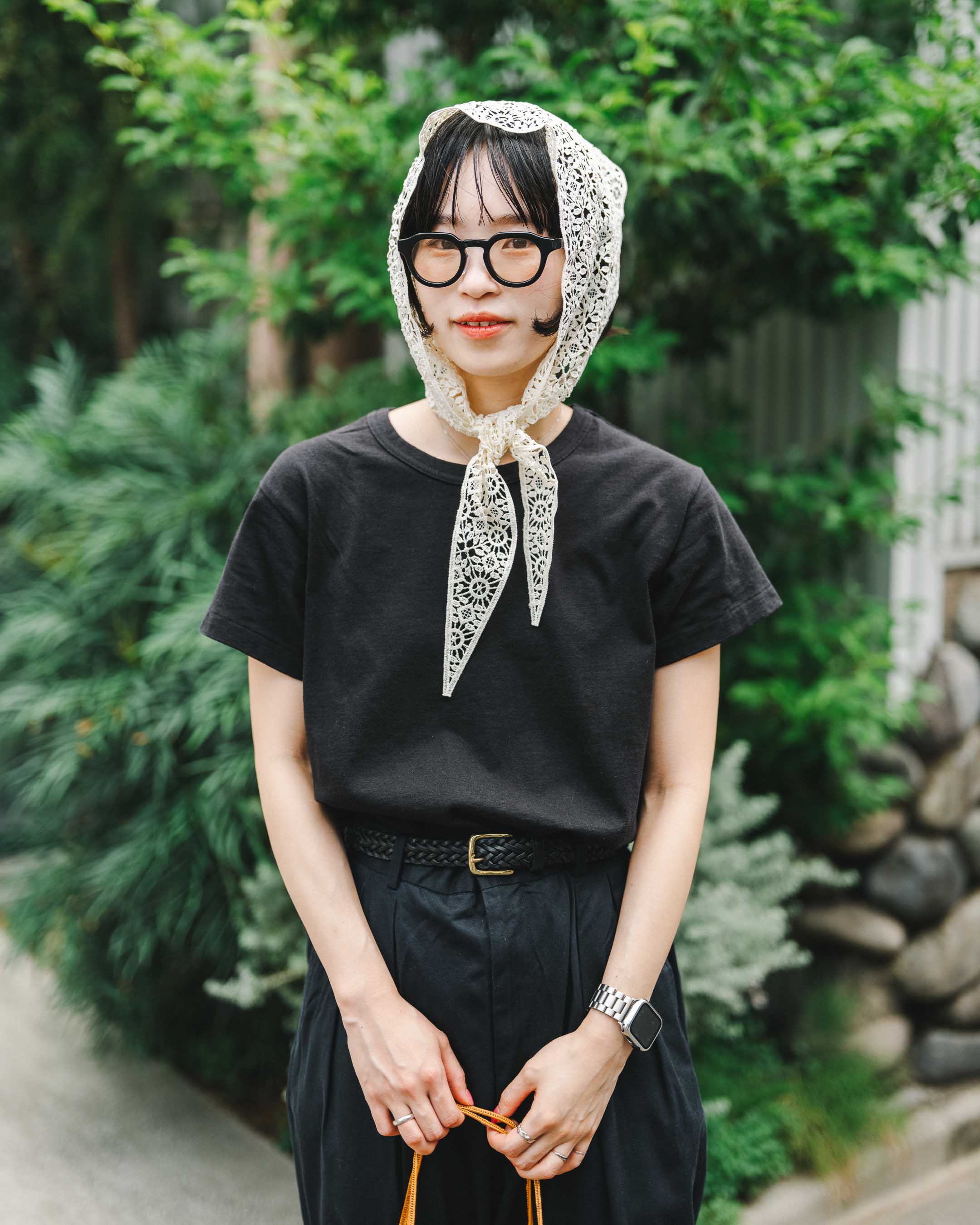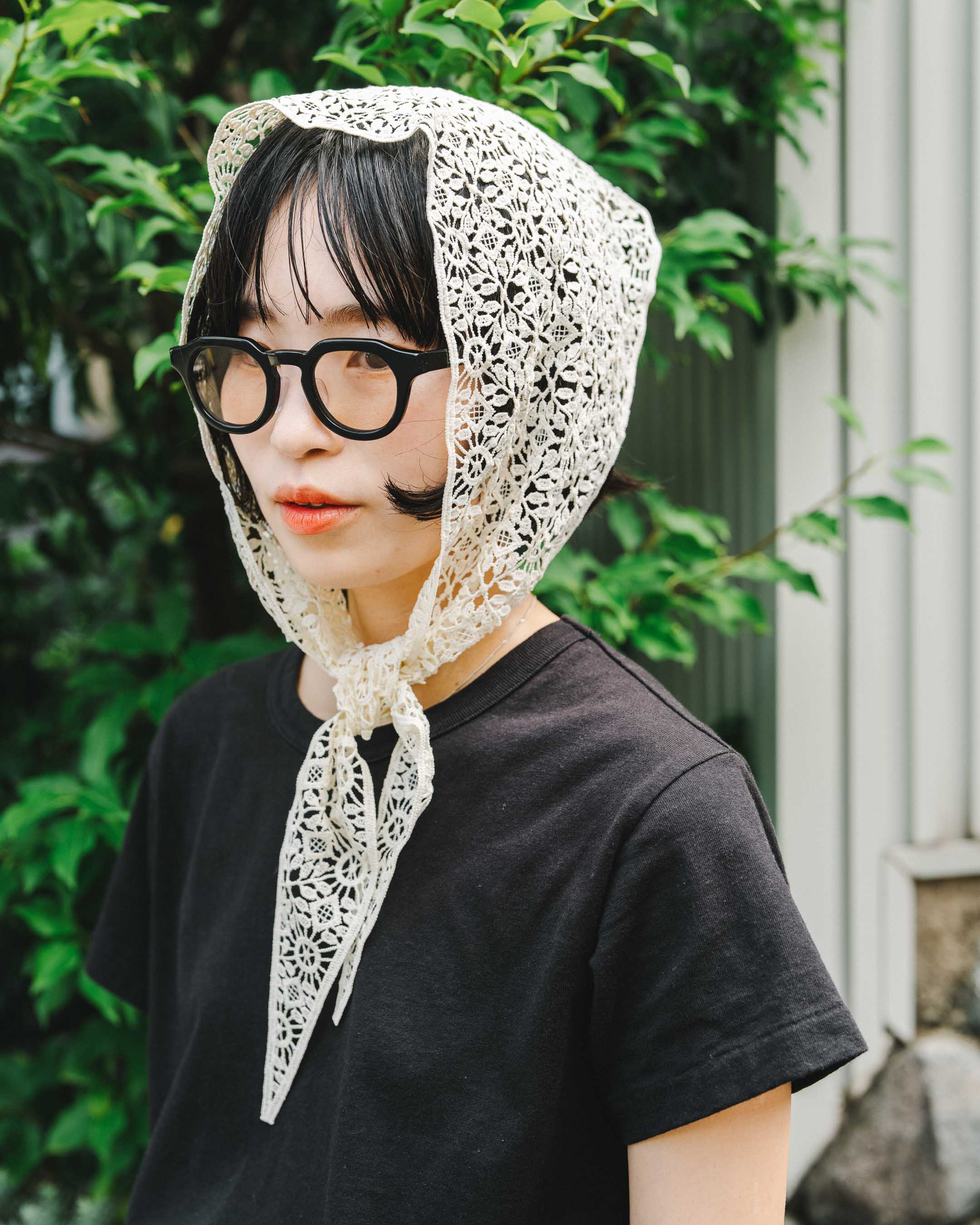 シックなワントーンコーデをレースのバブーシュカでヨーロッパ女子風に仕上げる。
