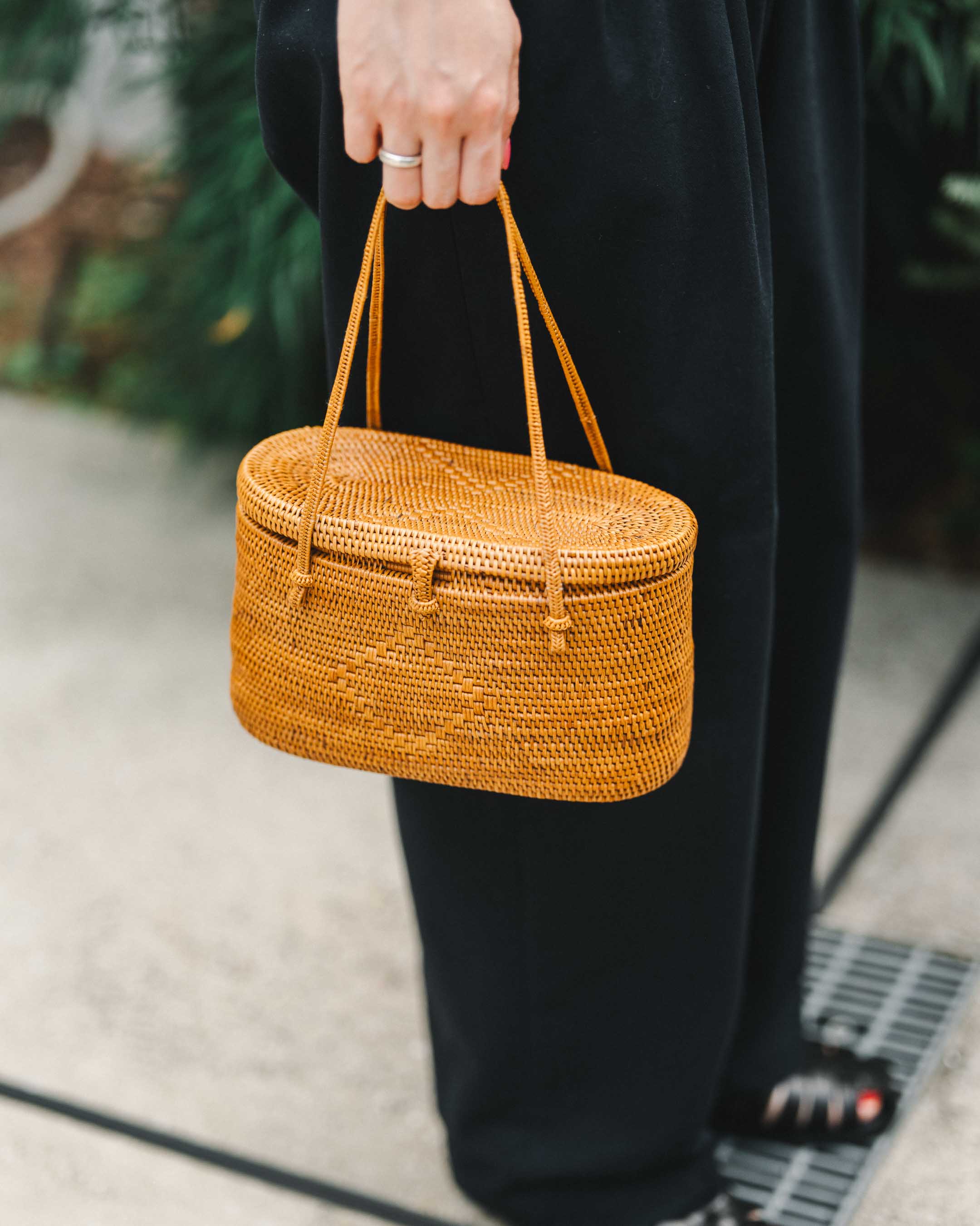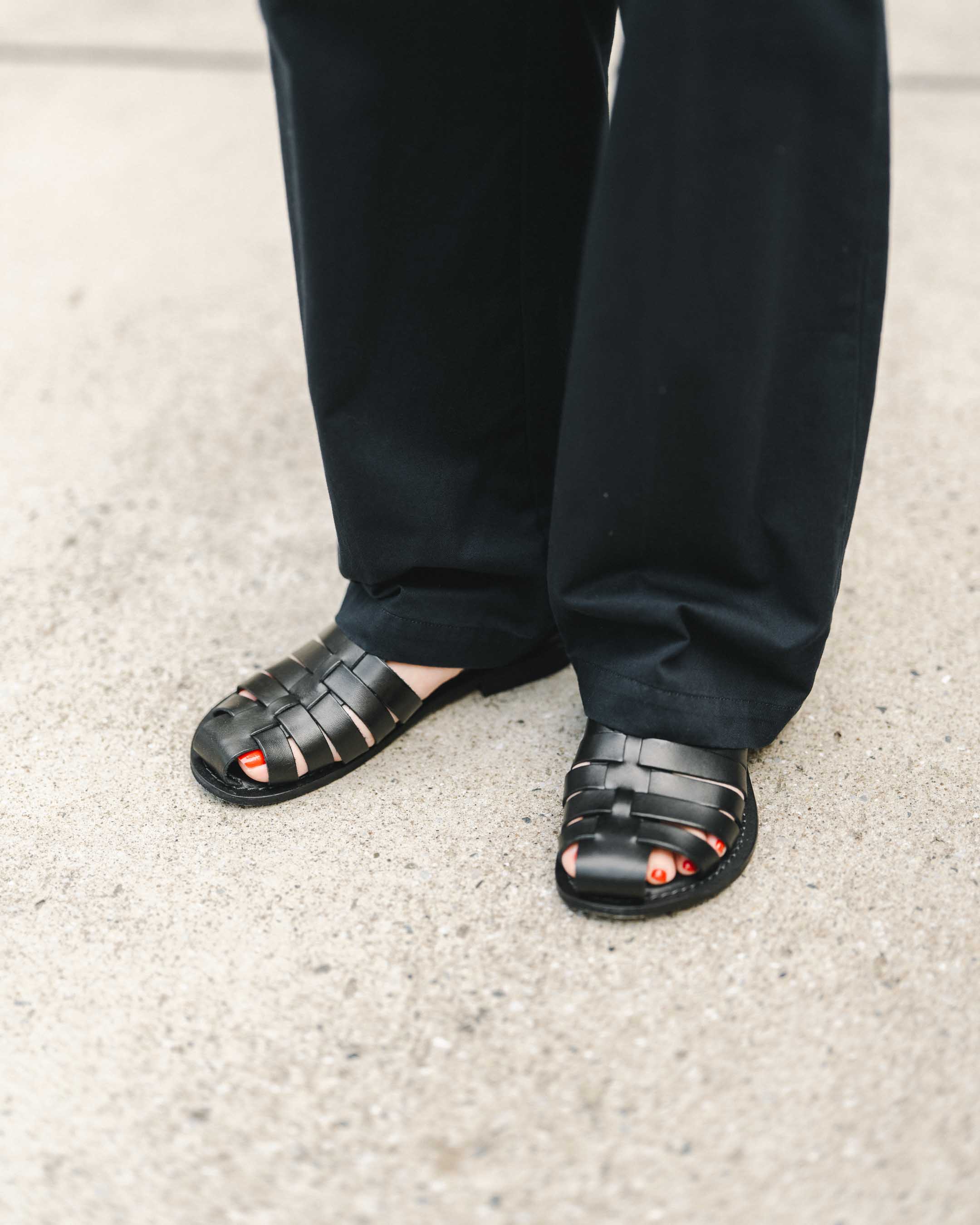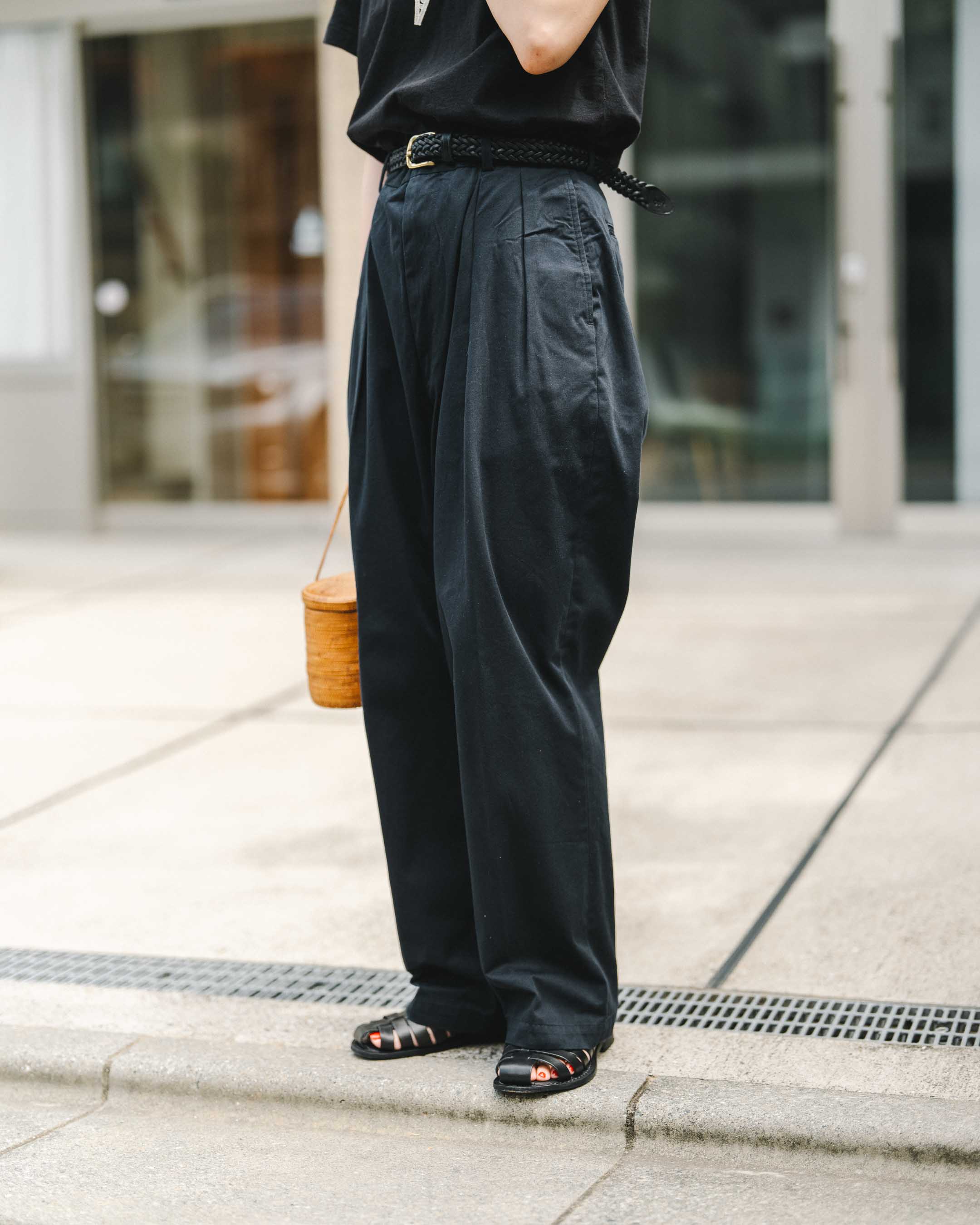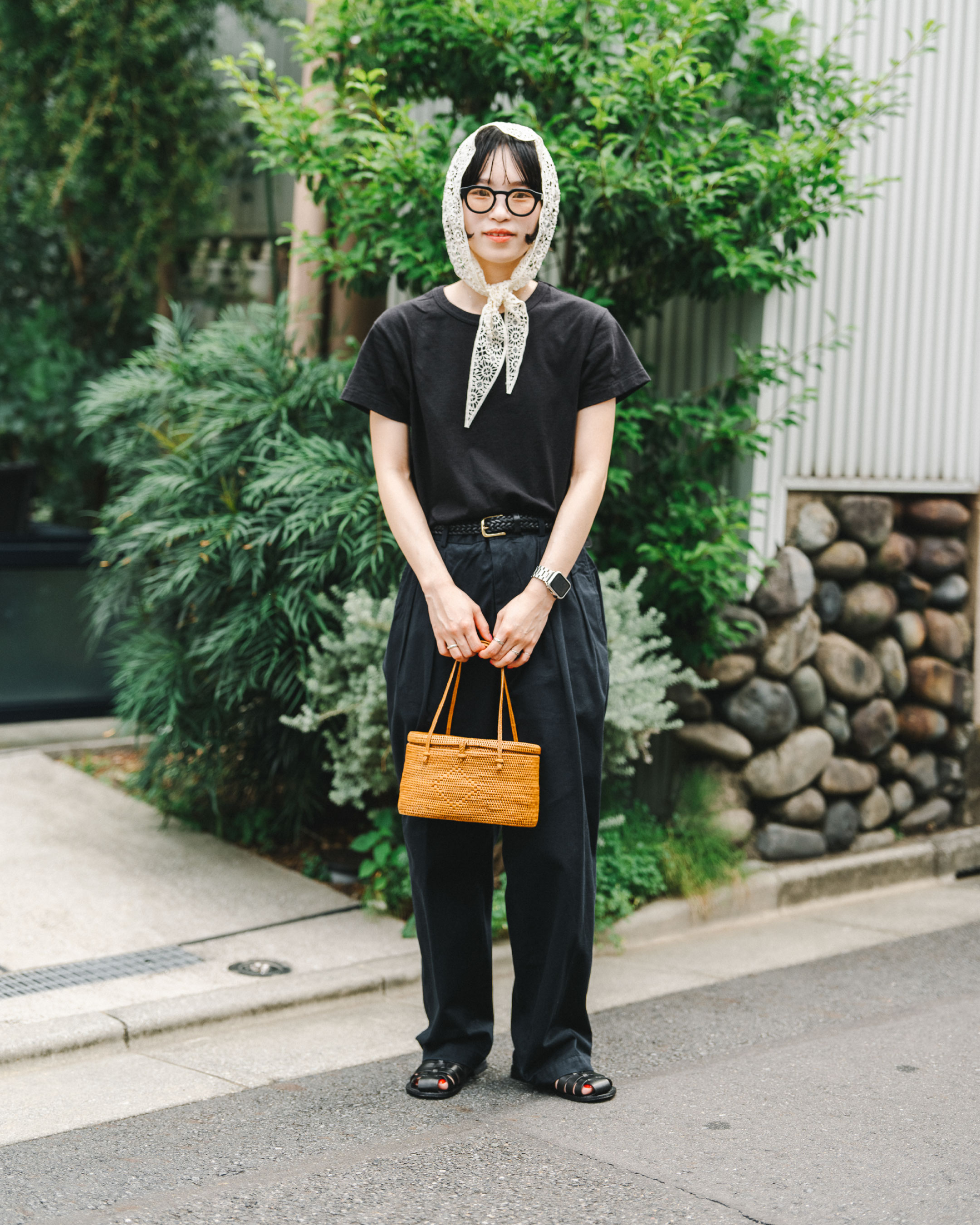 シックなワントーンコーデをレースのバブーシュカでヨーロッパ女子風に仕上げる。