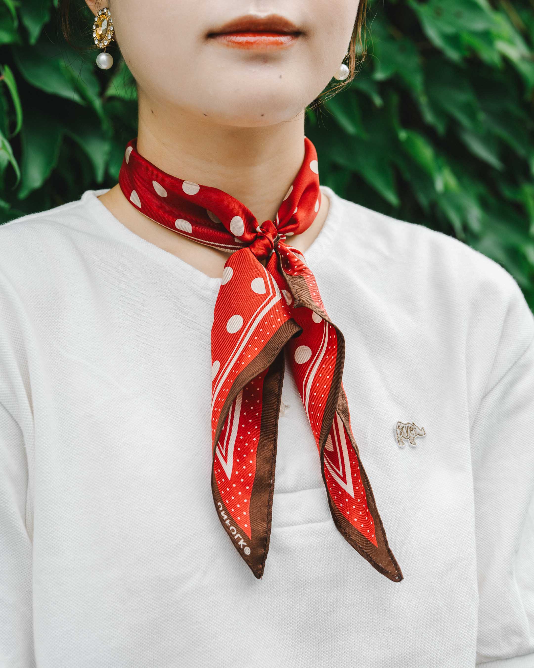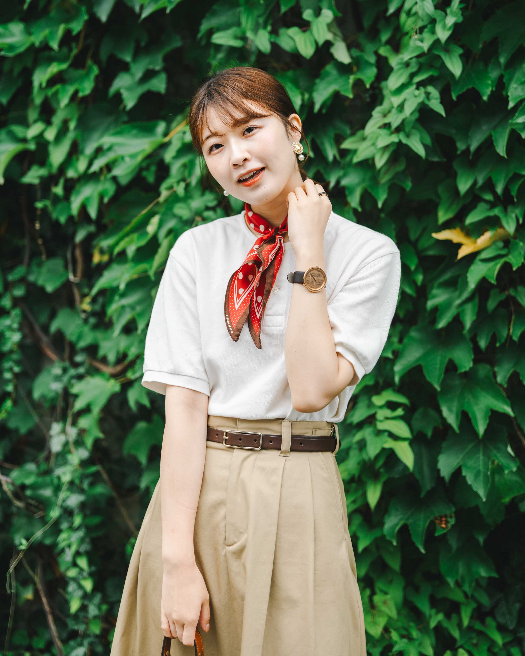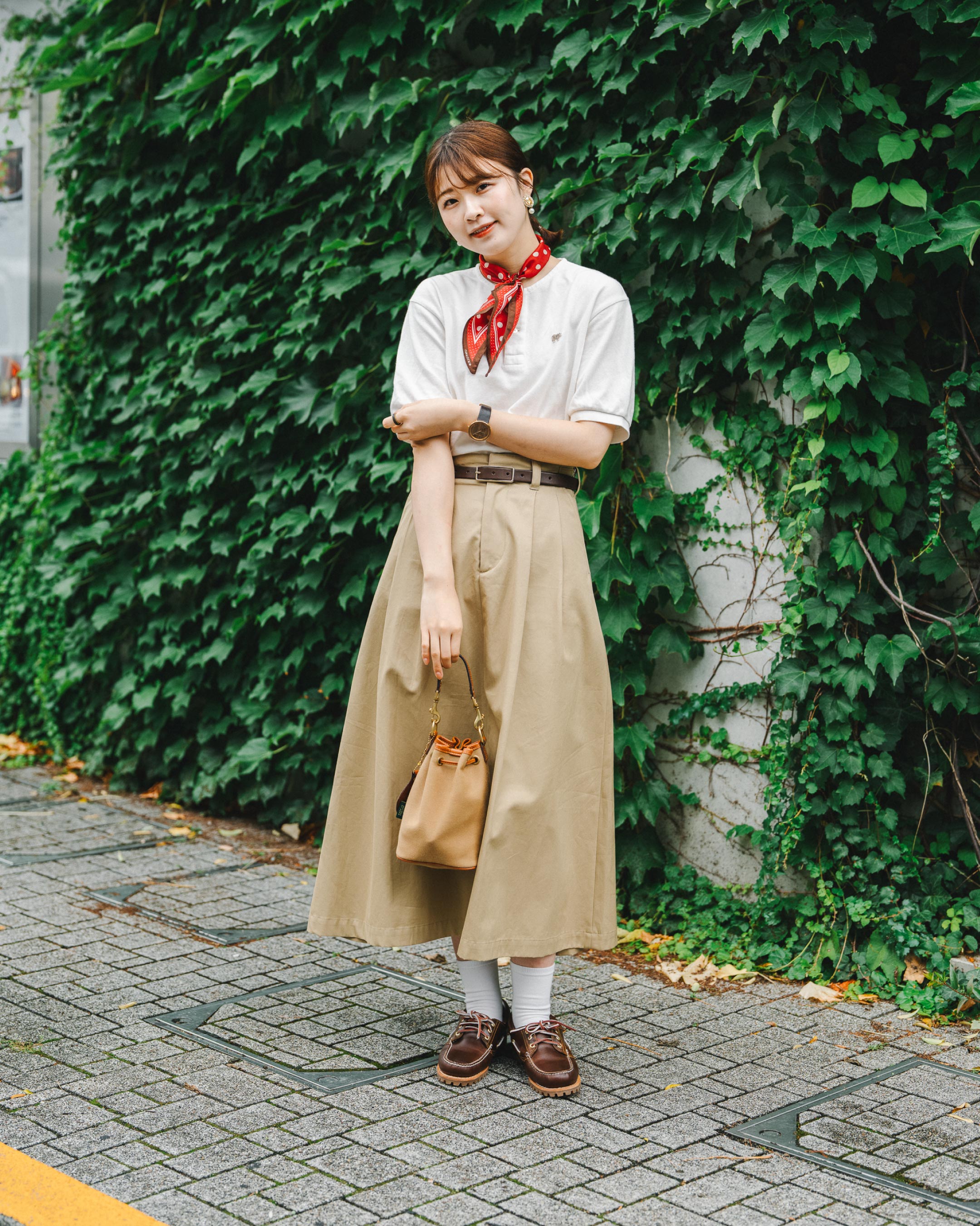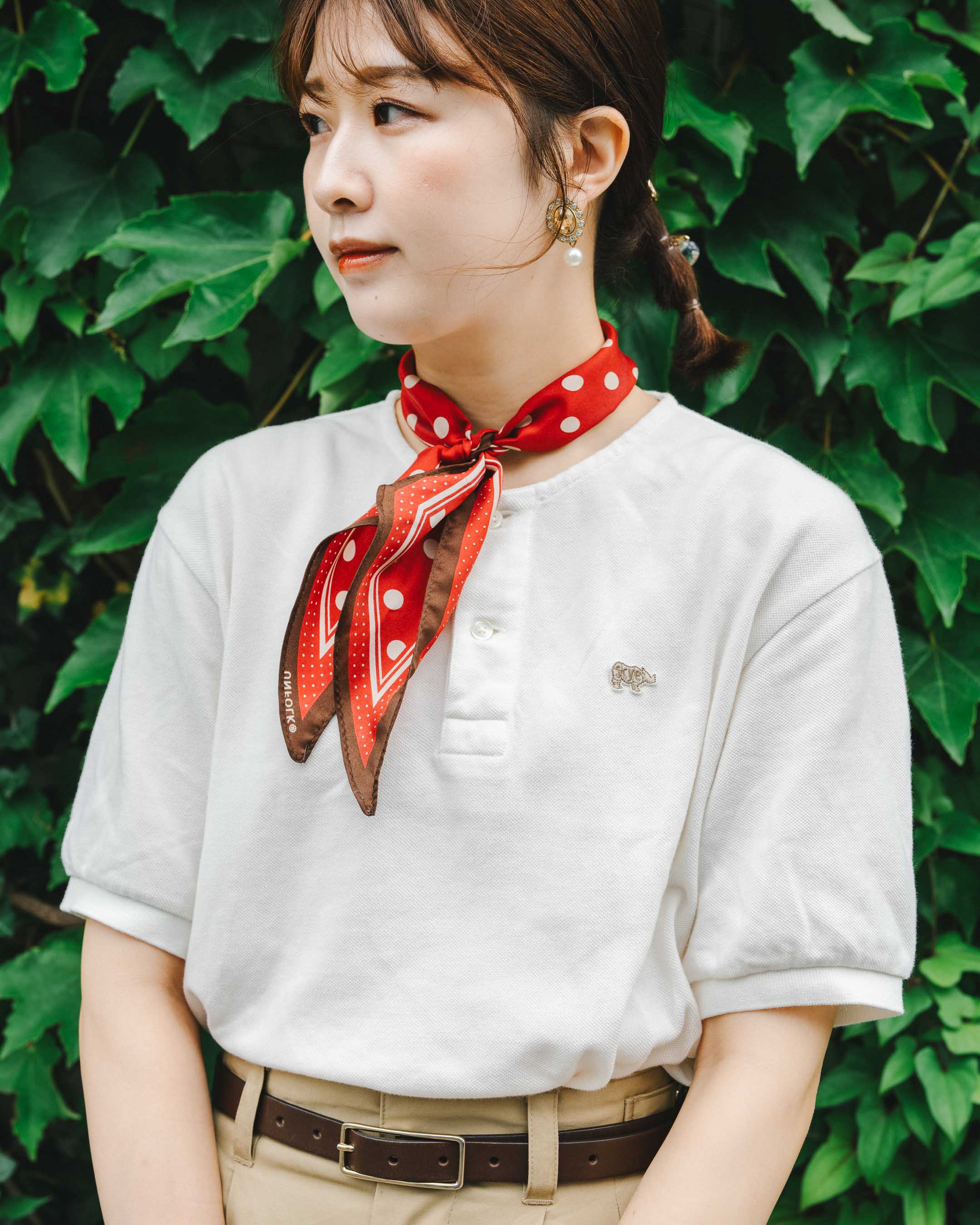 スカーフやバッグなどでアクセントを加えて、マンネリ化する夏コーデをトラディショナルに仕上げる。