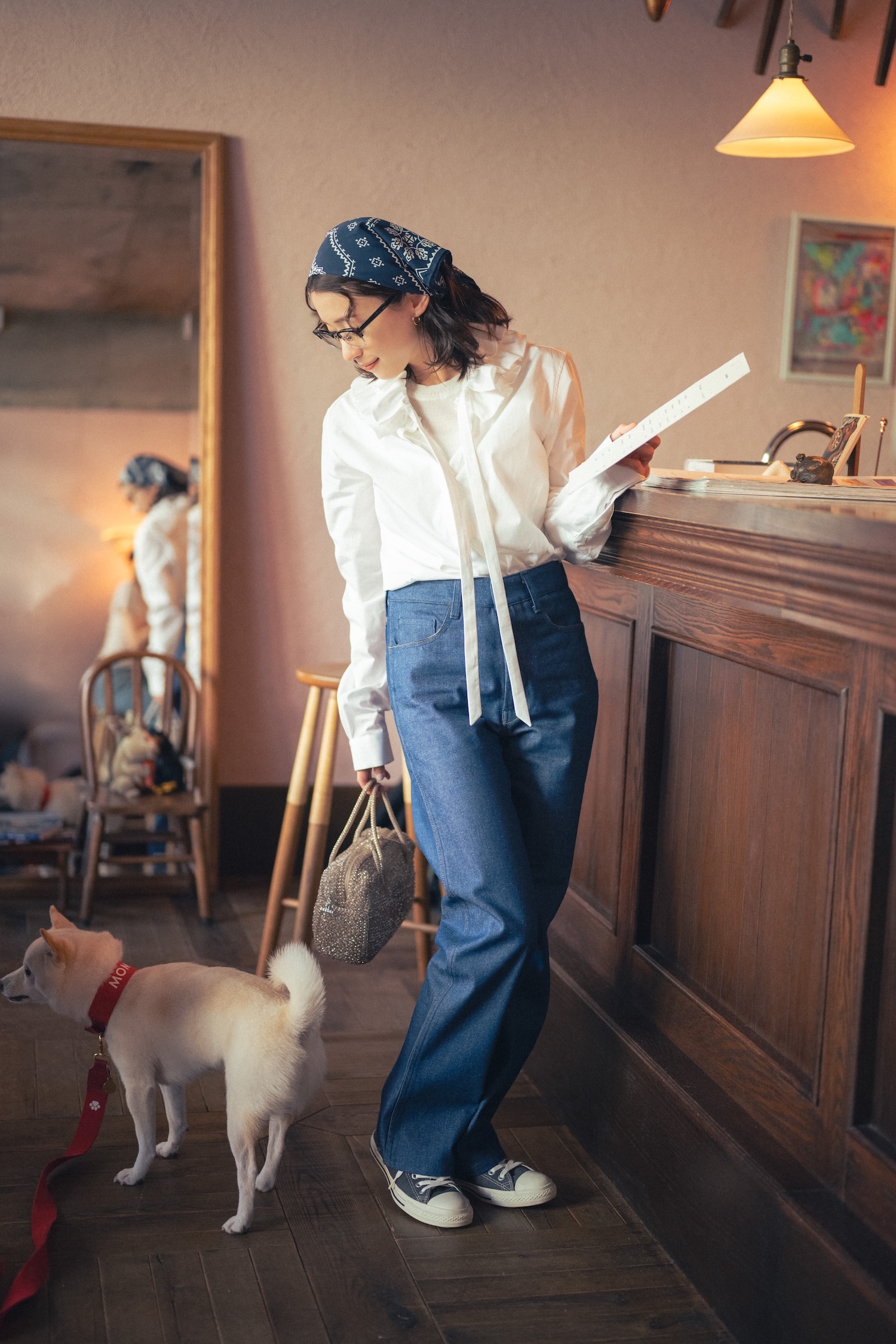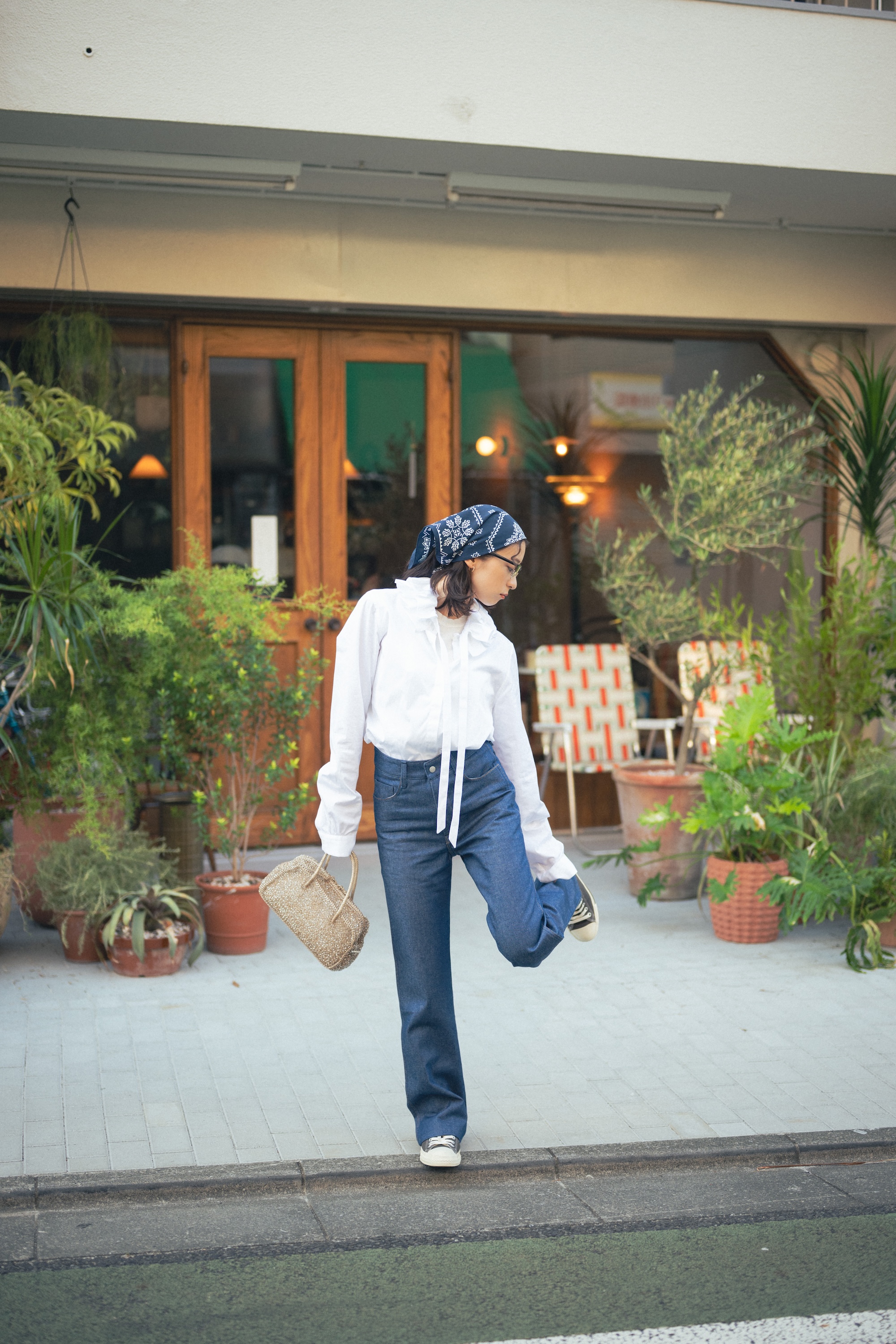 シャツ¥82500 / BOURRIENNE PARIS X、頭に巻いたシルクバンダナ¥27500 / DRAKE’S(ともにメイデンズ ショップ ウーマン)、ジーンズ¥22000 / CRT(ザ ブルー ストア)、その他 / スタイリスト私物
