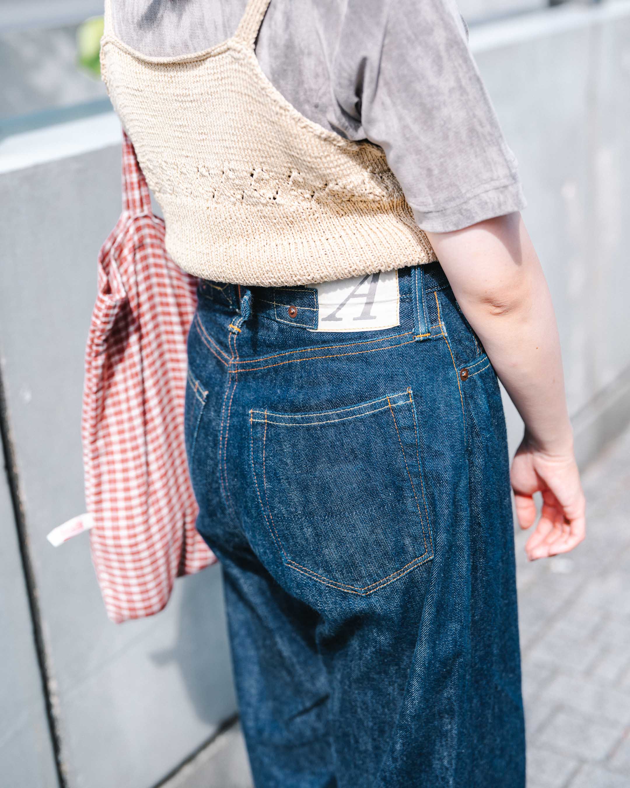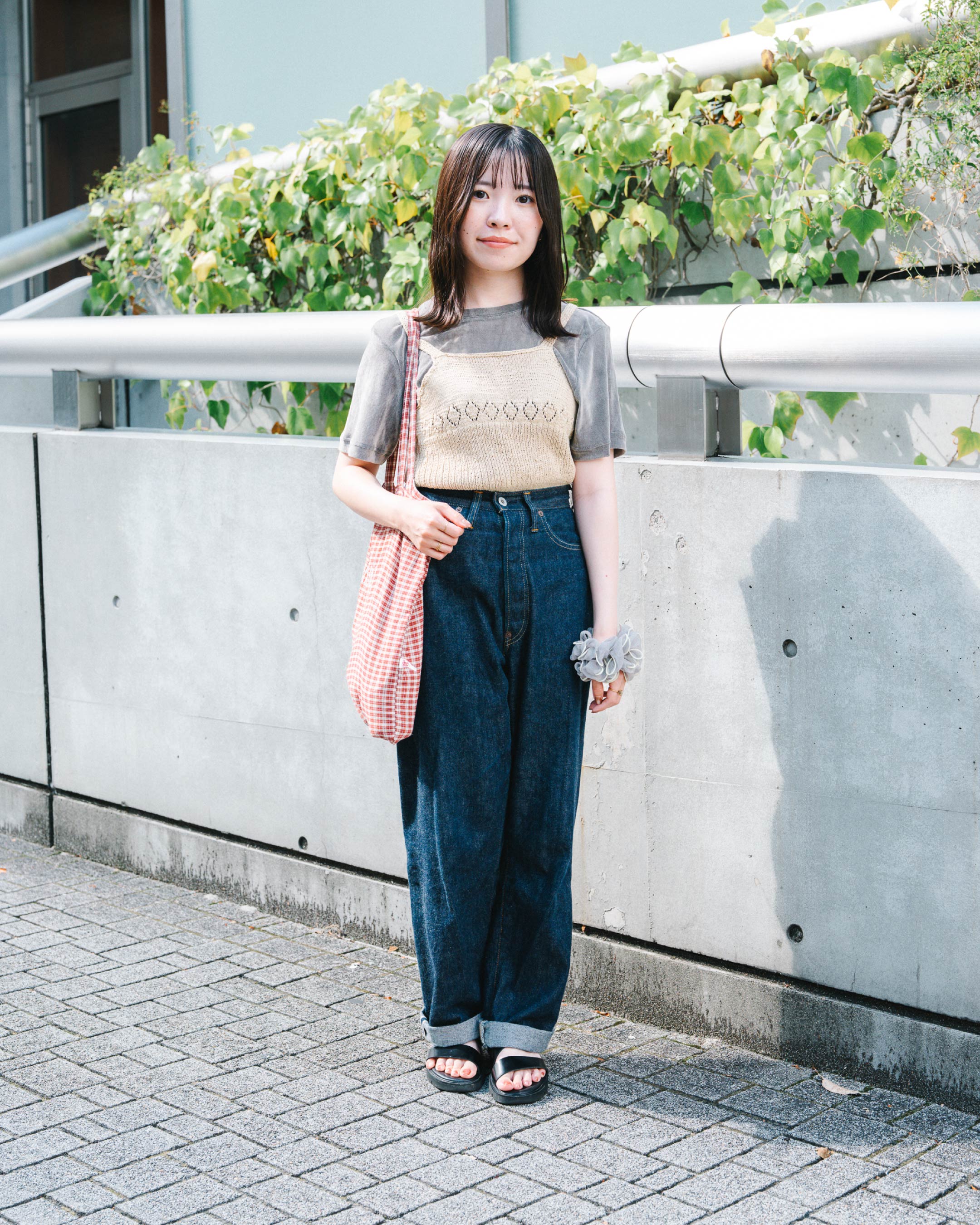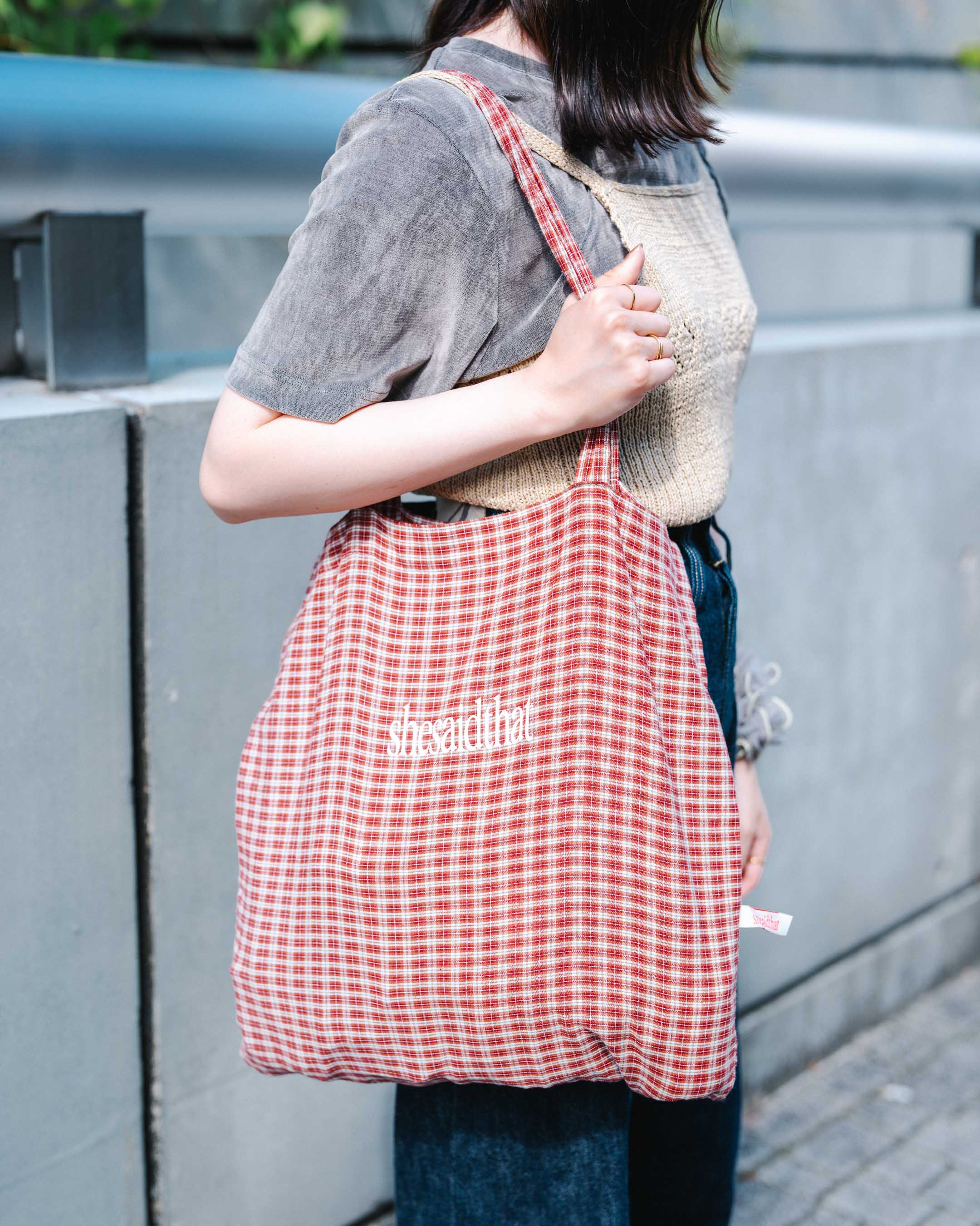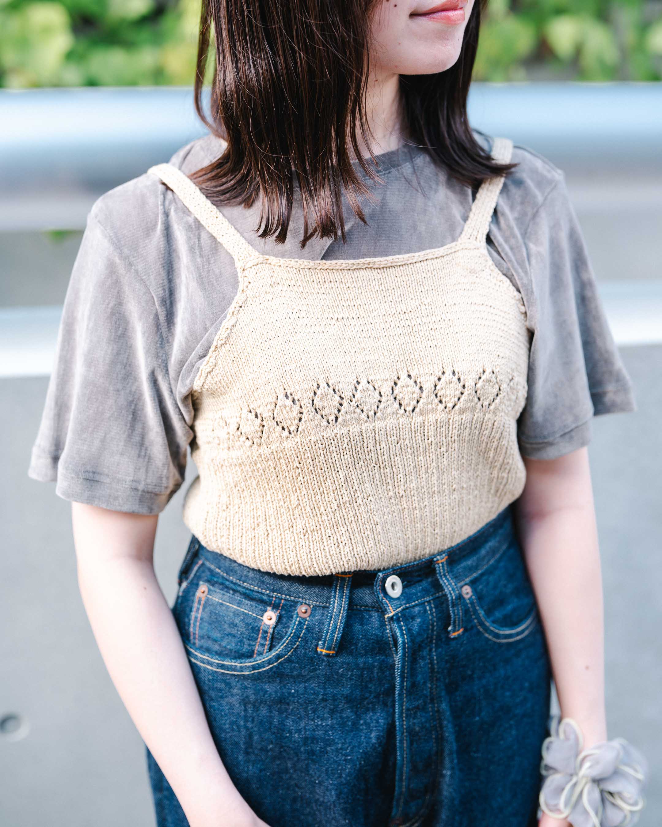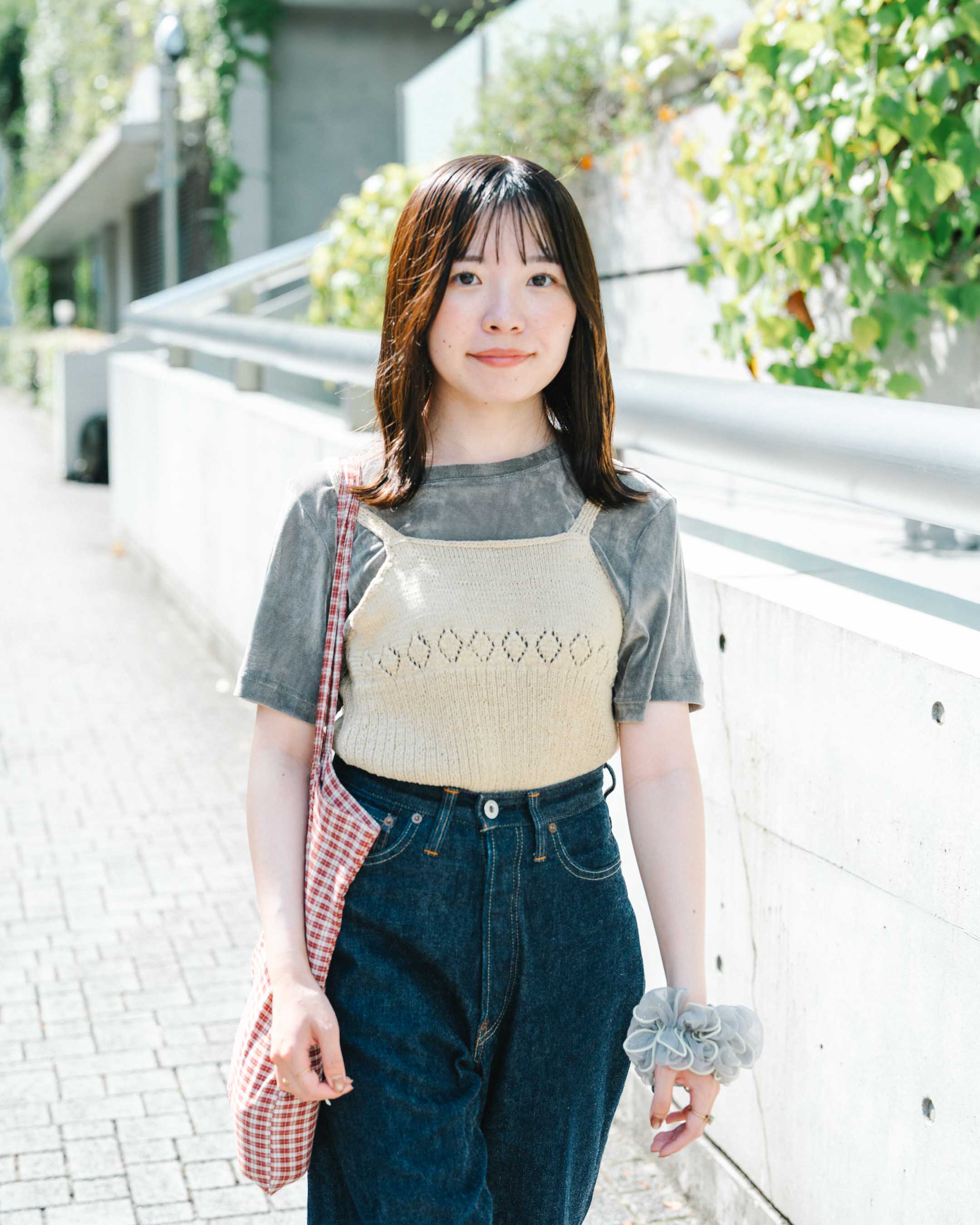 ニットキャミソールを主役に、チェック柄のバッグやシュシュで遊び心をプラス。