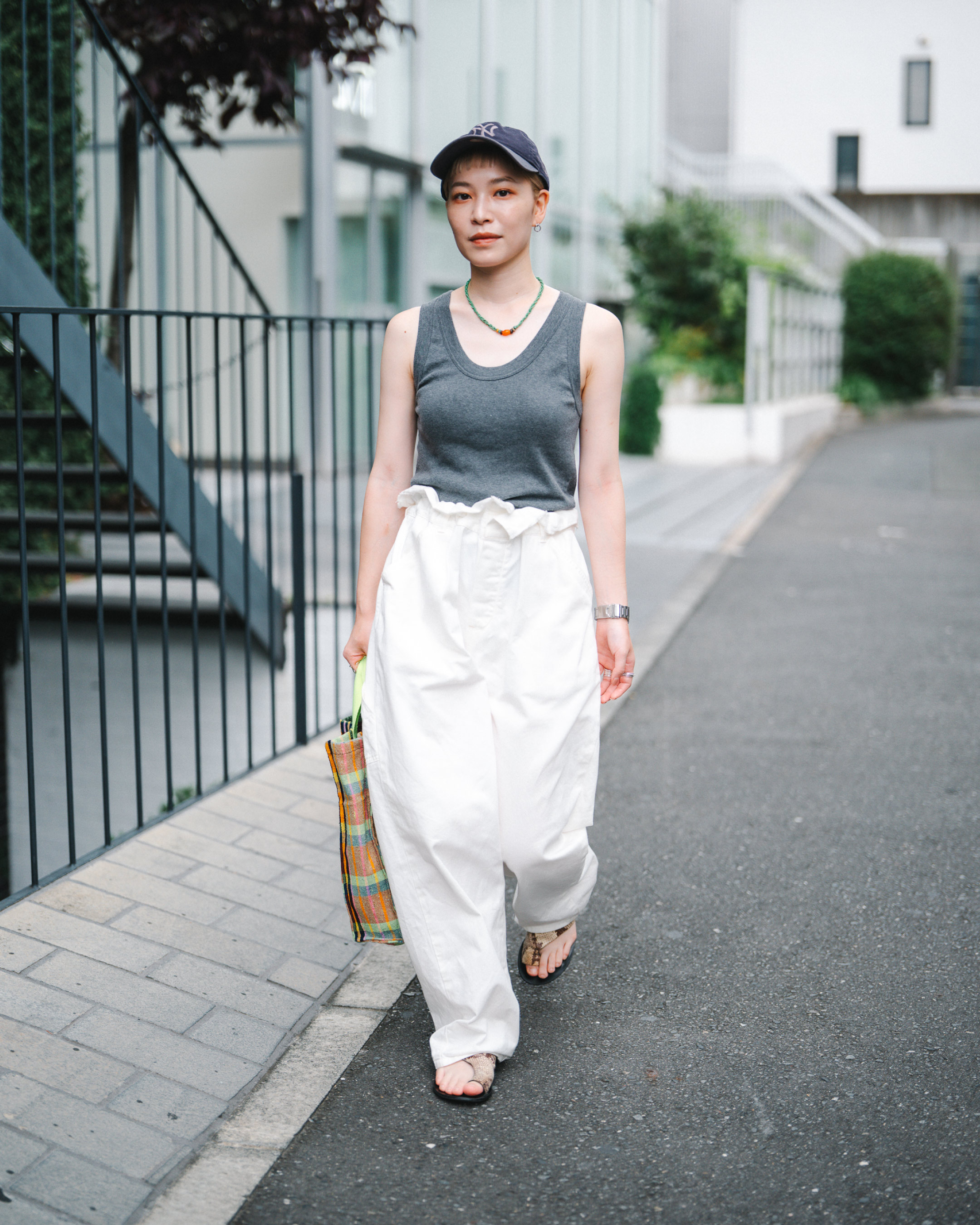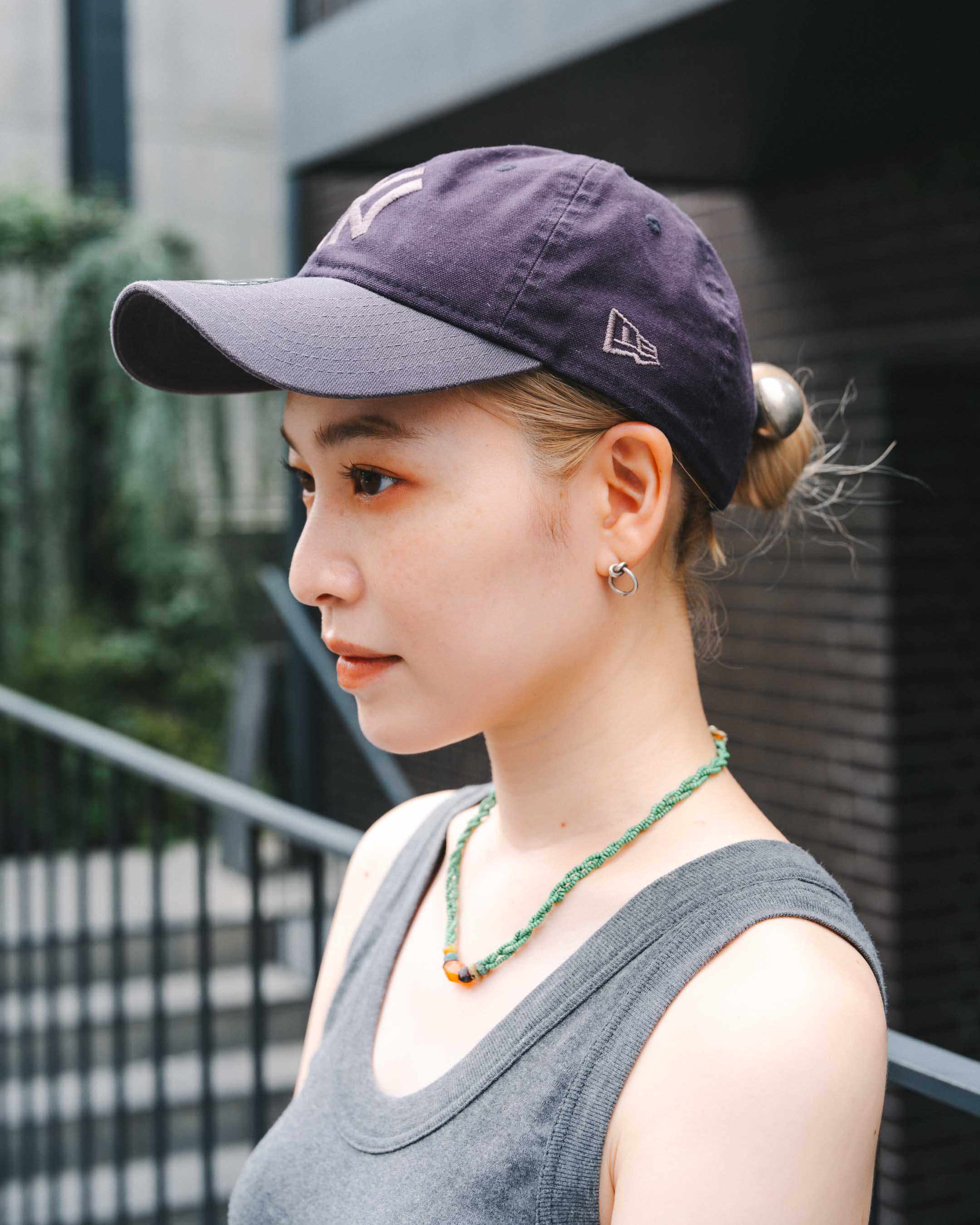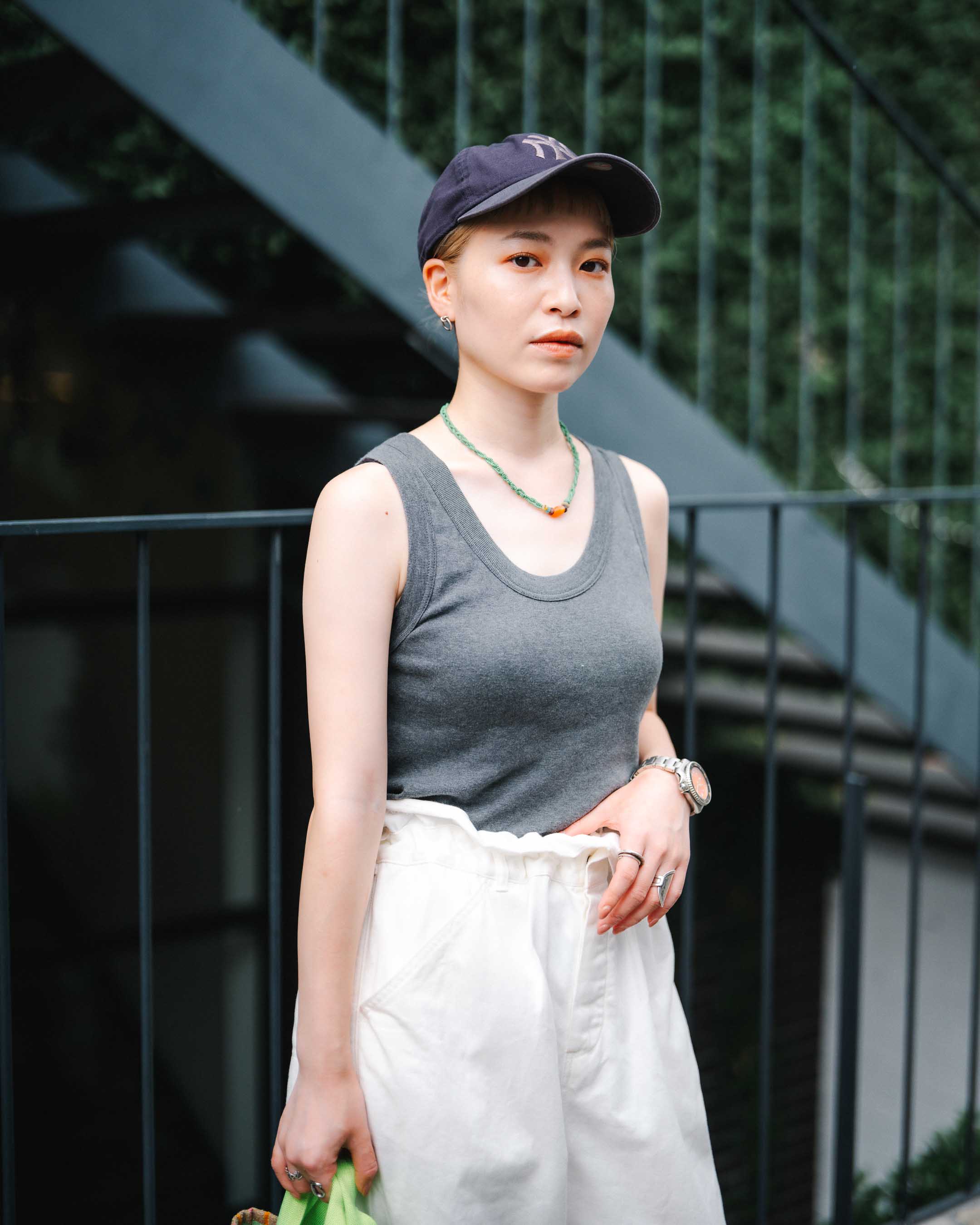 おもための素材感のバッグとツートーンのキャップを取り入れて秋を感じさせて。