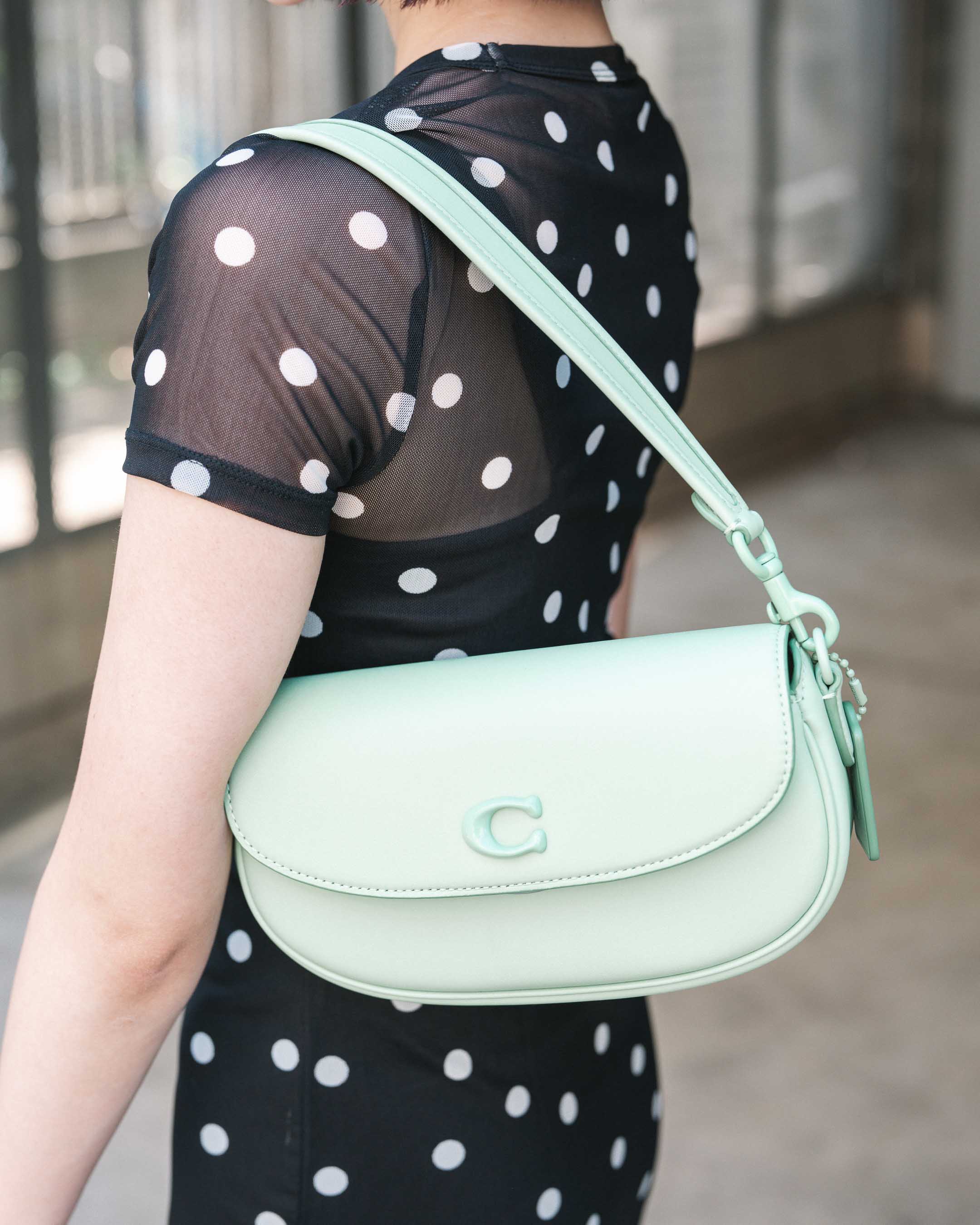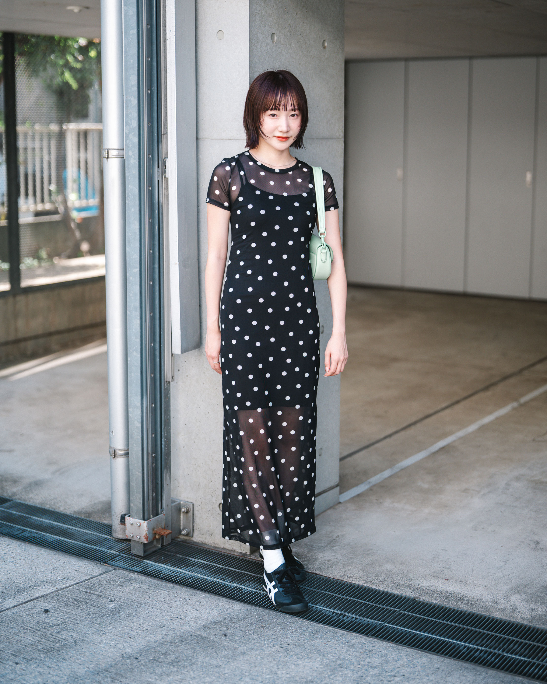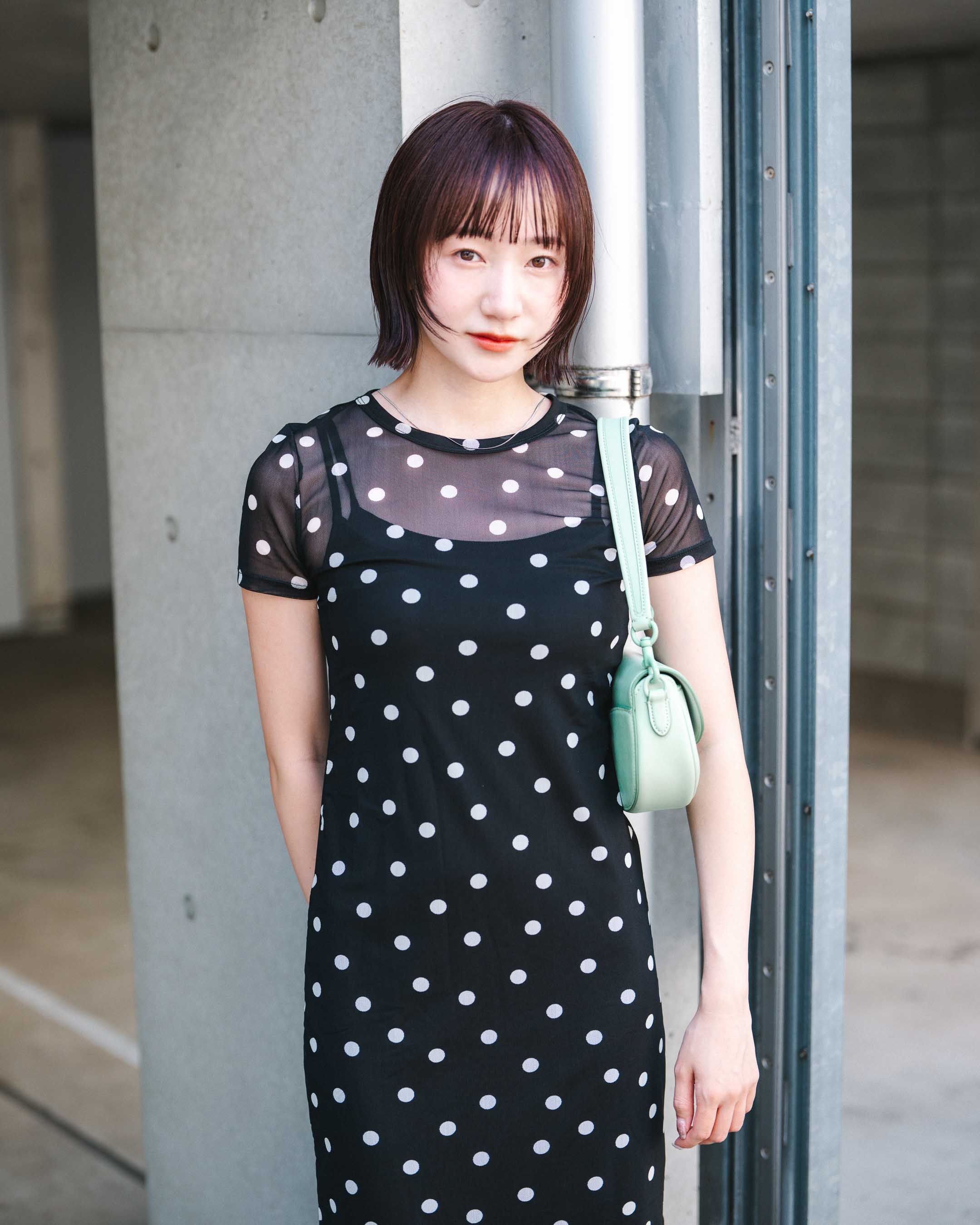 トレンドのドット柄のワンピースに、グリーンのバッグを合わせて上品に。