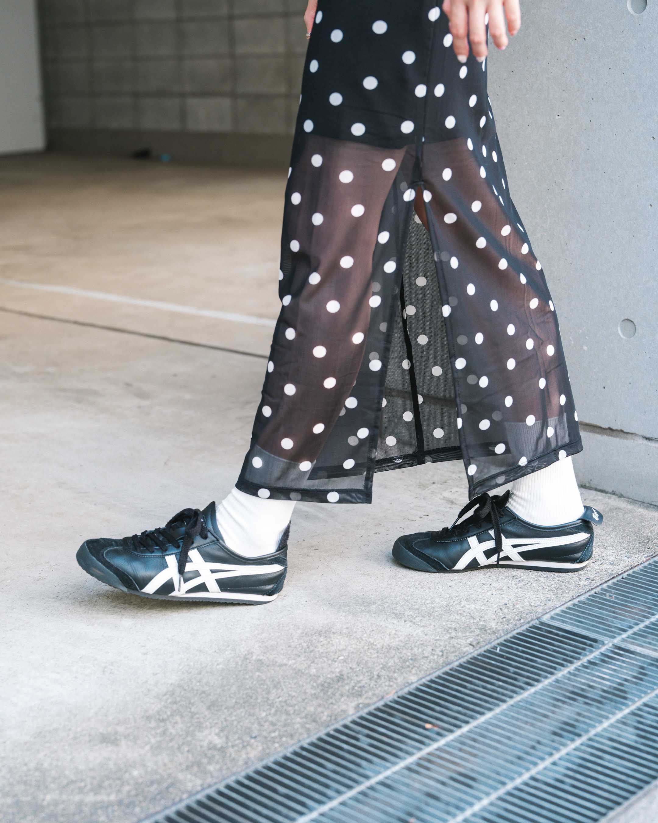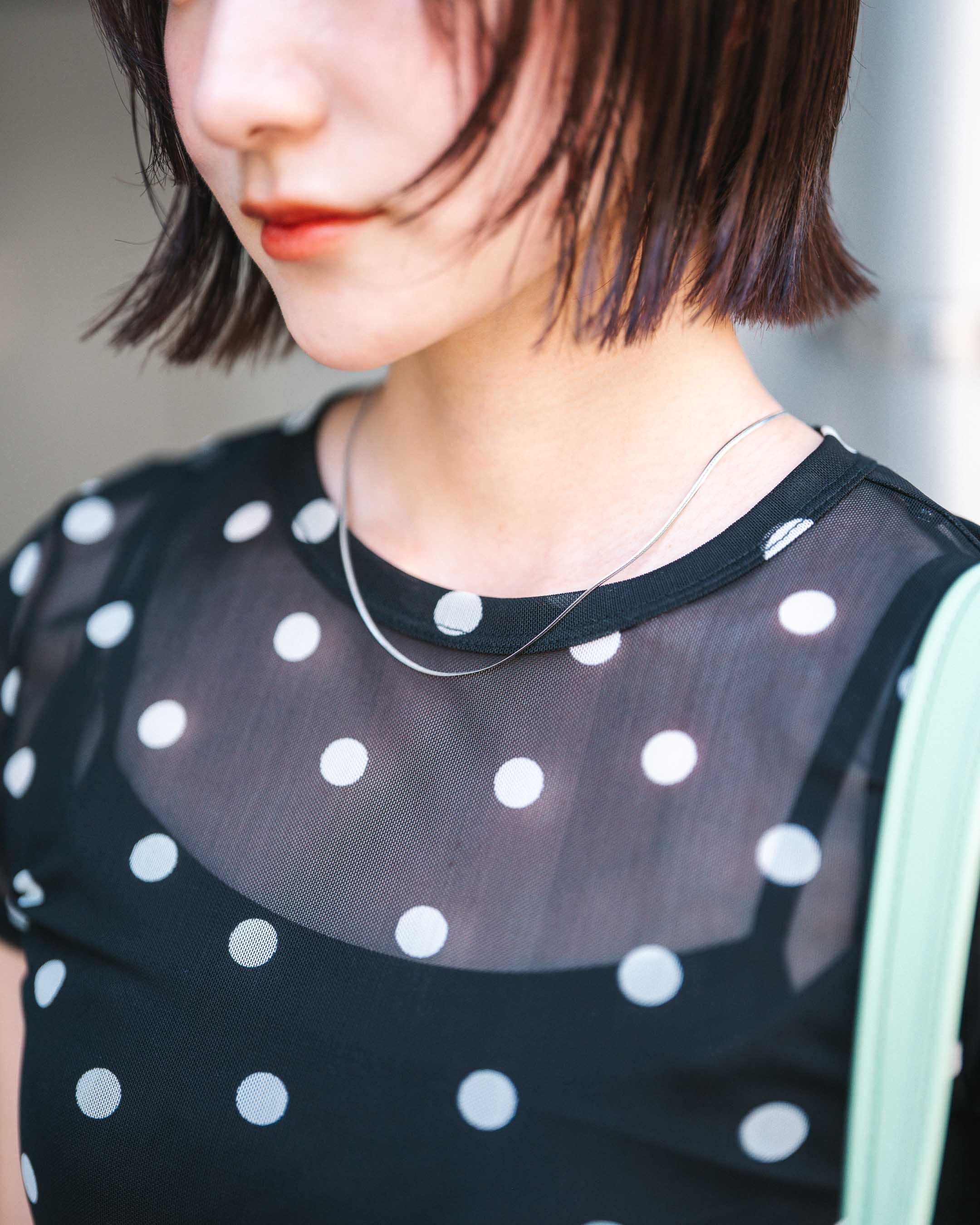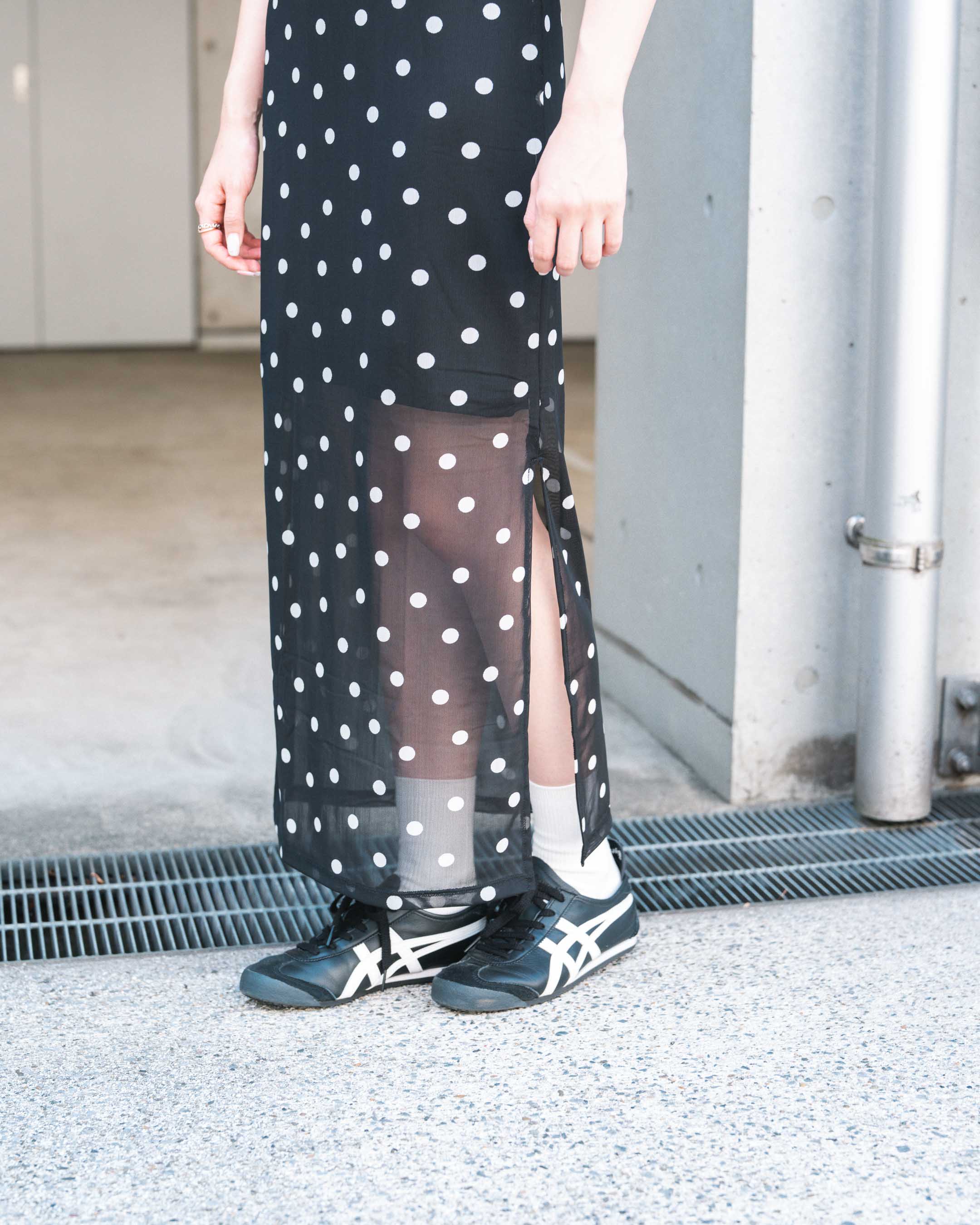トレンドのドット柄のワンピースに、グリーンのバッグを合わせて上品に。