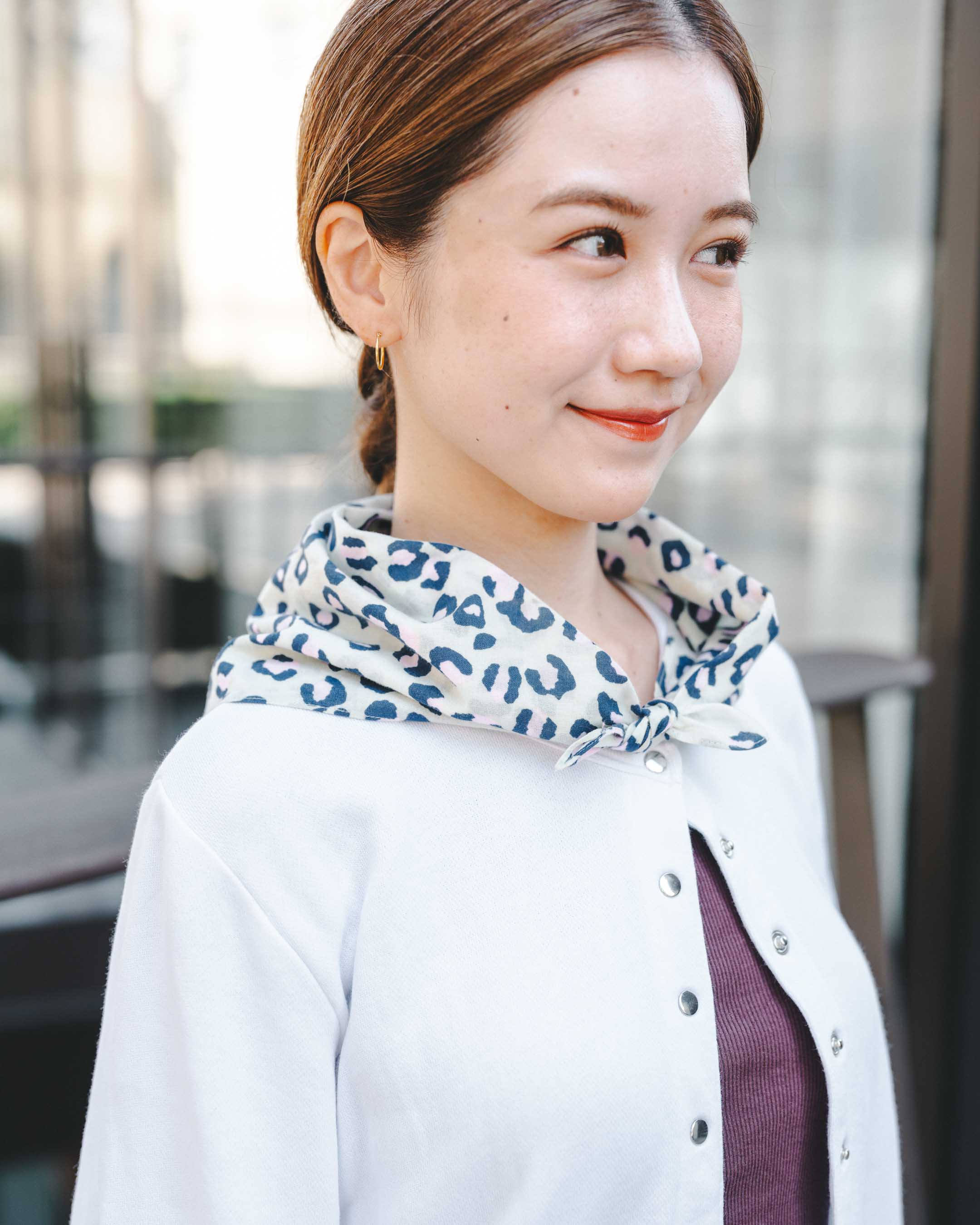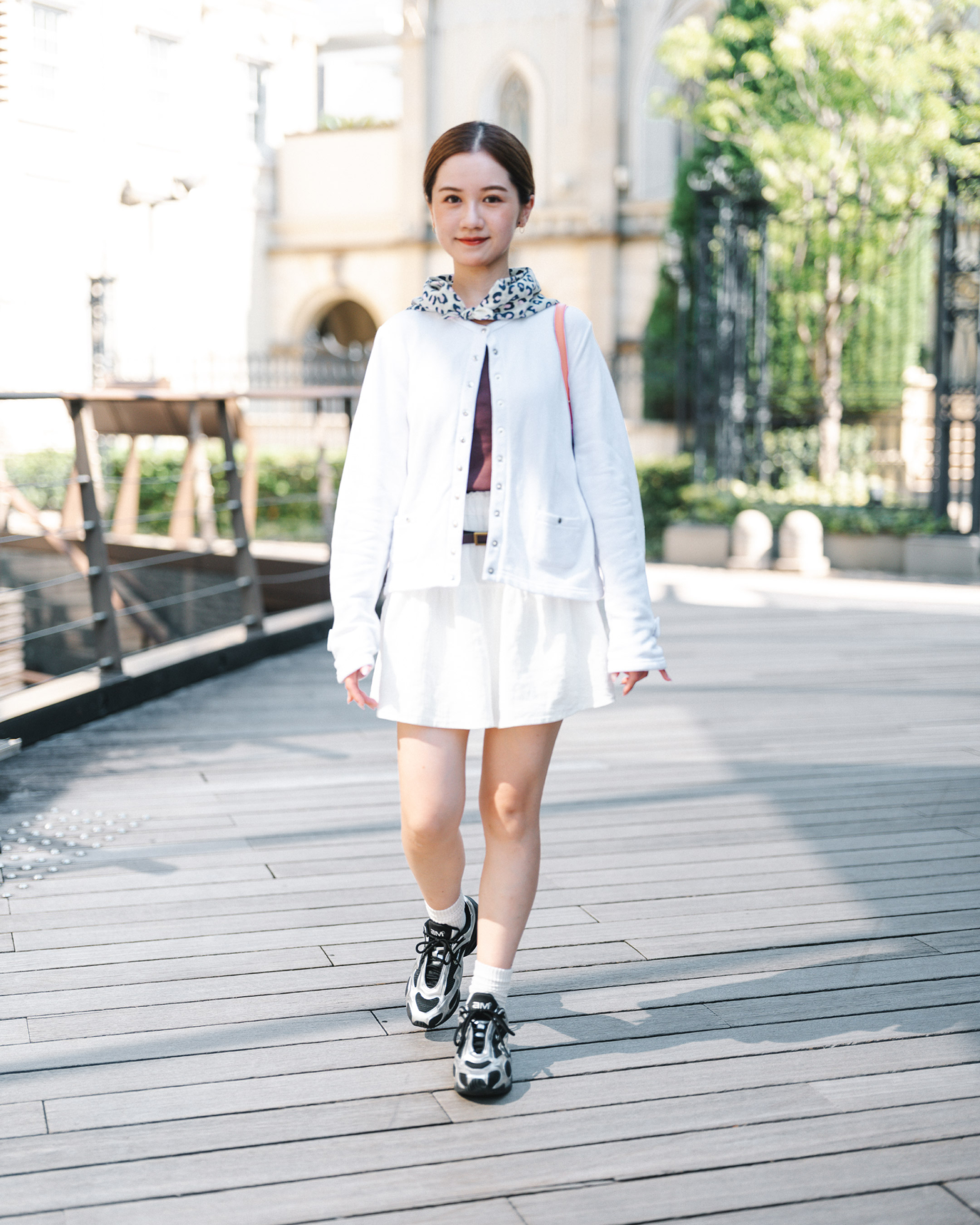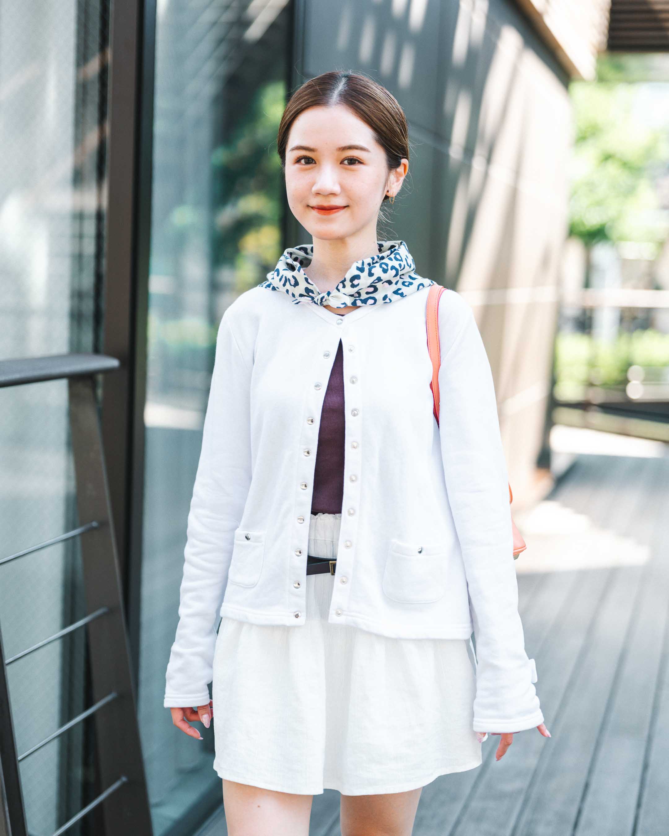 スカーフを主役に他のアイテムをシンプルに。足元は少し強めのスニーカーにしてバランスを。