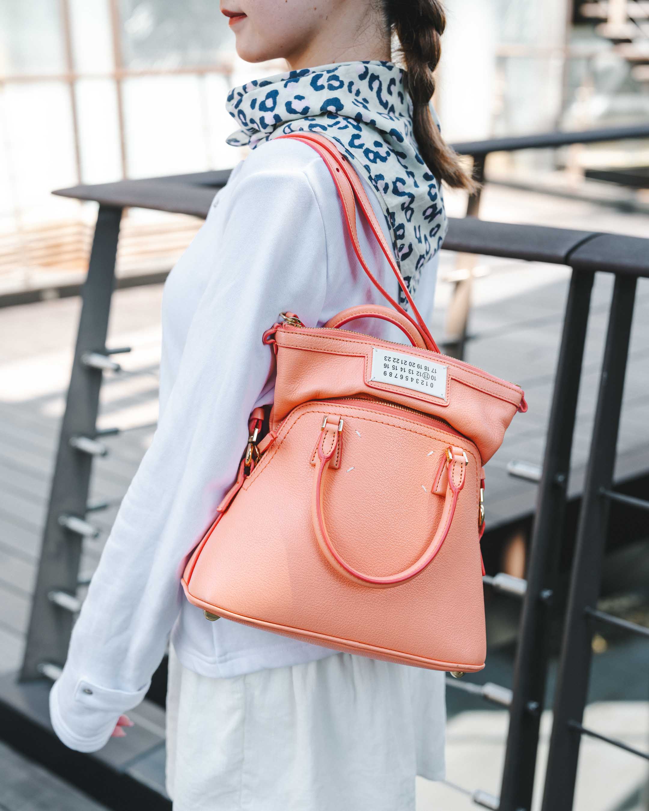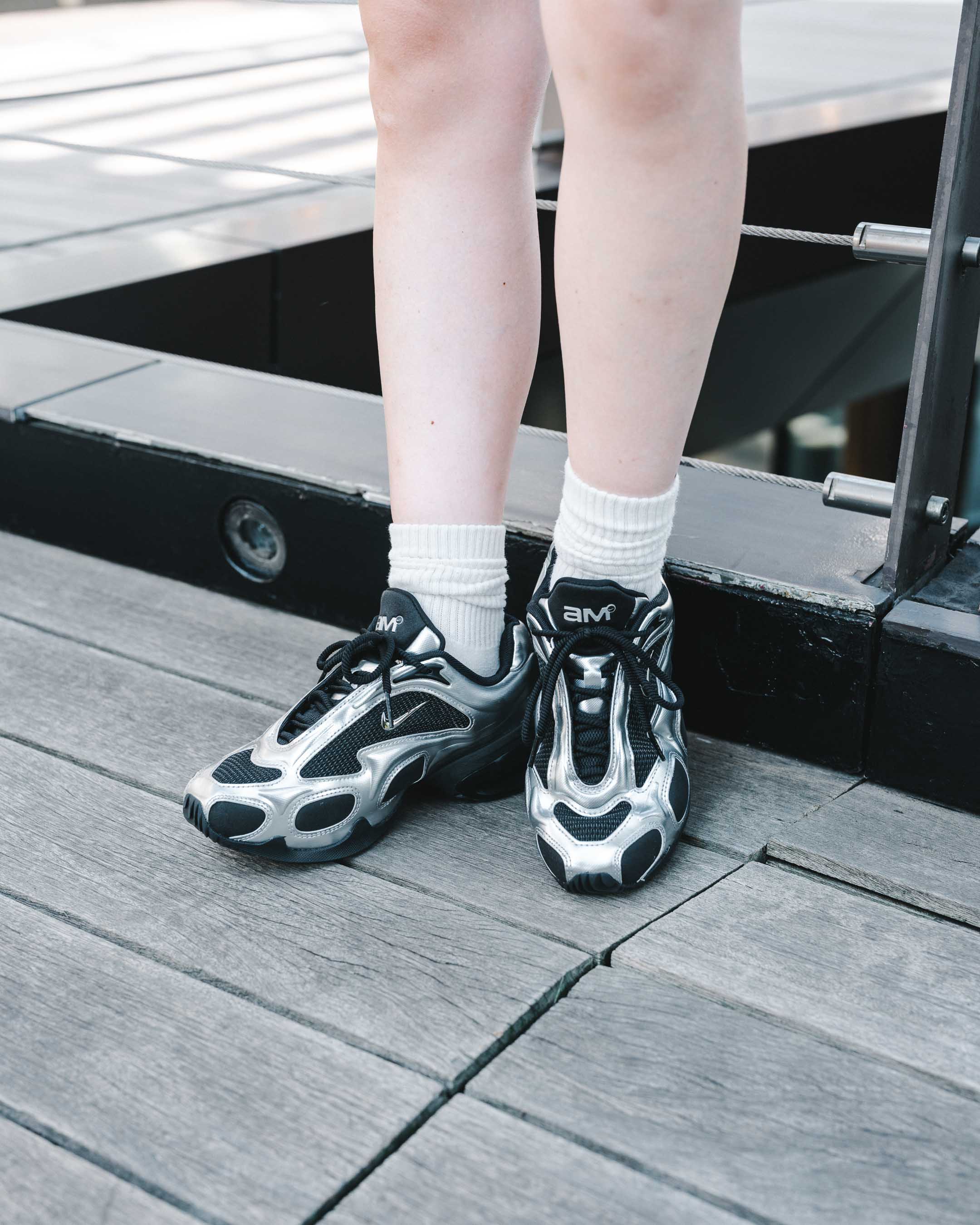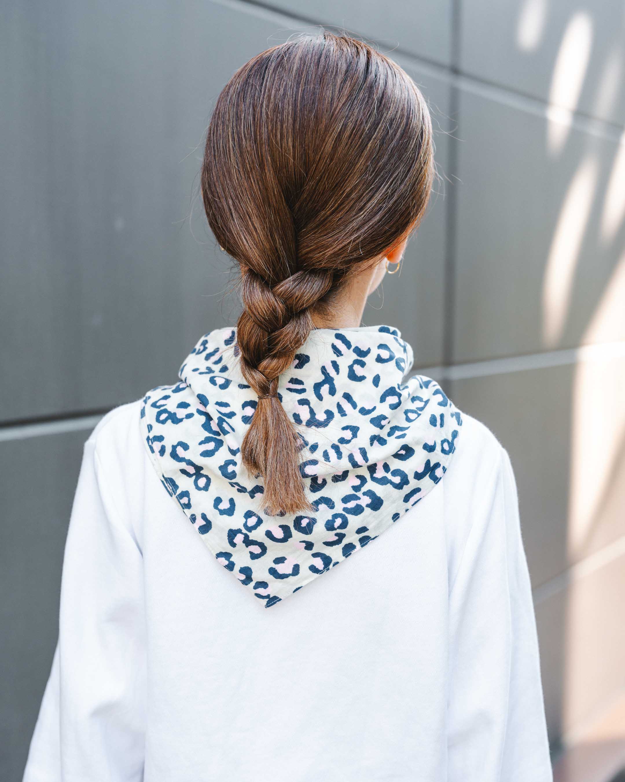 スカーフを主役に他のアイテムをシンプルに。足元は少し強めのスニーカーにしてバランスを。