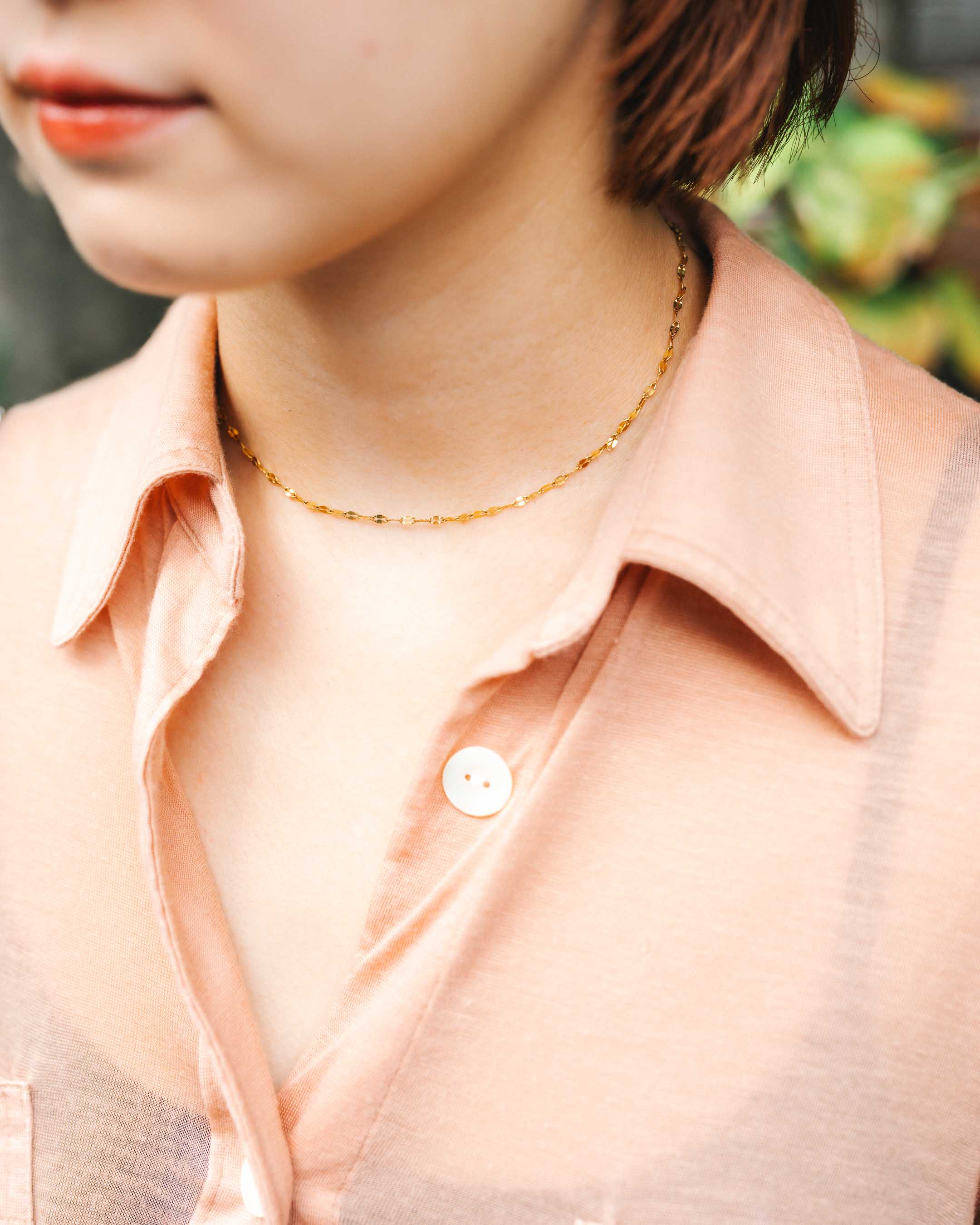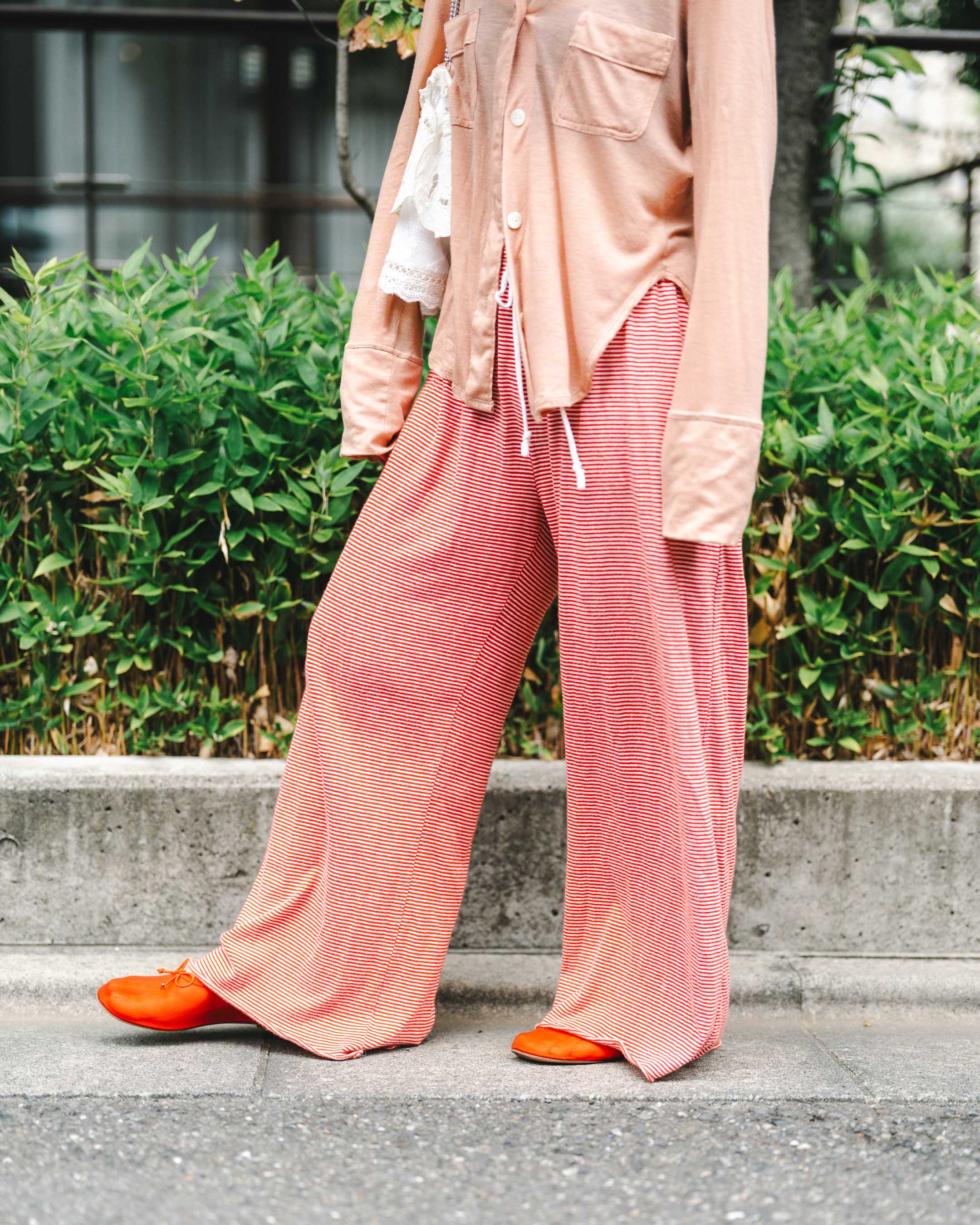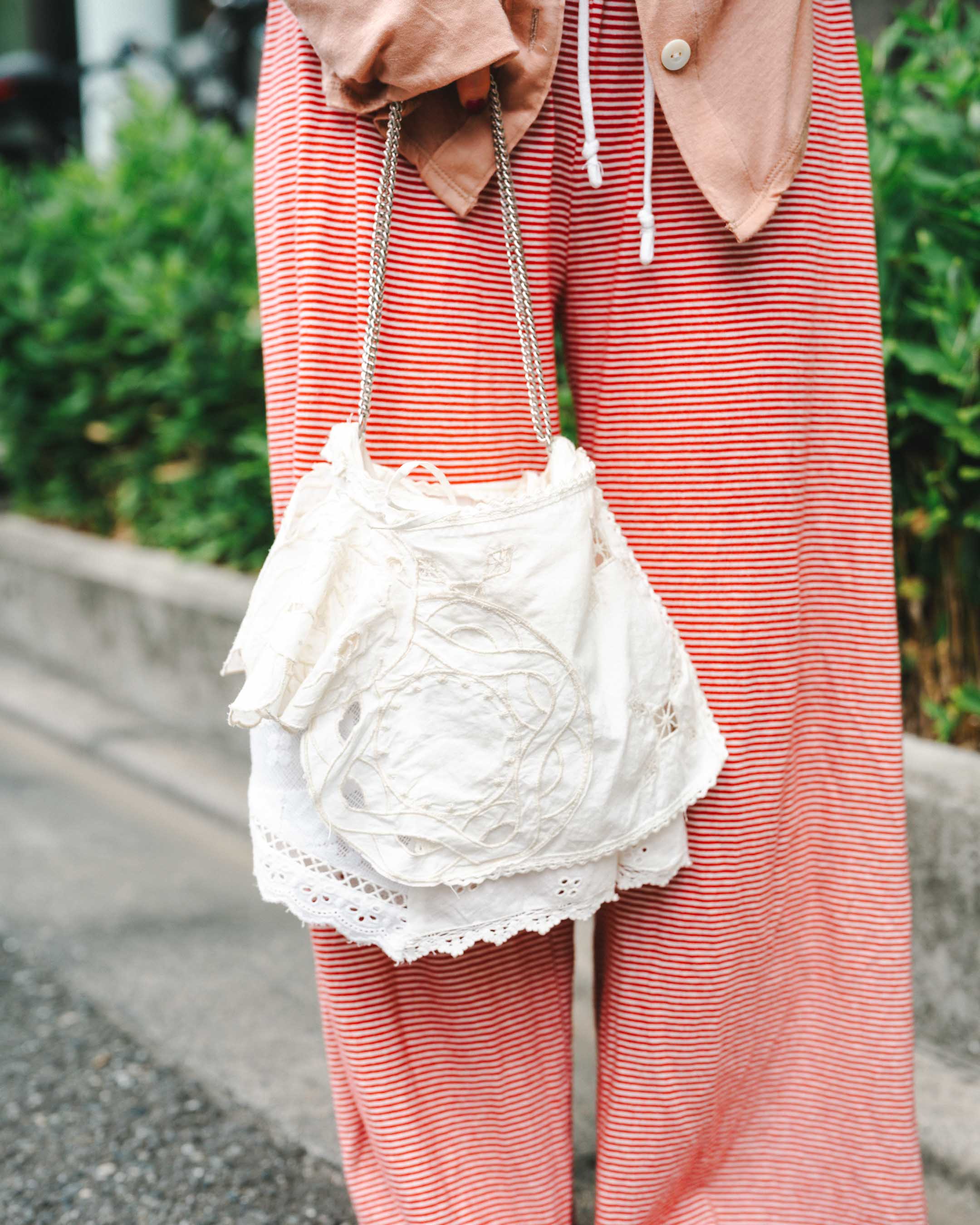 リラクシーなコーデにはレースのバッグで可愛らしさをプラス。トーンもそろえて統一感も。