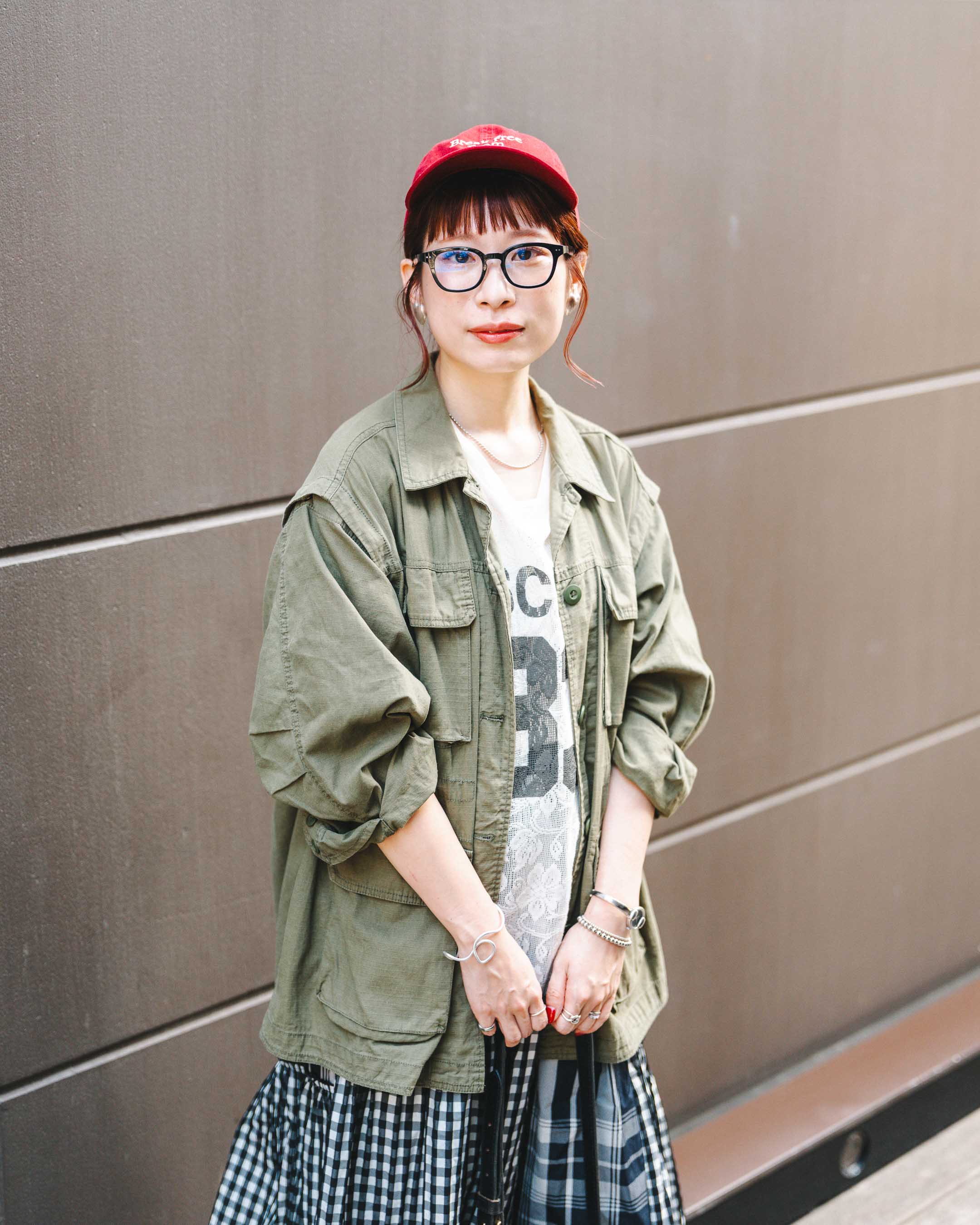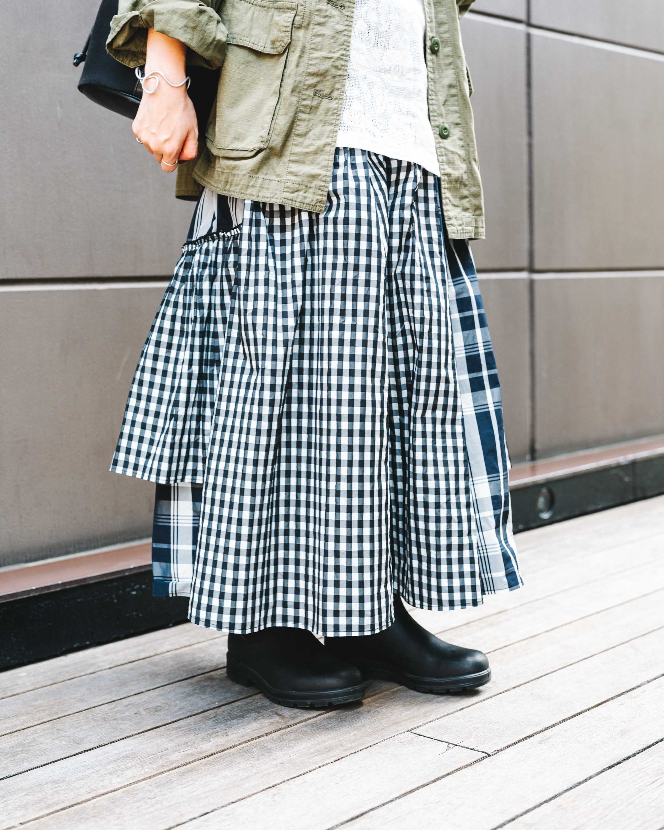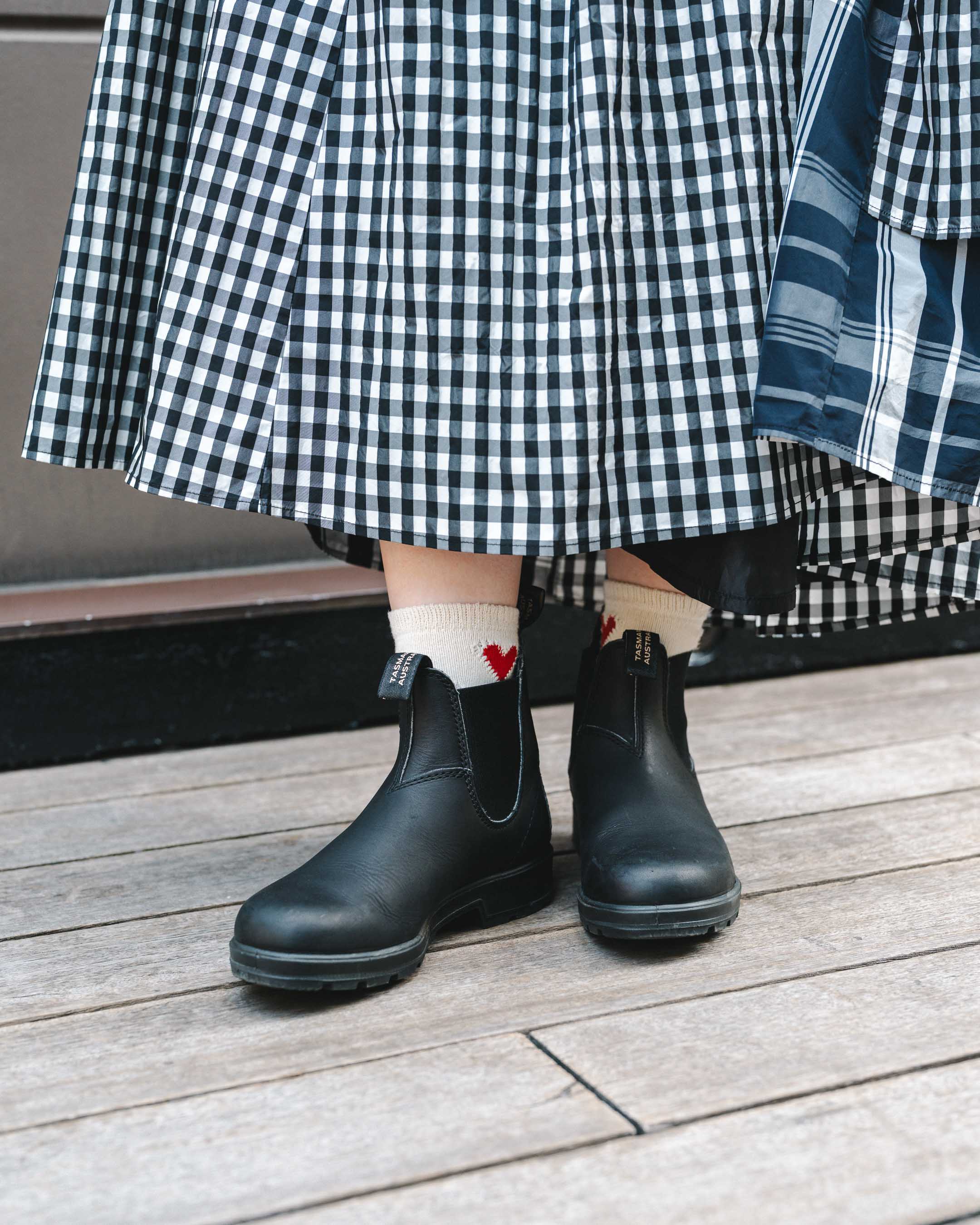 チェックのティアードスカート×ブーツの組み合わせで秋を感じさせて。ちらっと見える靴下とイヤリングはハートでリンク。