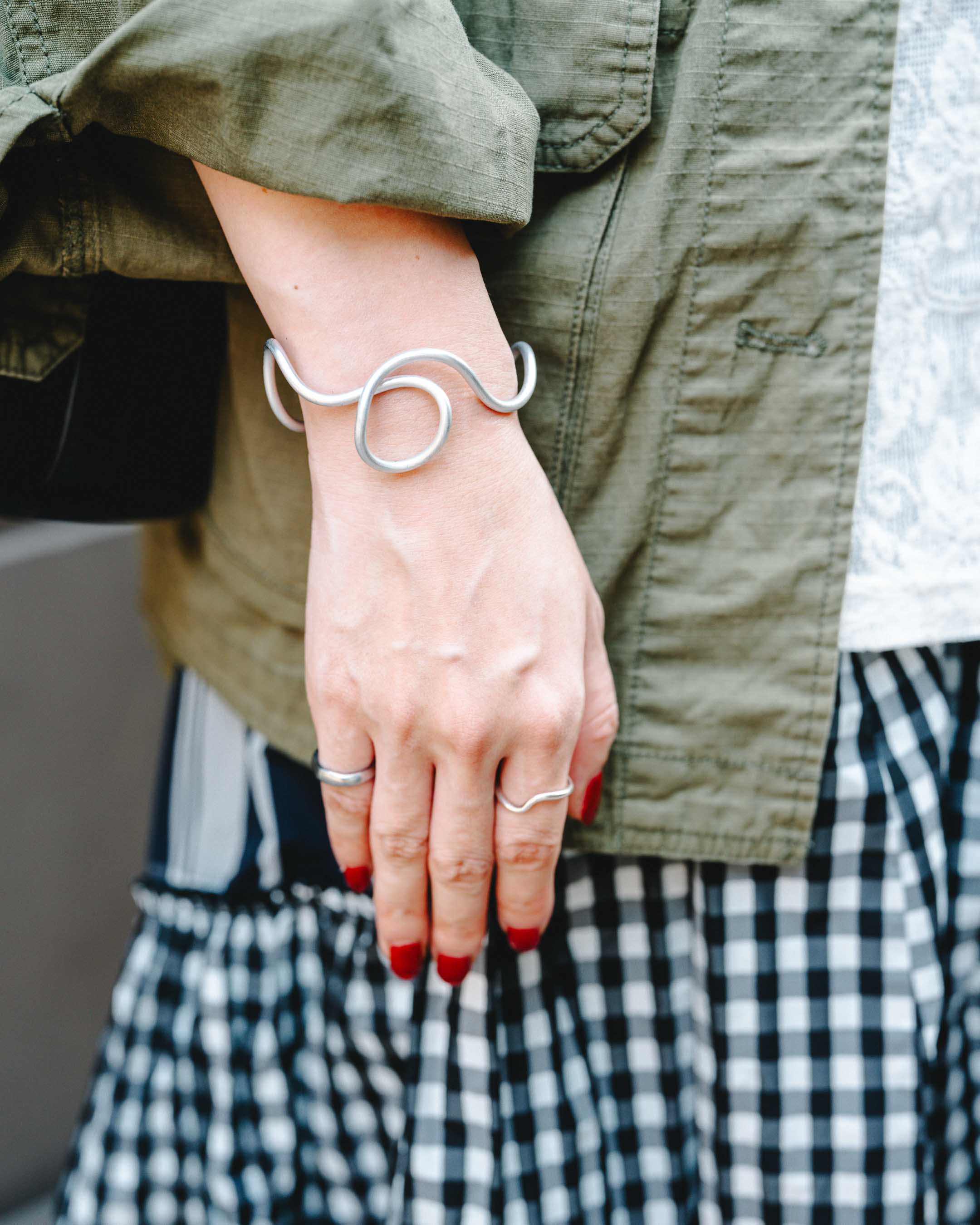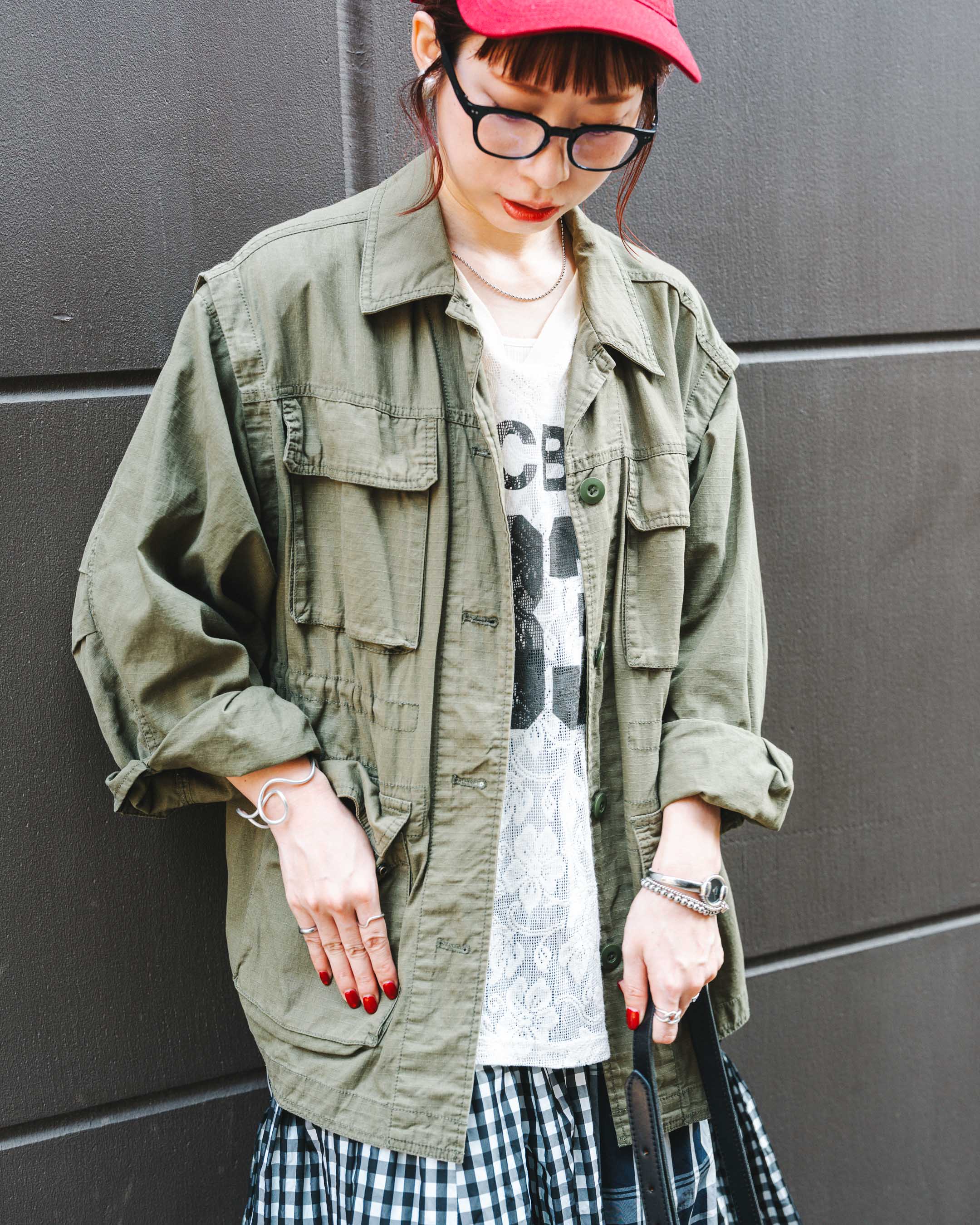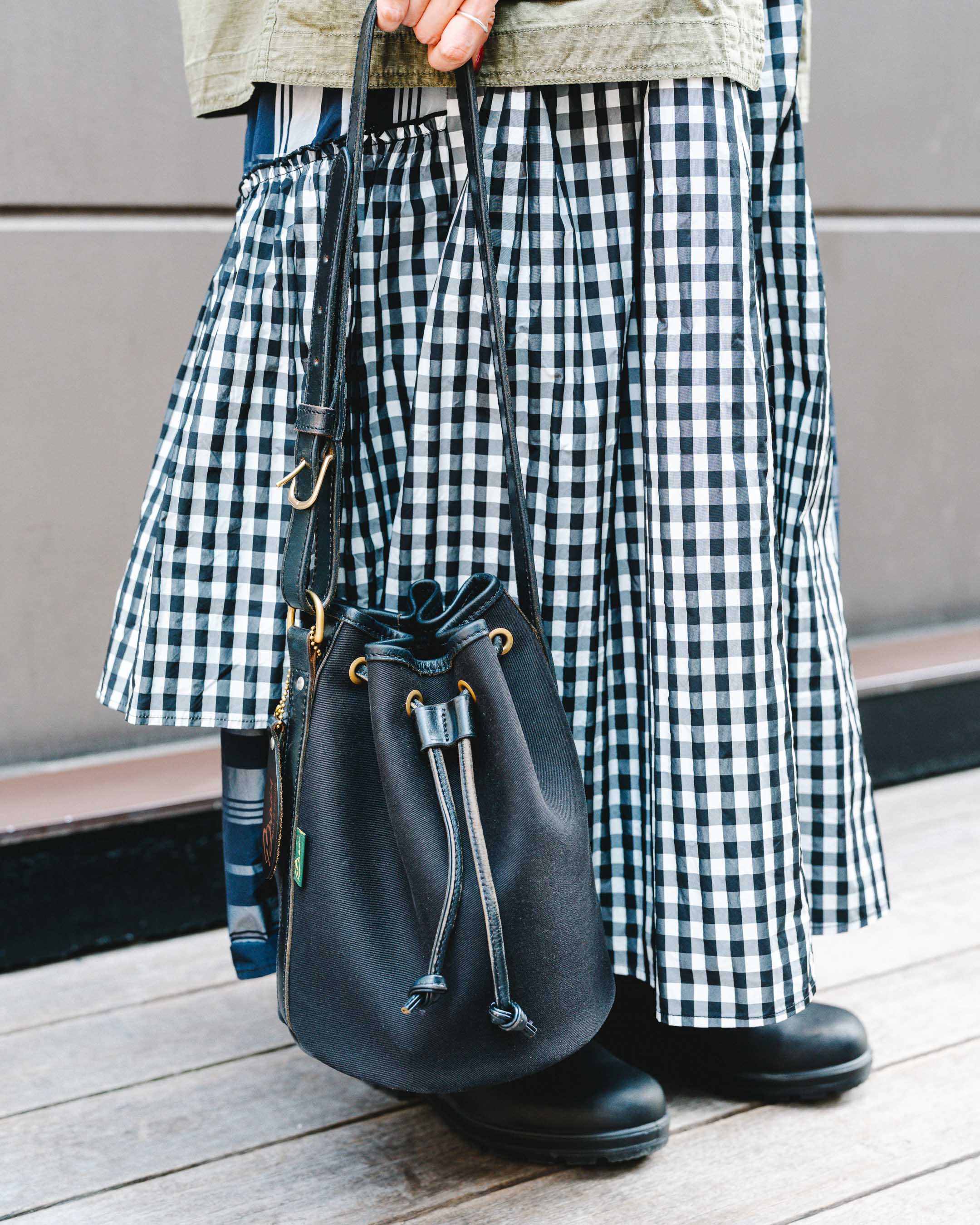 チェックのティアードスカート×ブーツの組み合わせで秋を感じさせて。ちらっと見える靴下とイヤリングはハートでリンク。