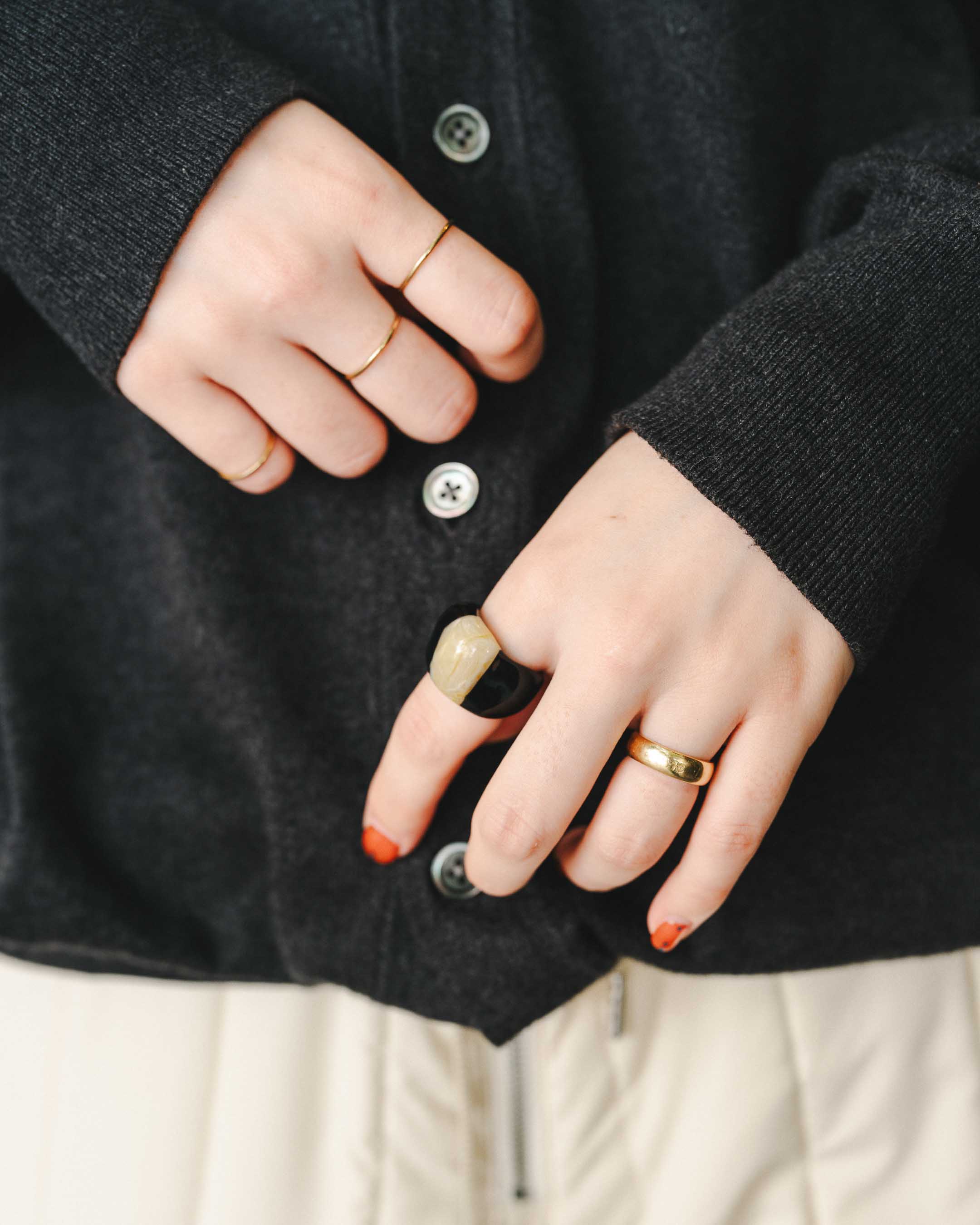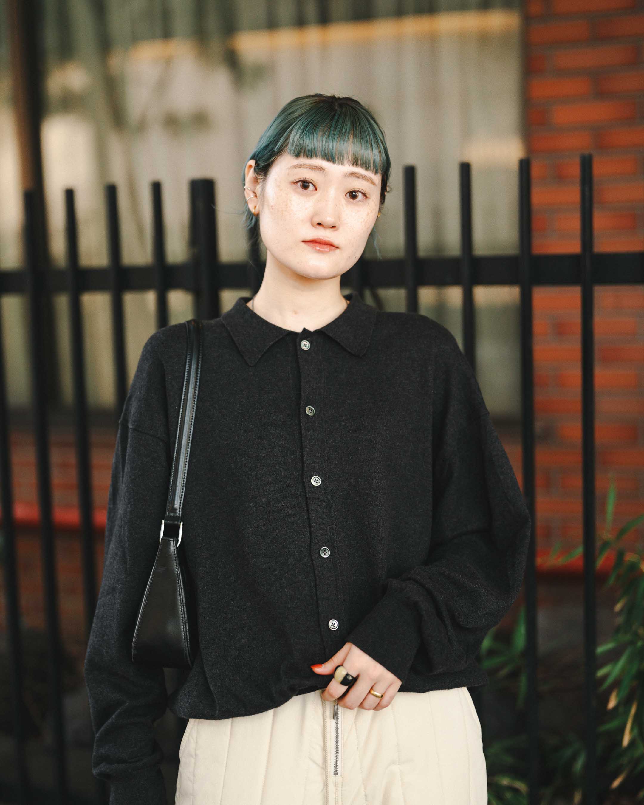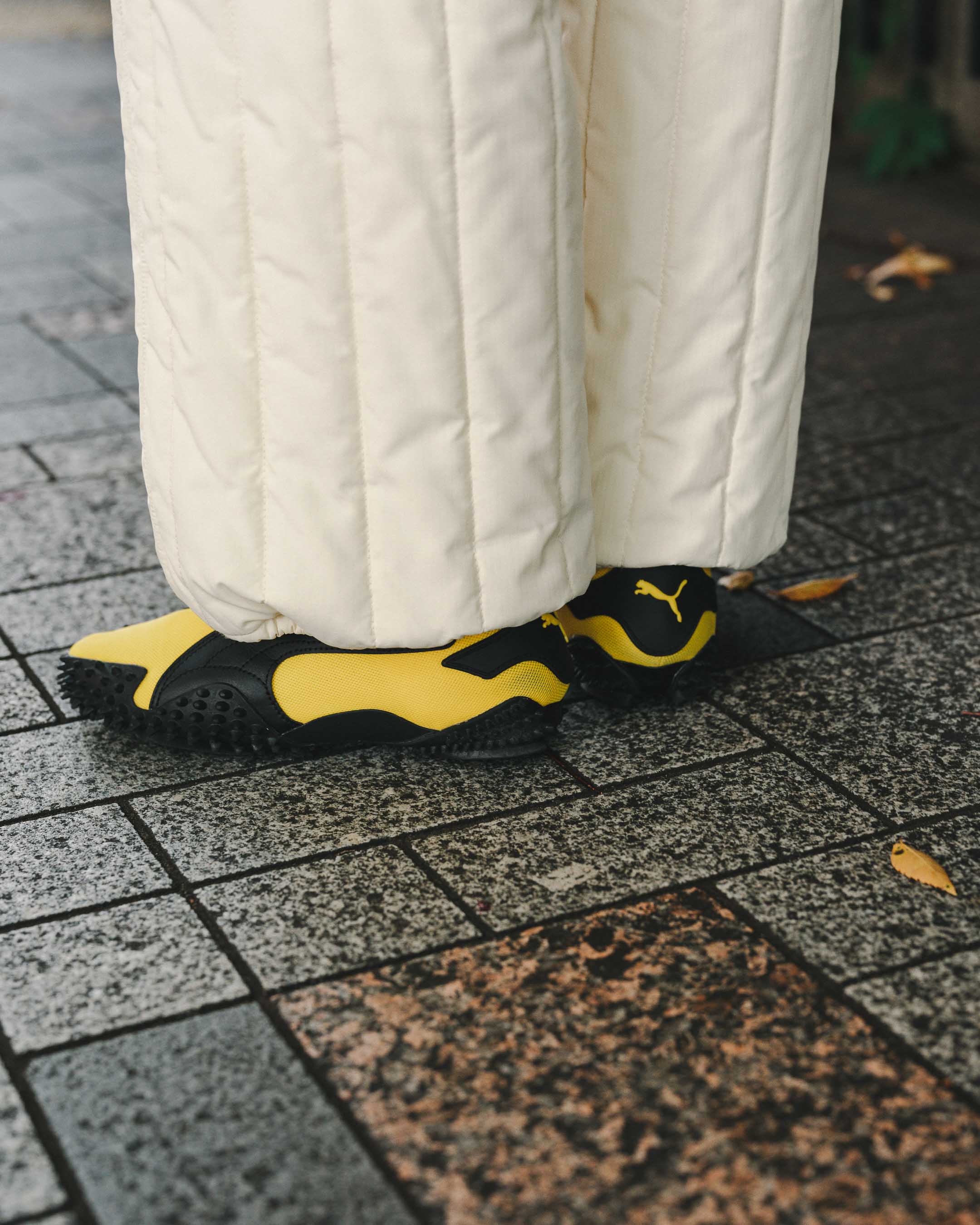 ボリュームのあるキルティングのパンツをメインに、トップスや小物はシンプルにまとめる。
