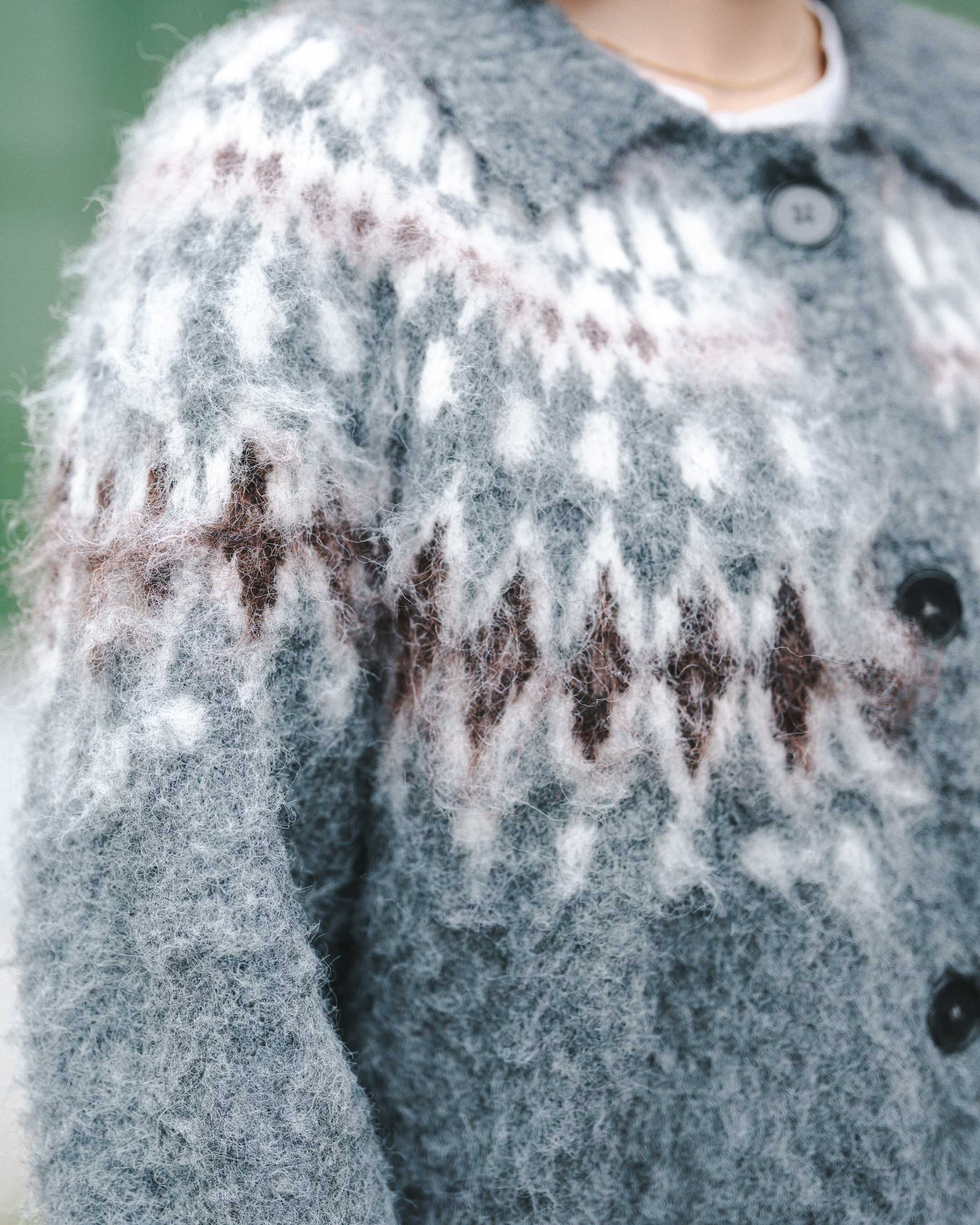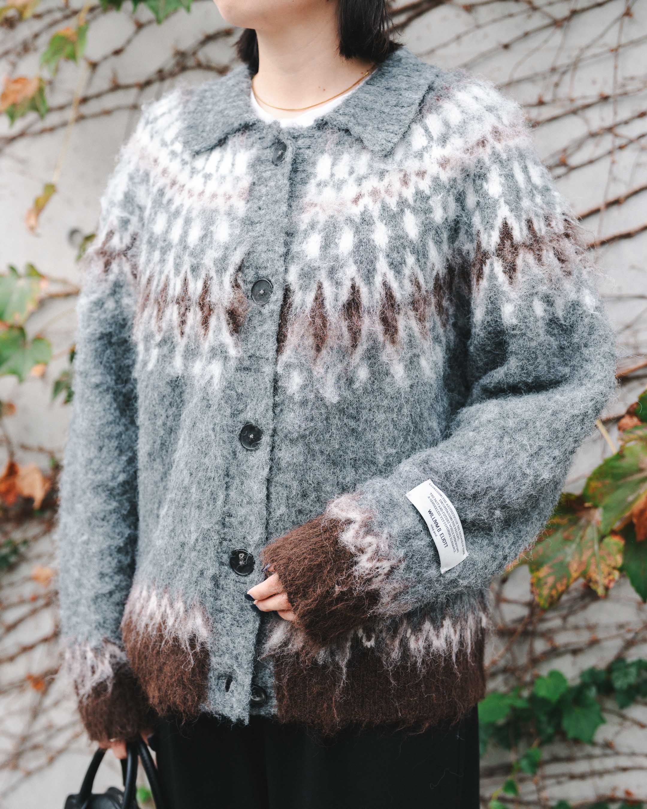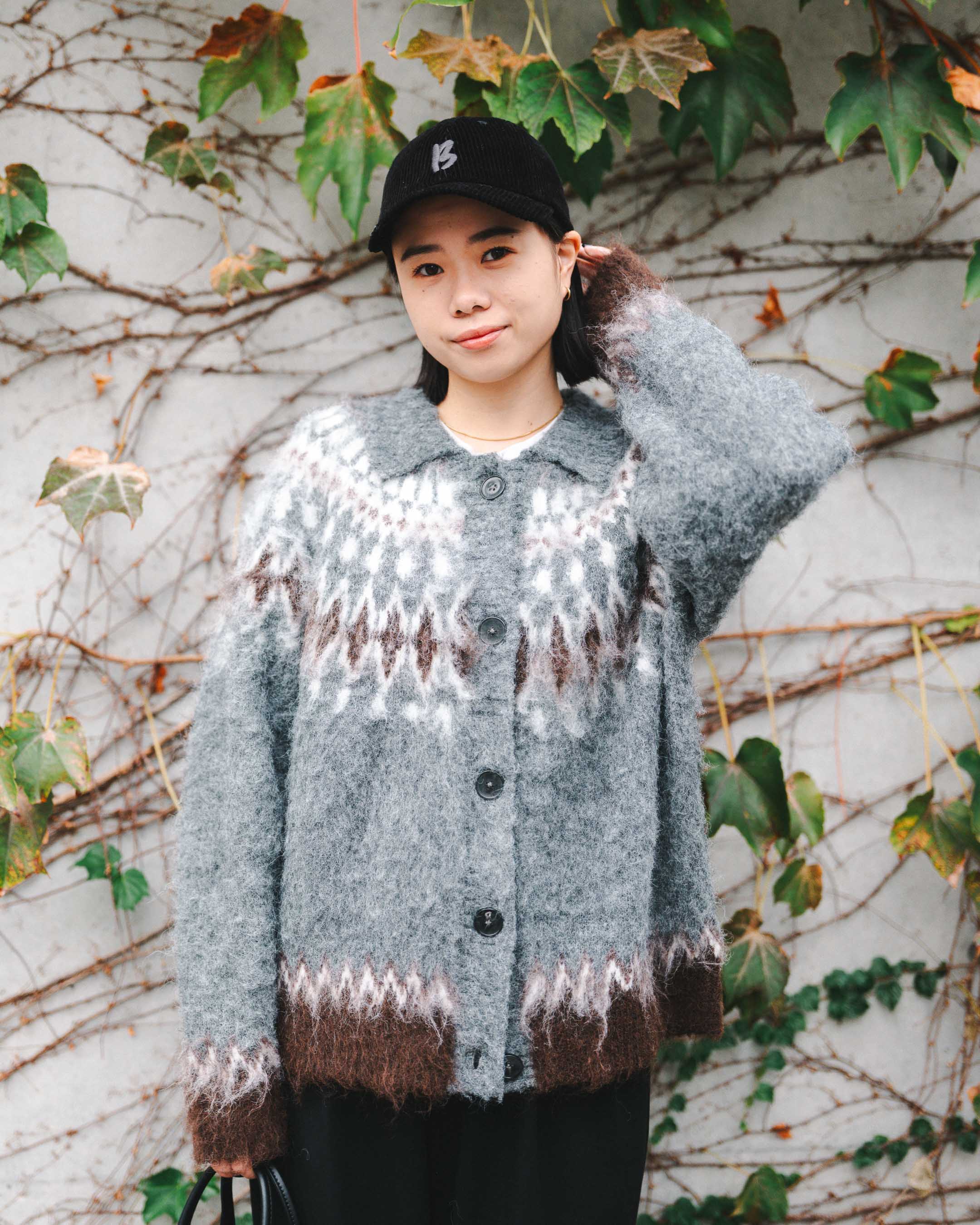 ノルディックニットカーデを主役に、トーンを合わせつつ柄でトレンドのブラウンをプラス!