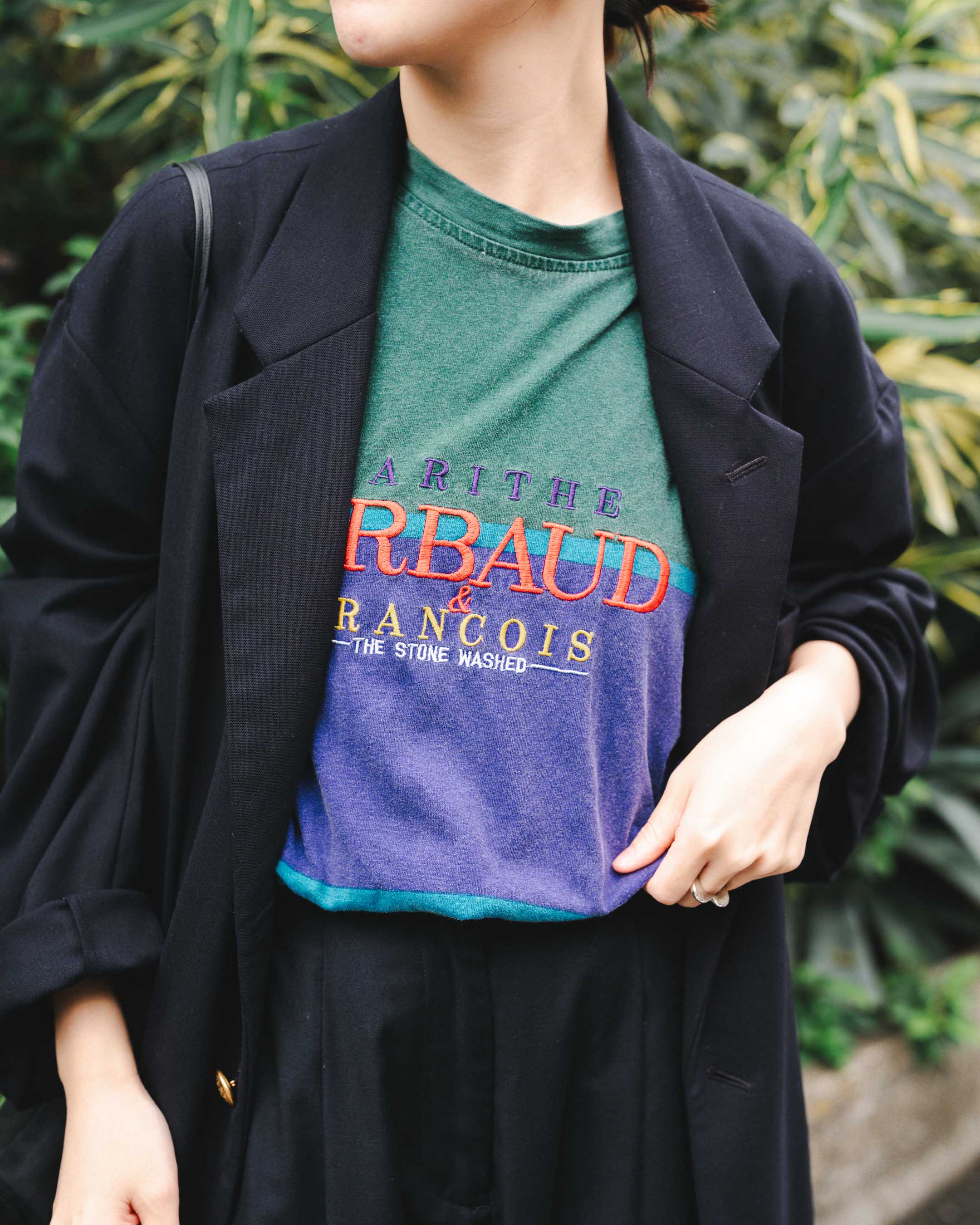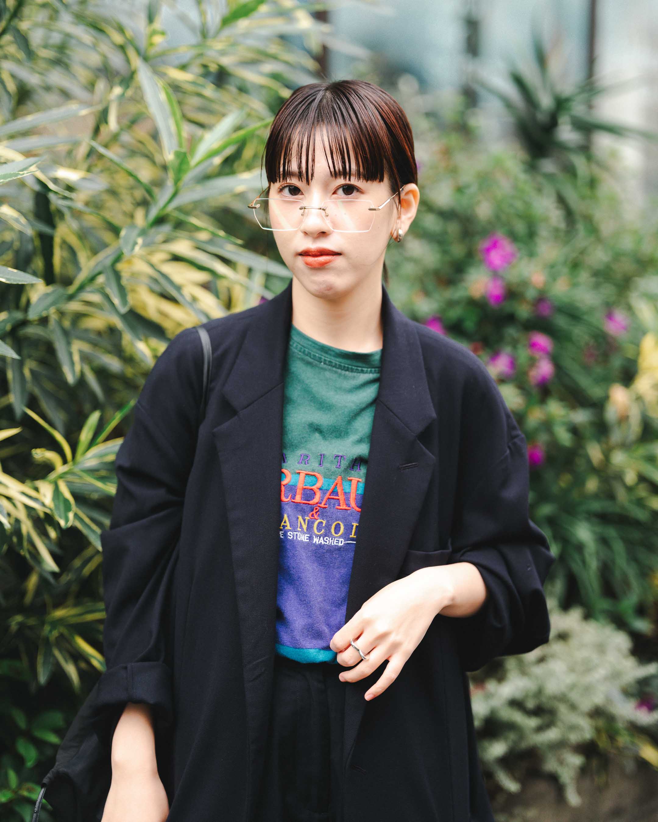 ブラックでクールにまとめたコーデは、POPなカラーのTシャツでアクセントを。