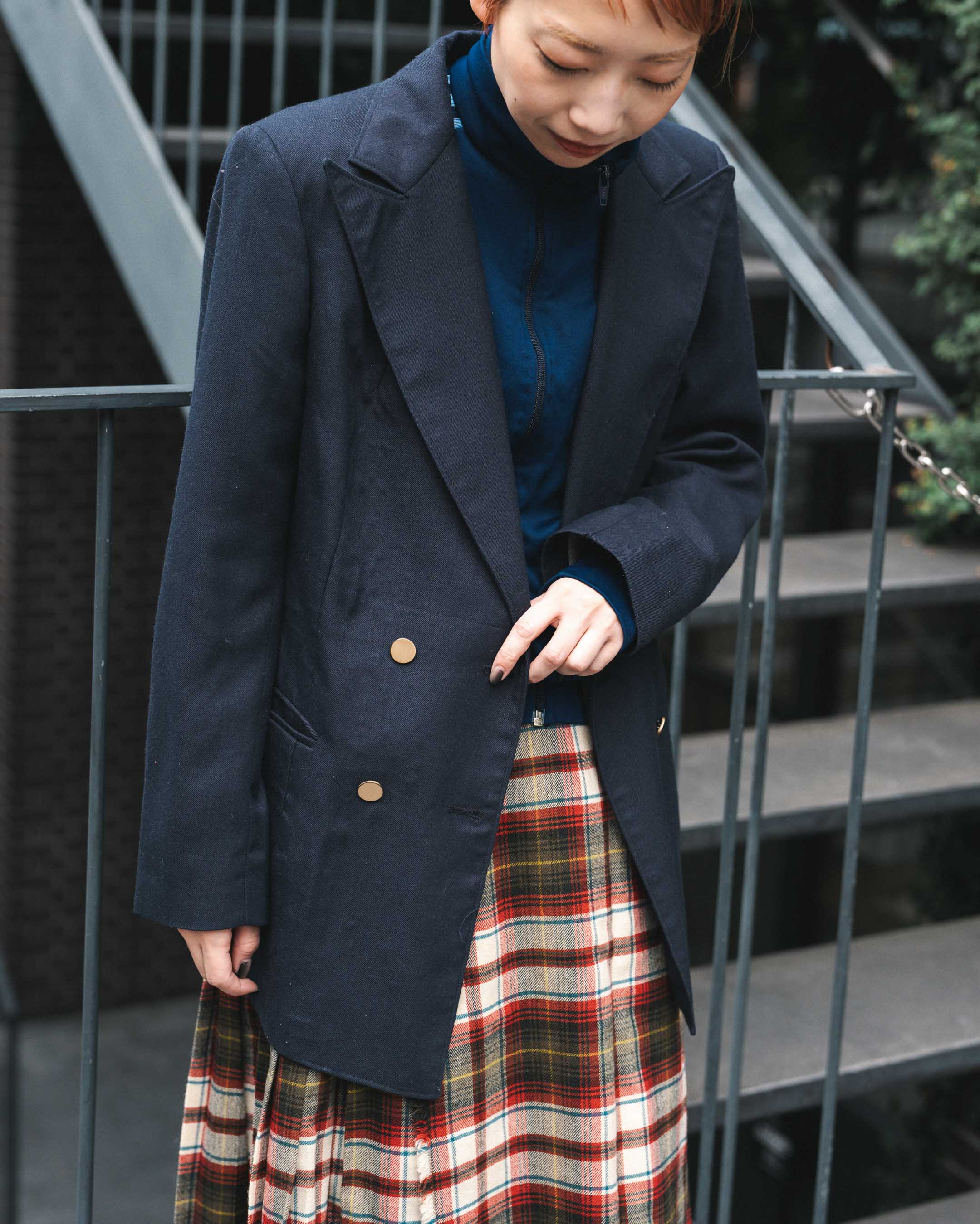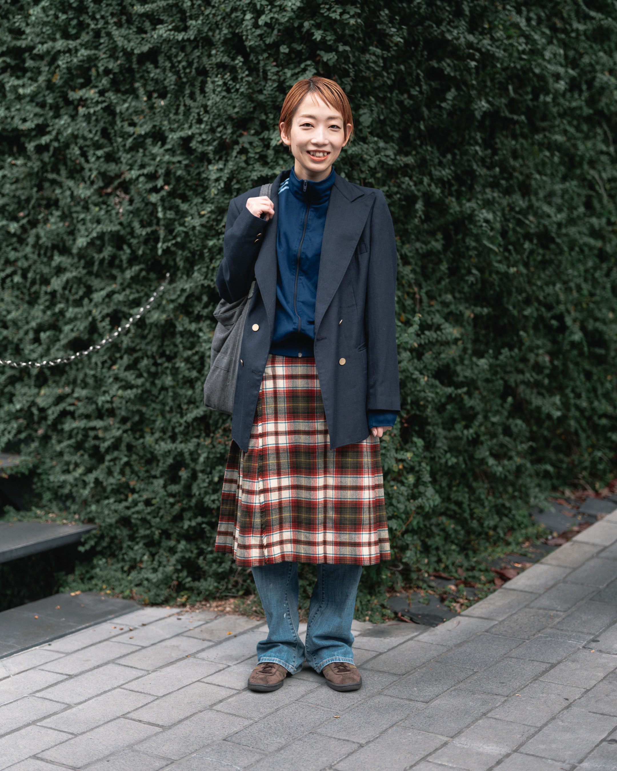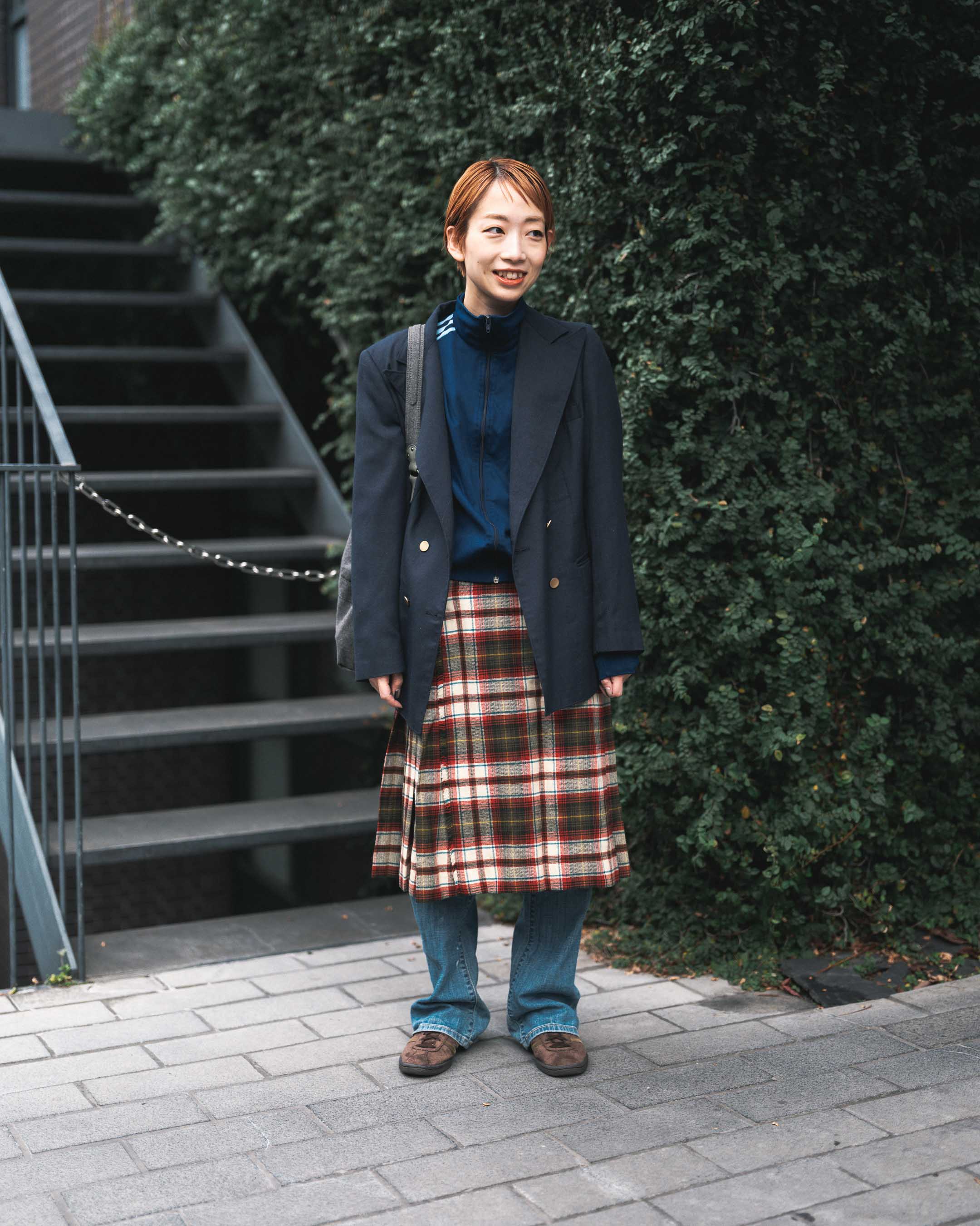 ジャージ×チェックスカートが可愛い!古着mixレイヤードコーデ。