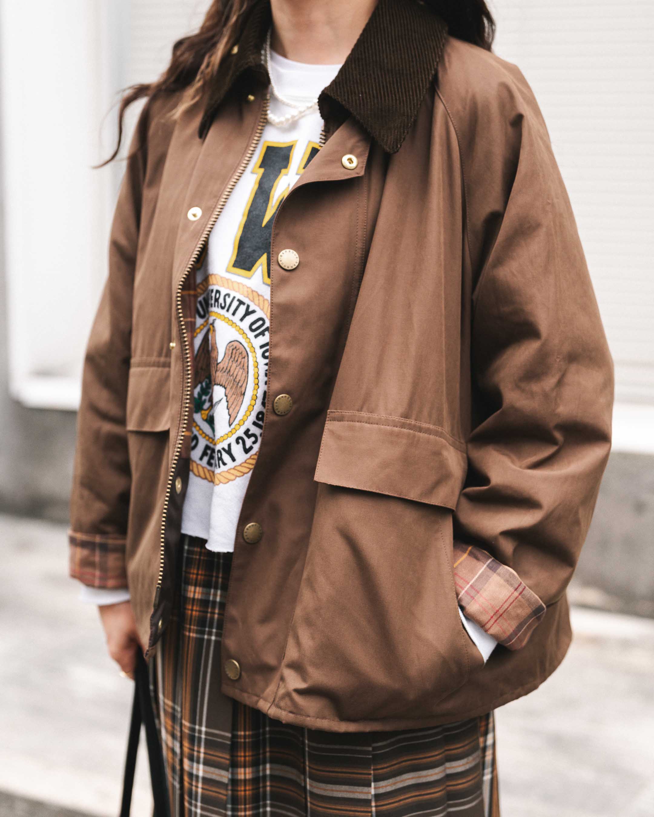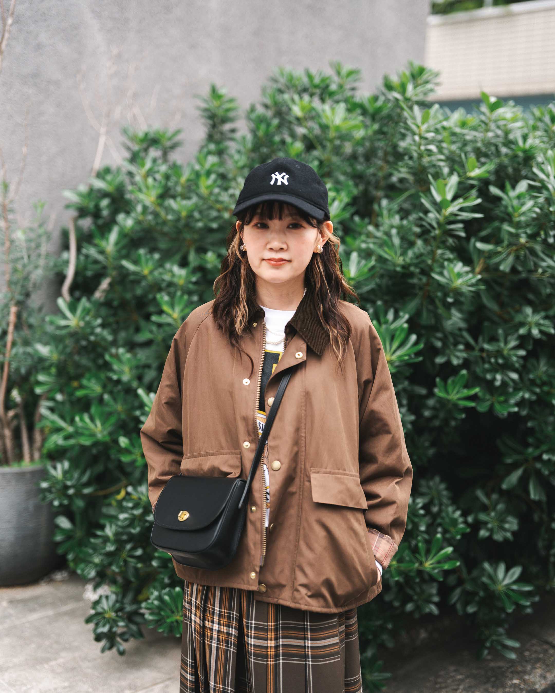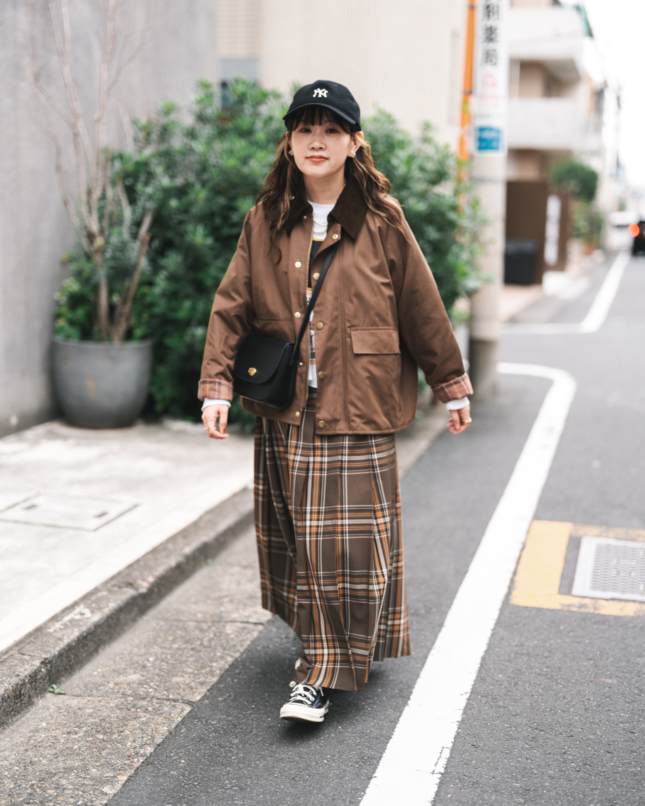 カジュアルアイテムを取り入れたブラウンカラーコーデ。