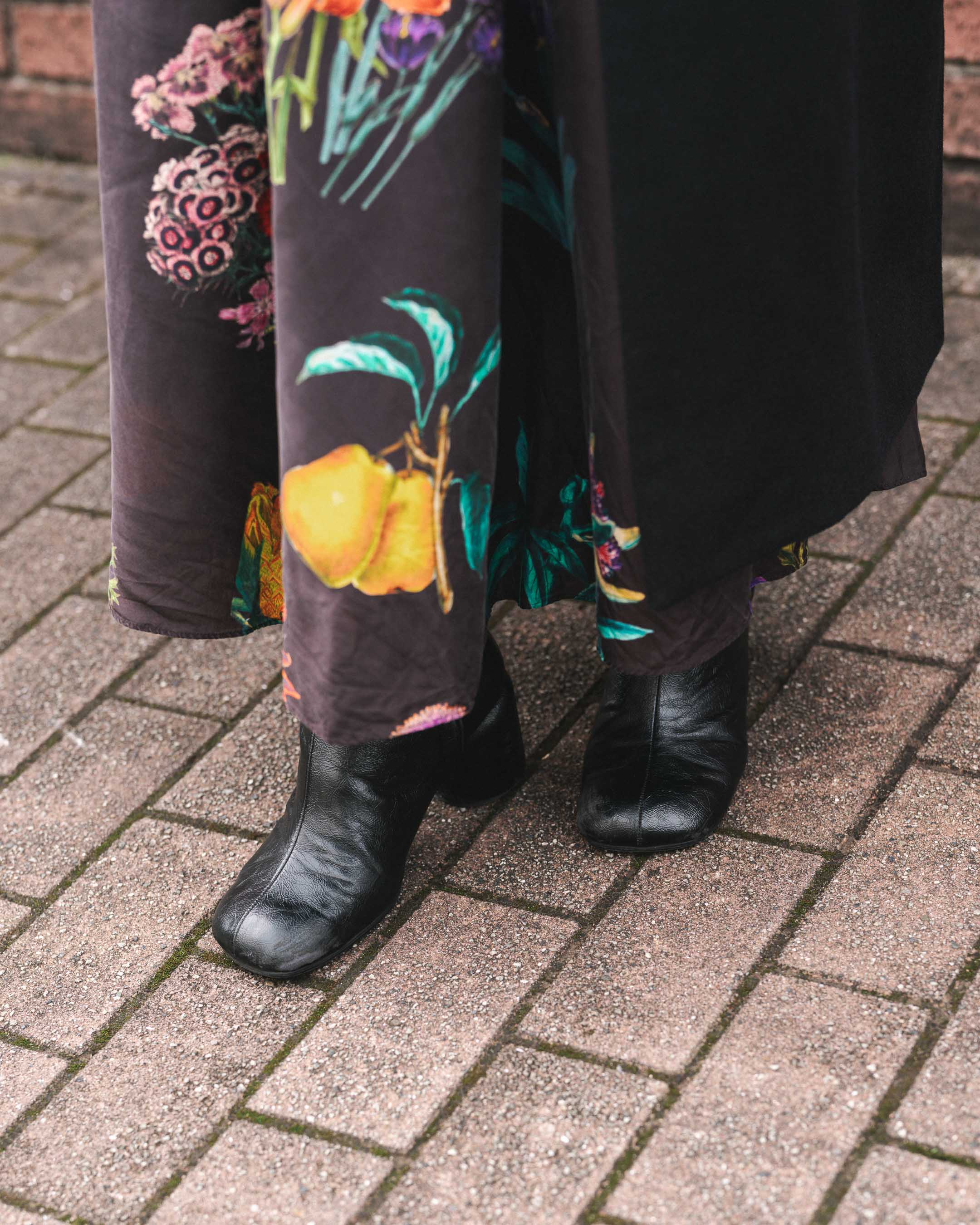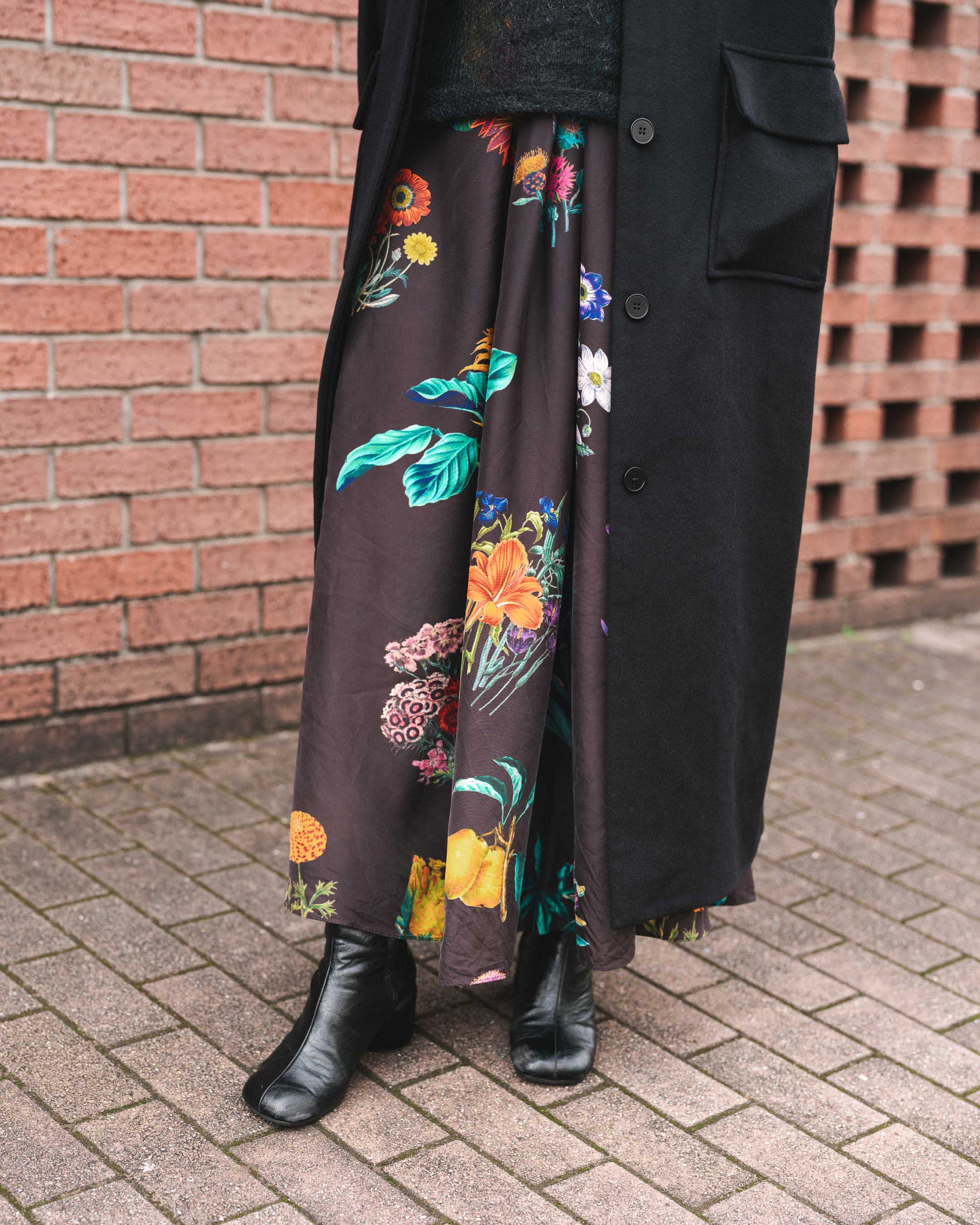 ヨーロッパの街並みに馴染むようなコーデ。花柄ワンピとバーガンディカラーのバッグを差し色にして明るさを。