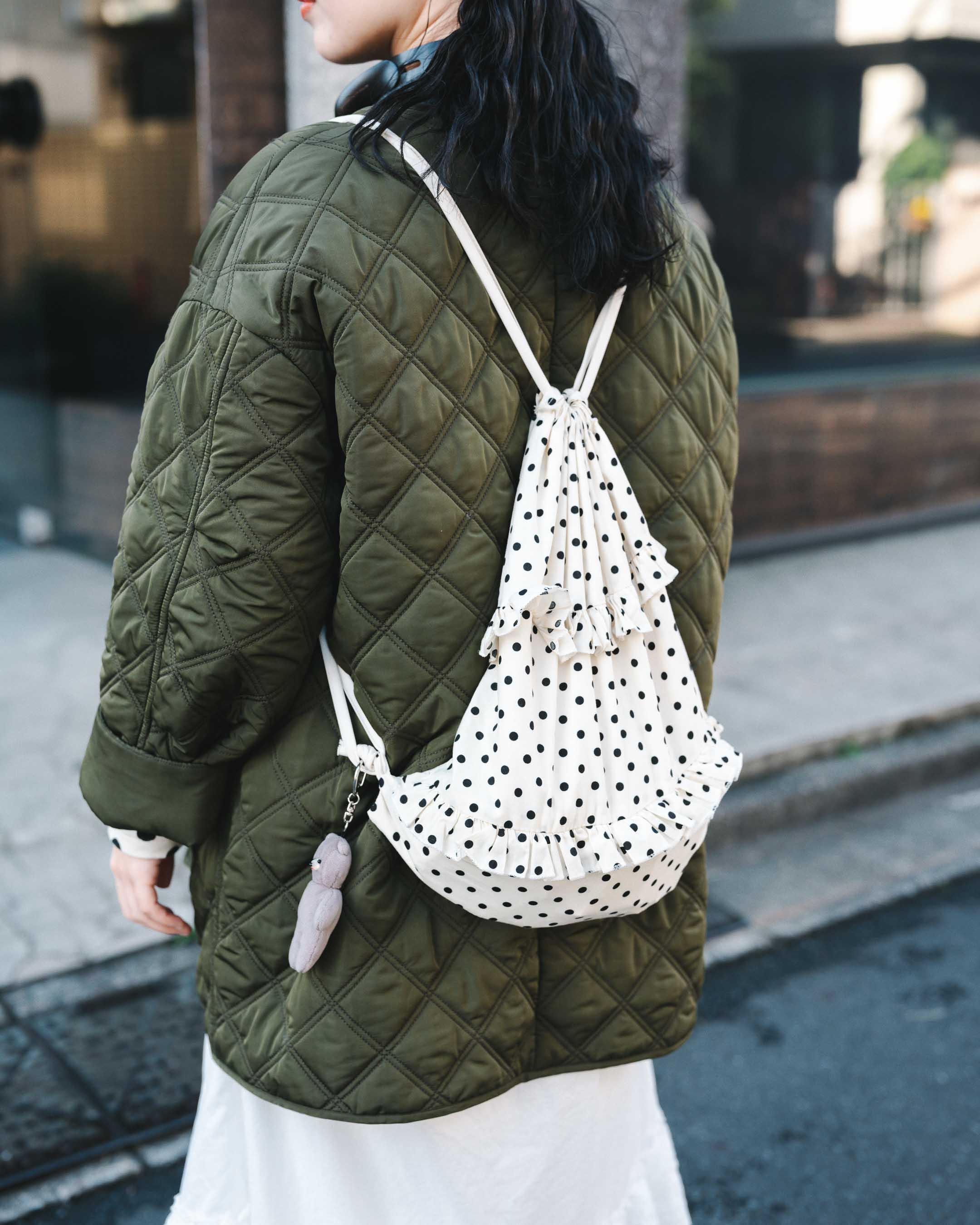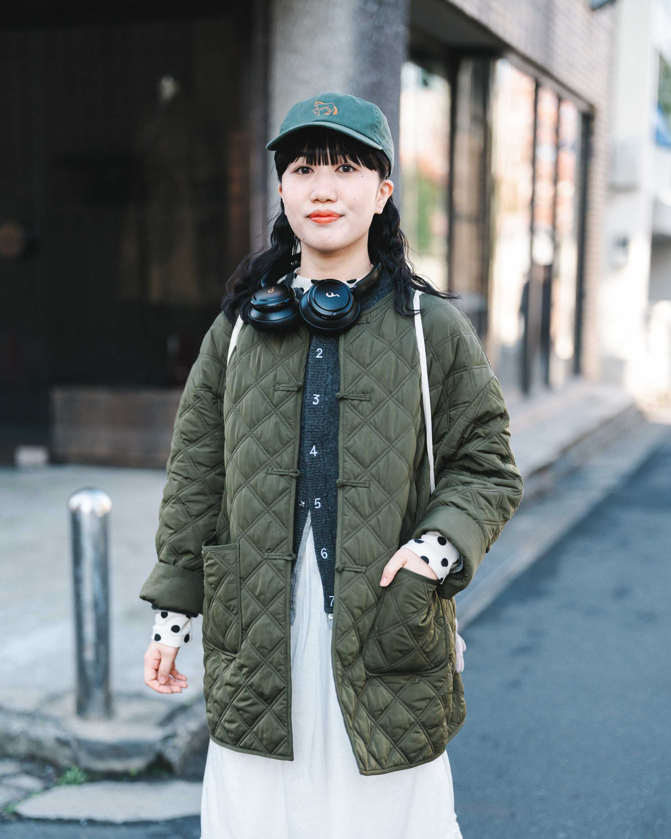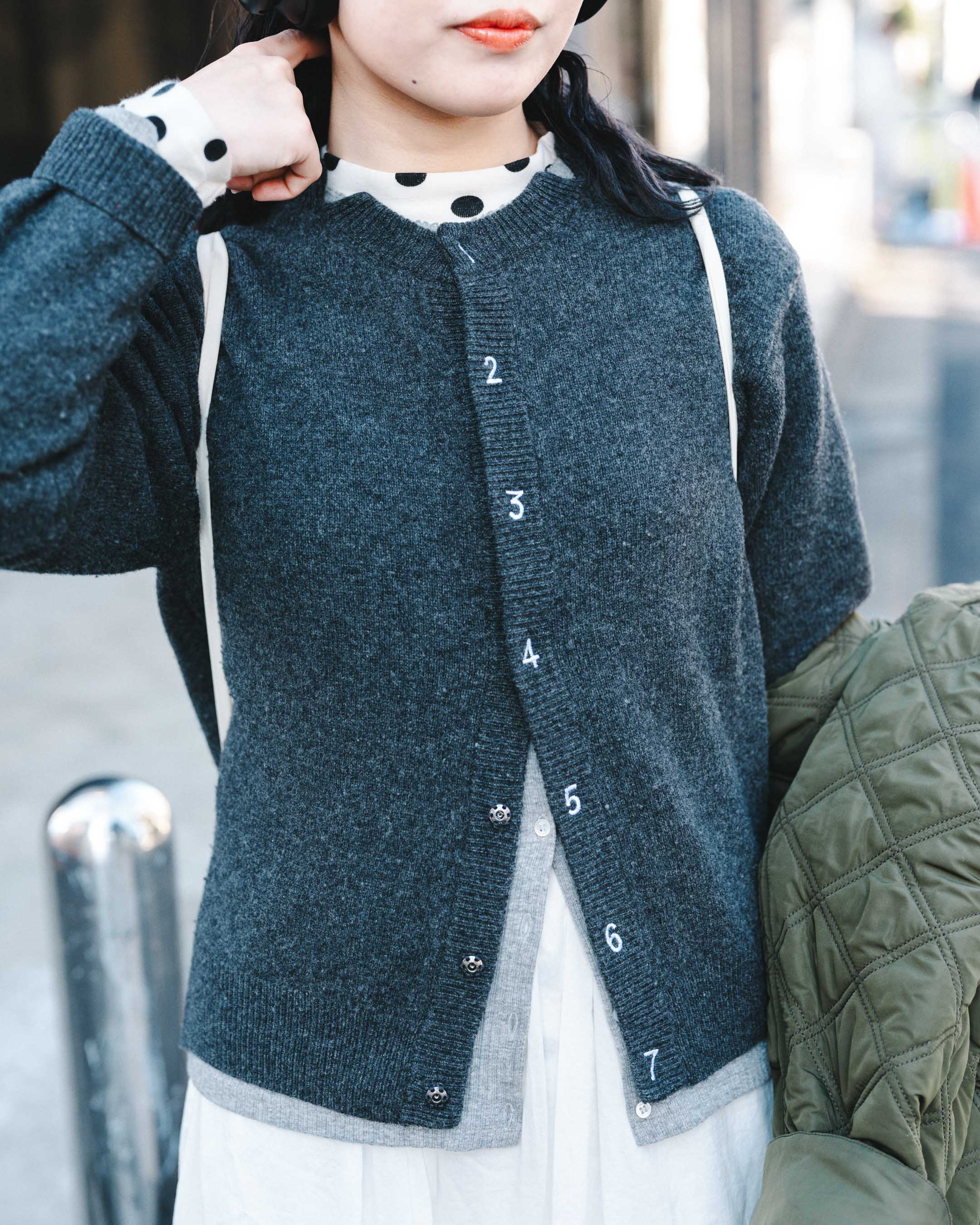 数字のレタリングがキュートなカーデをアウターからチラ見せ。