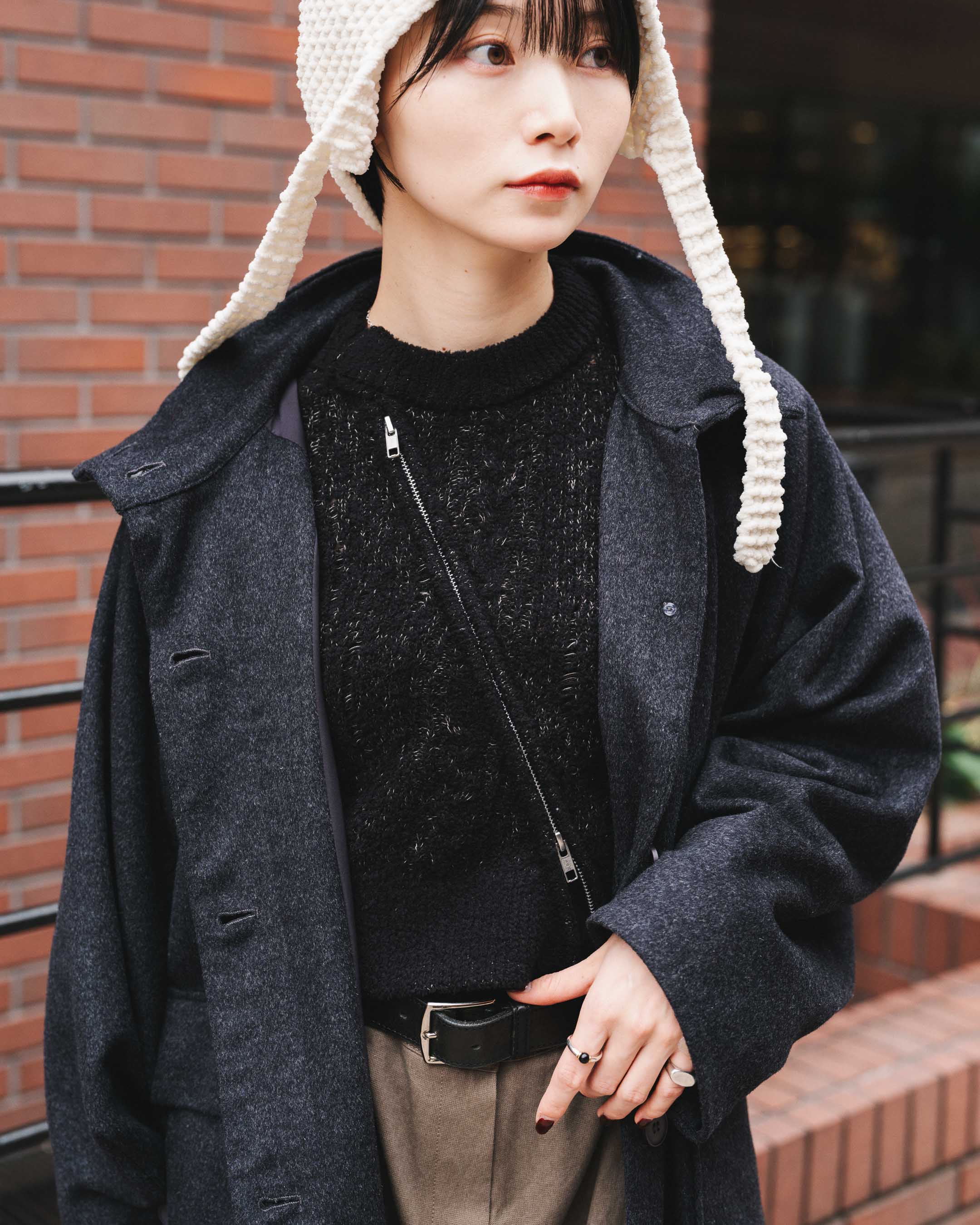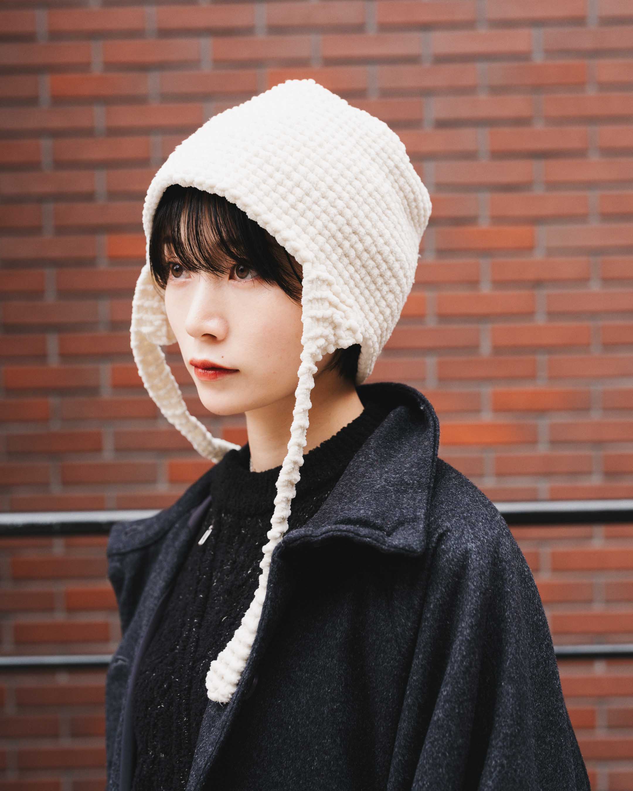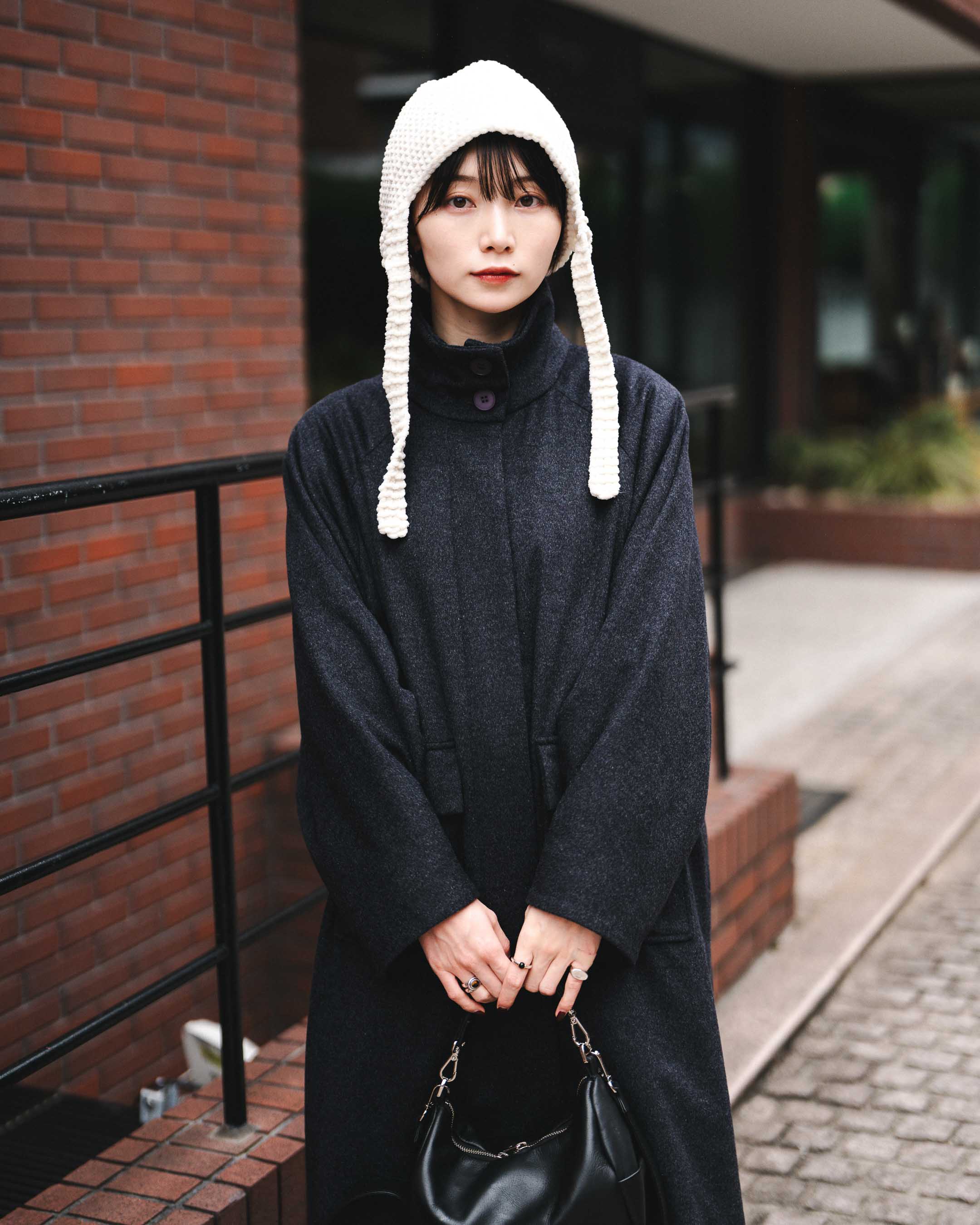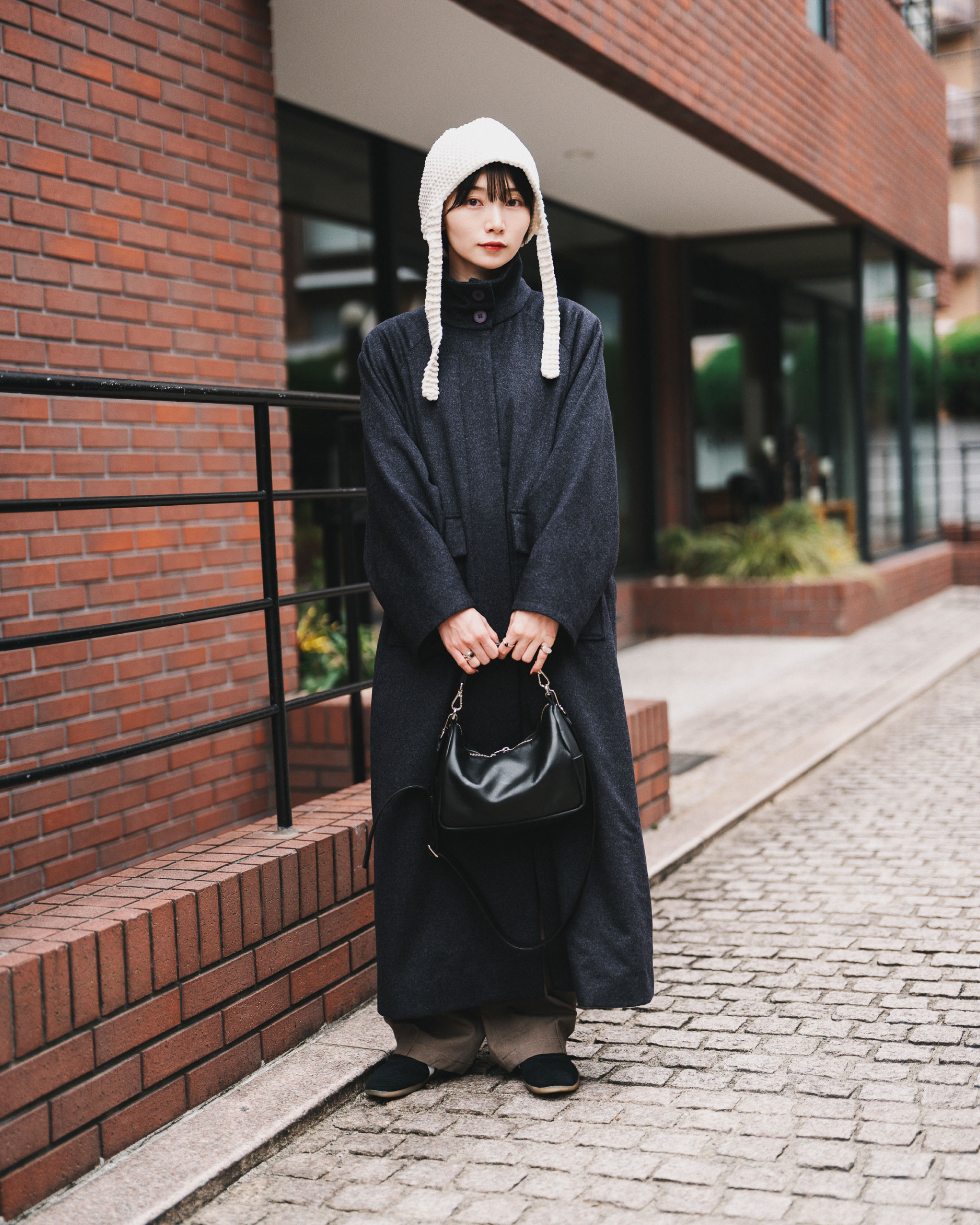 ロングコートにニット帽。ルーズなコーデの中に甘さをひとさじ。