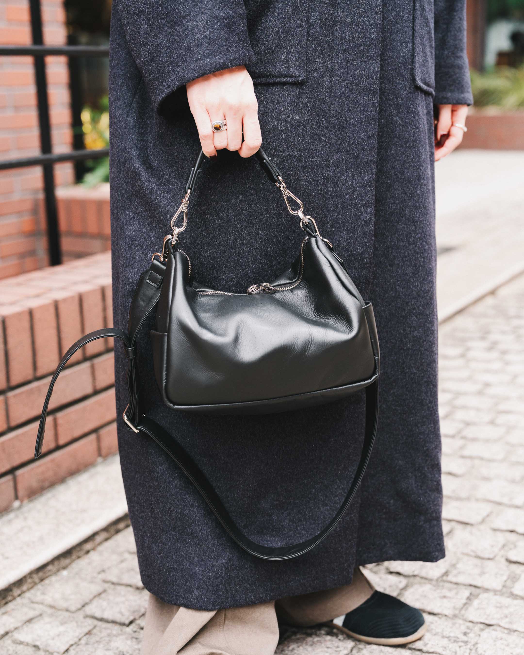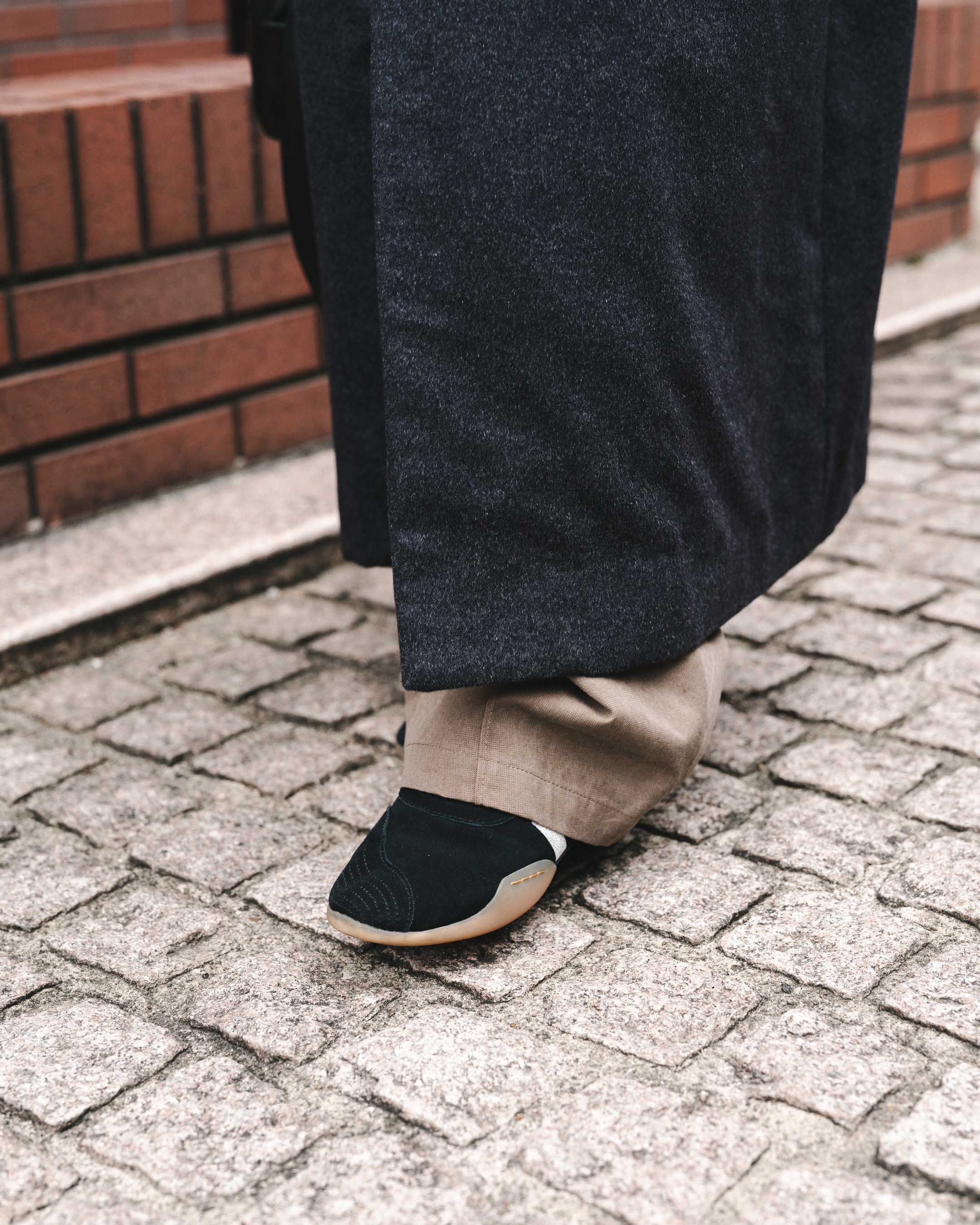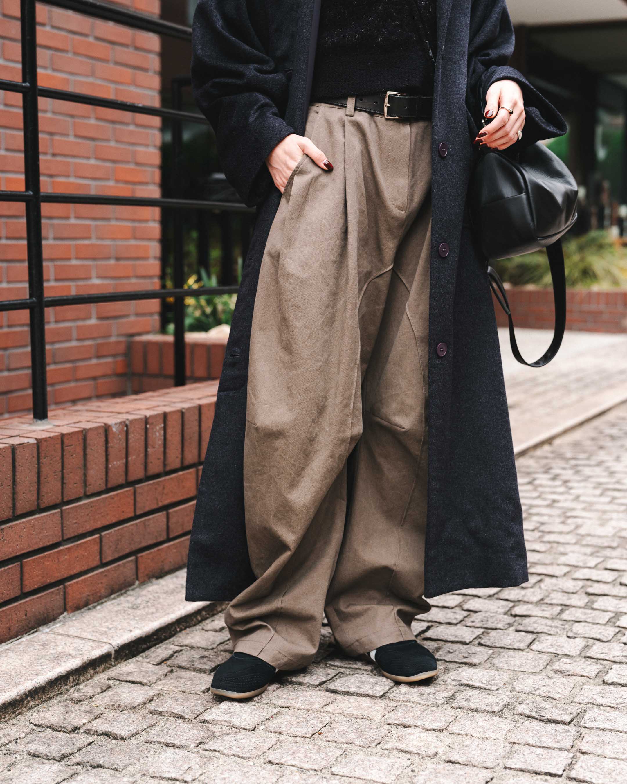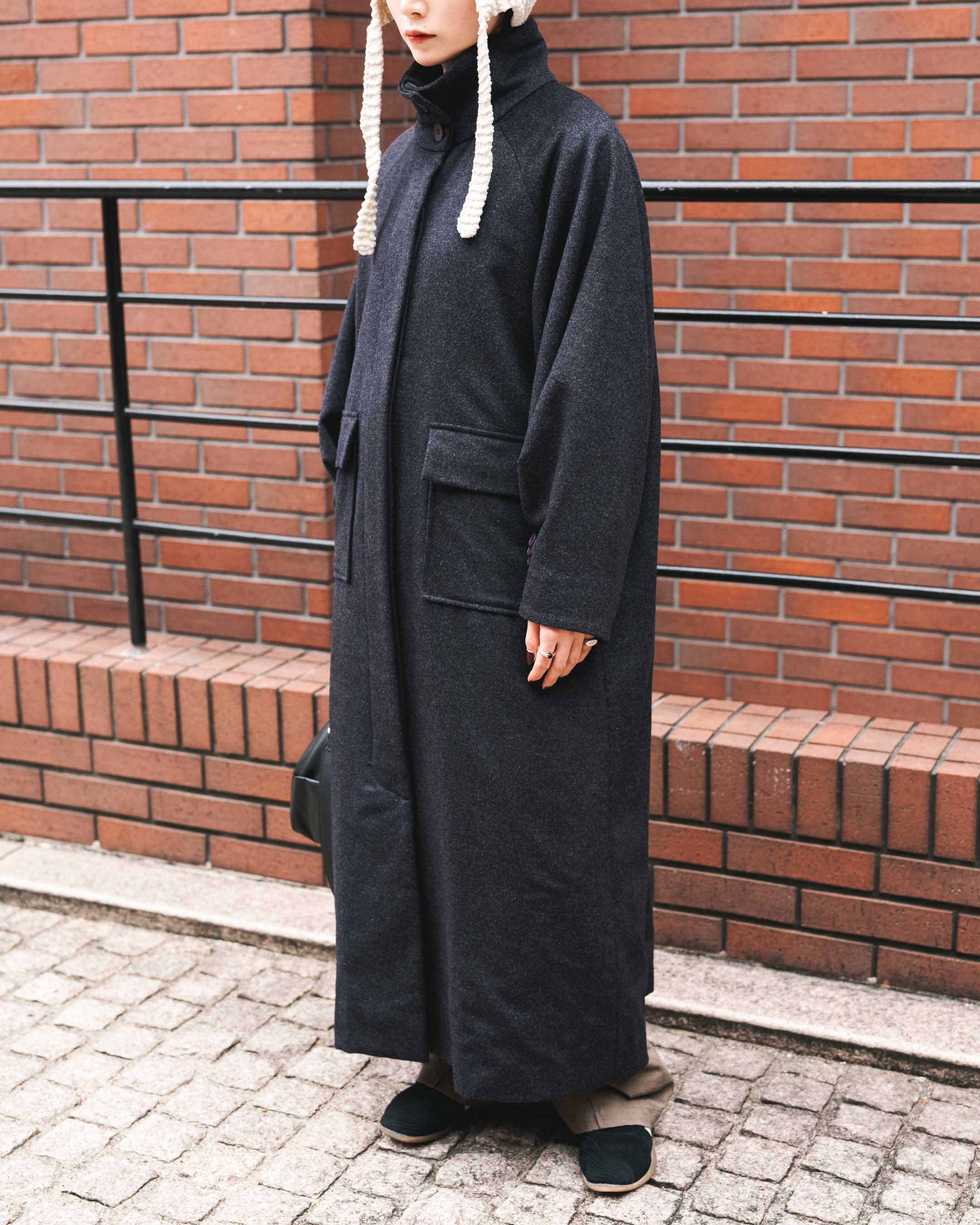ロングコートにニット帽。ルーズなコーデの中に甘さをひとさじ。
