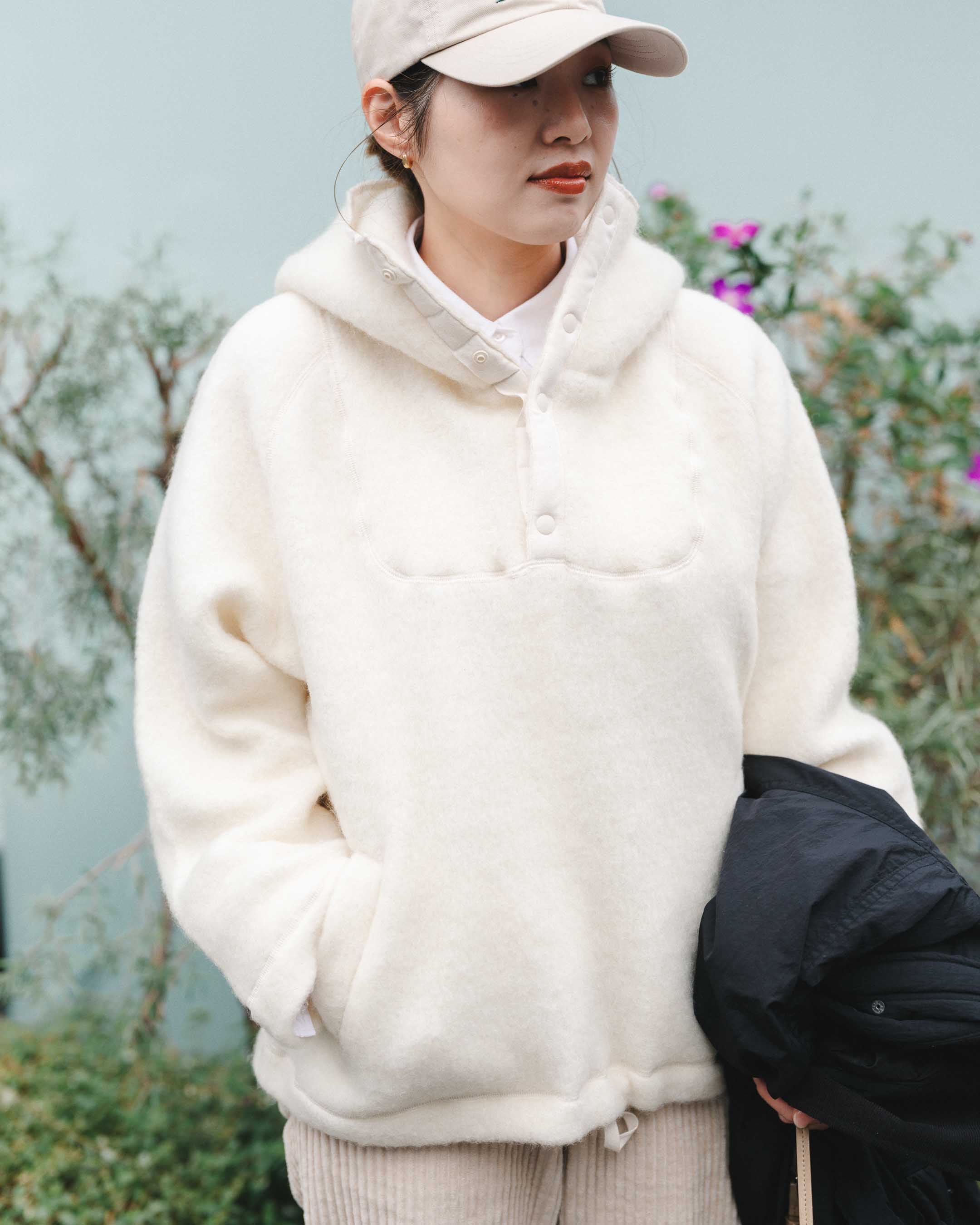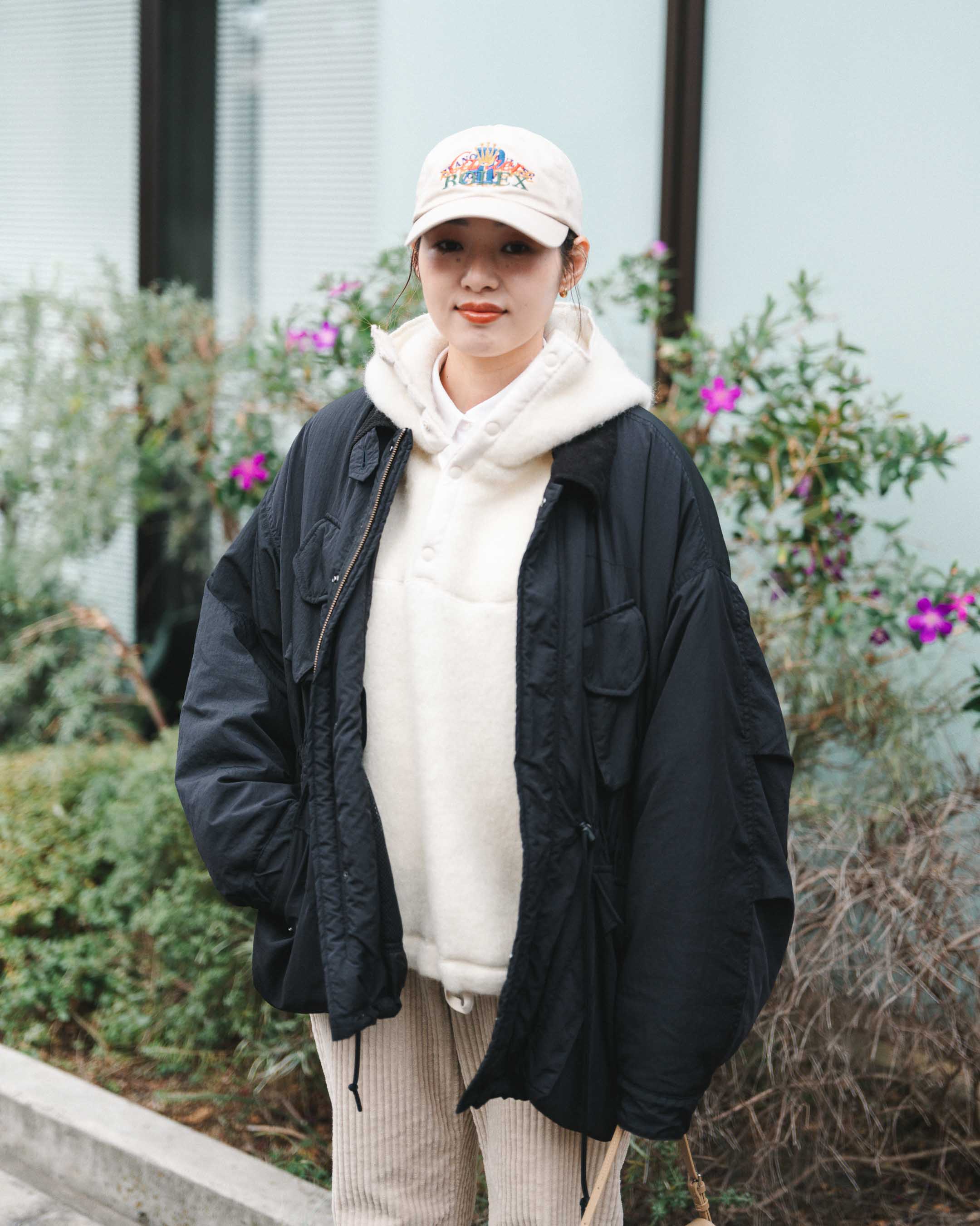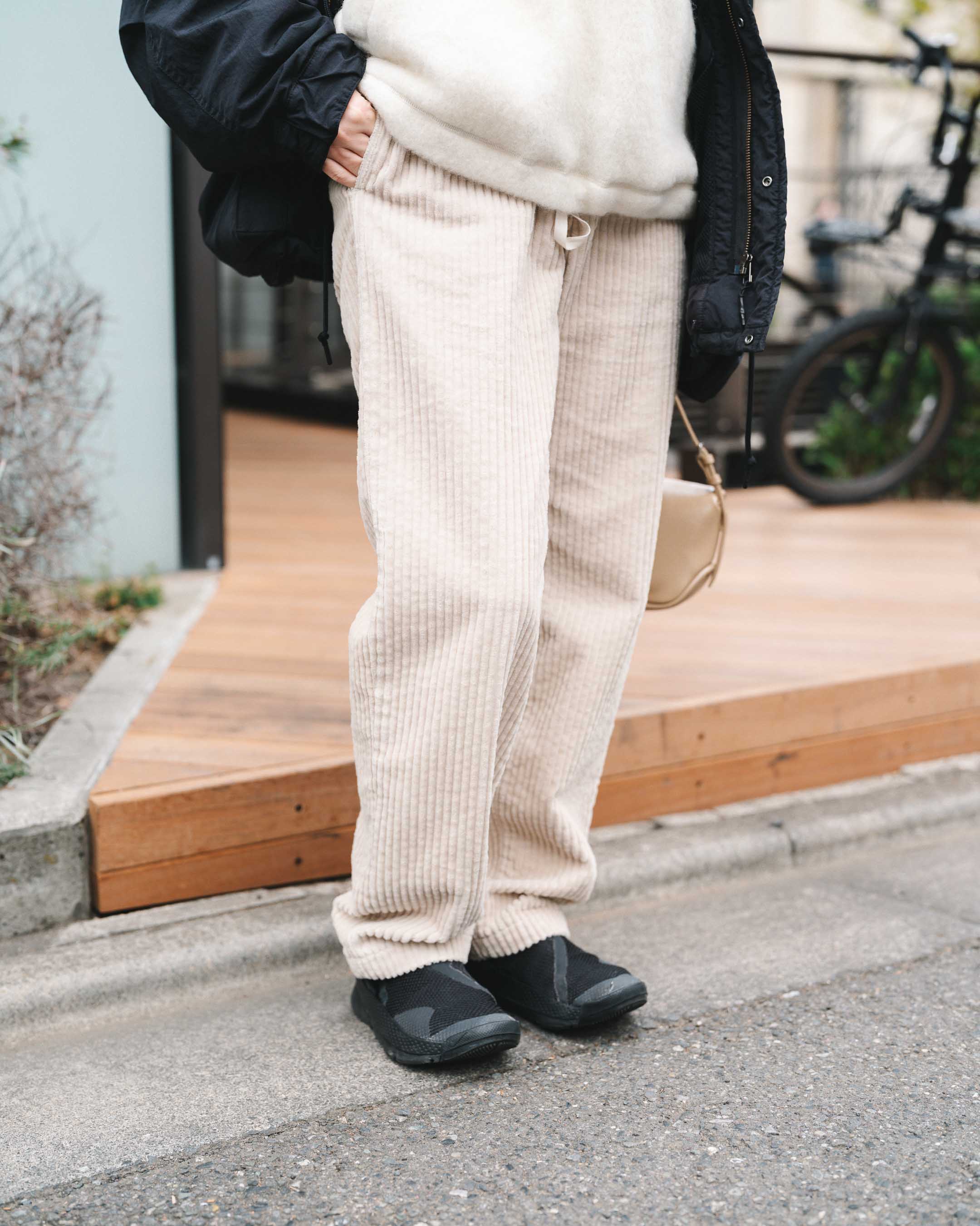動きやすさと暖かさ重視でボーイッシュに。ホワイト、ベージュトーンをアウターとスニーカーのブラックで締める。