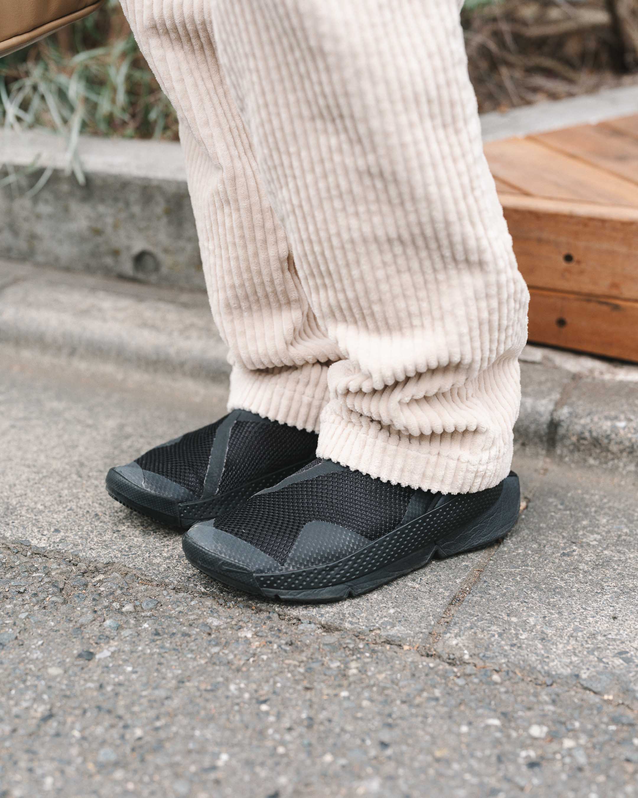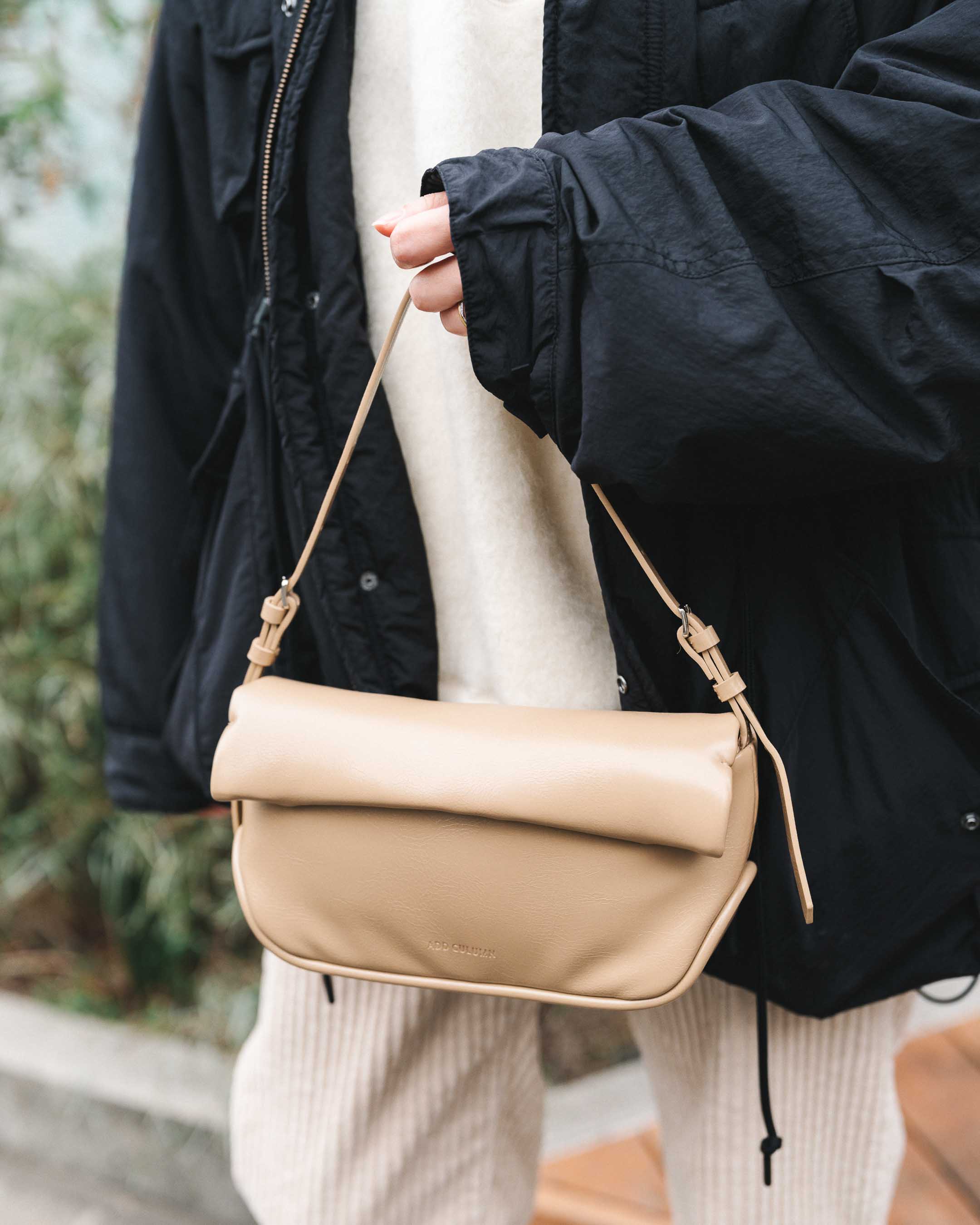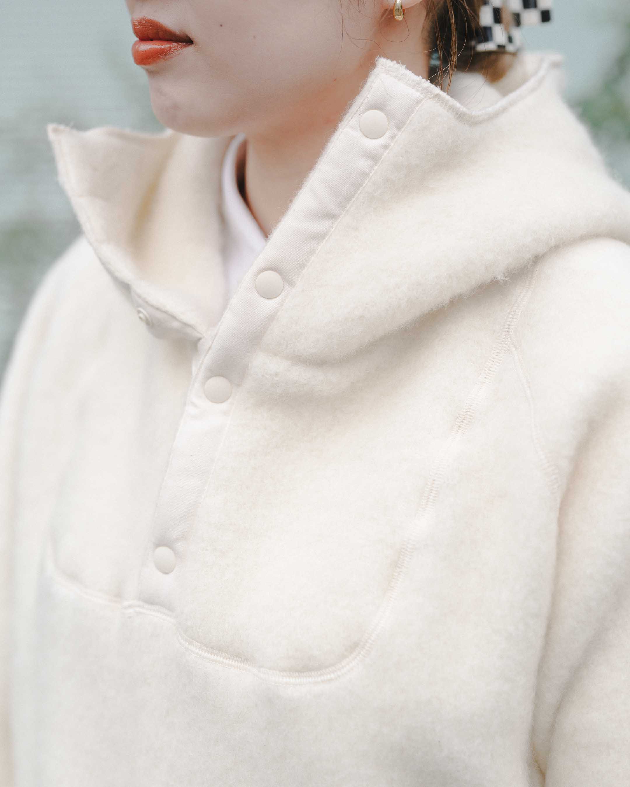 動きやすさと暖かさ重視でボーイッシュに。ホワイト、ベージュトーンをアウターとスニーカーのブラックで締める。