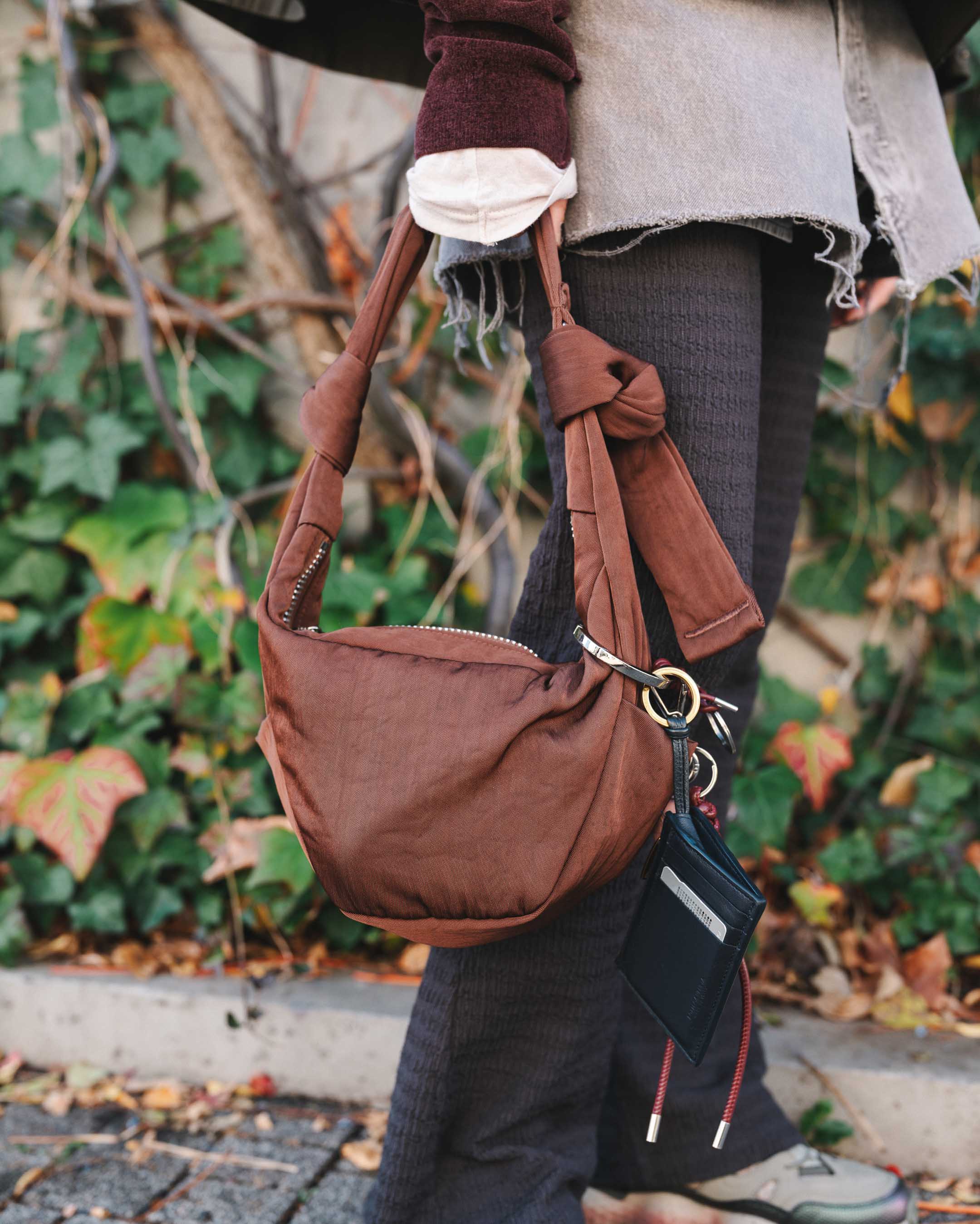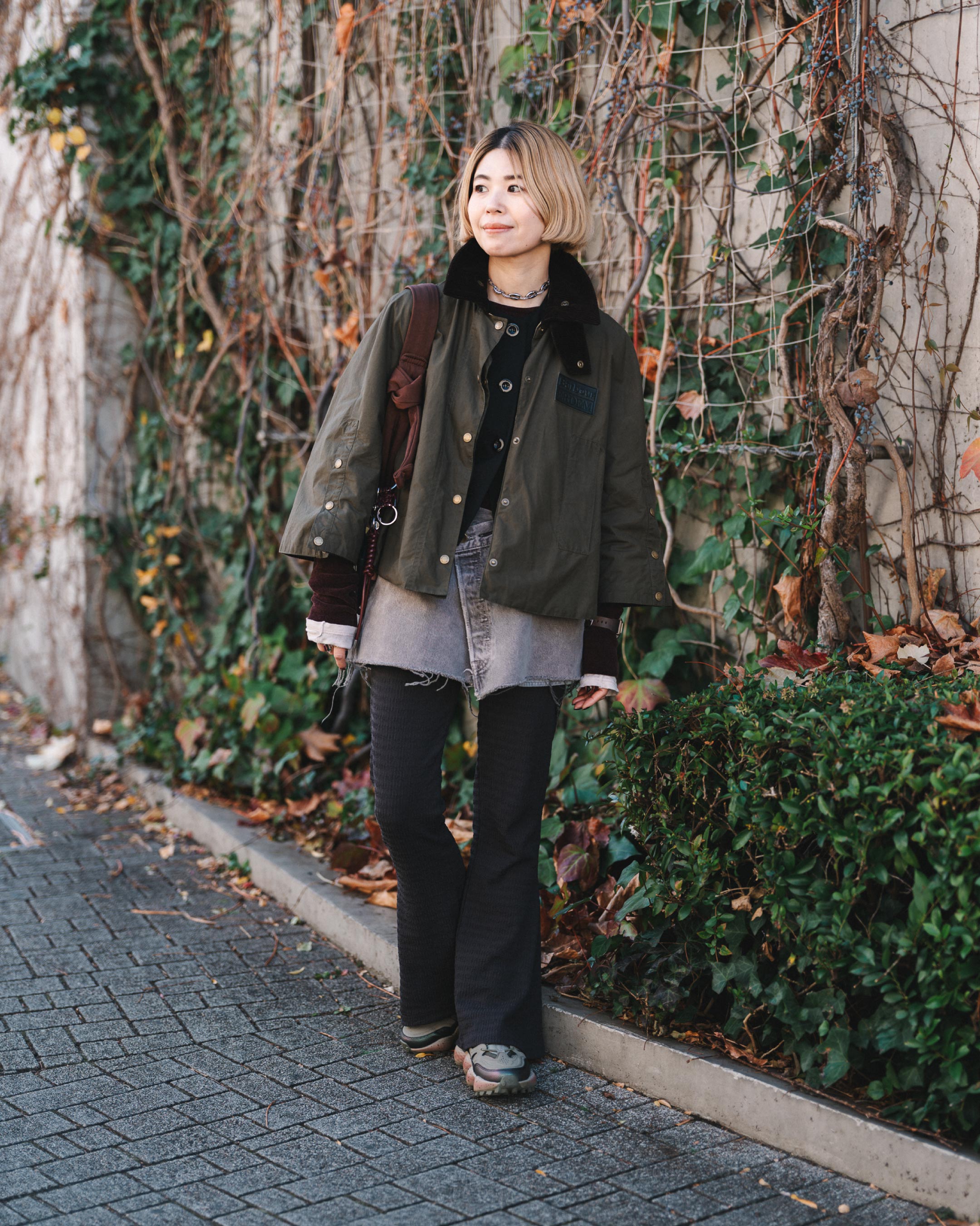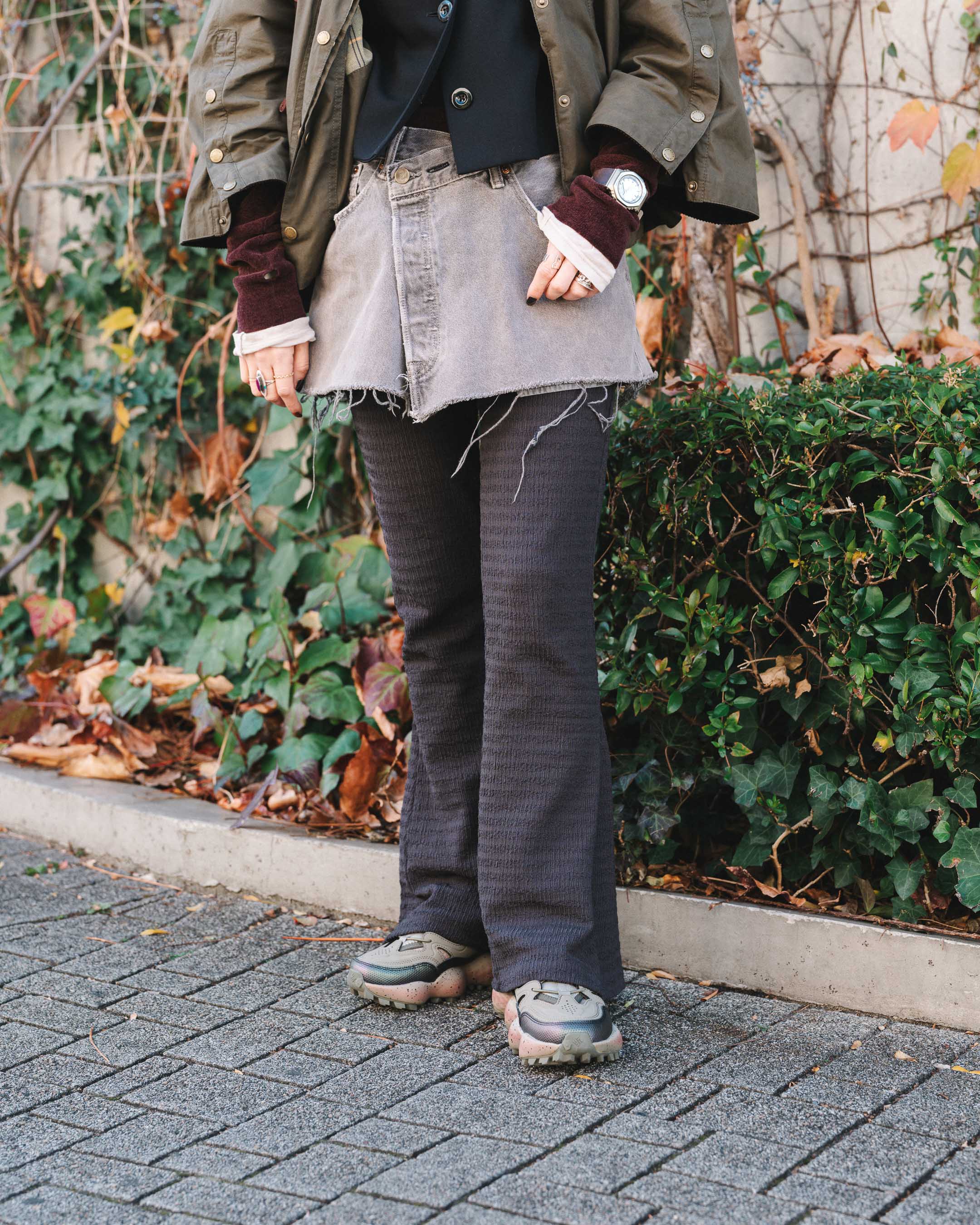 フレアパンツとミニ丈のリメイクスカートに短丈のアウターで脚長バランス!