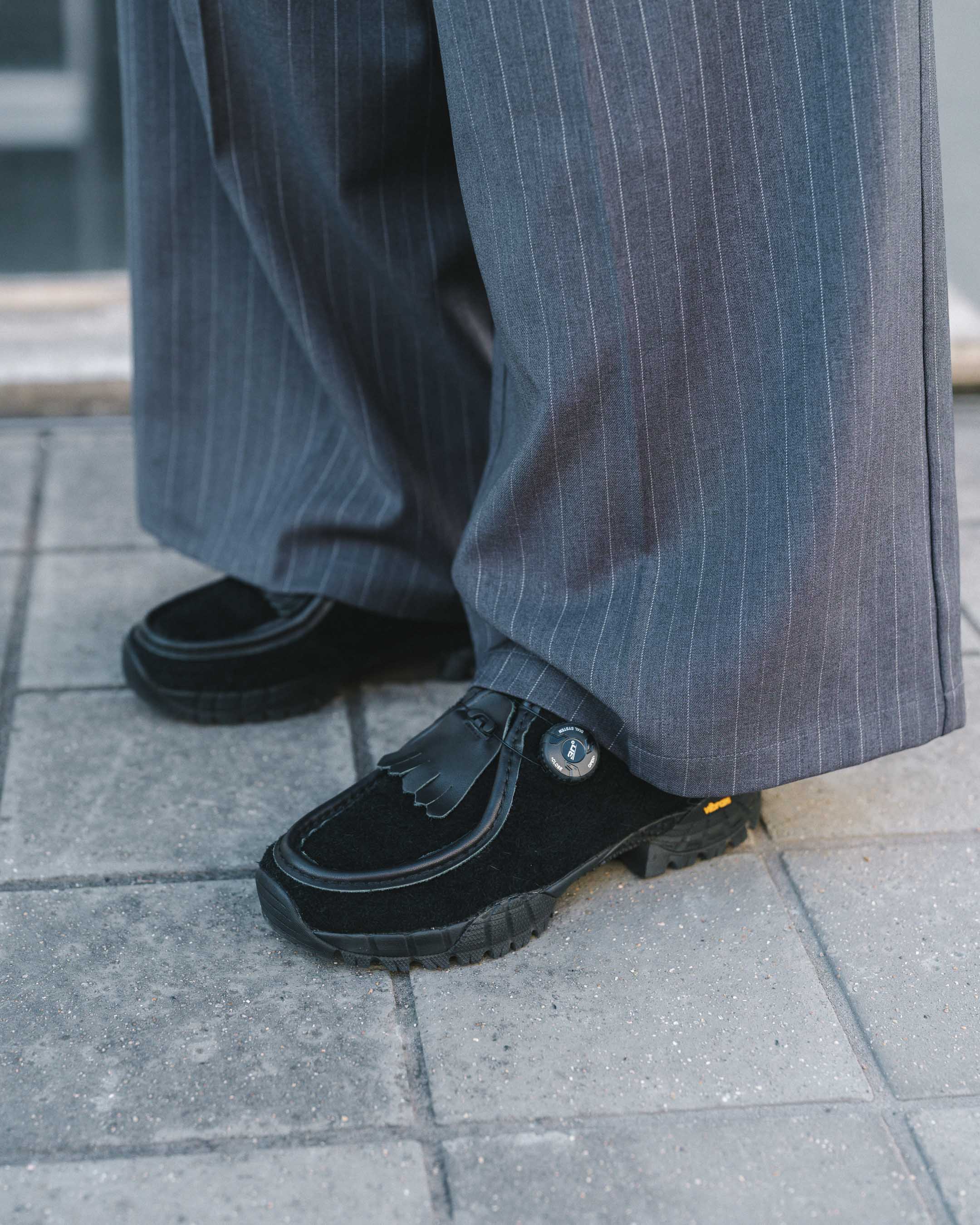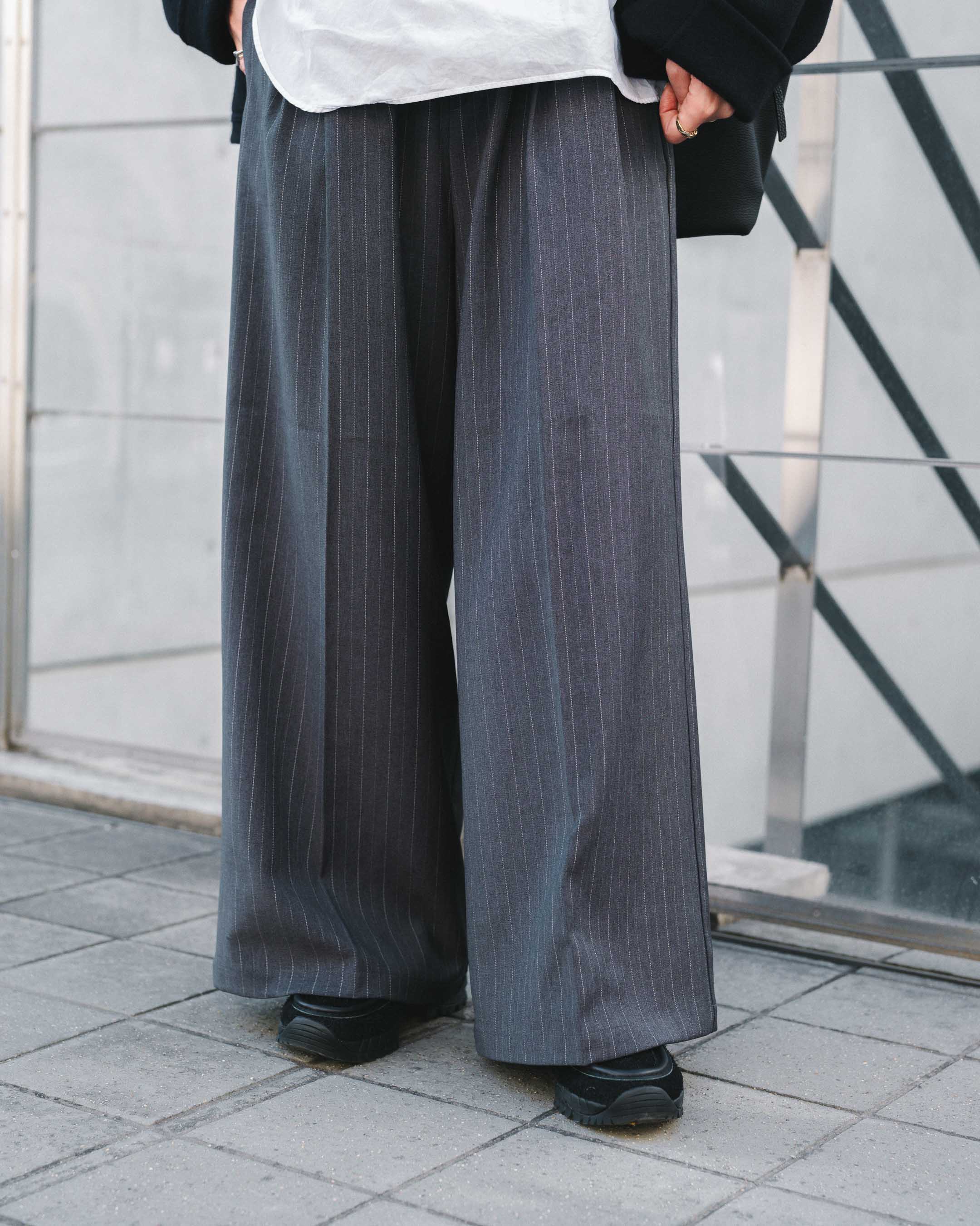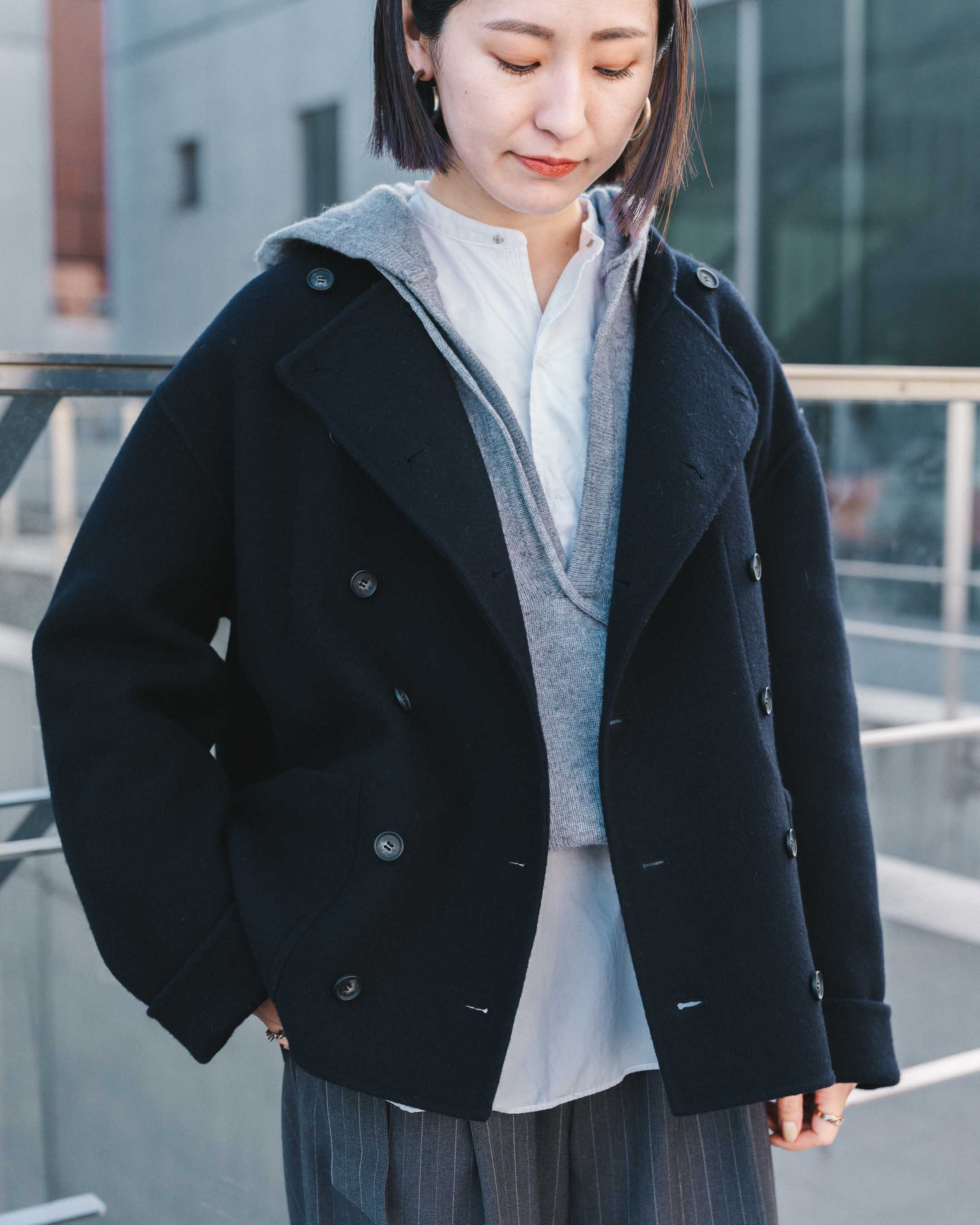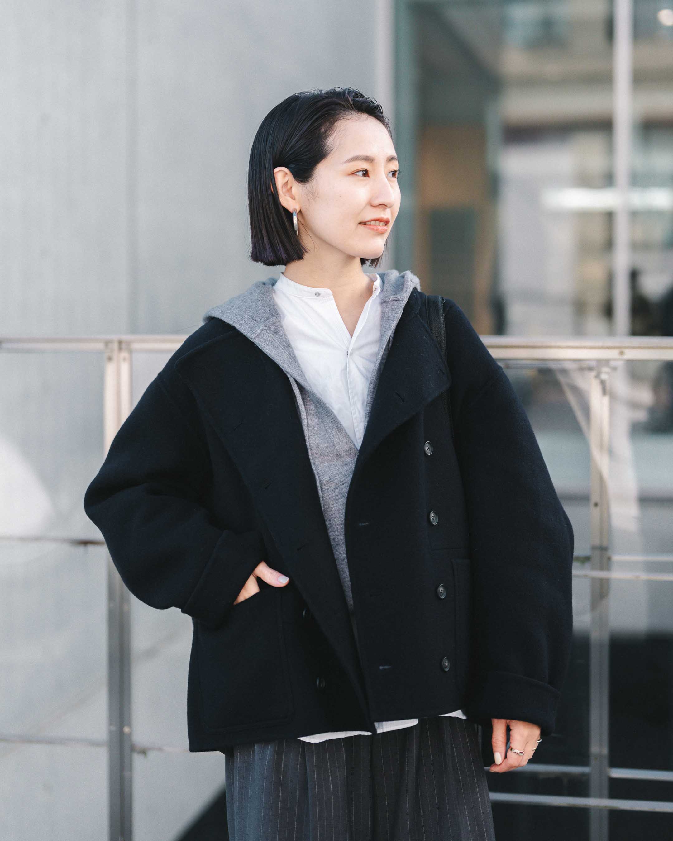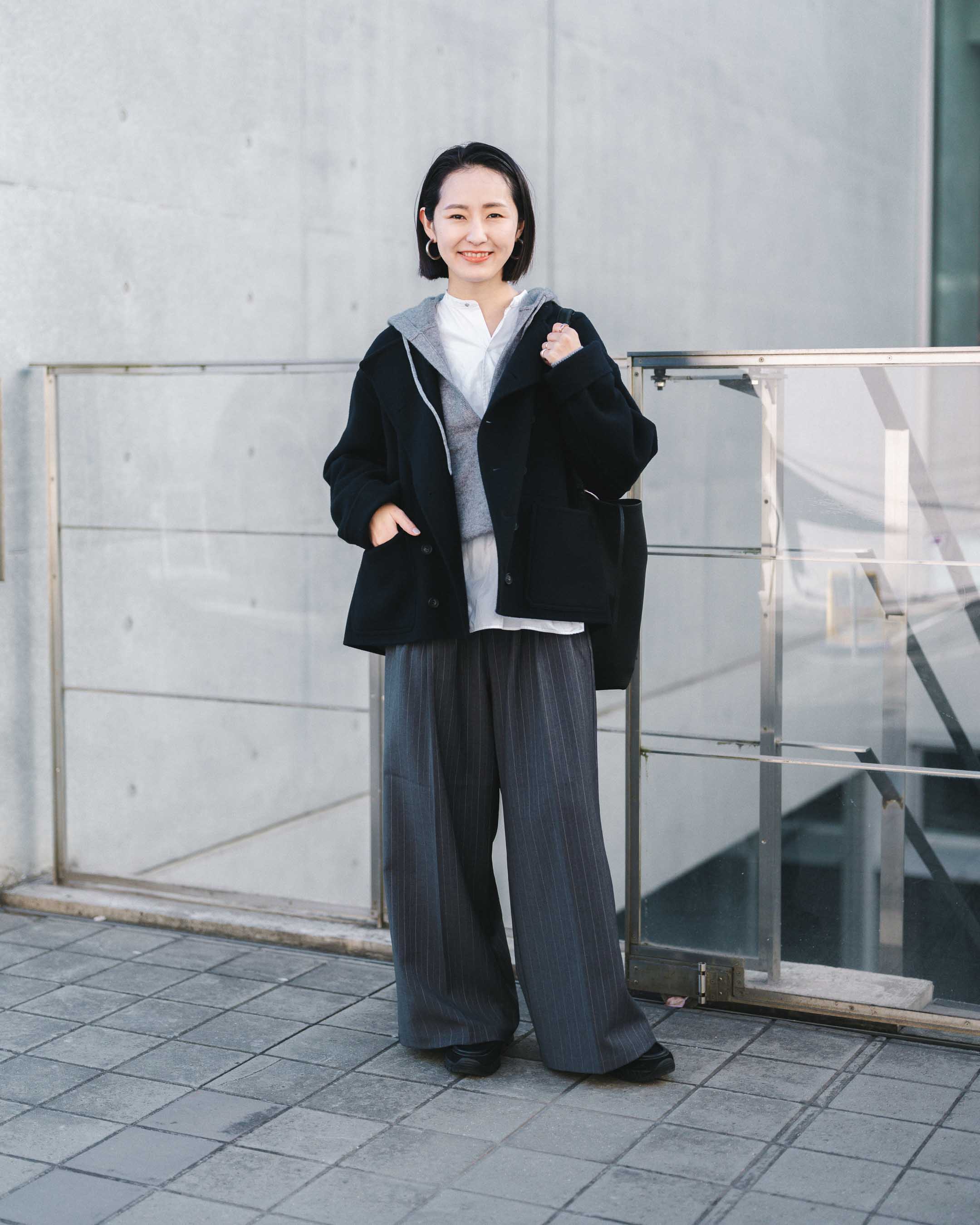 グレーとネイビーで合わせたマニッシュスタイルは、バランスも考慮して。