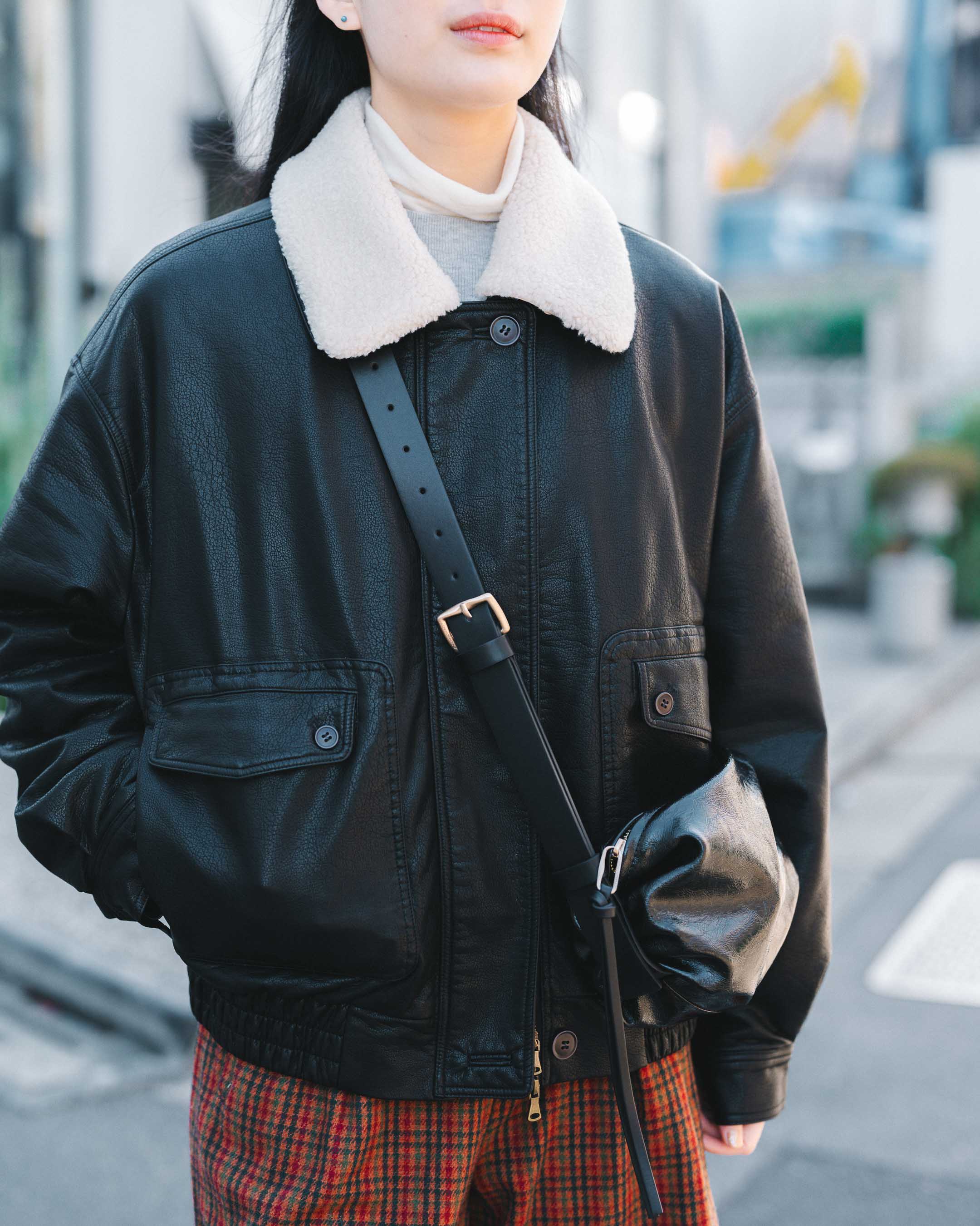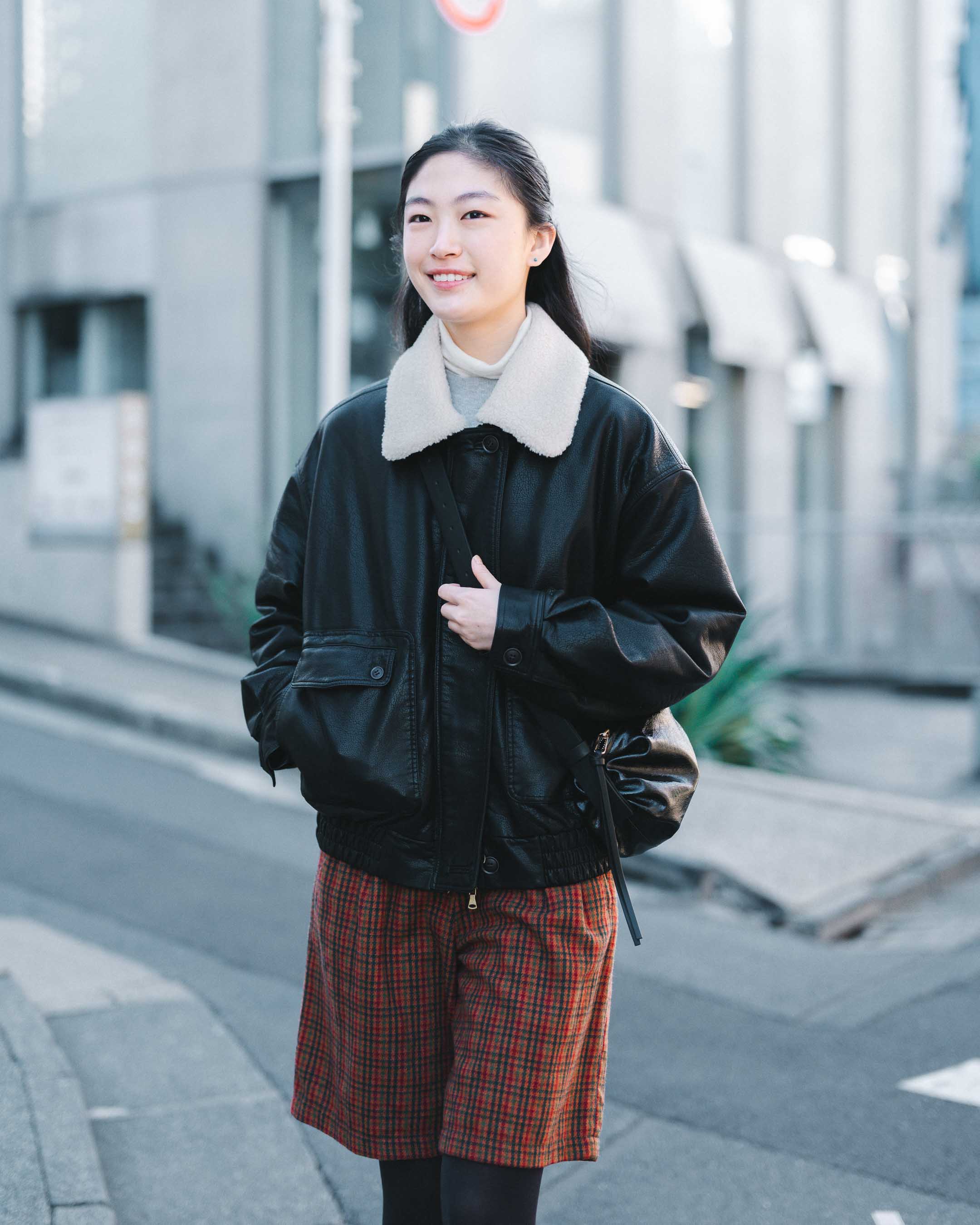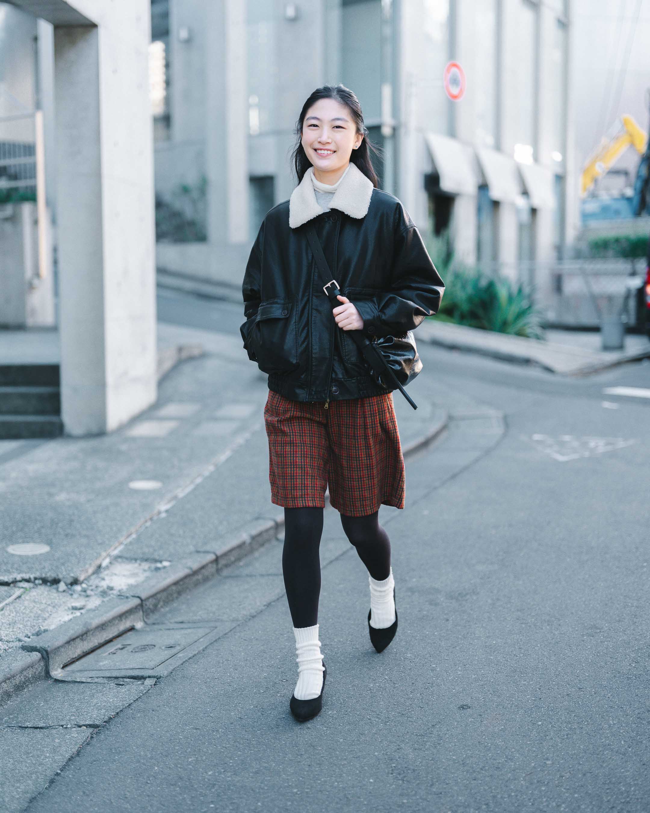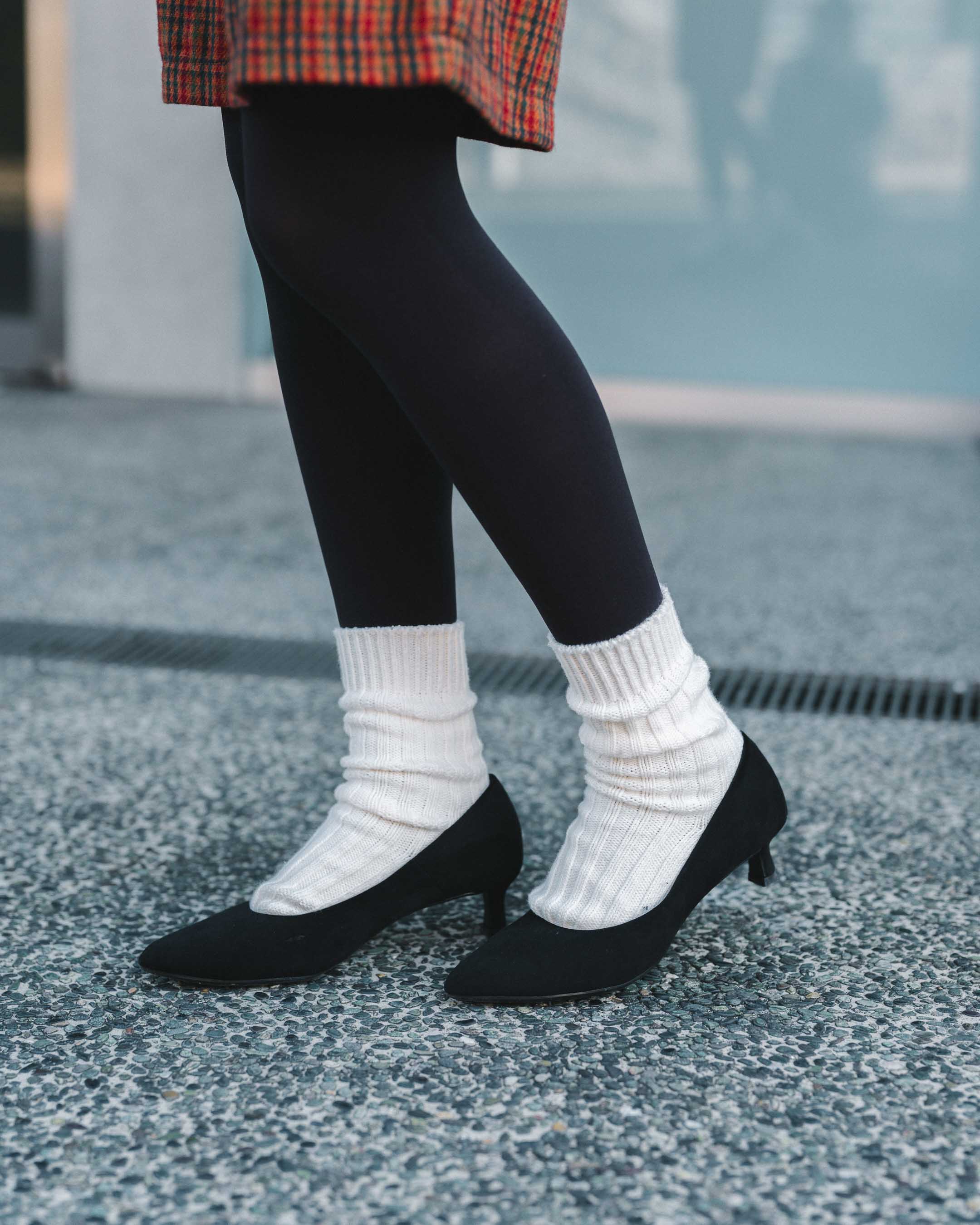 赤チェックのボトムスを差し色にしたモノトーンコーデ。タイツ×ソックス×パンプスで甘さをプラス。
