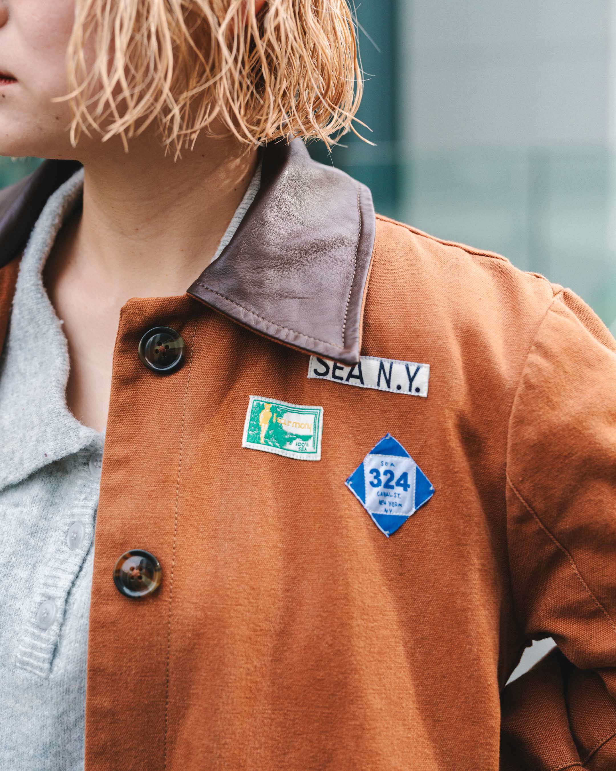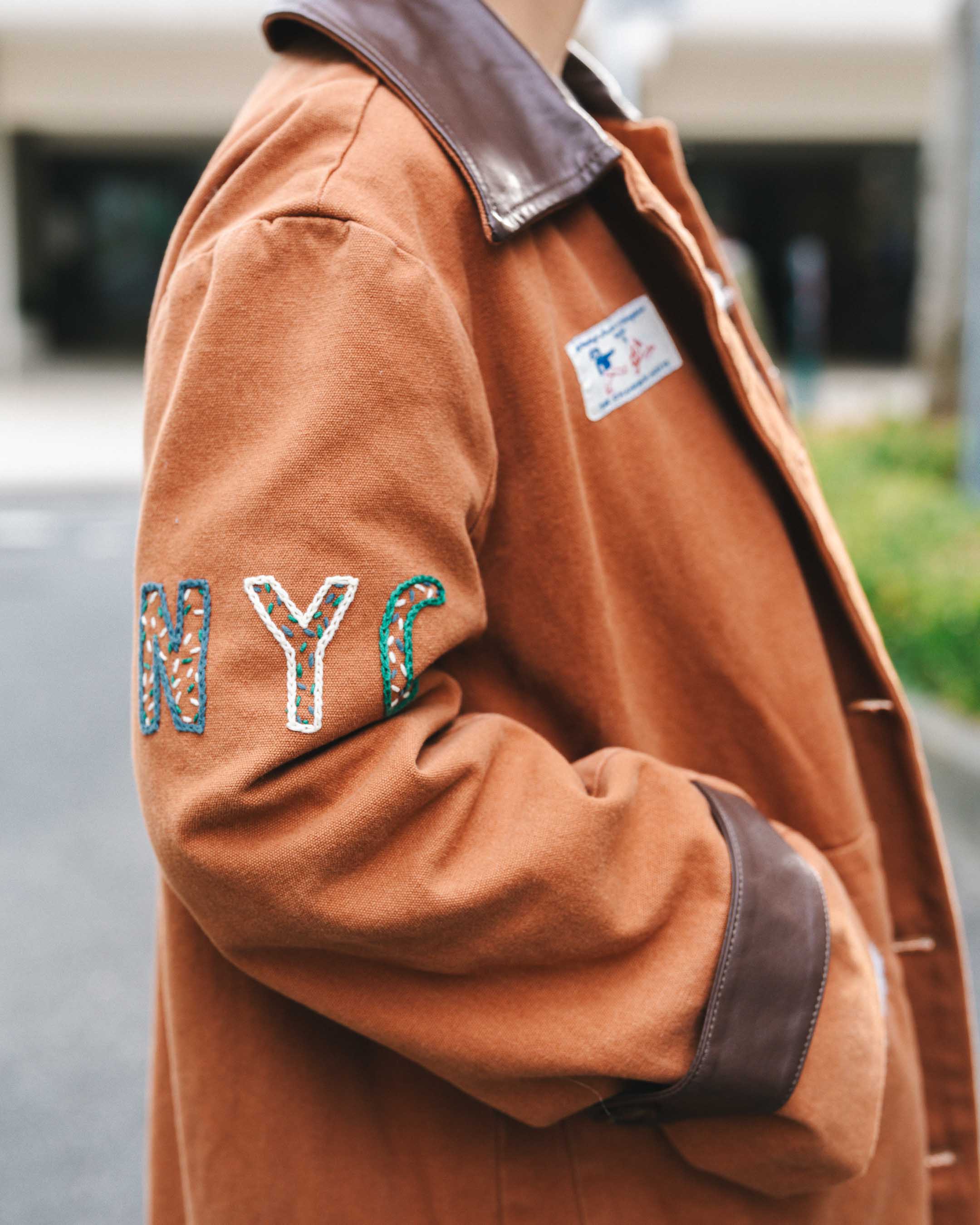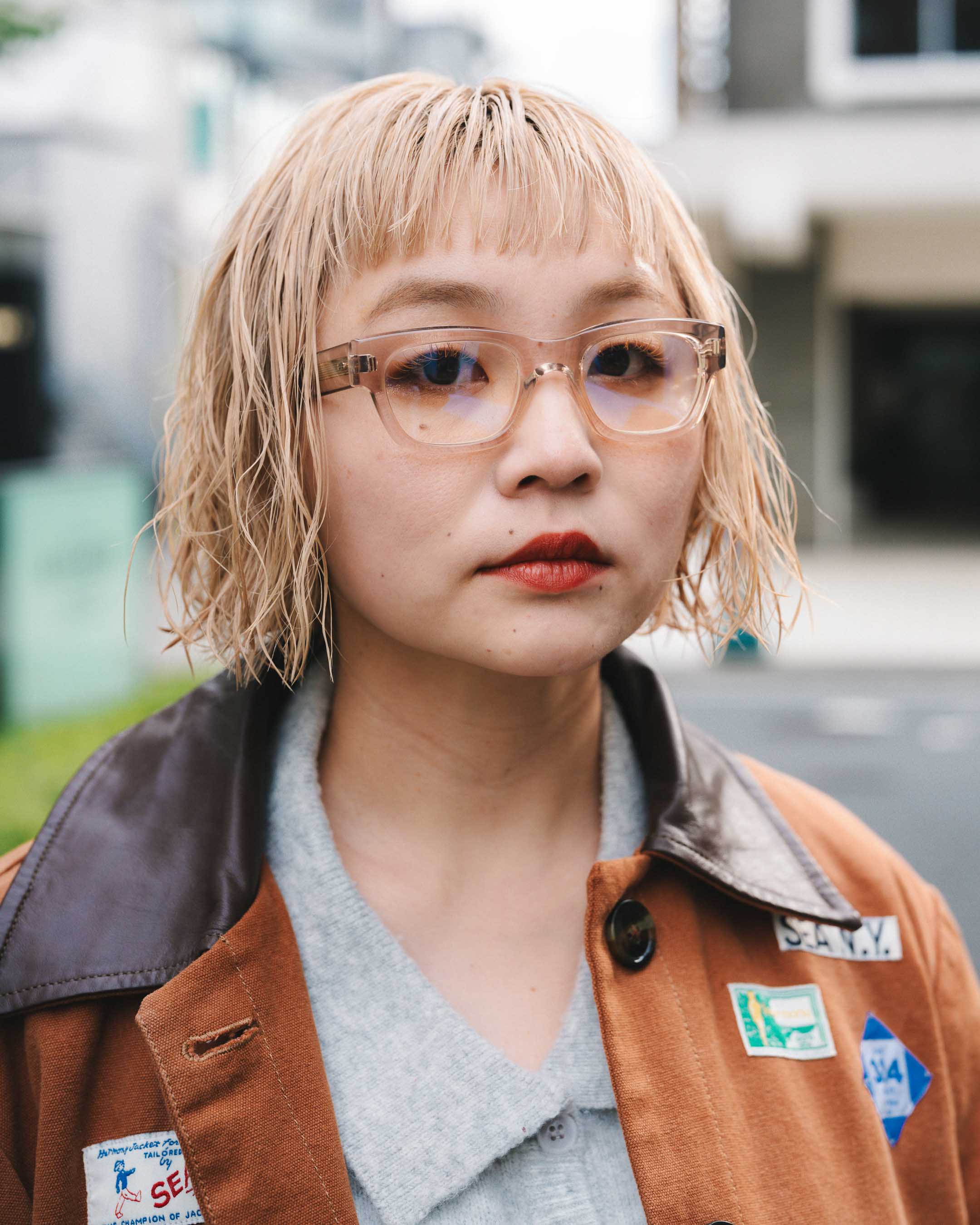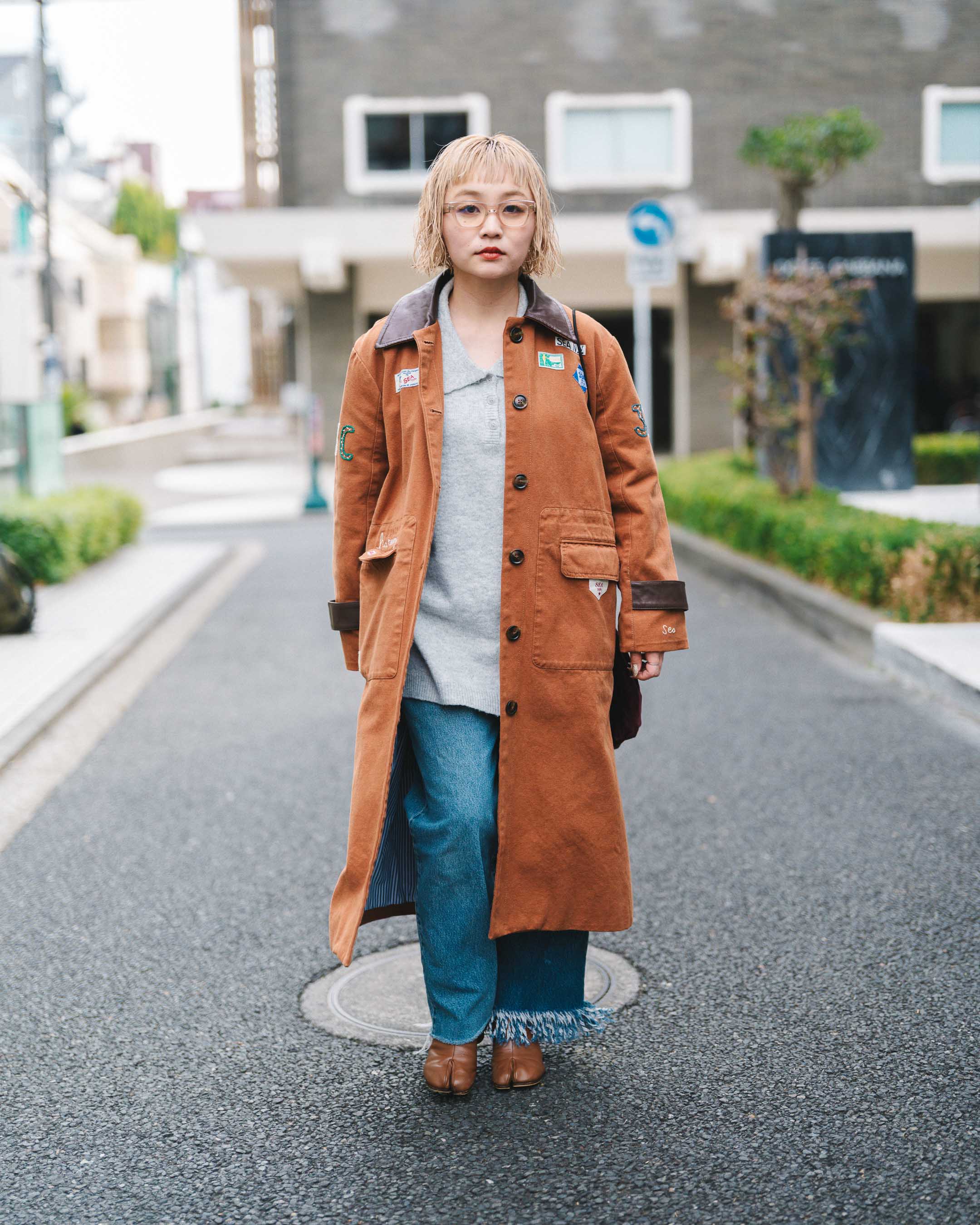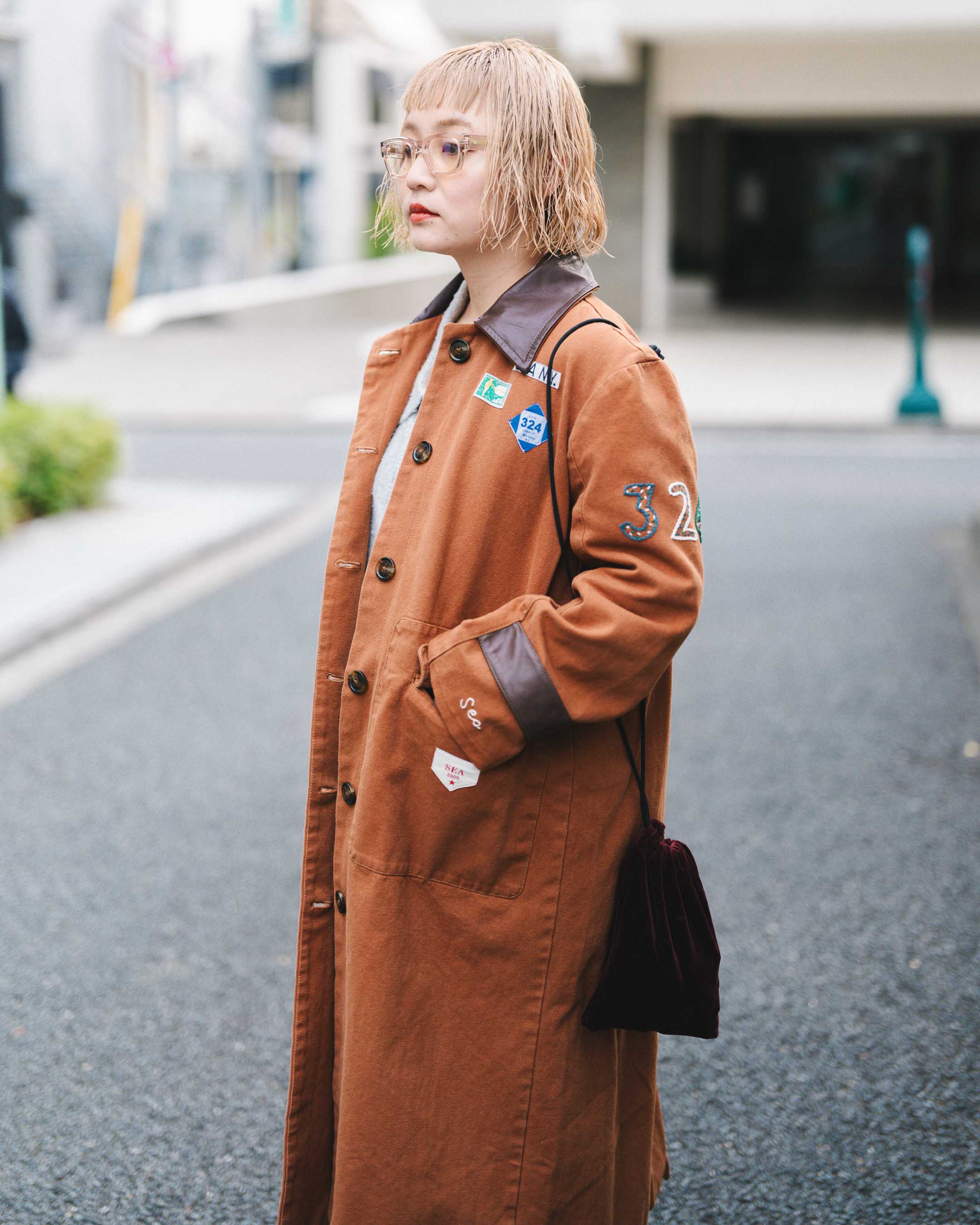 ワッペンのデザインが可愛いアウターをメインに、個性的なアイテムをまとめる。