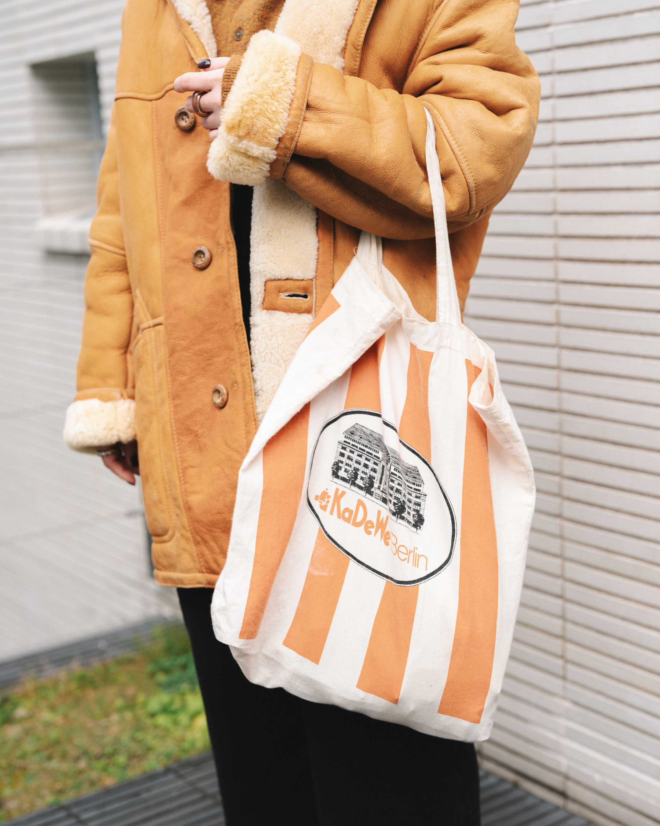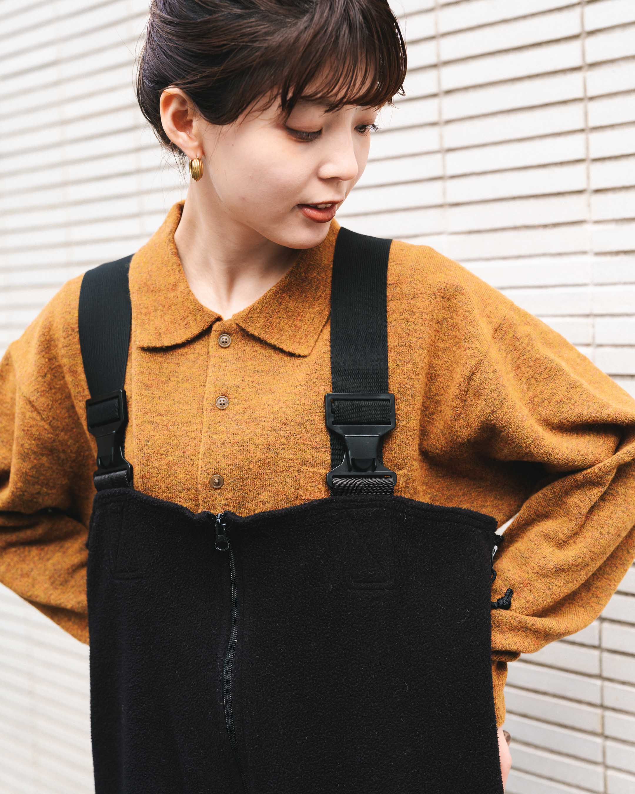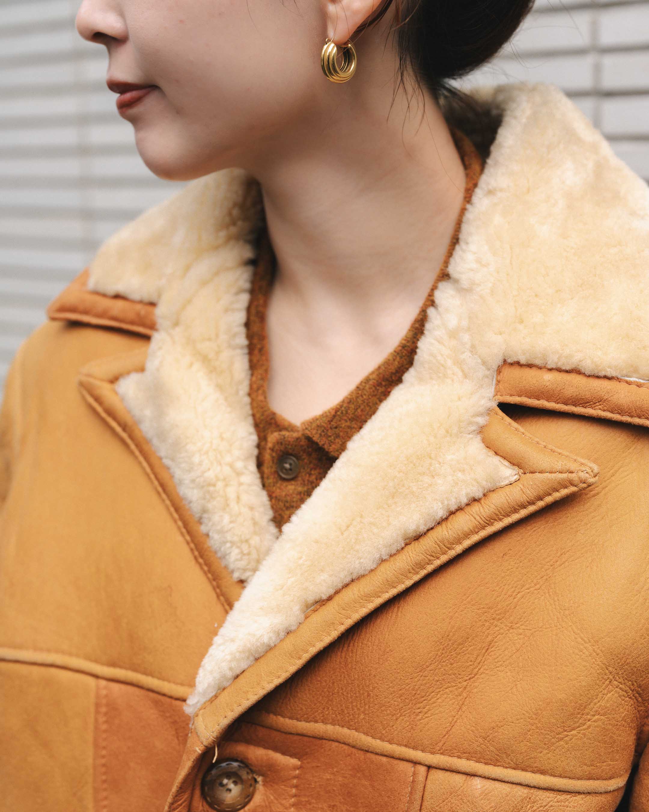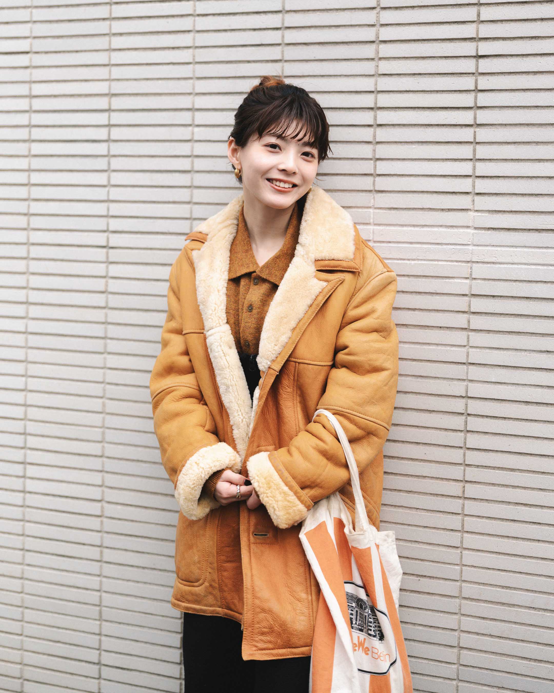 オレンジ系で色を揃えて、ムートンとニットの素材感を楽しむ。