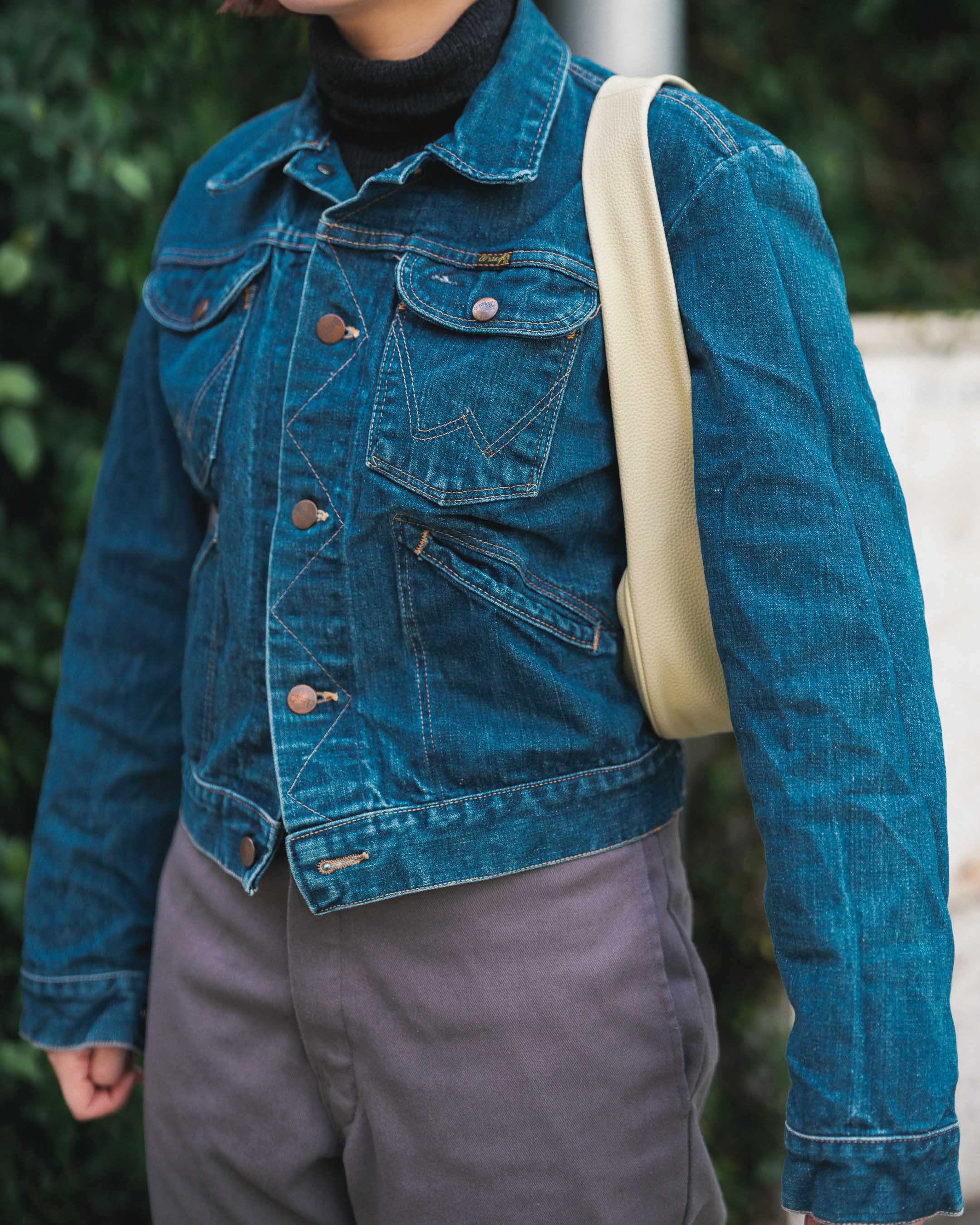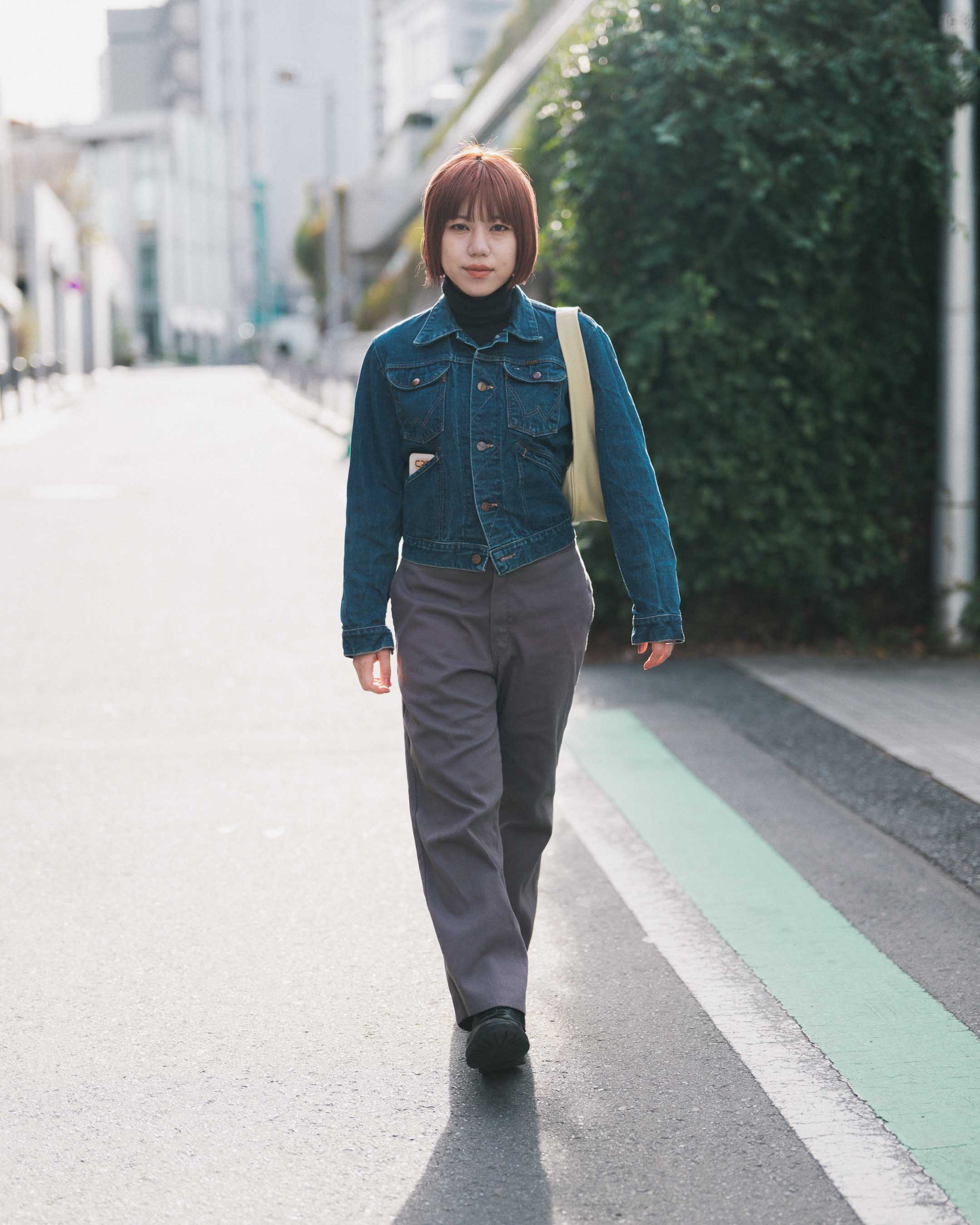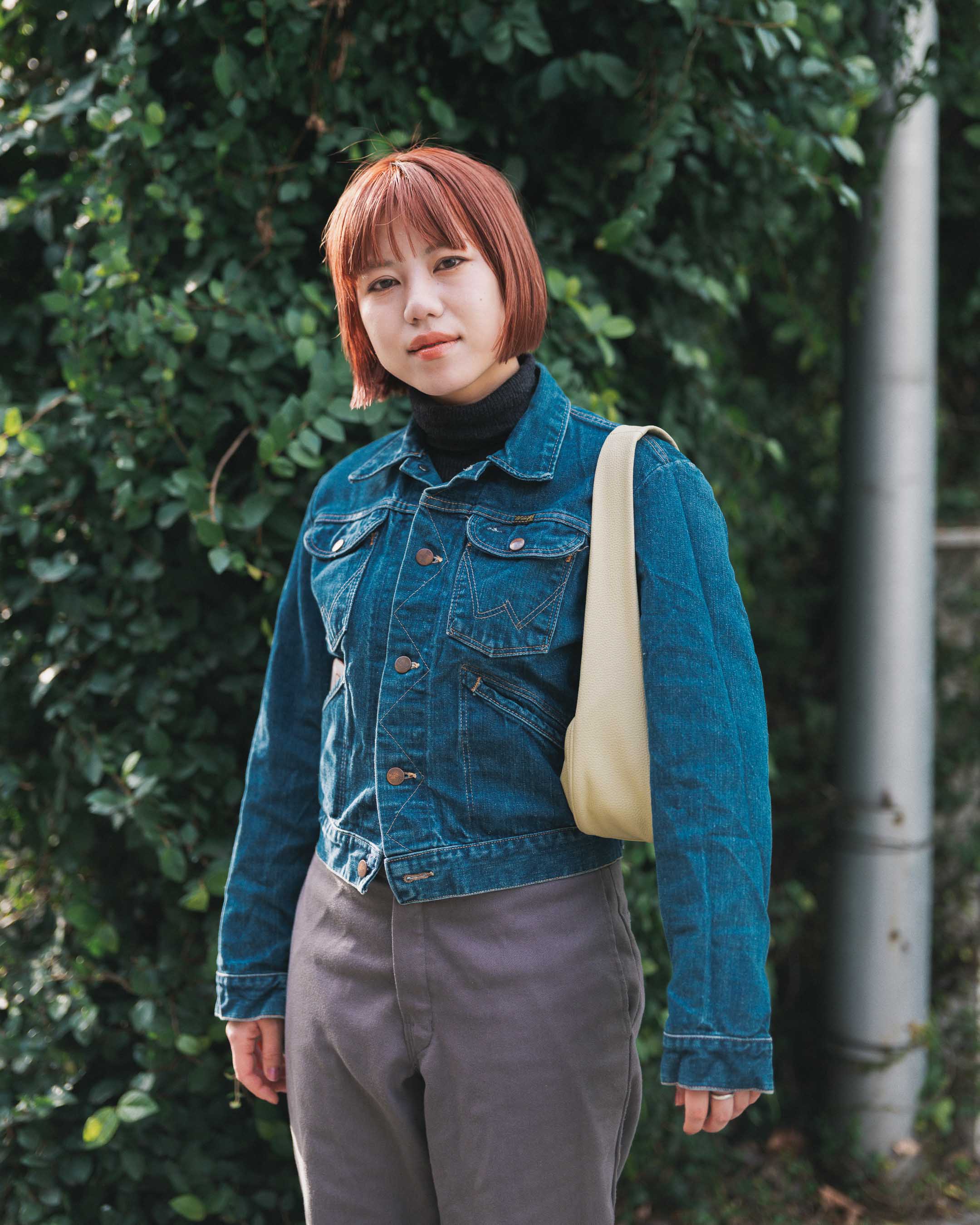 古着にレザーのアイテムでメリハリを。ヘアカラーが映えるコーデに。