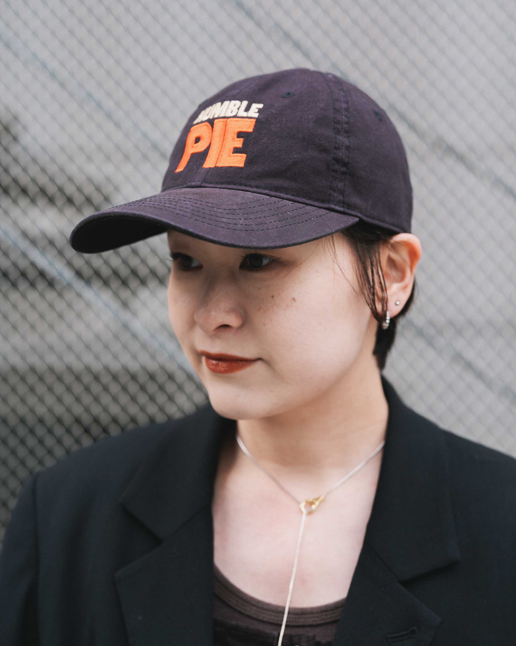 ベーシックカラーでまとめつつ、キャップのロゴを差し色に。