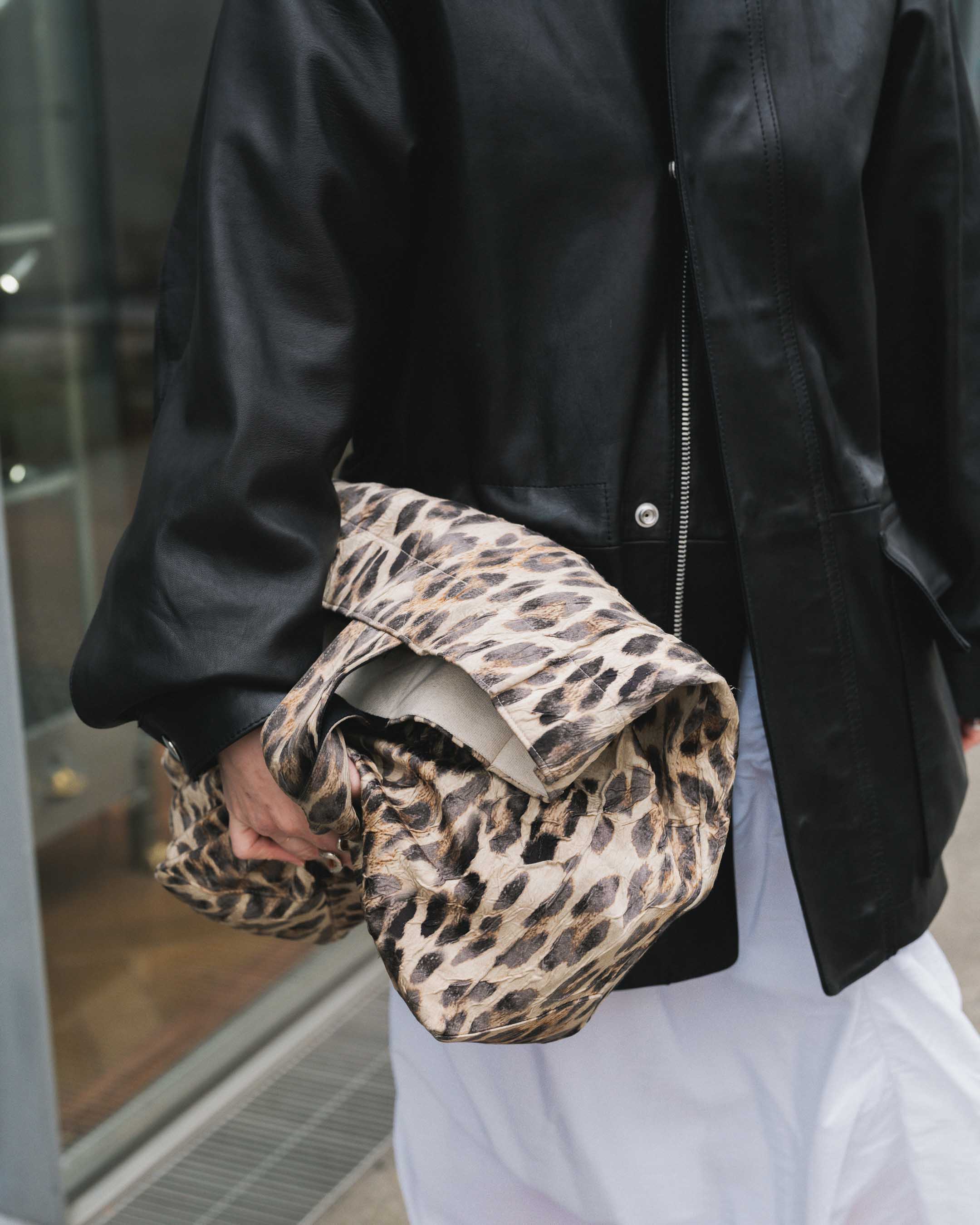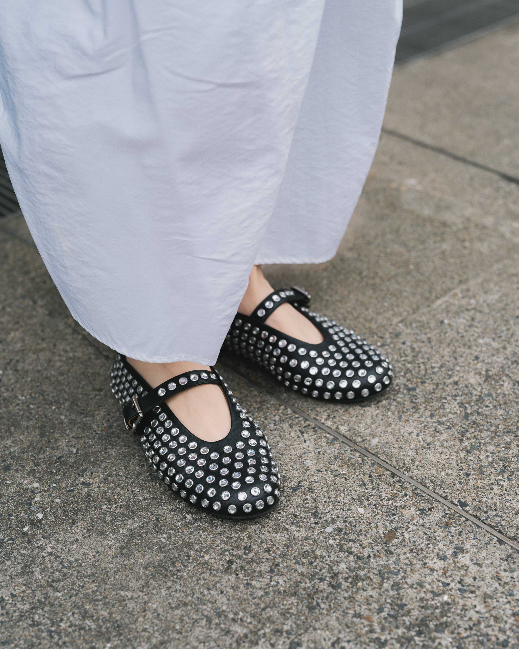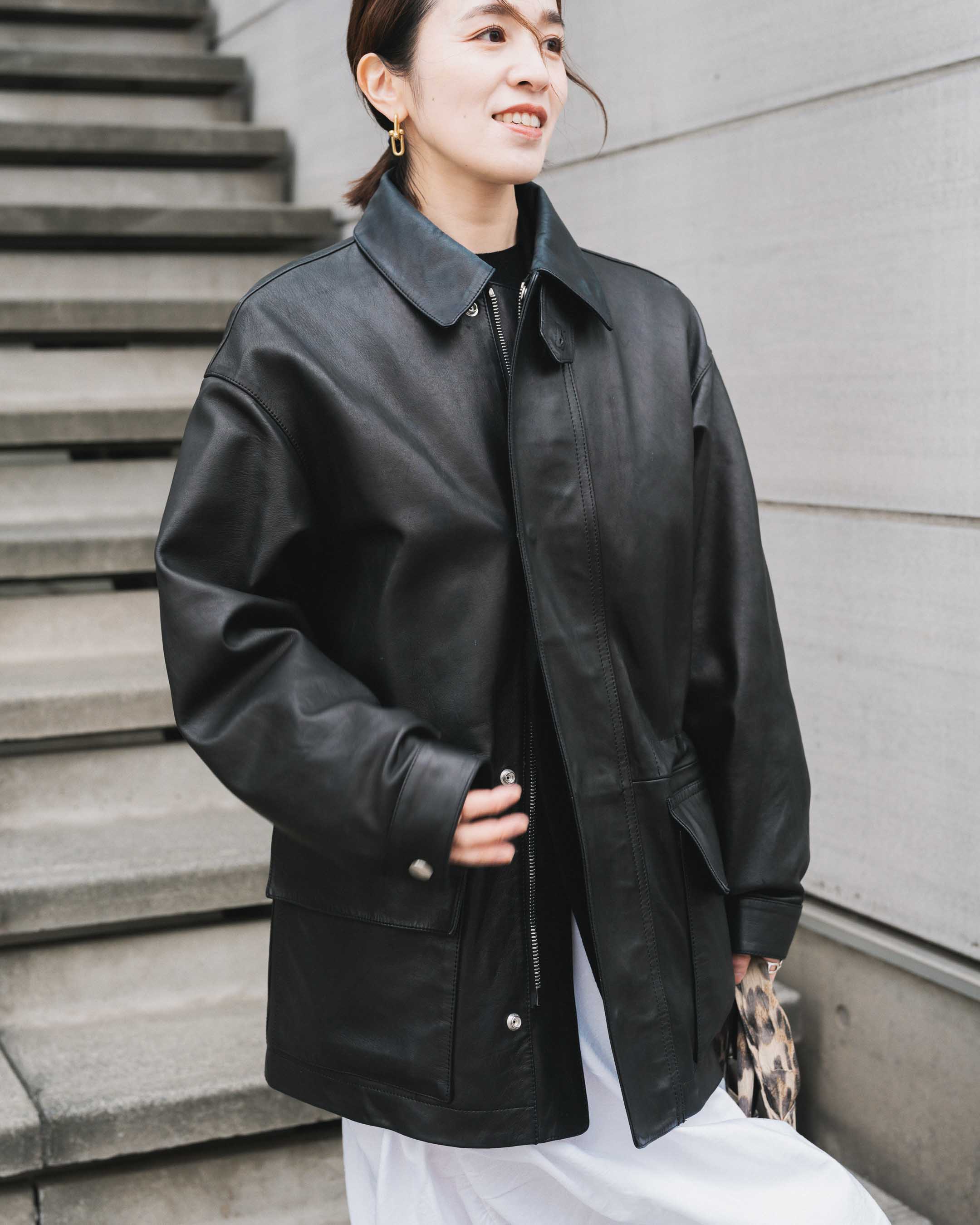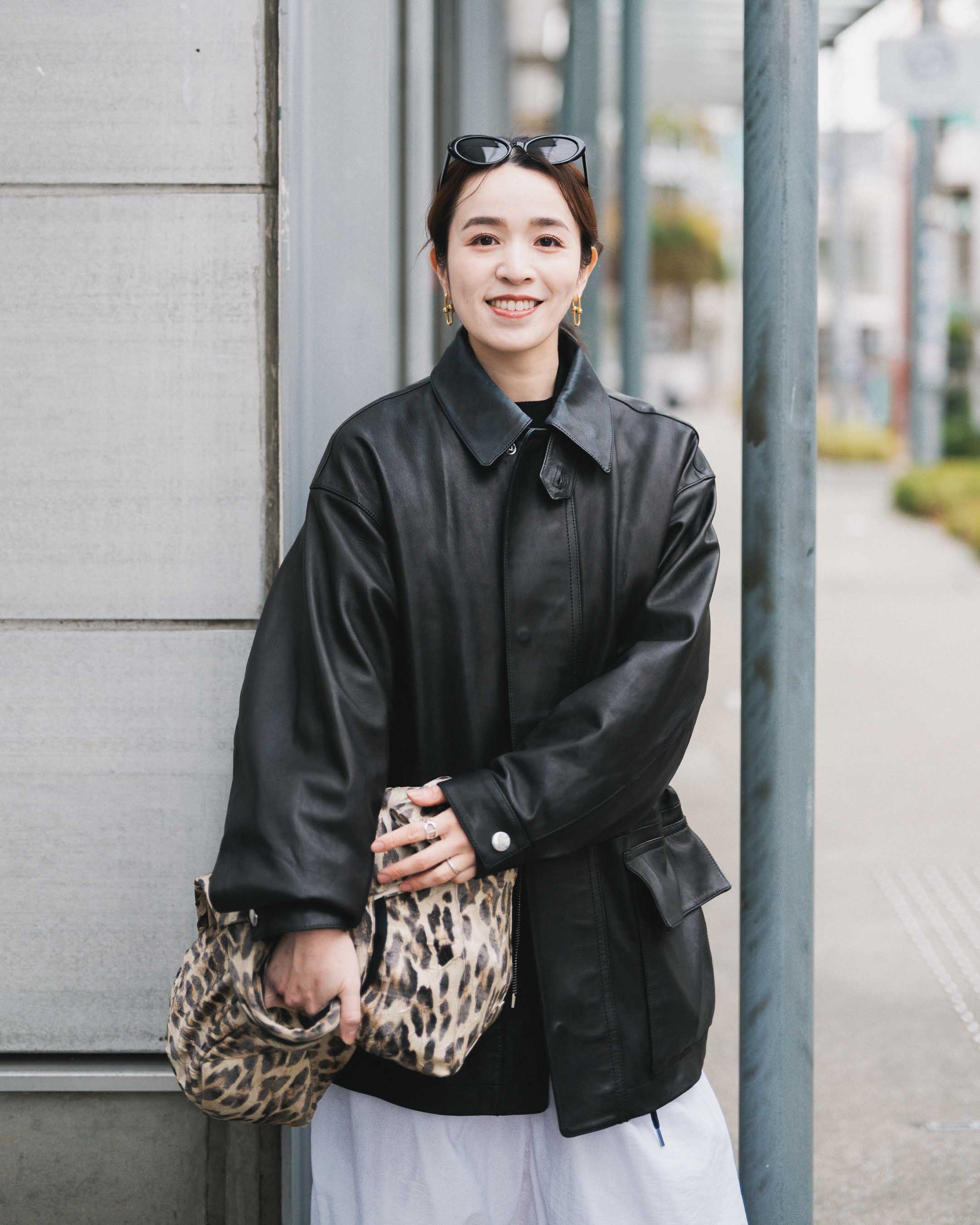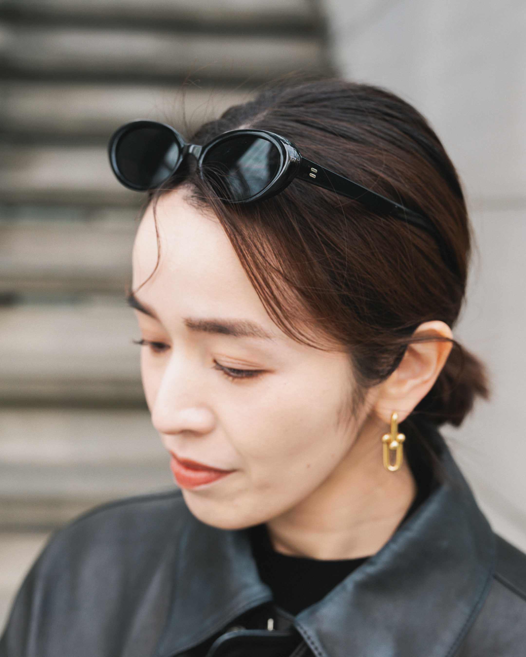 シンプルなモノトーンファッションにキャッチーな小物でモードに仕上げる。