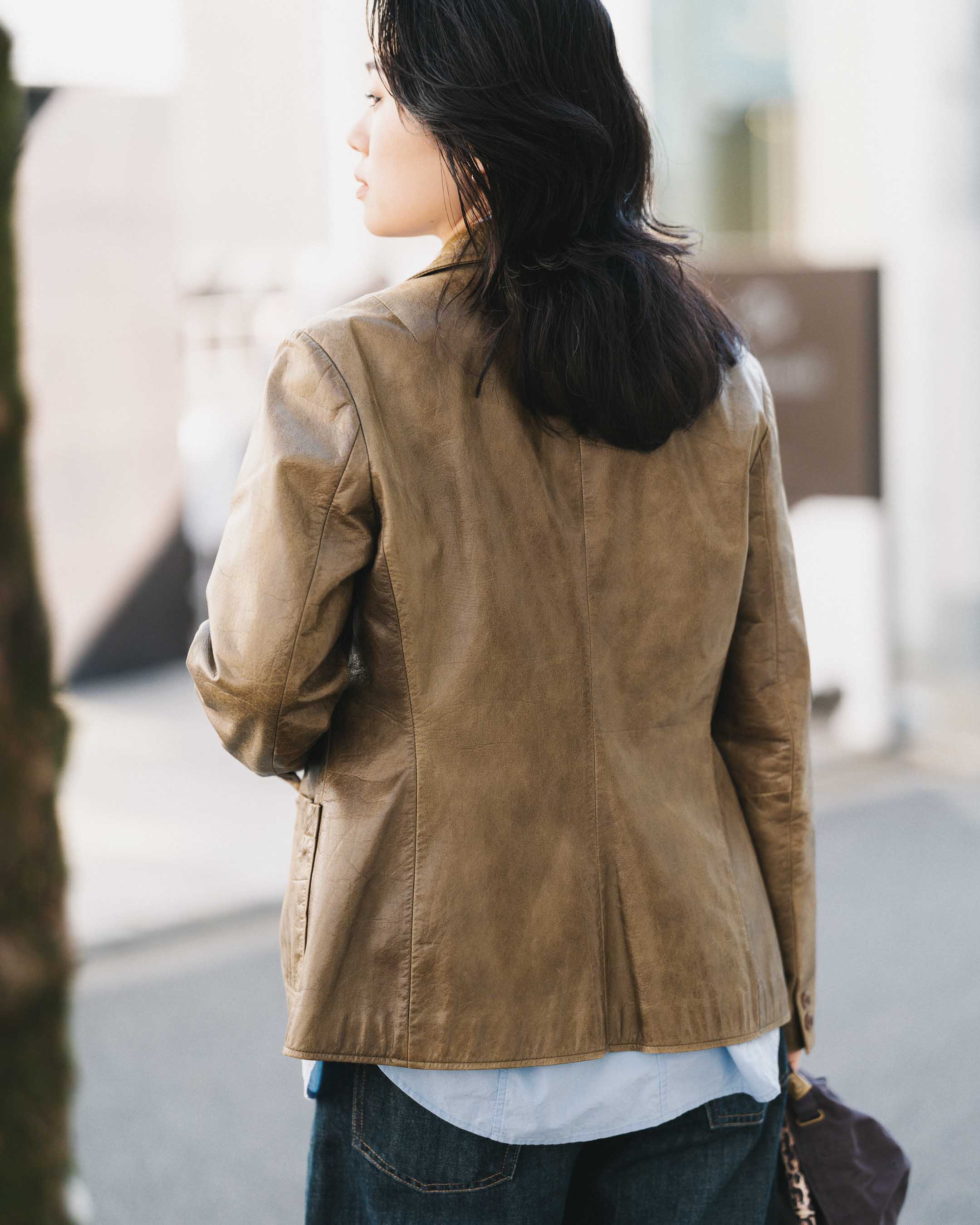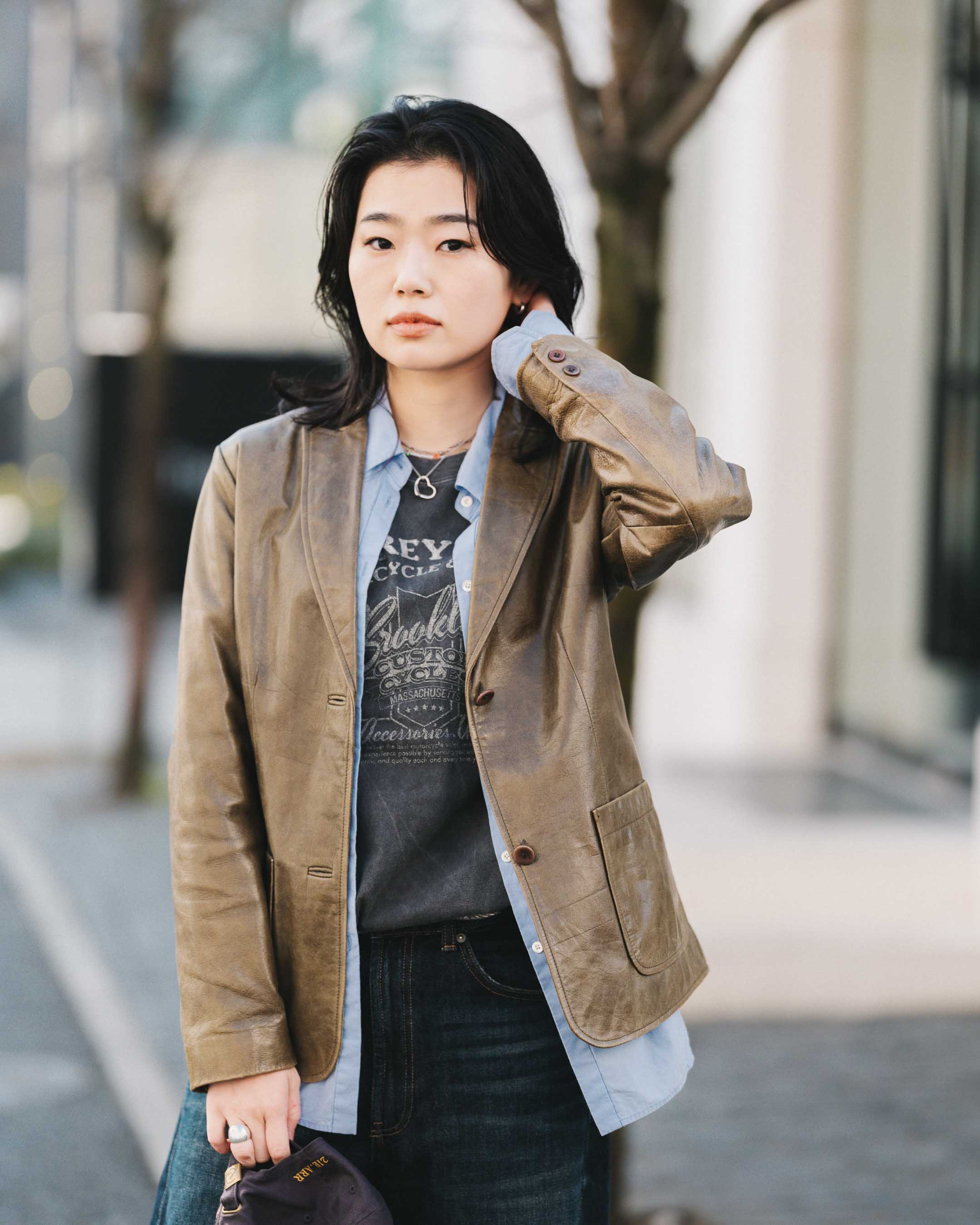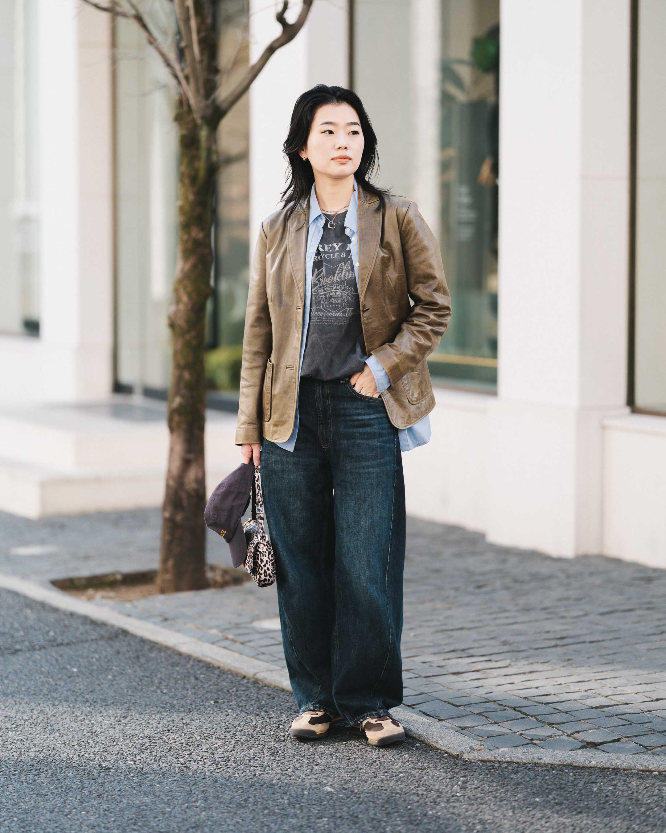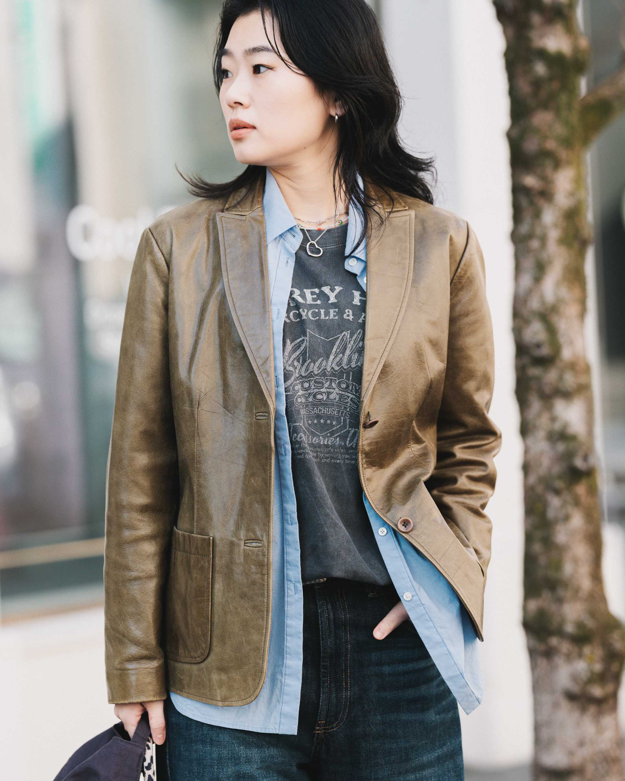 グリーンジャケットに、差し色でブルーのシャツを合わせ、Tシャツとデニム、スニーカーでカジュアルに着崩す。