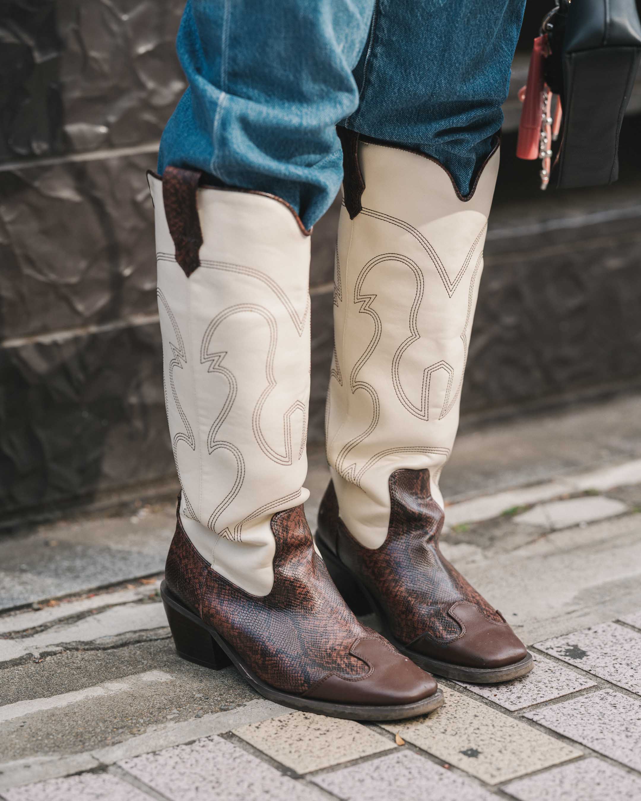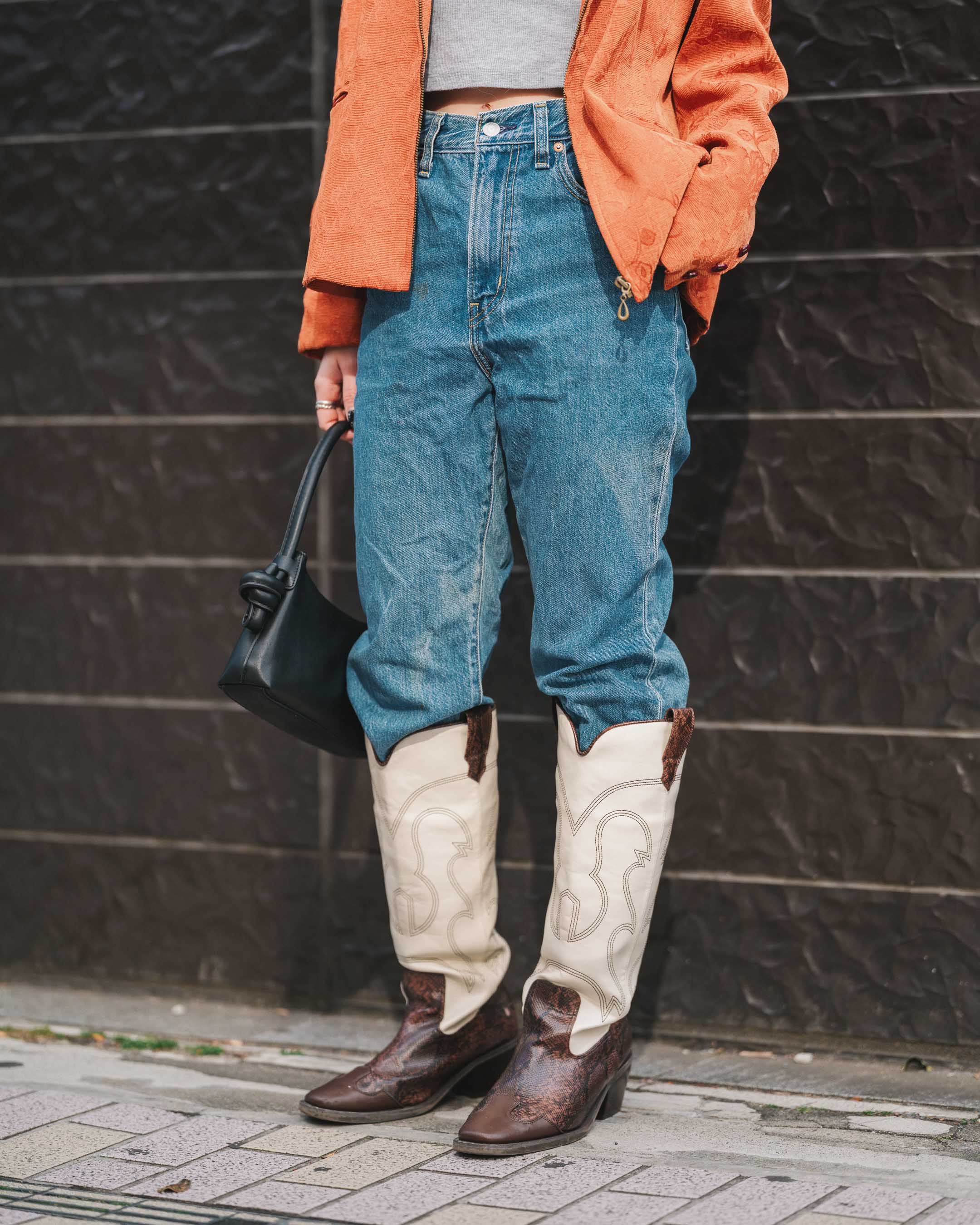 ウエスタンブーツと青みのデニムで春っぽくコーディネートを組む。