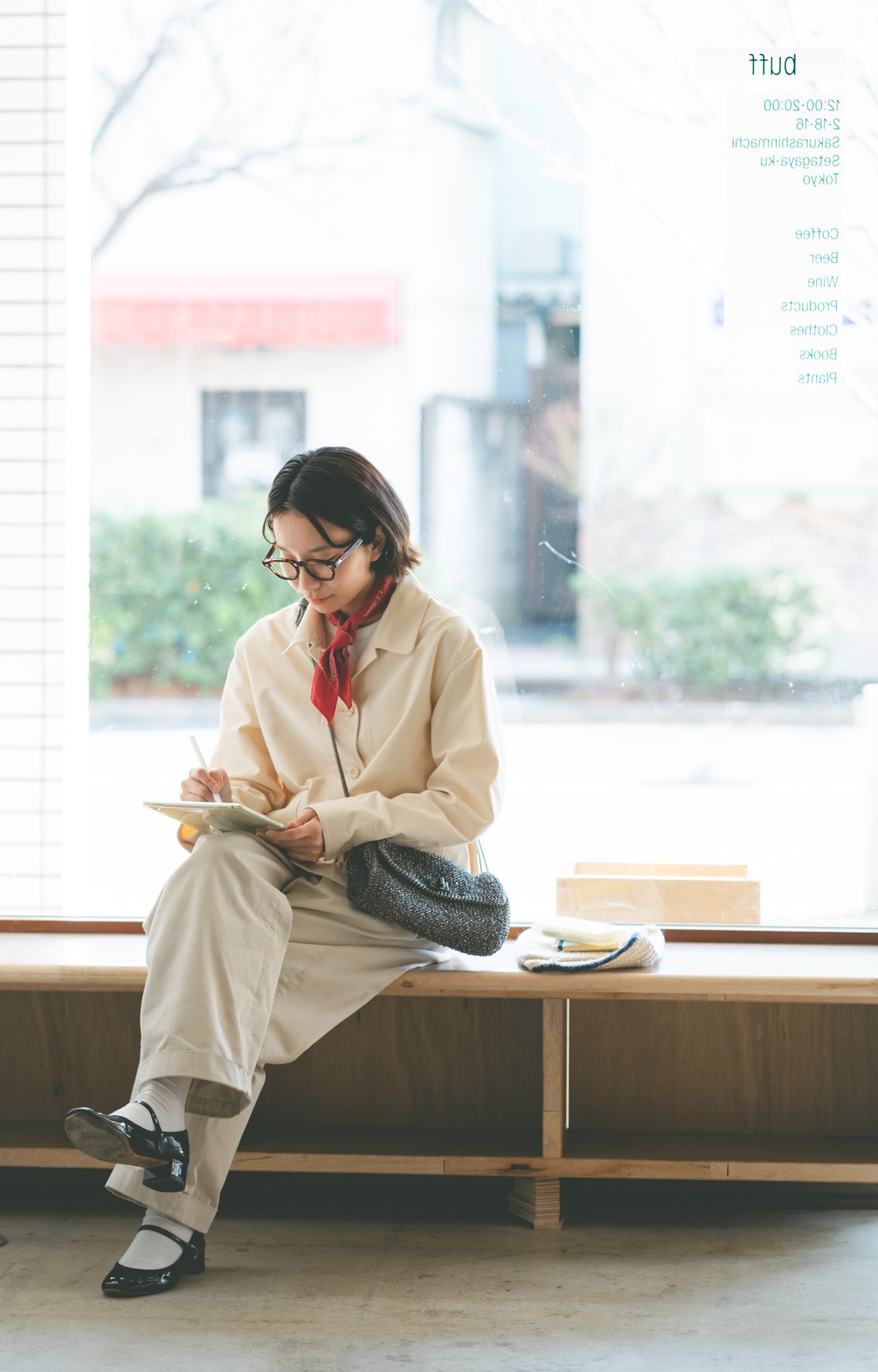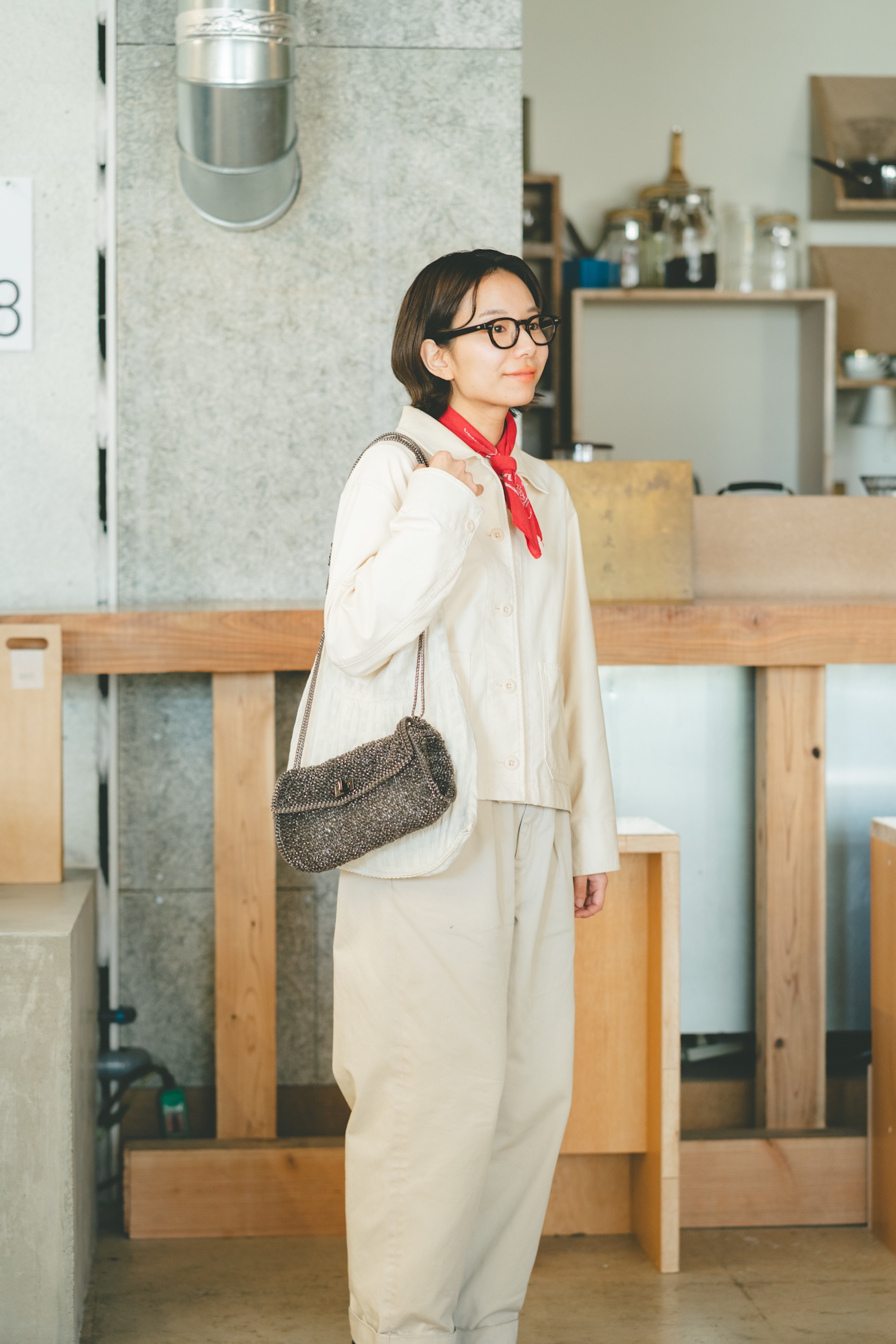 FUDGE FRIENDとして活動しながら、イラストレーターとしても表現を広げているmomoさん。ボーイッシュなパンツスタイルが彼女の定番だけれど、この日は《アンテプリマ》のバッグでさりげなく上品さをプラス。