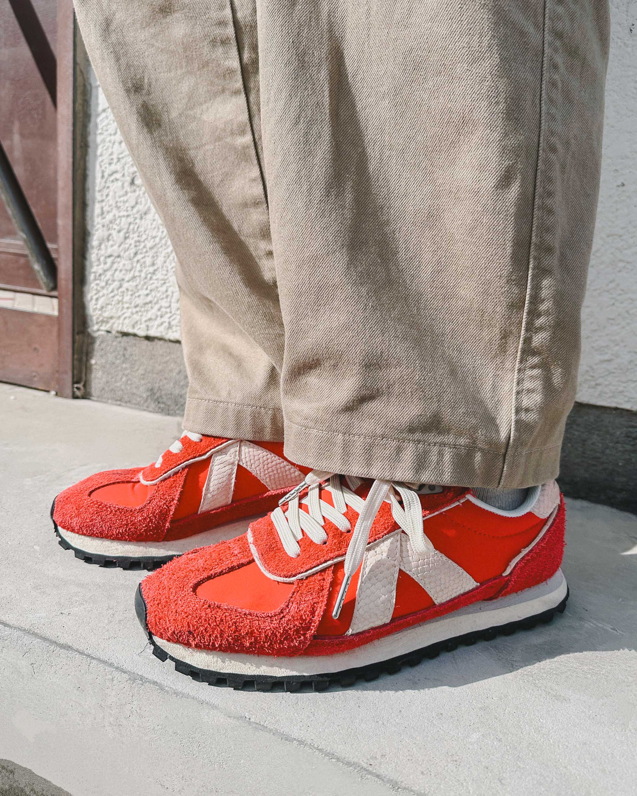 ブラウンやベージュで統一感を出しつつ、デニム素材で春を先取り!赤いシューズをアクセントに。