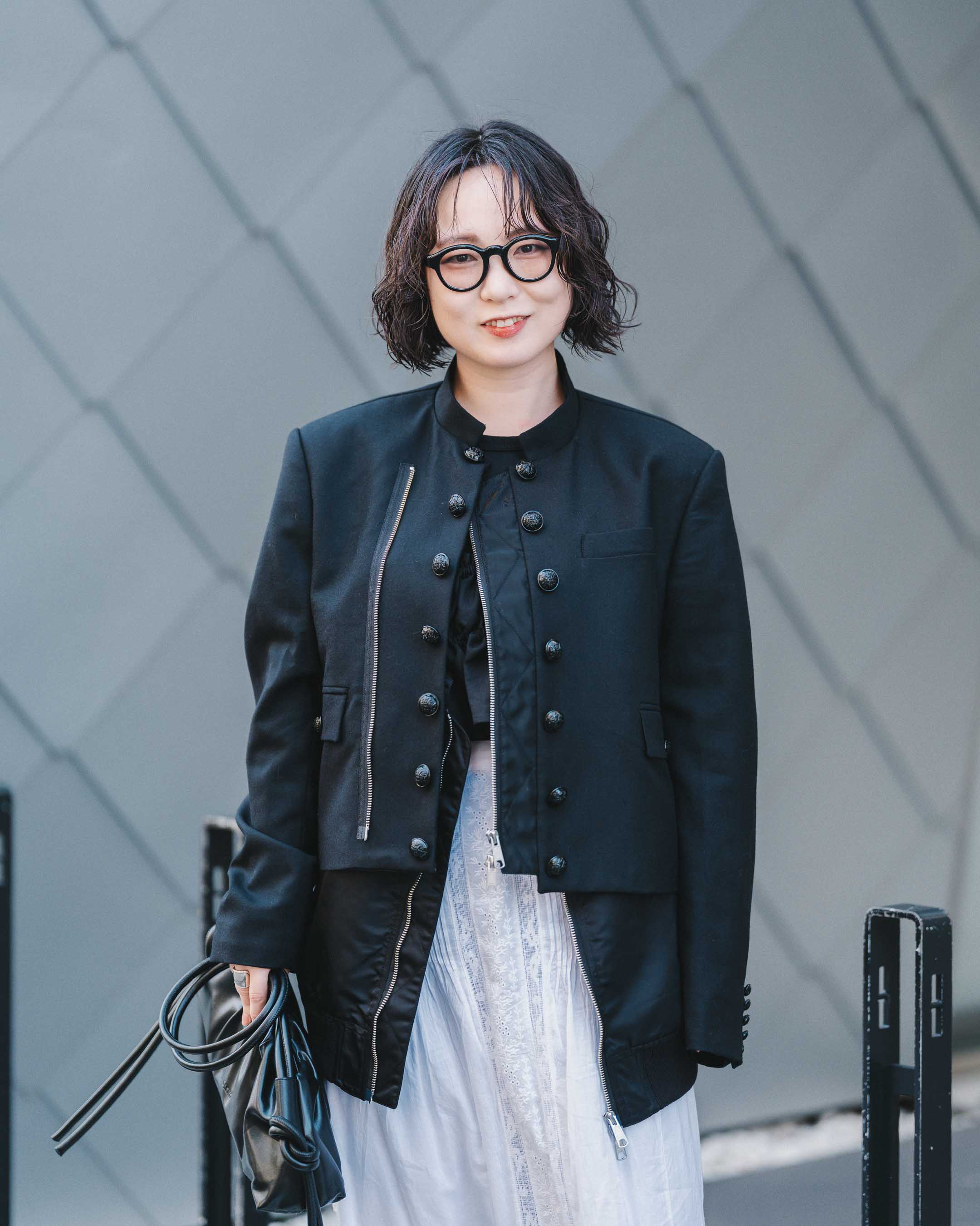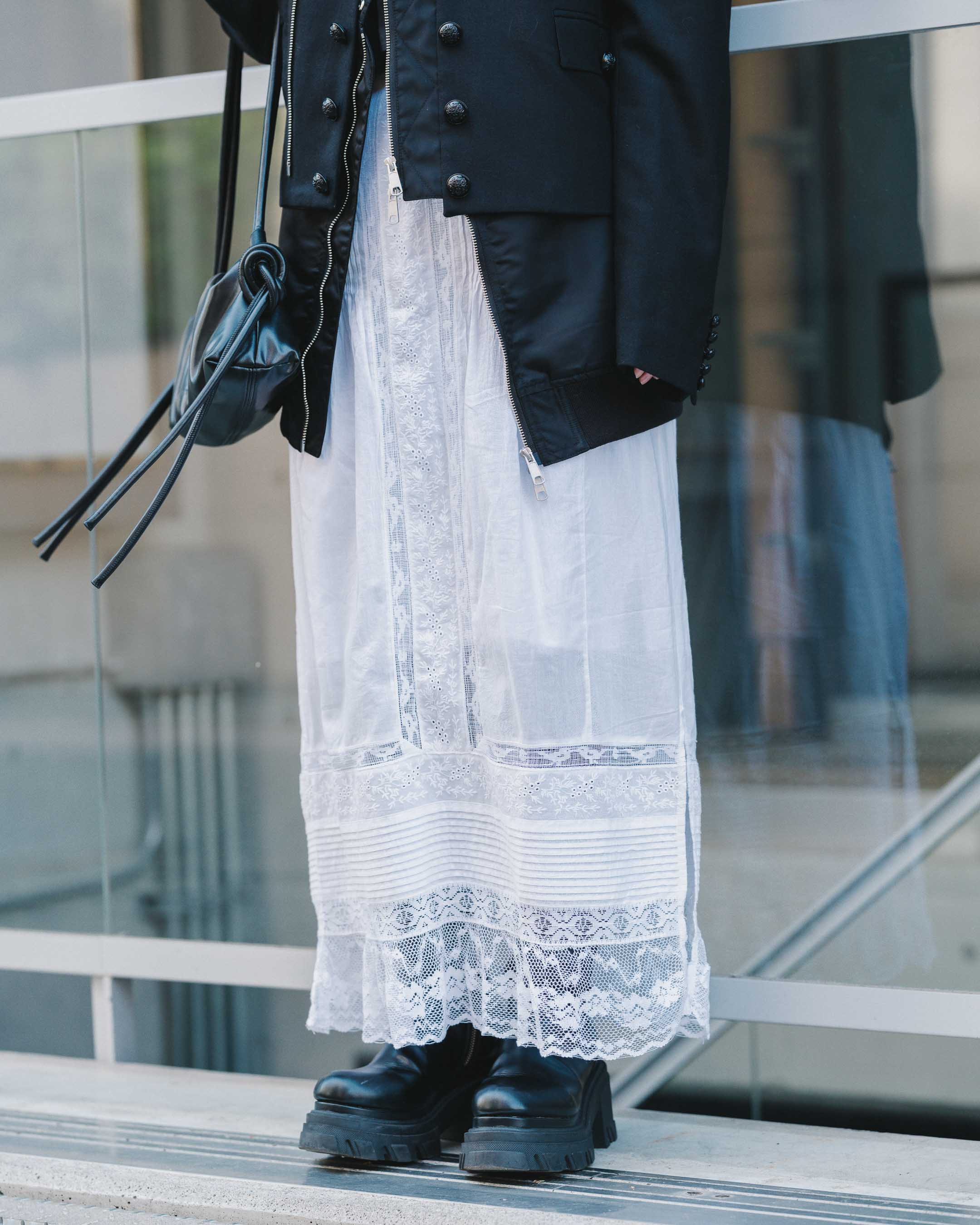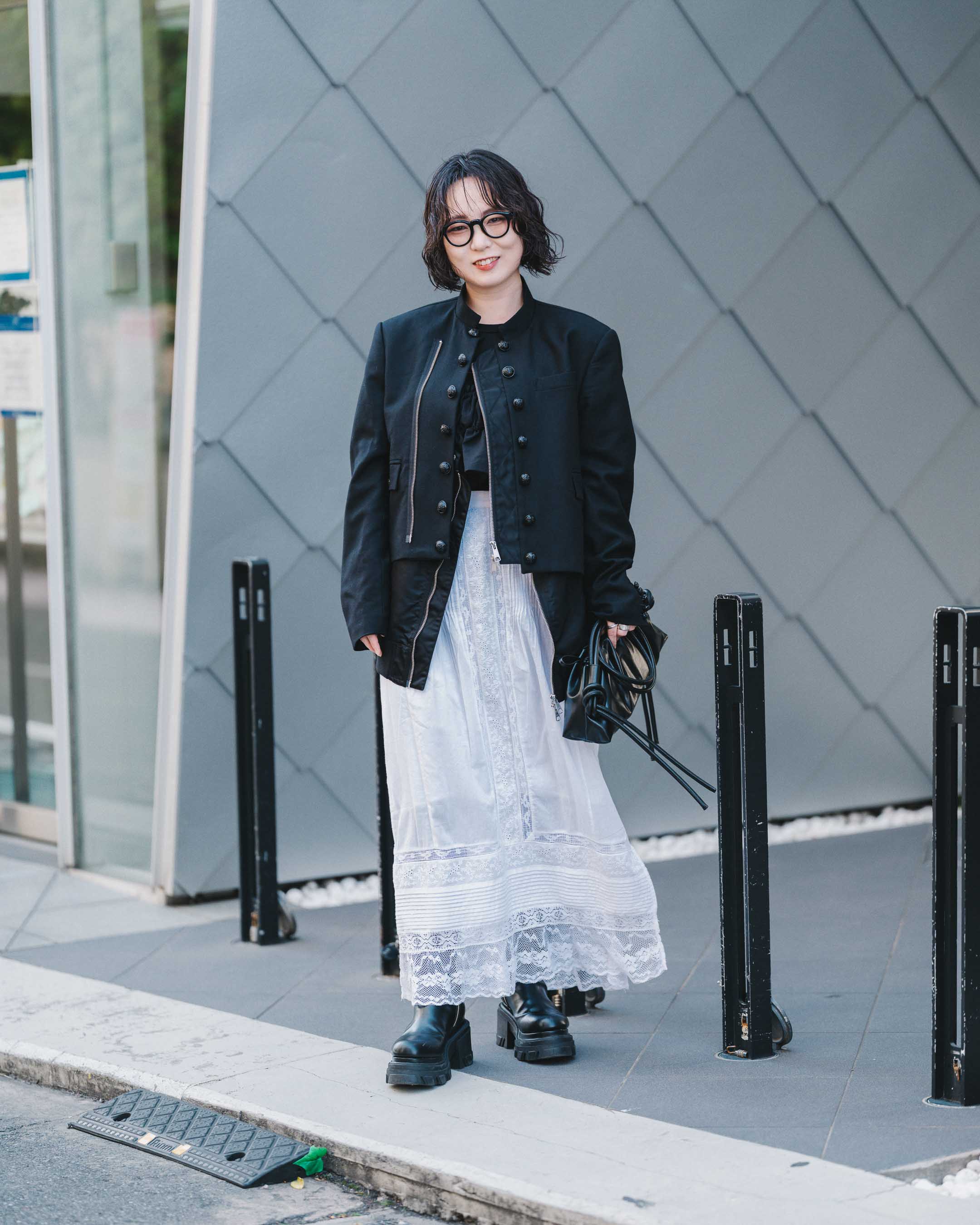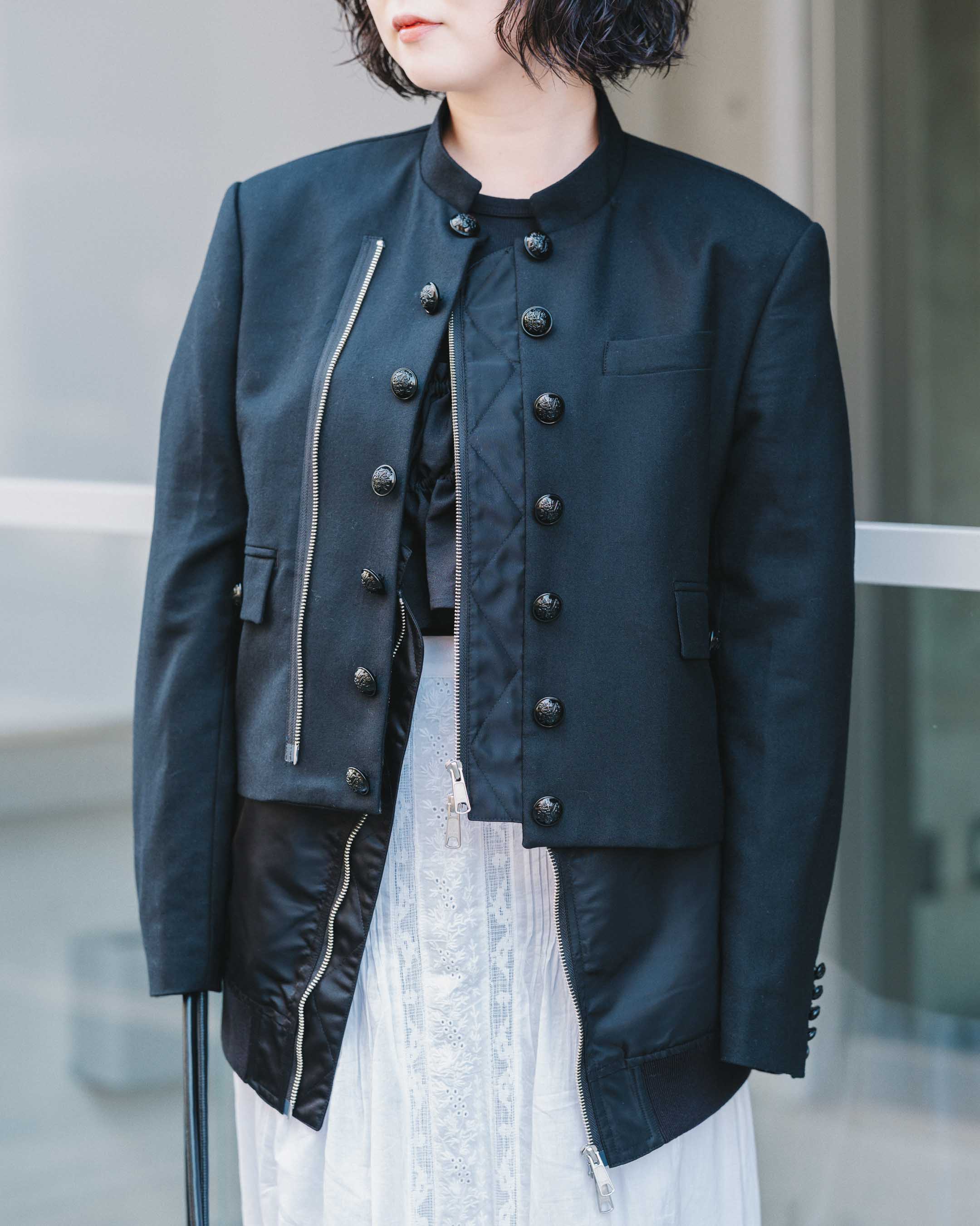 学生服のようなアウターにインド綿のレースのスカートを合わせ、ひとくせある春のトラッドスタイルに。